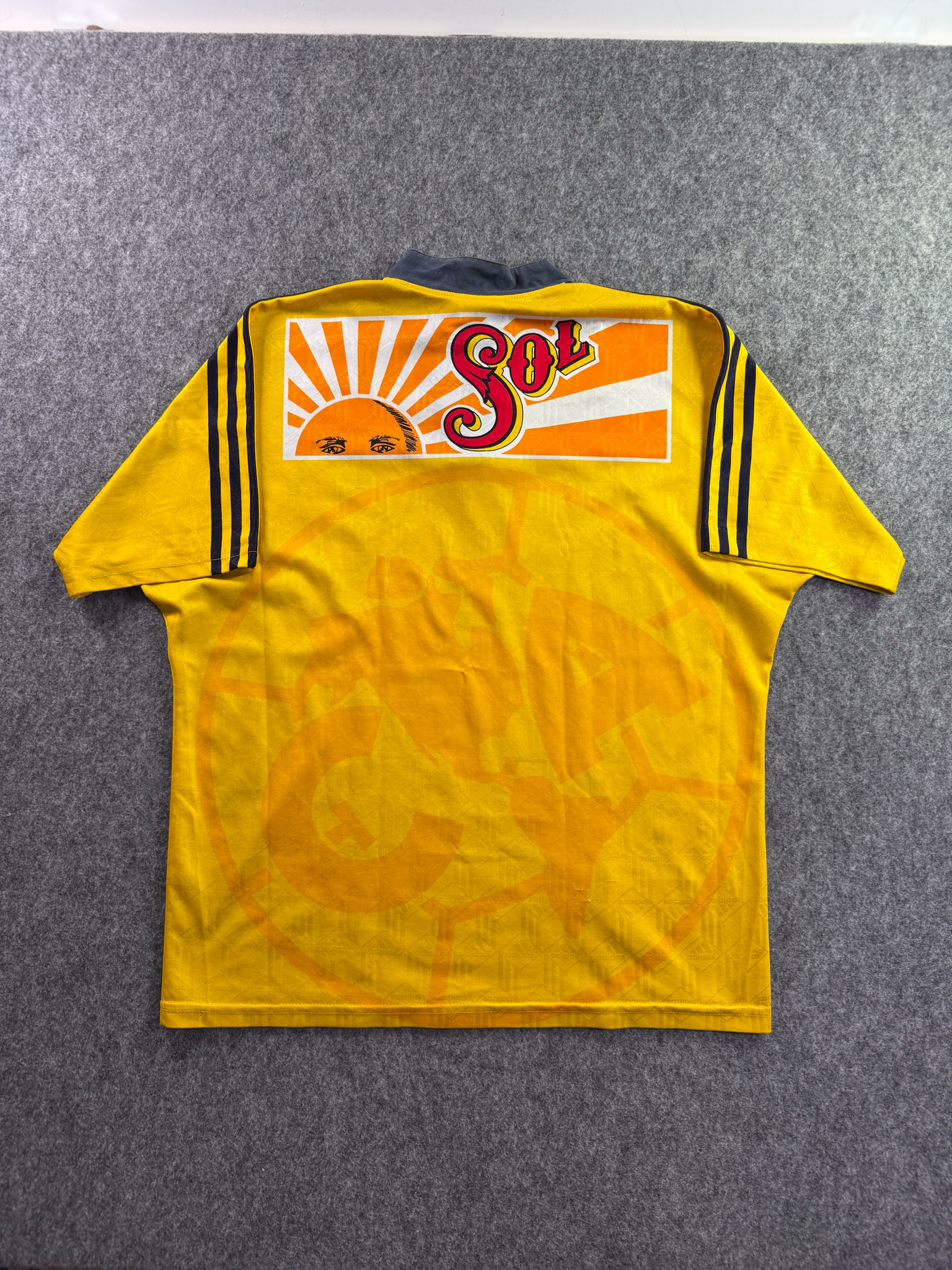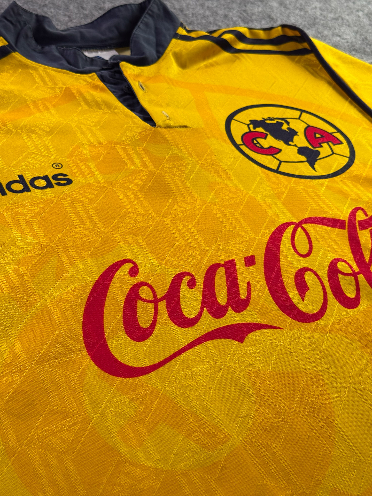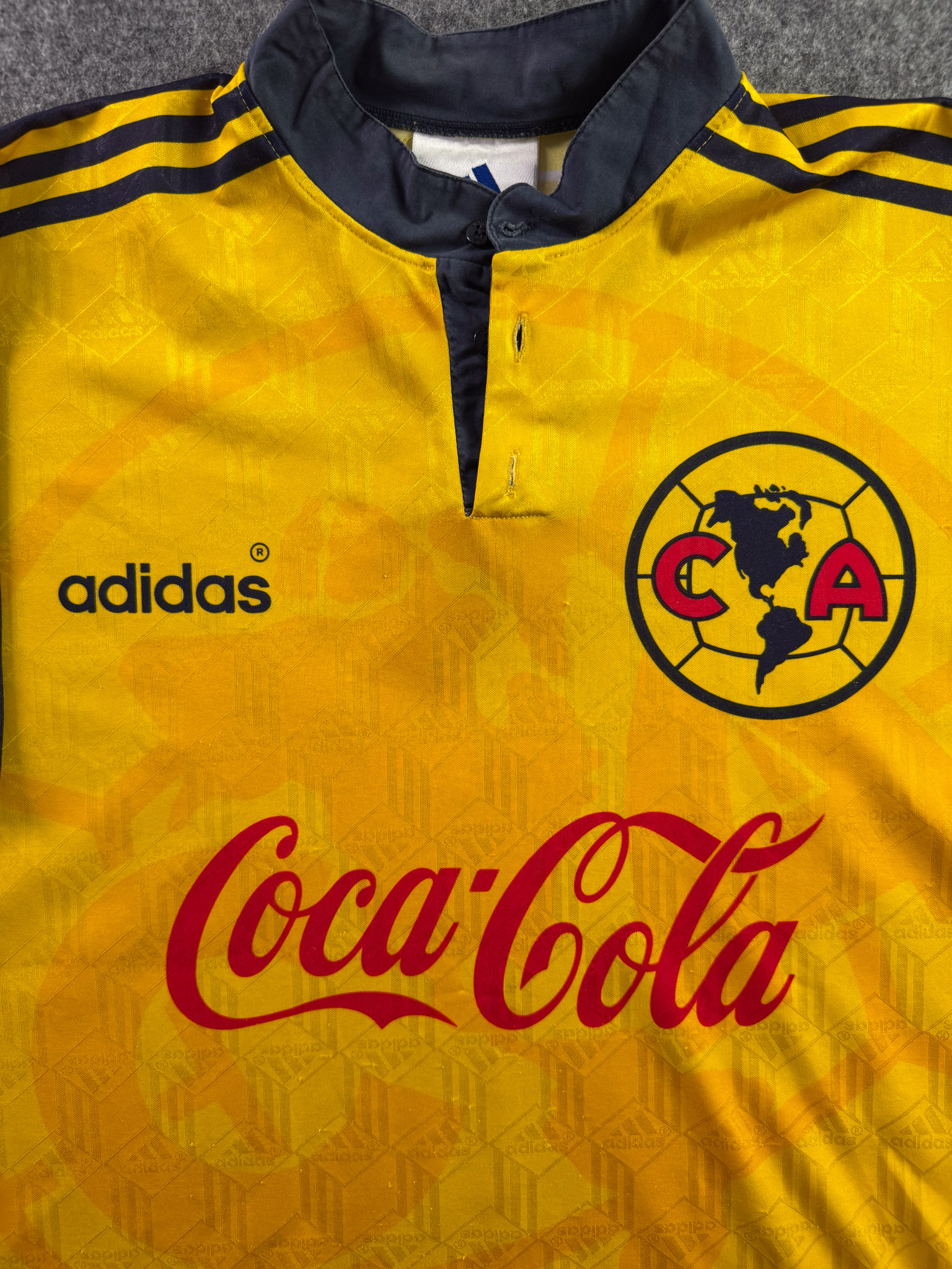 Jersey del América fabricado por Adidas, originario de México. Se trata de la equipación Local correspondiente a la temporada 98-99. Talla L, con dorsal ‘No’ y en condición Excelente. Detalles: Ligeras bolitas en la tela, le falta el botón de abajo del cuello.