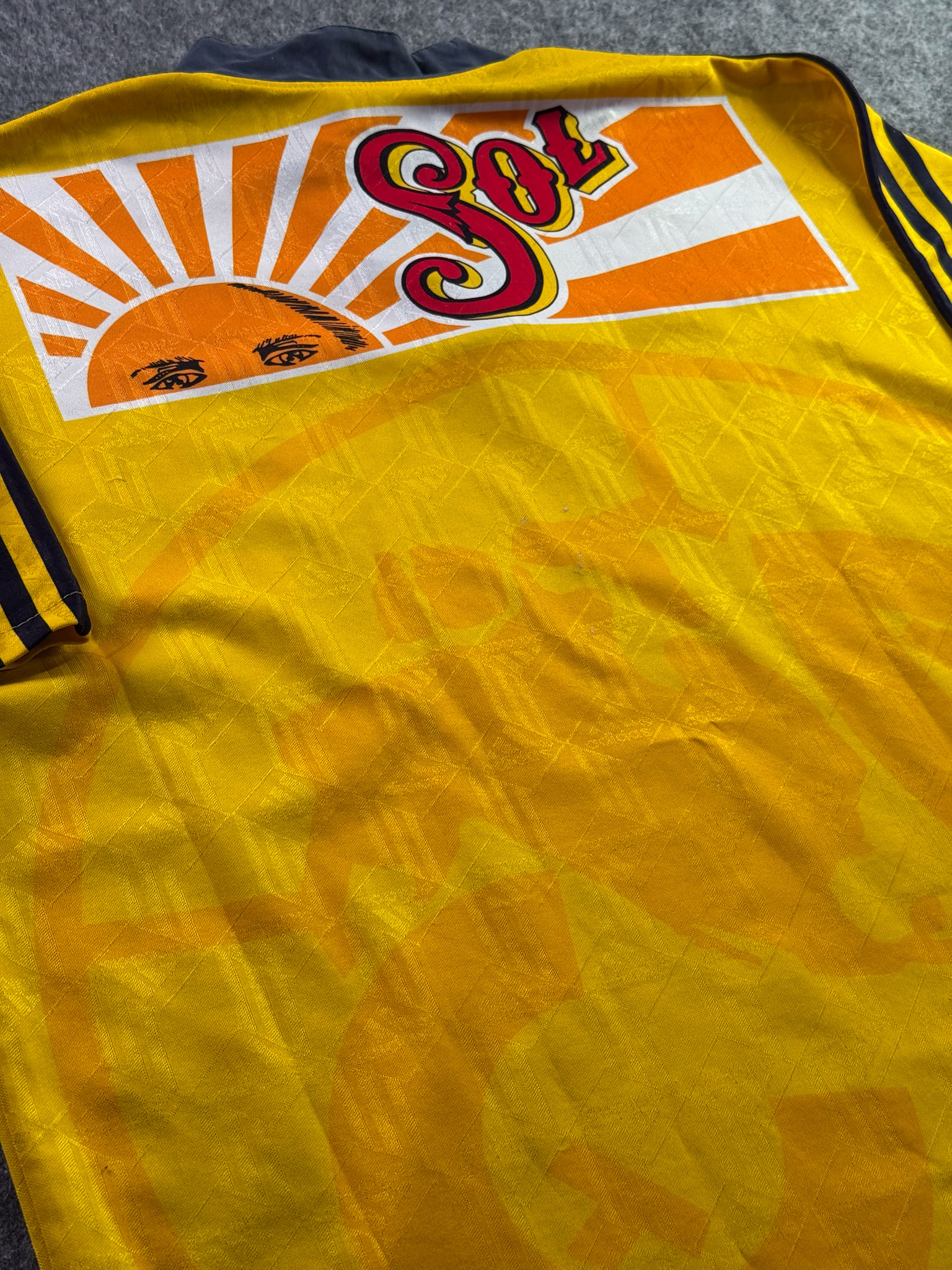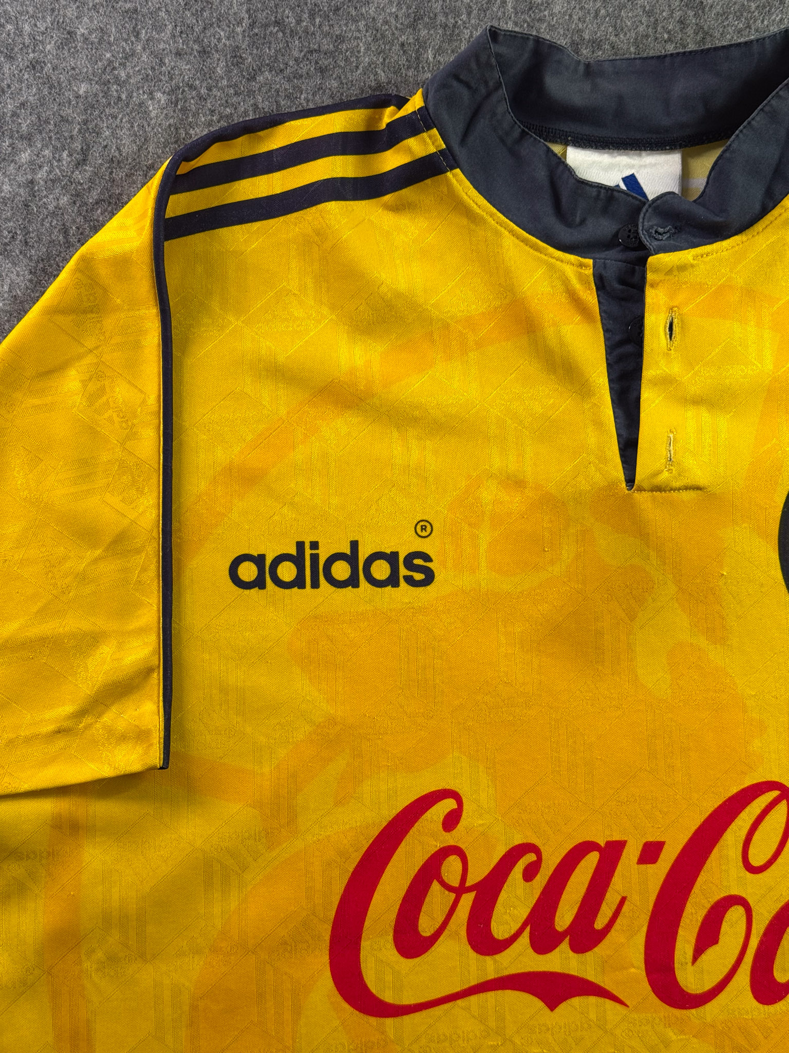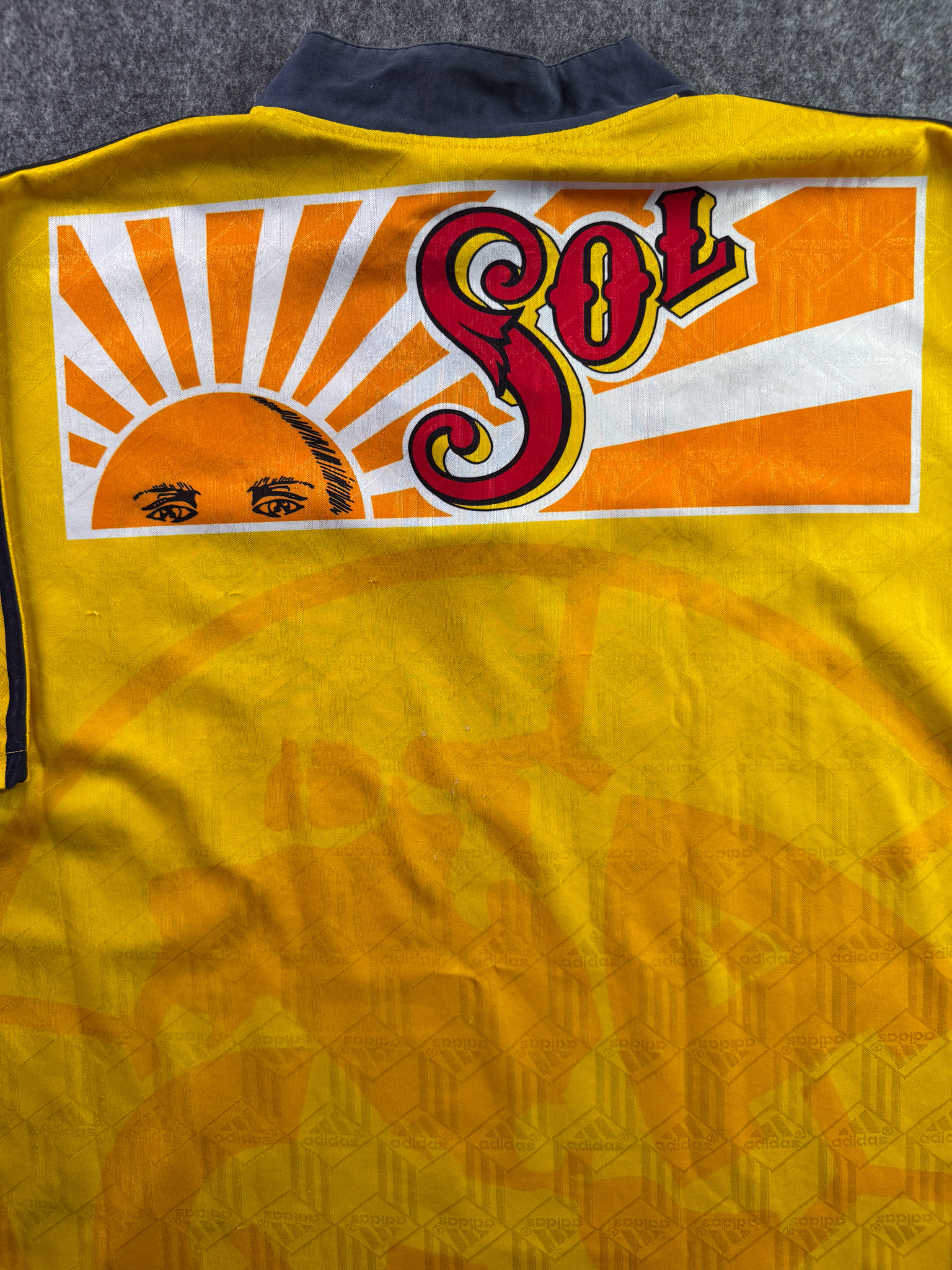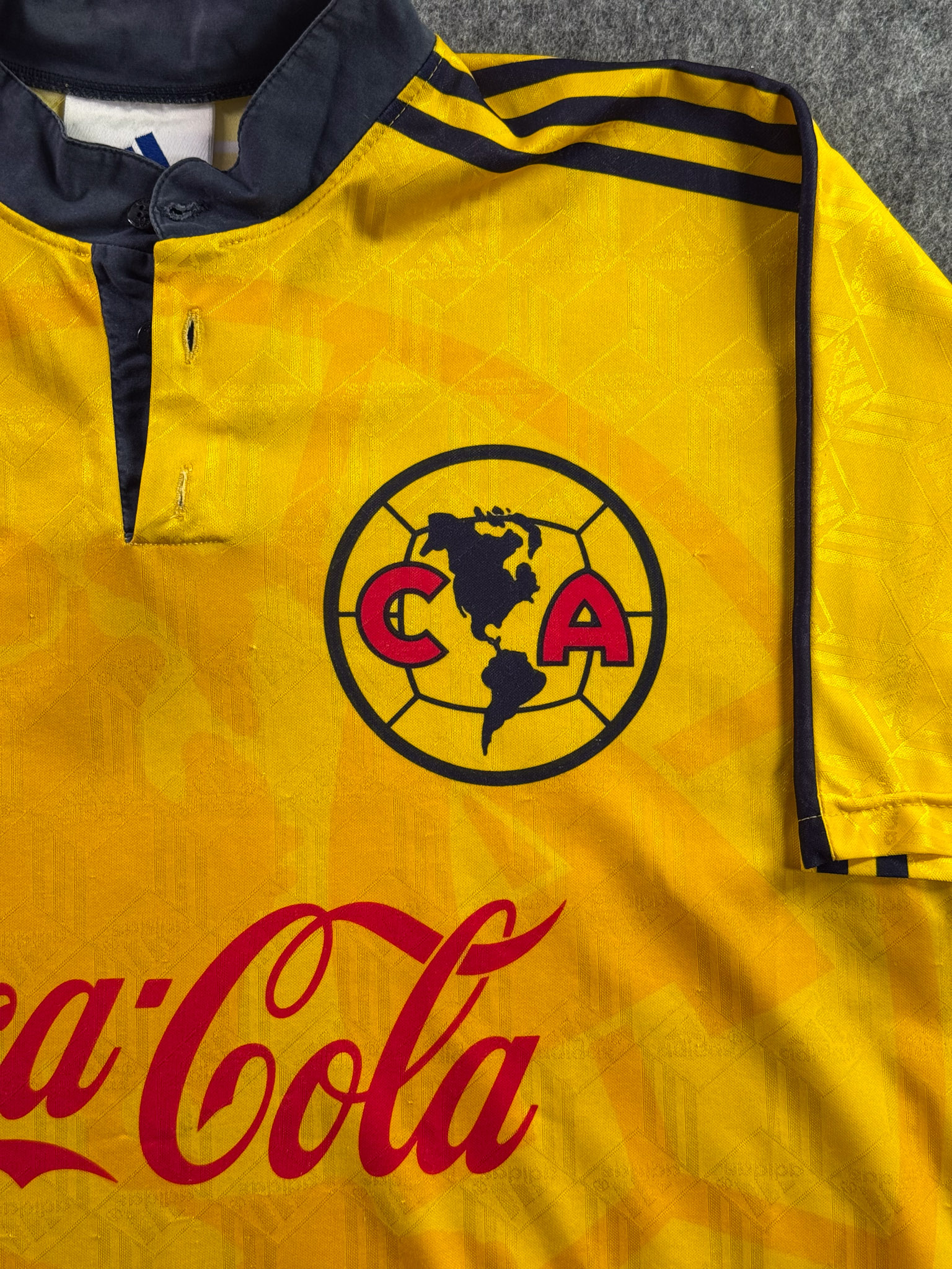 Jersey del América fabricado por Adidas, originario de México. Se trata de la equipación Local correspondiente a la temporada 98-99. Talla L, con dorsal ‘No’ y en condición Excelente. Detalles: Ligeras bolitas en la tela, le falta el botón de abajo del cuello.