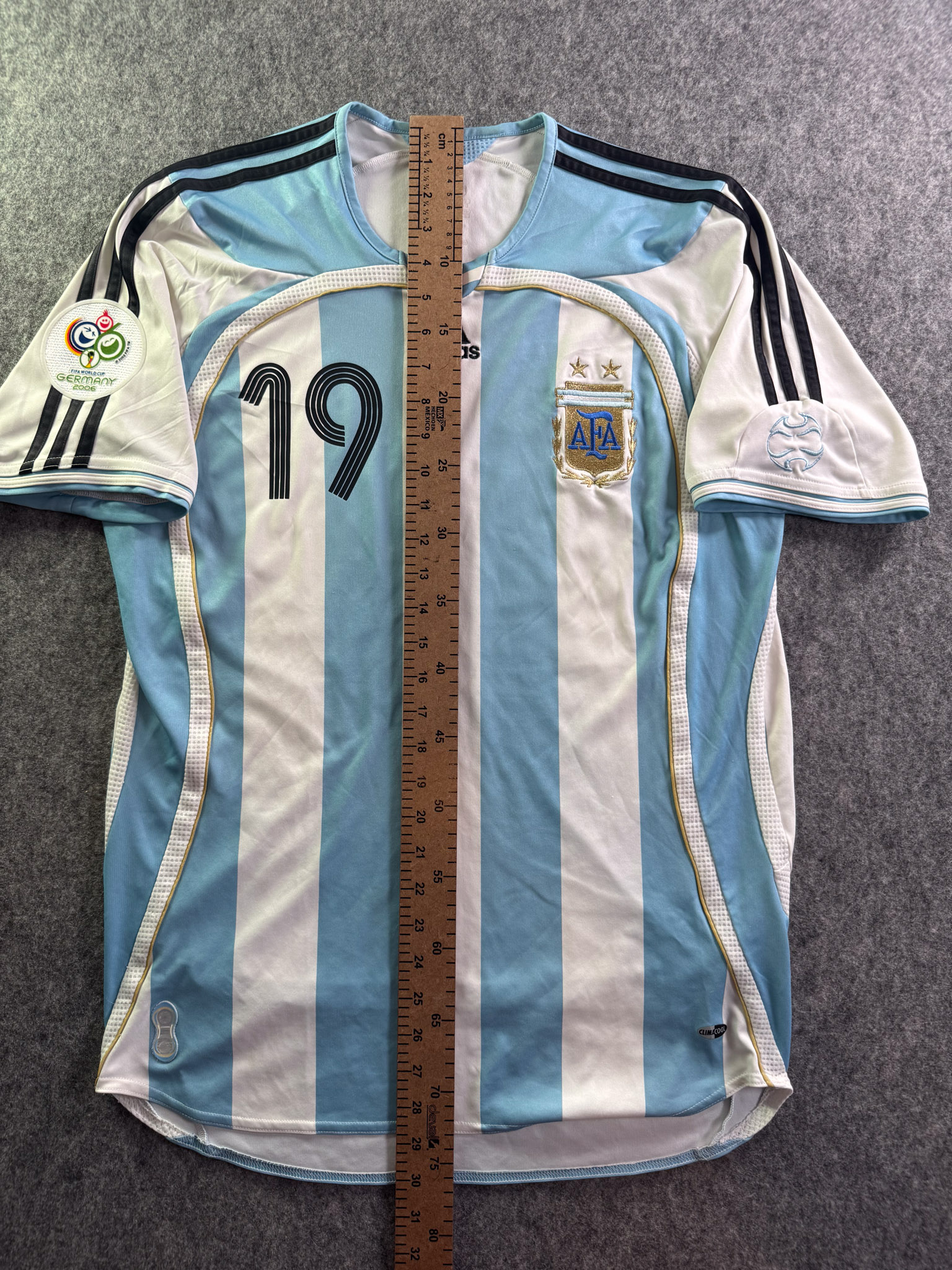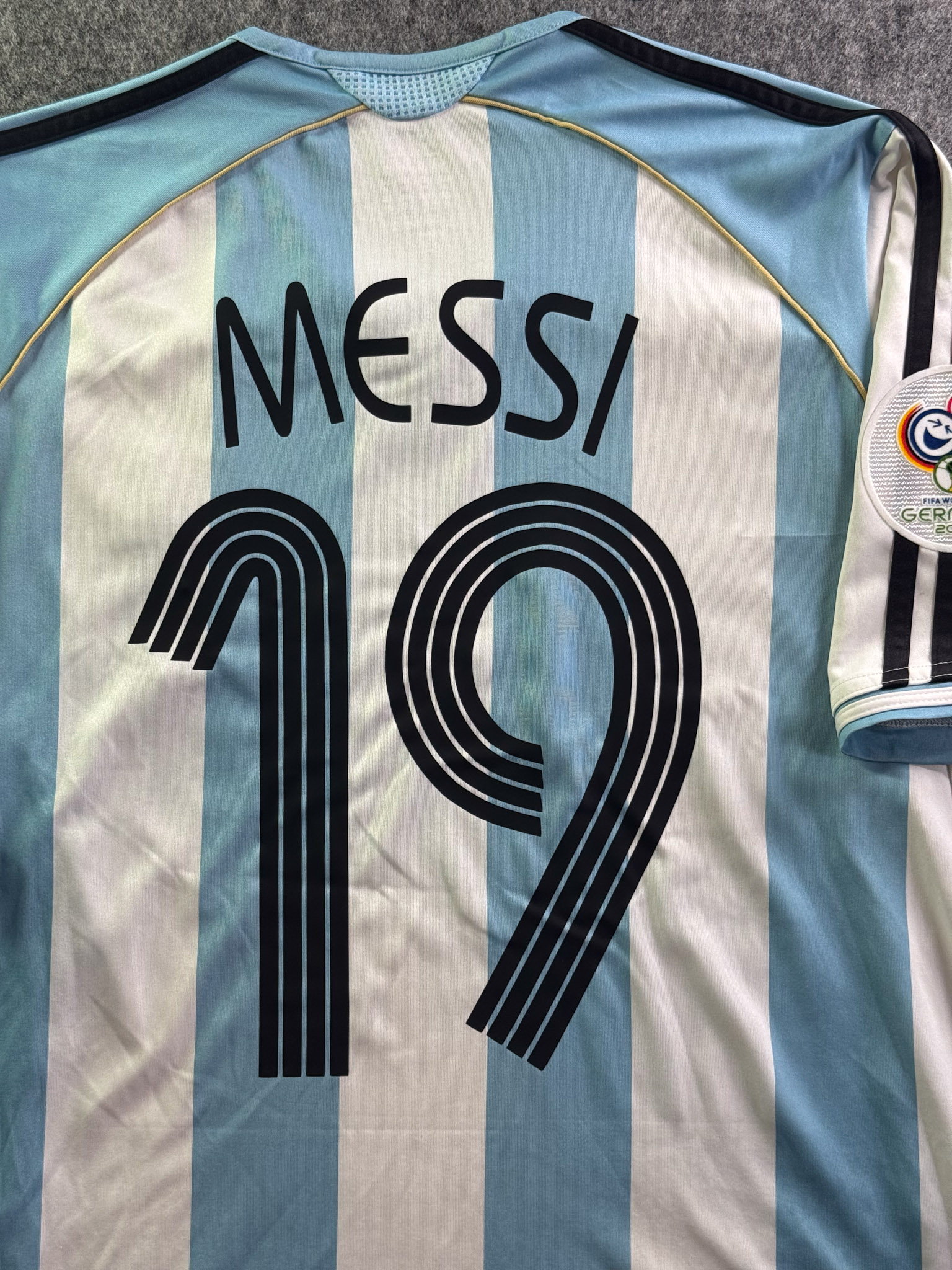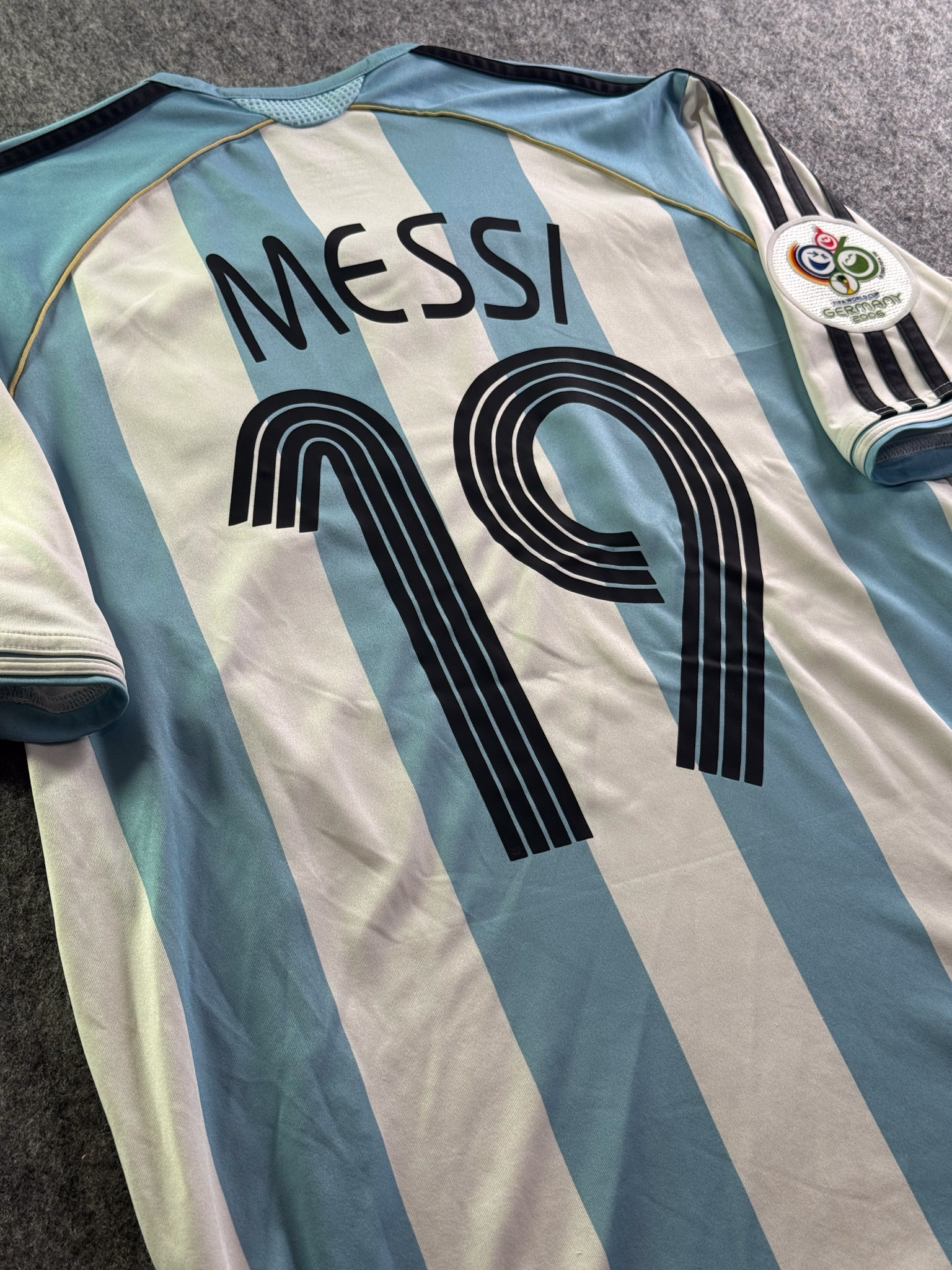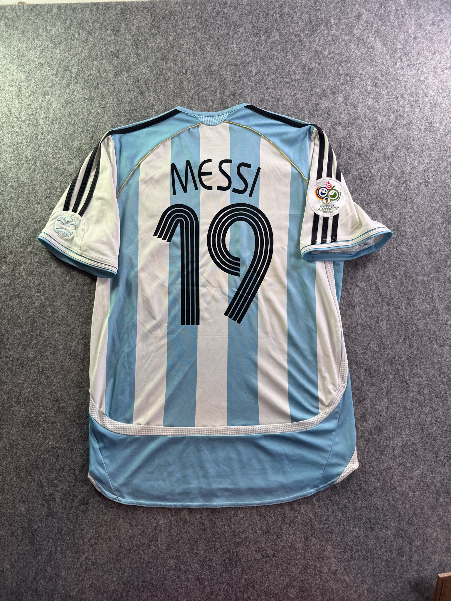 Jersey del Selección Argentina fabricado por Adidas, originario de Argentina. Se trata de la equipación Local correspondiente a la temporada 2006. Talla M, con dorsal ‘Messi 19’ y en condición Excelente. Detalles: Parches del Mundial 2006.