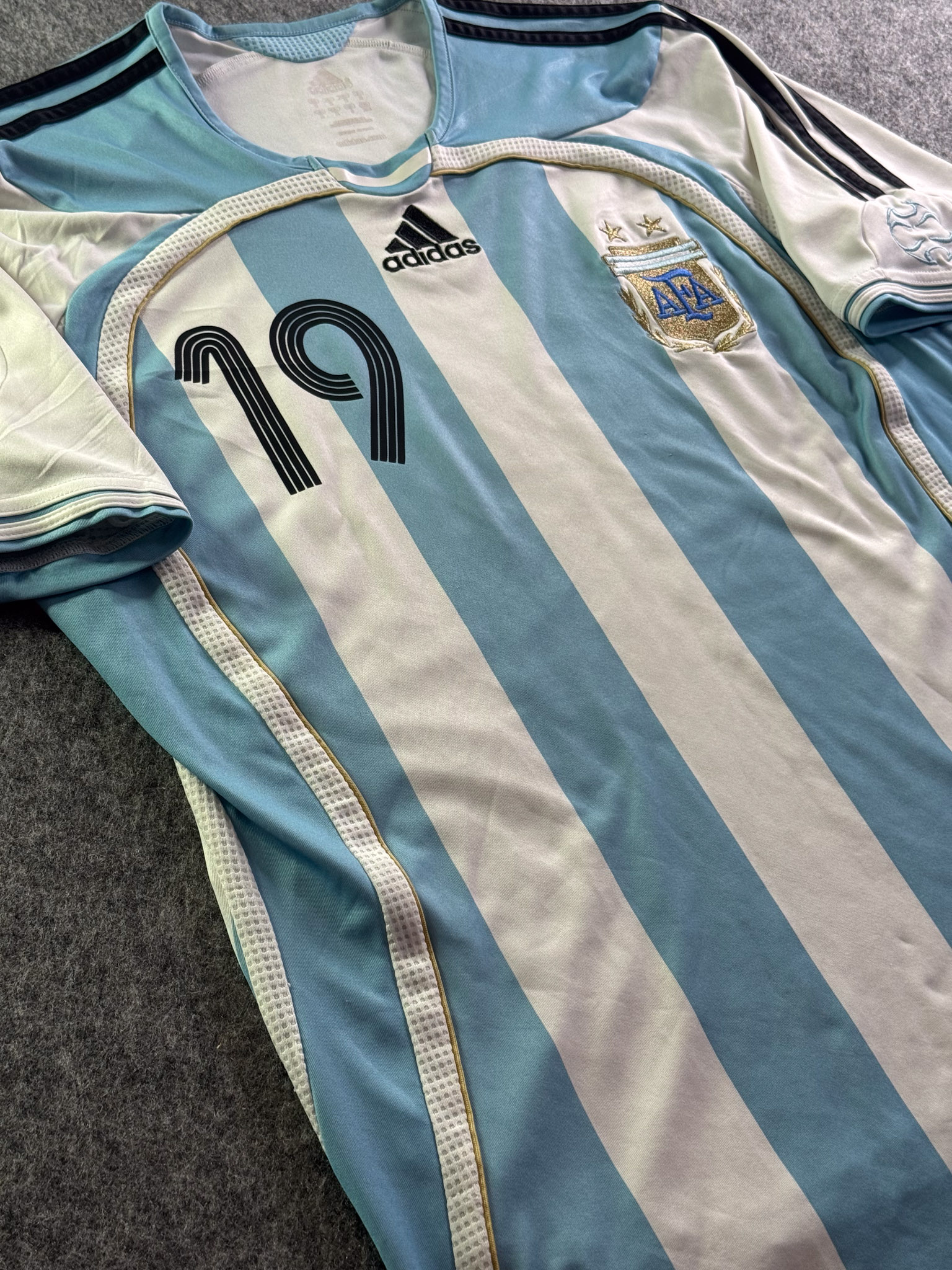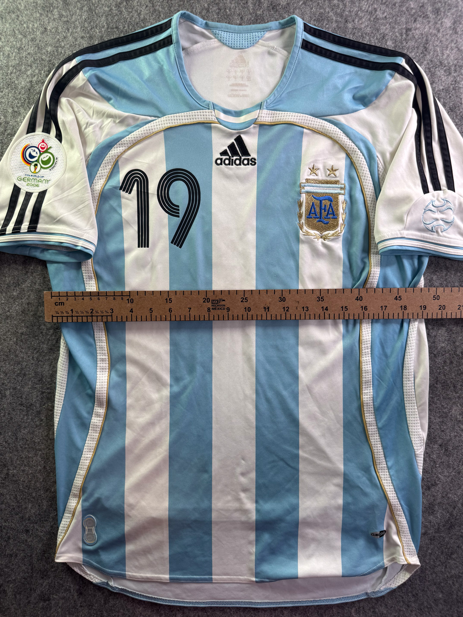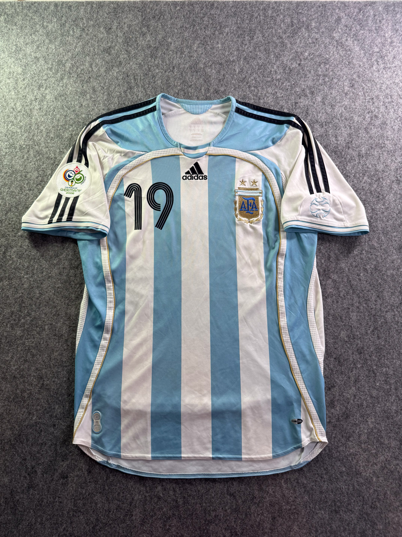 Jersey del Selección Argentina fabricado por Adidas, originario de Argentina. Se trata de la equipación Local correspondiente a la temporada 2006. Talla M, con dorsal ‘Messi 19’ y en condición Excelente. Detalles: Parches del Mundial 2006.