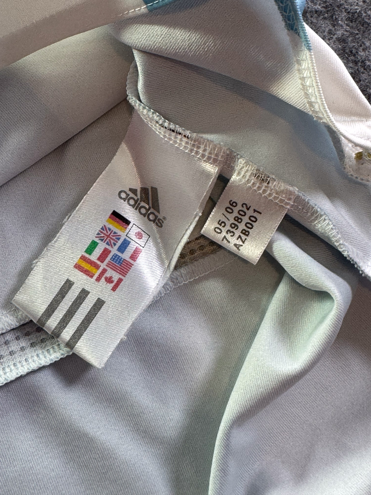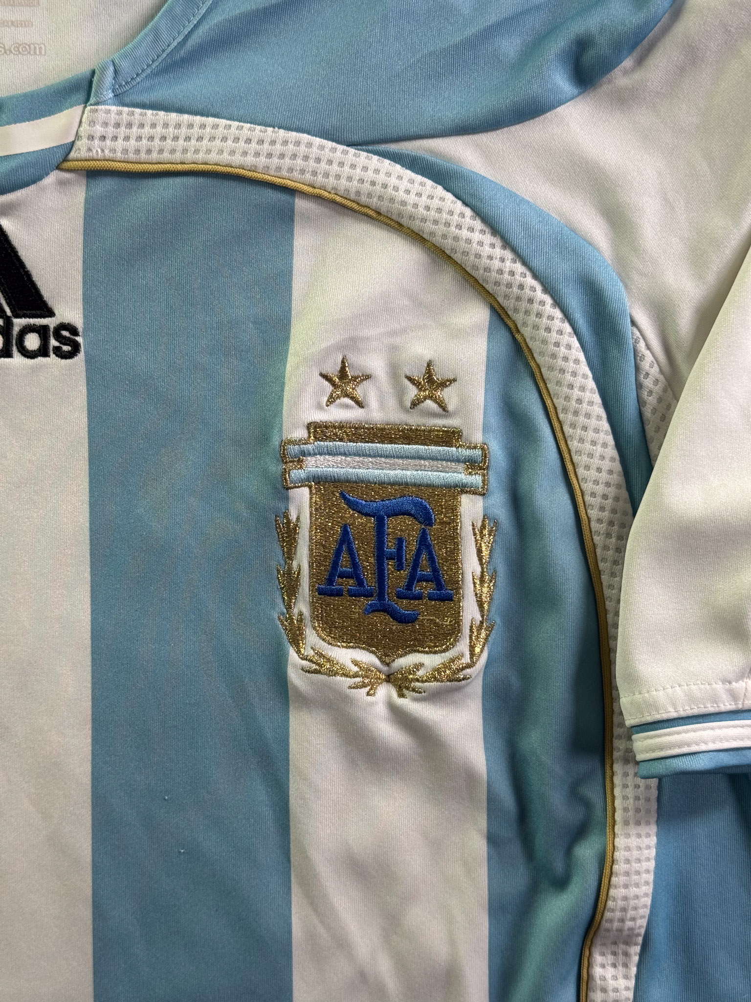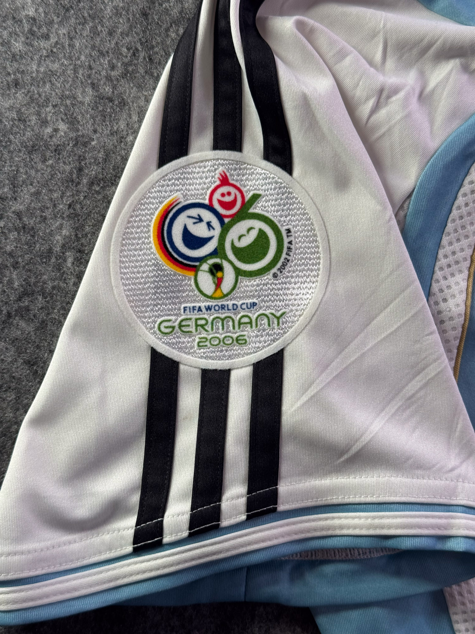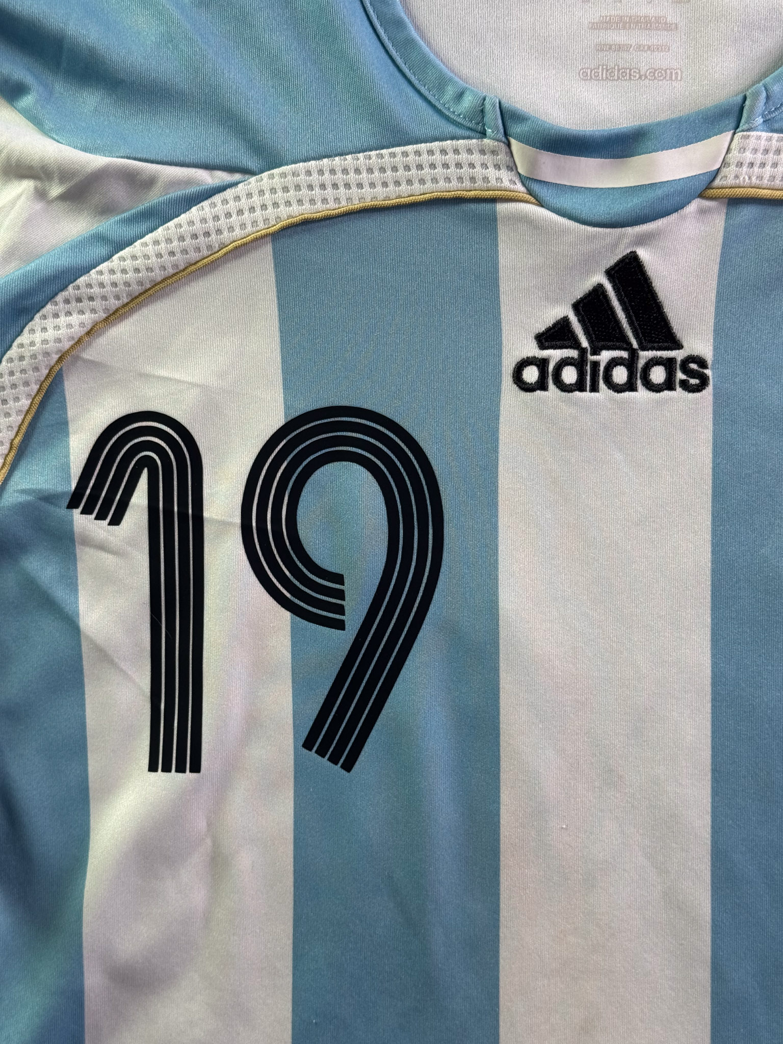 Jersey del Selección Argentina fabricado por Adidas, originario de Argentina. Se trata de la equipación Local correspondiente a la temporada 2006. Talla M, con dorsal ‘Messi 19’ y en condición Excelente. Detalles: Parches del Mundial 2006.