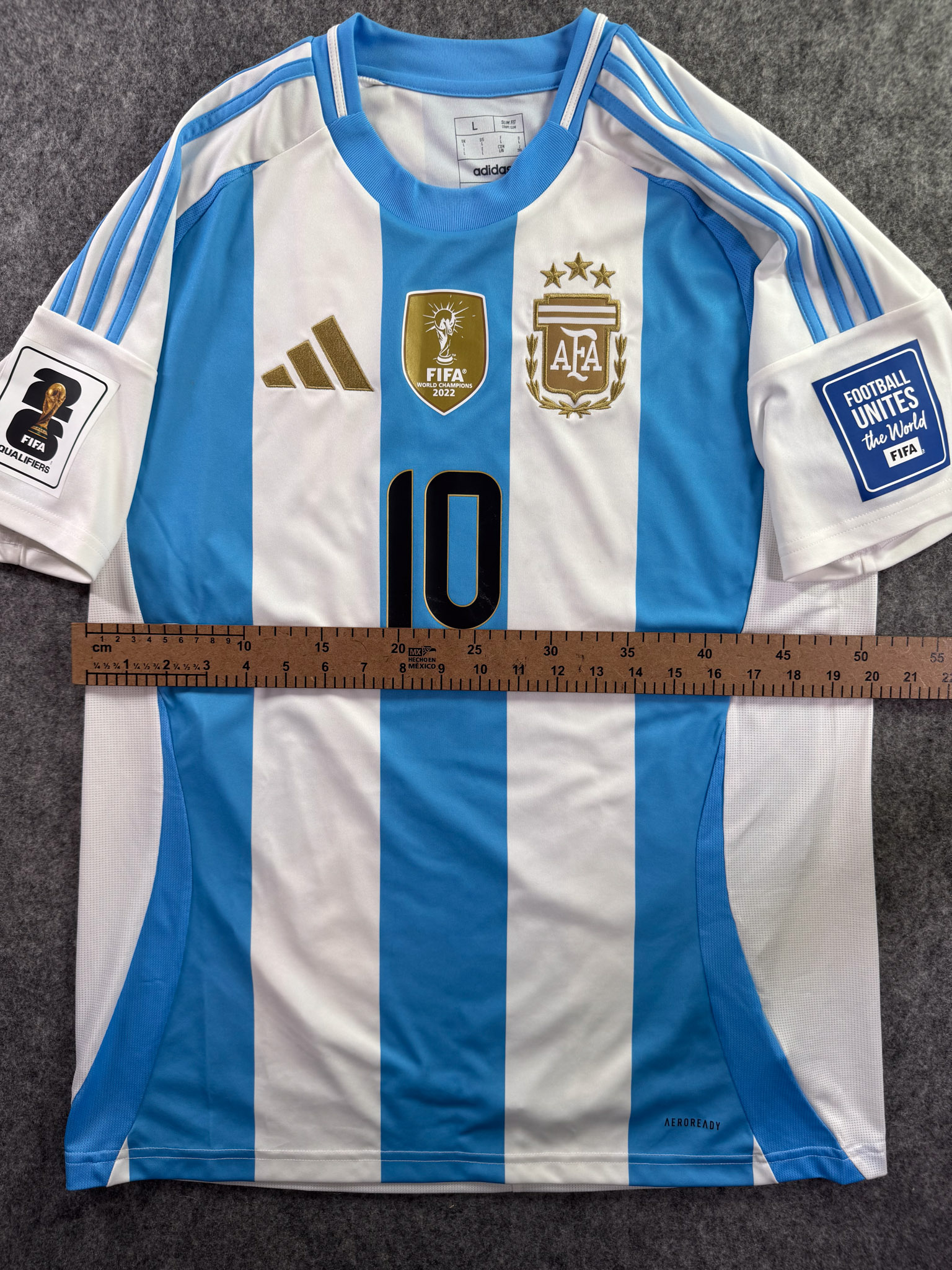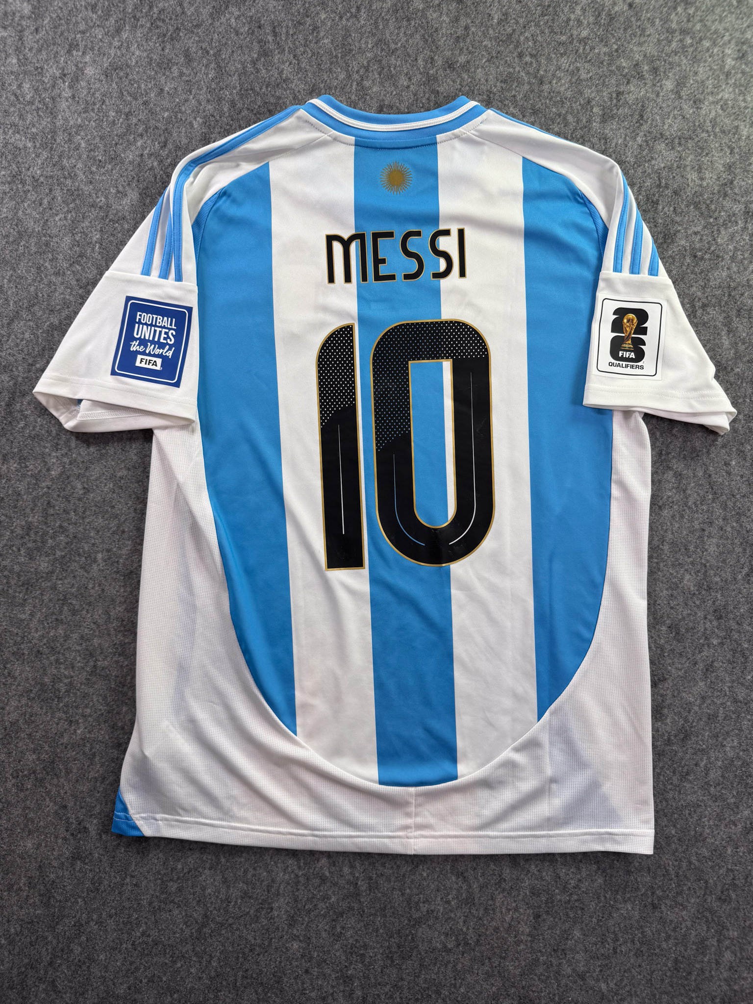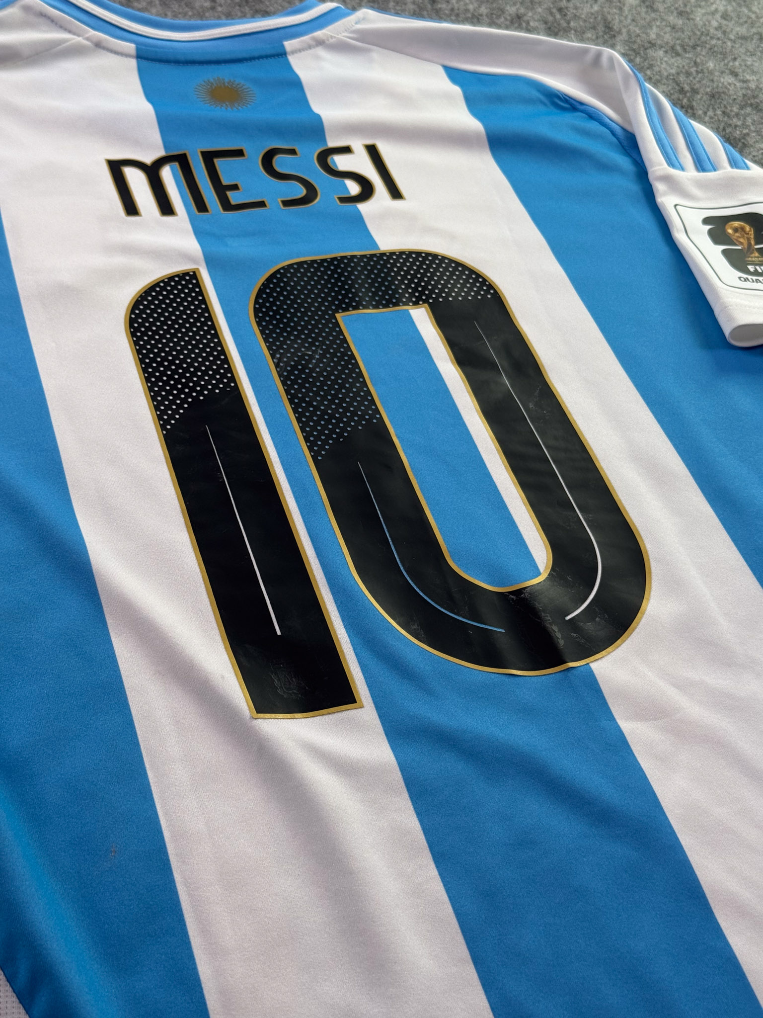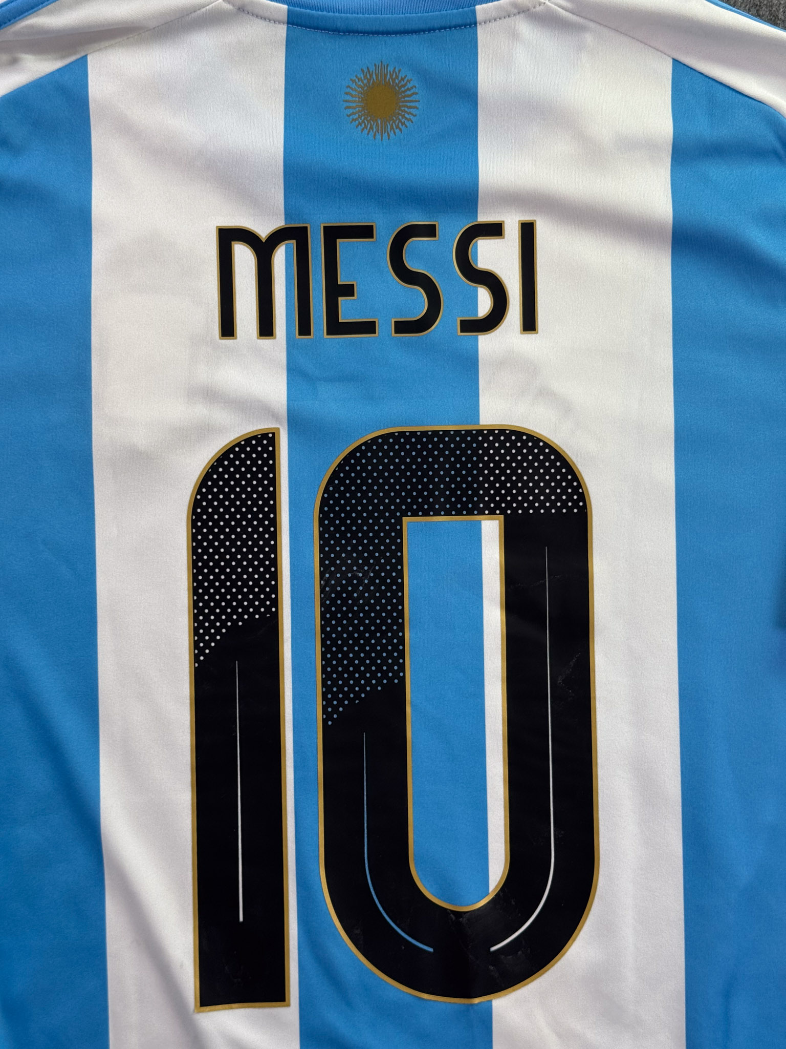Jersey del Selección Argentina fabricado por Adidas, originario de Argentina. Se trata de la equipación Local correspondiente a la temporada 16-07. Talla L, con dorsal ‘Messi 10’ y en condición Excelente. Detalles: PArches eliminatorias, parche de campeón del mundo.
