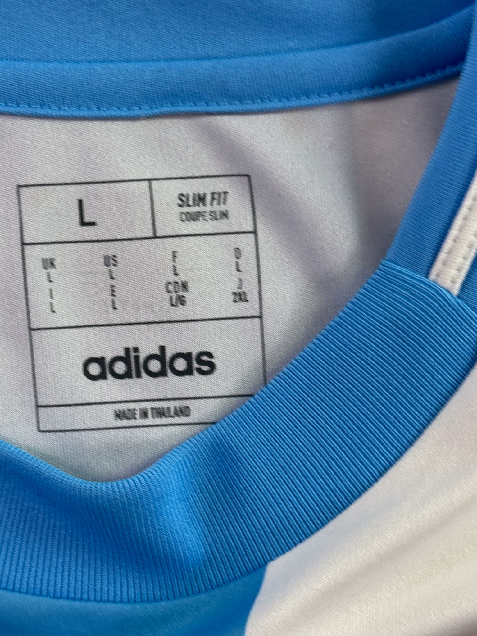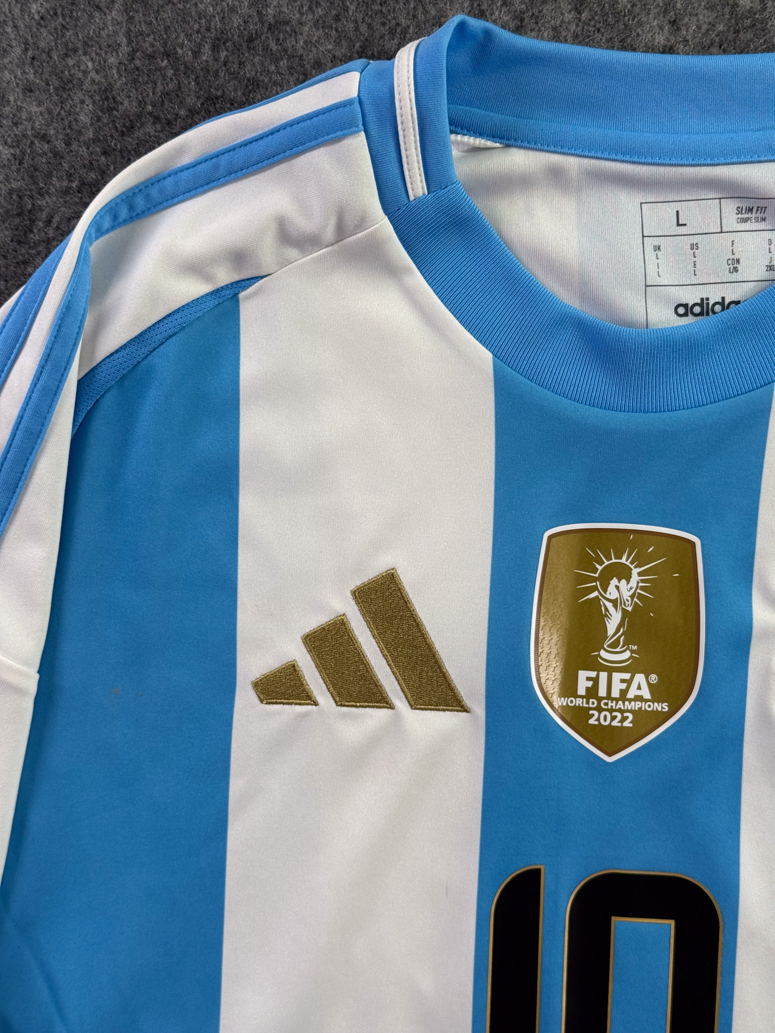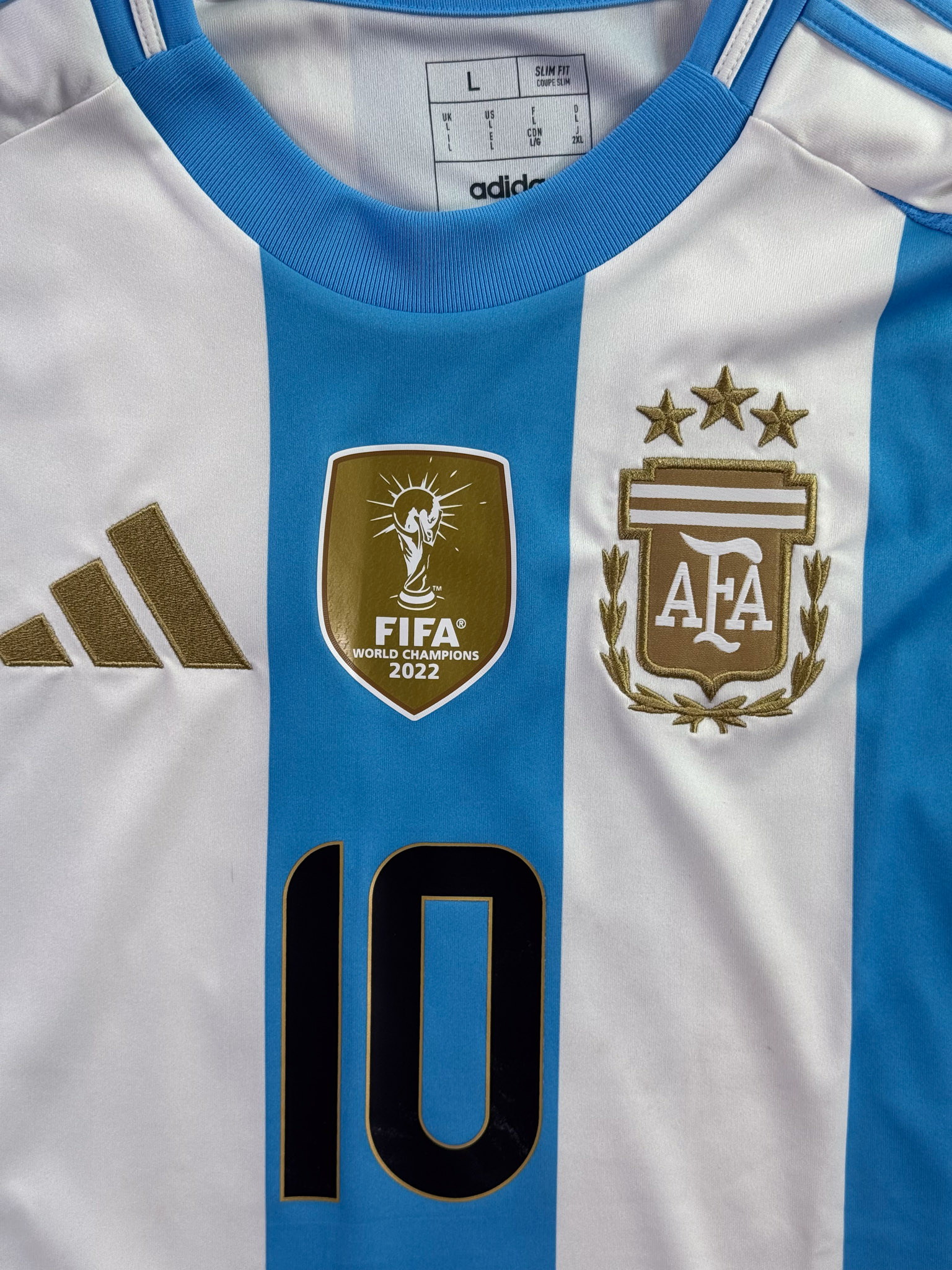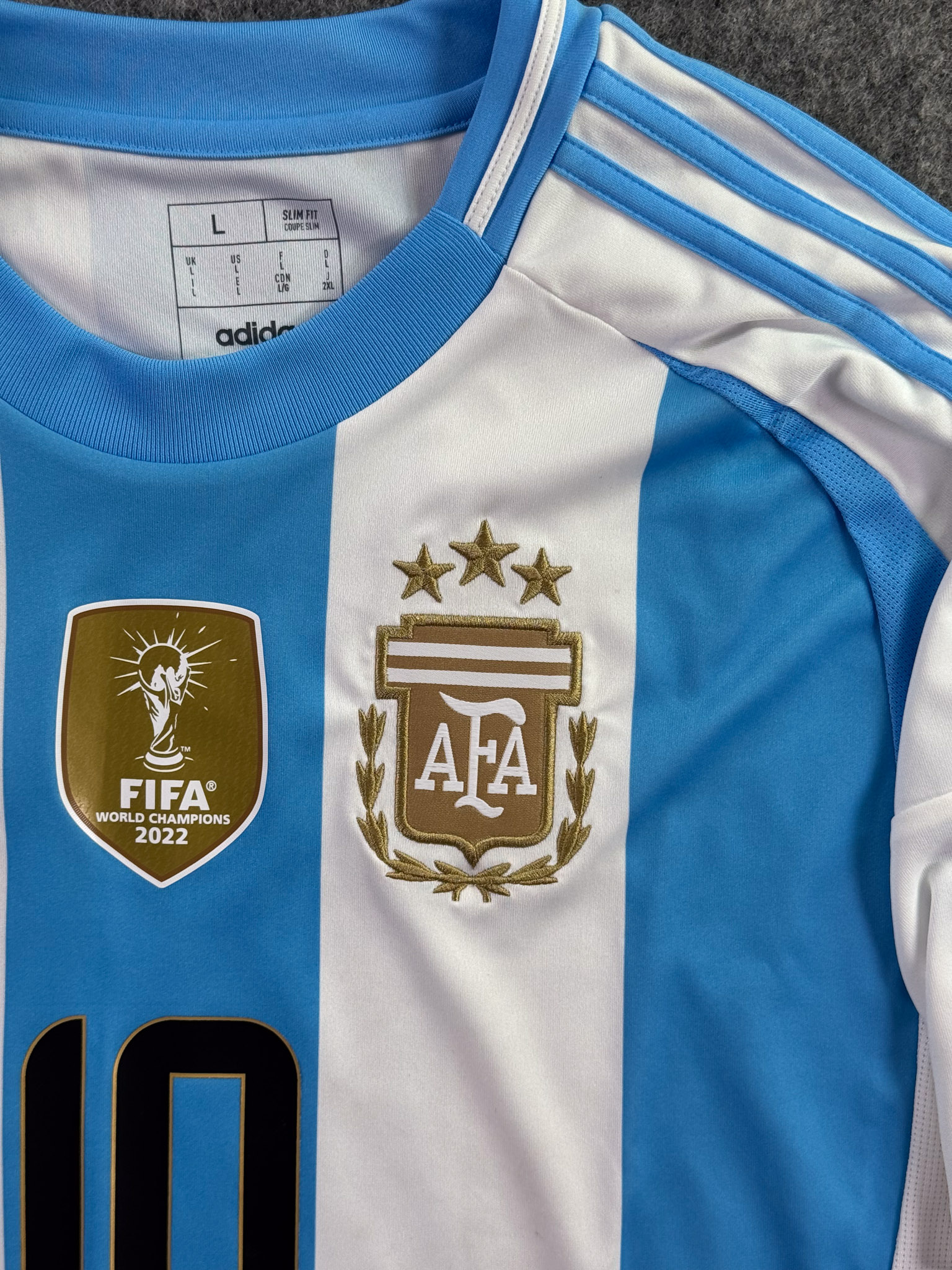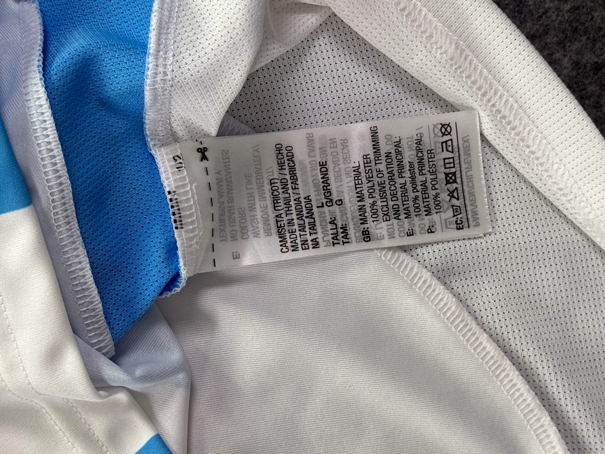 Jersey del Selección Argentina fabricado por Adidas, originario de Argentina. Se trata de la equipación Local correspondiente a la temporada 16-07. Talla L, con dorsal ‘Messi 10’ y en condición Excelente. Detalles: PArches eliminatorias, parche de campeón del mundo.