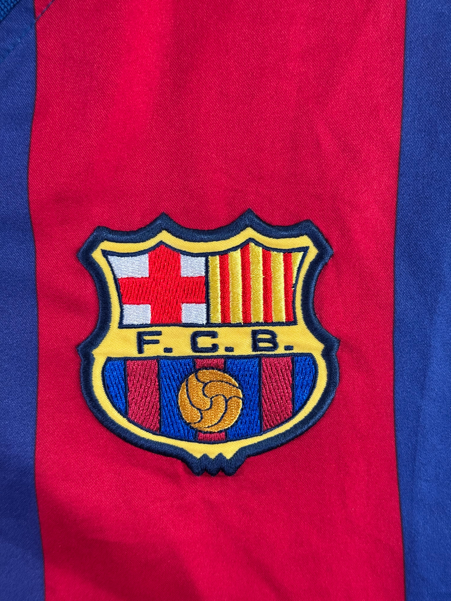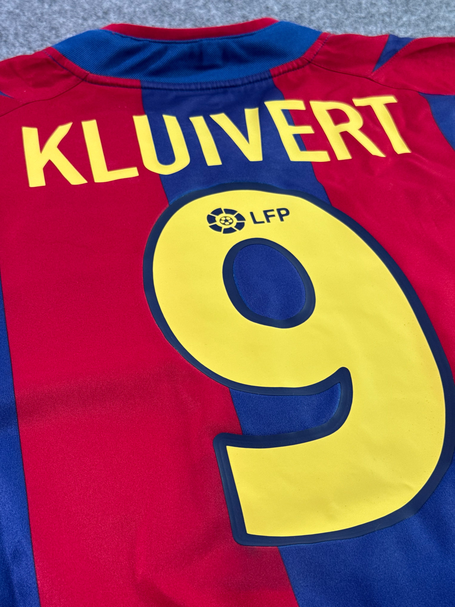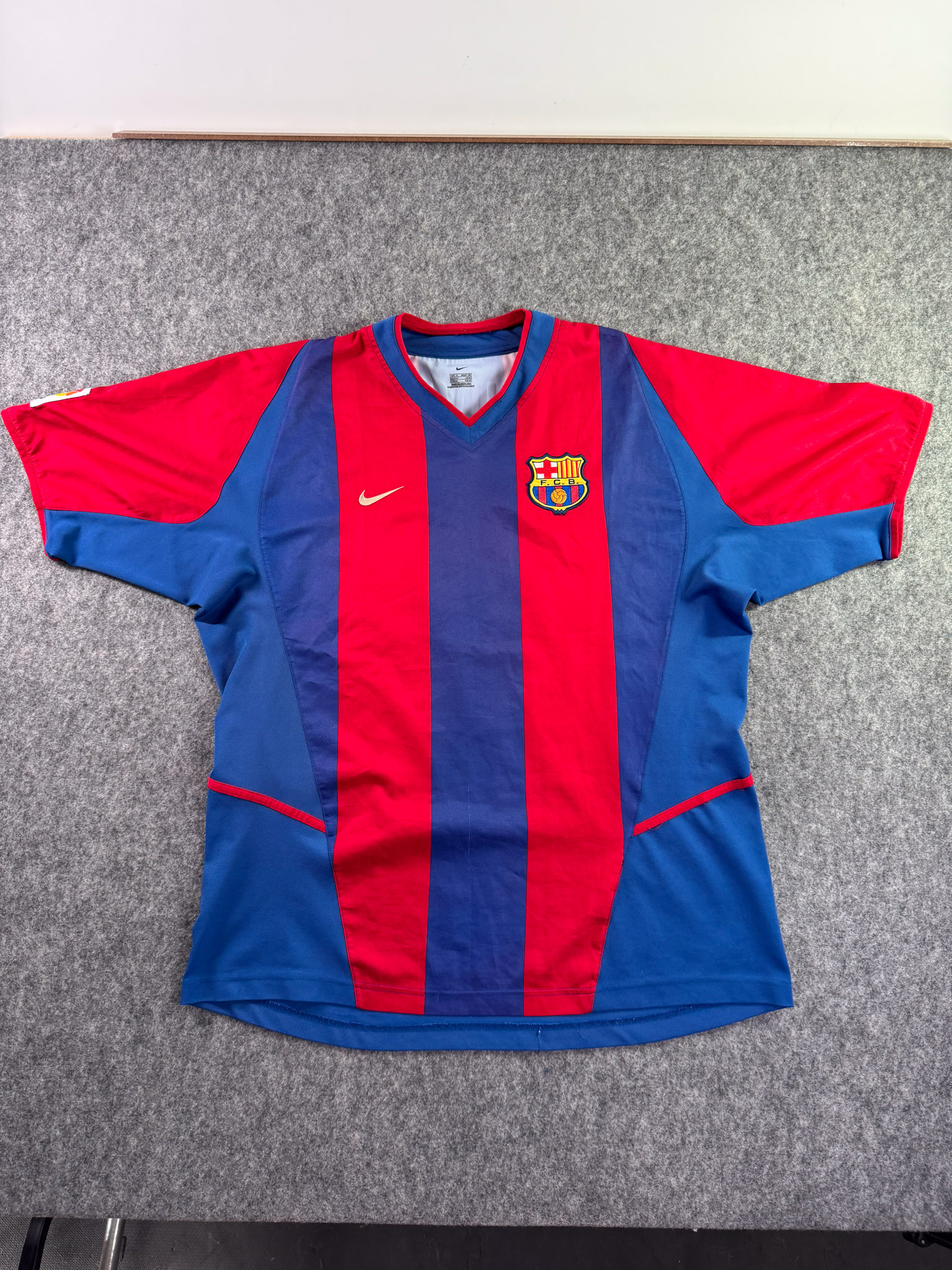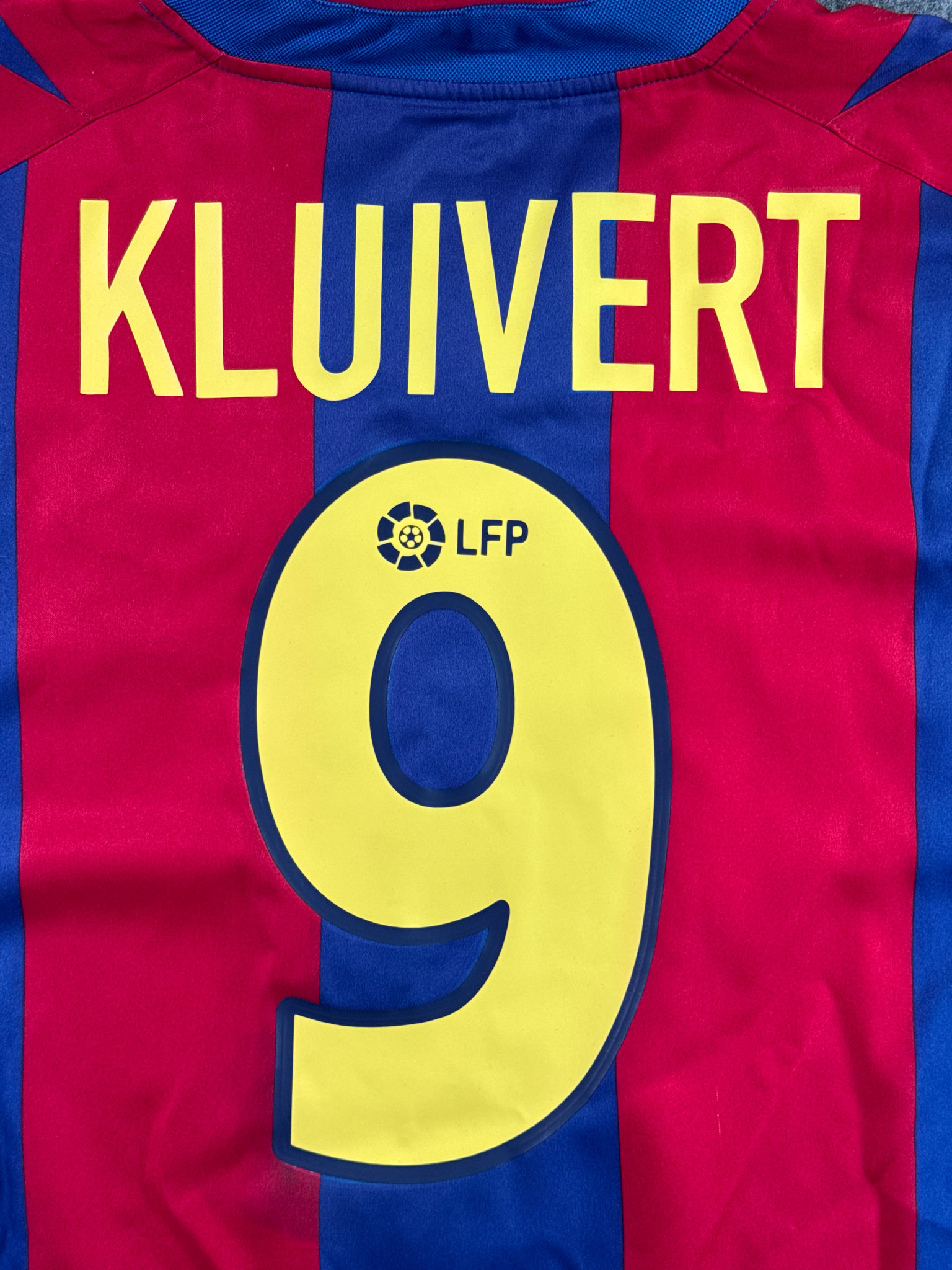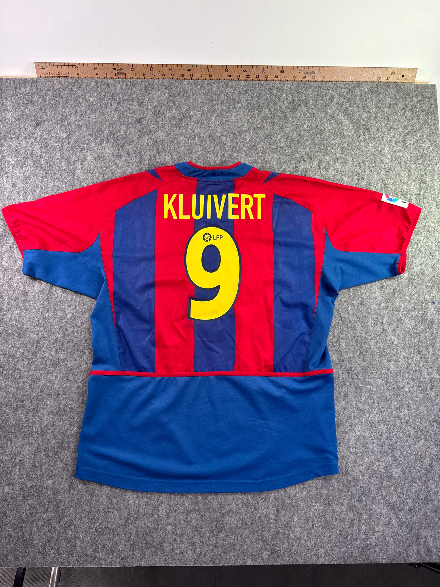 Jersey del Barcelona fabricado por Nike, originario de España. Se trata de la equipación Local correspondiente a la temporada 02-03. Talla XL , con dorsal ‘Kluivert 9’ y en condición Excelente. Detalles: Algunos hilos jalados, ligeras manchas en la tela.