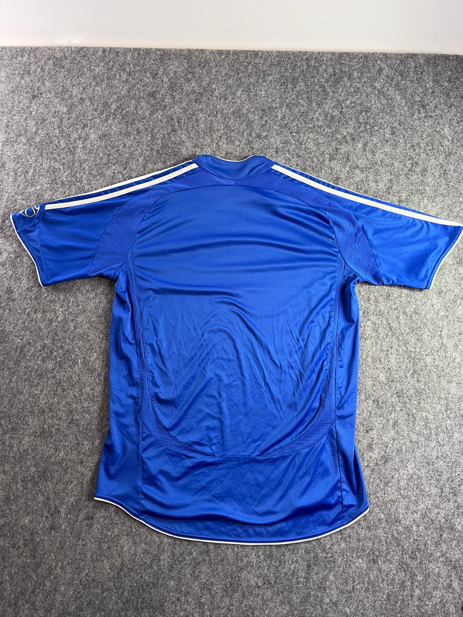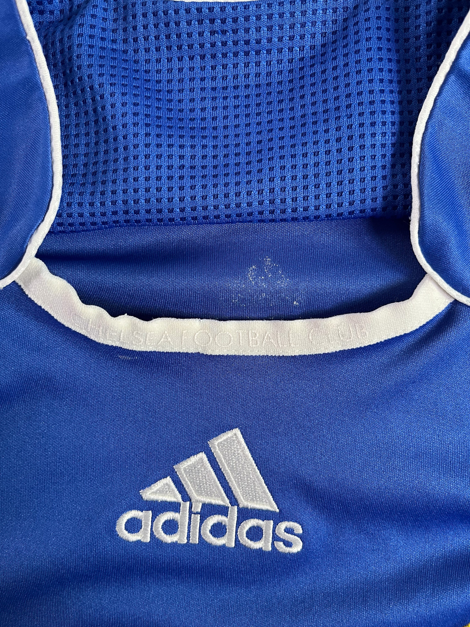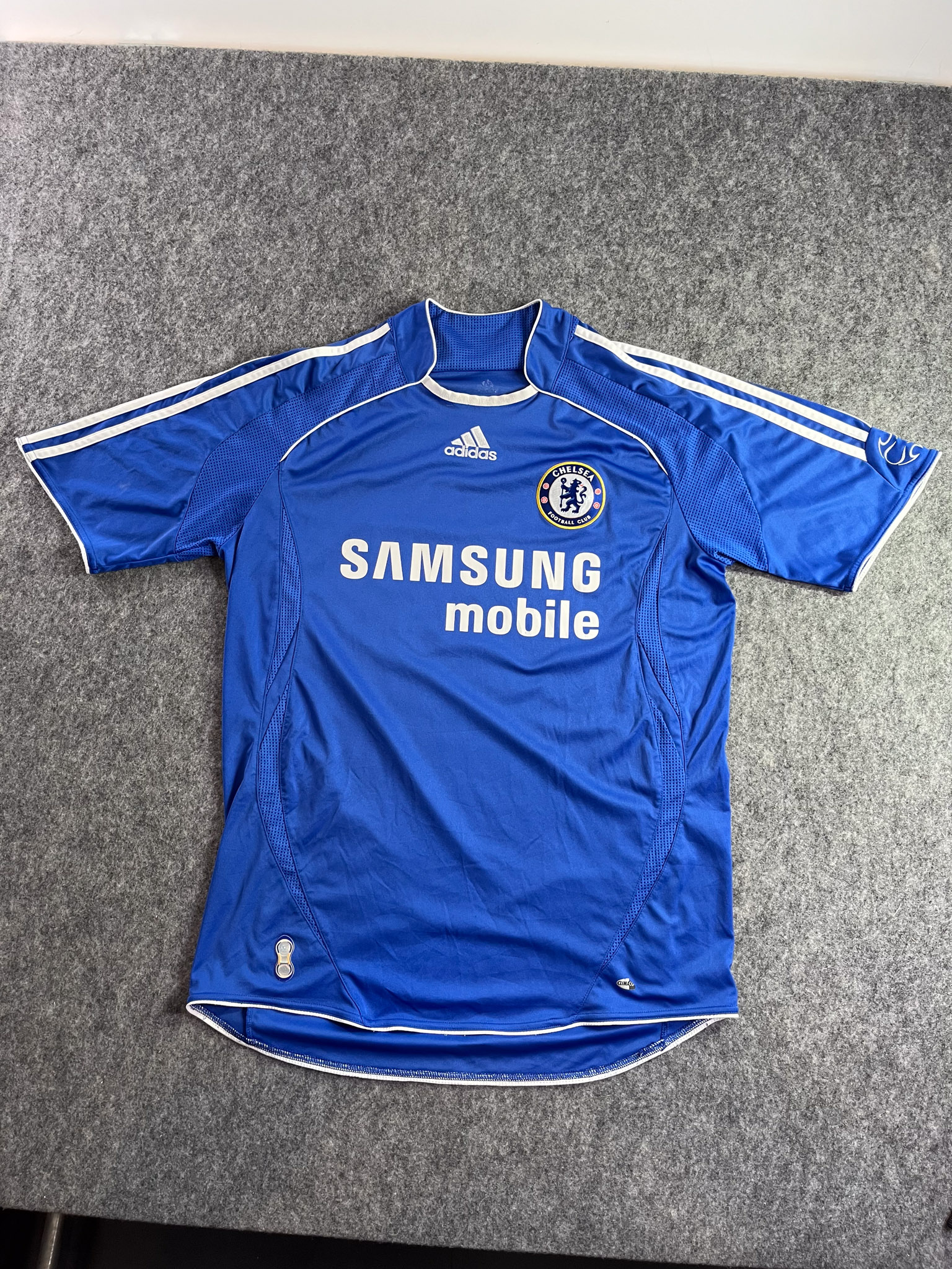 Jersey del Chelsea fabricado por Adidas, originario de Inglaterra. Se trata de la equipación Local correspondiente a la temporada 07-08. Talla M, con dorsal ‘No’ y en condición Muy Buena . Detalles: Desgaste en el patrocinador principal y deagaste en logo climacool inferior izquierdo.
