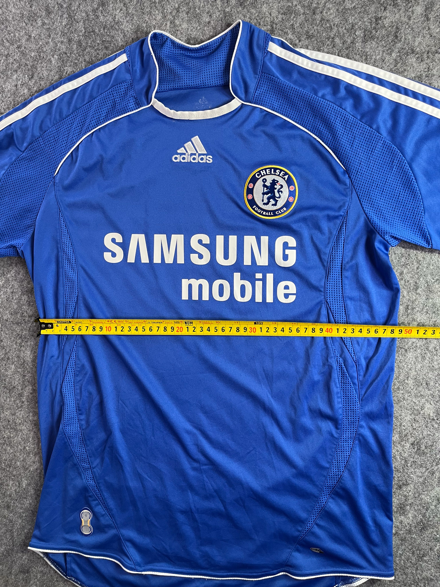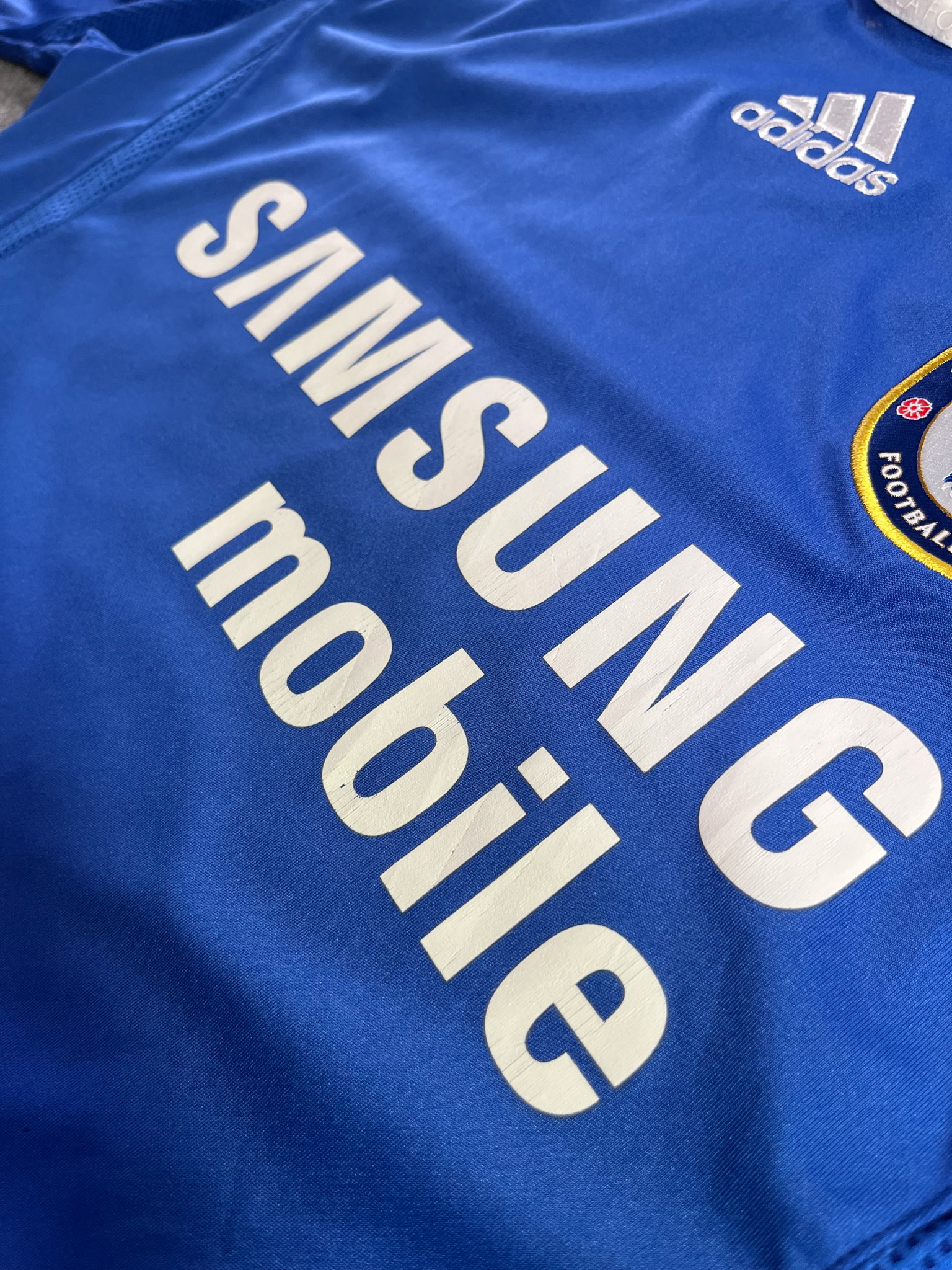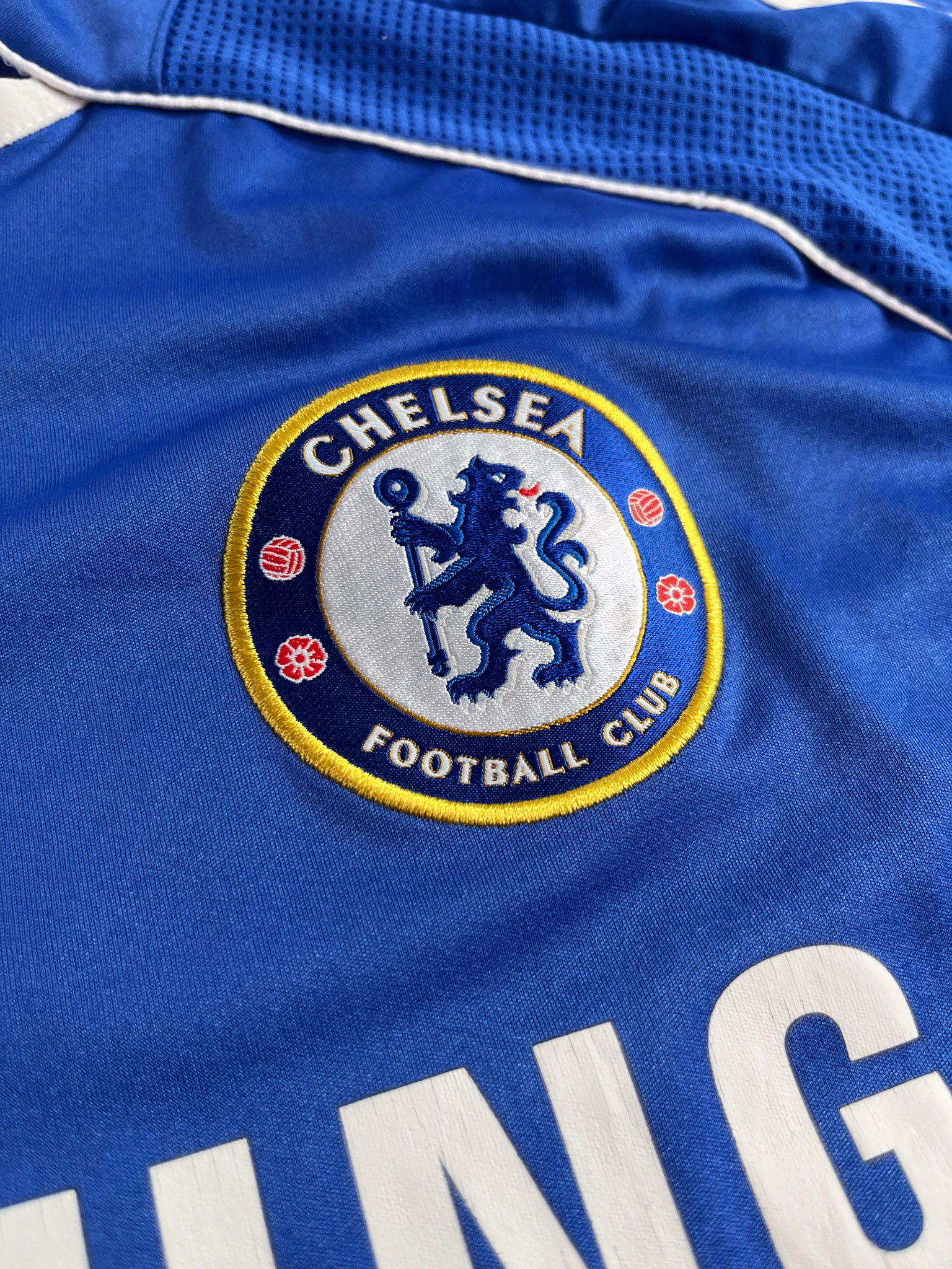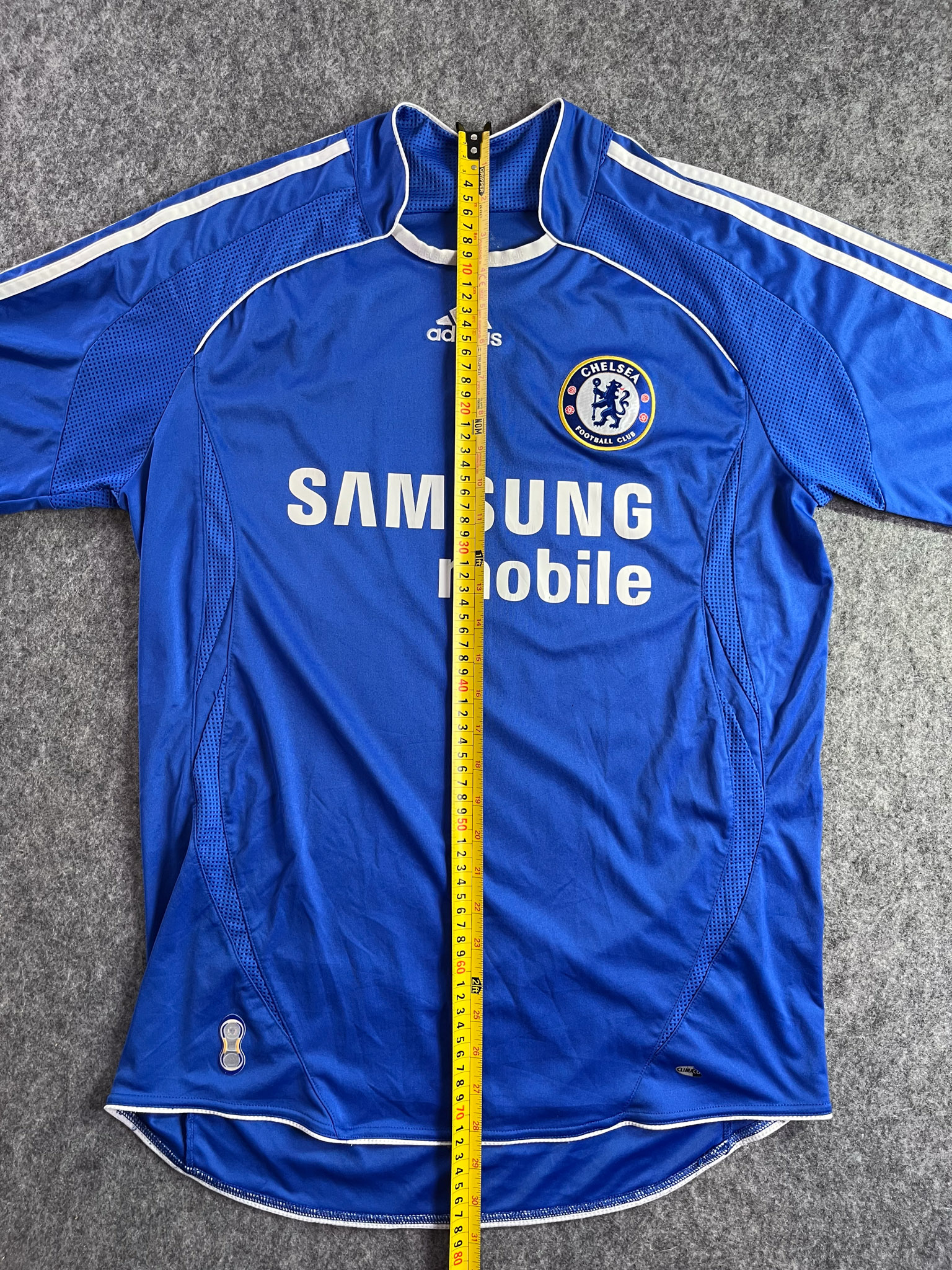 Jersey del Chelsea fabricado por Adidas, originario de Inglaterra. Se trata de la equipación Local correspondiente a la temporada 07-08. Talla M, con dorsal ‘No’ y en condición Muy Buena . Detalles: Desgaste en el patrocinador principal y deagaste en logo climacool inferior izquierdo.