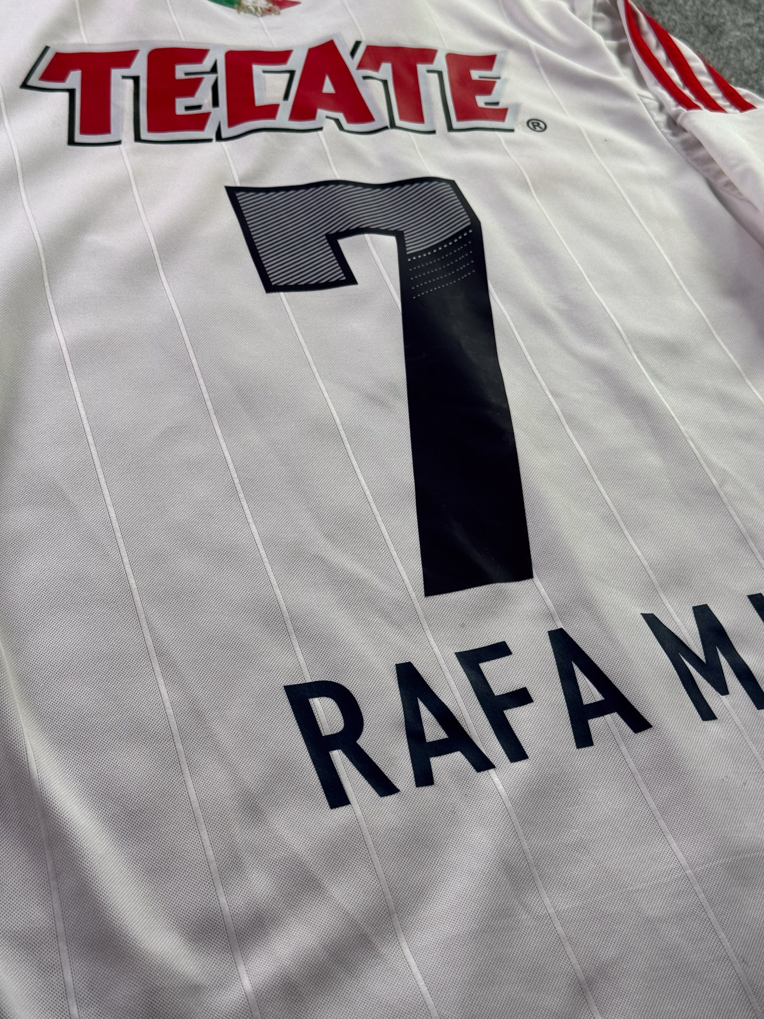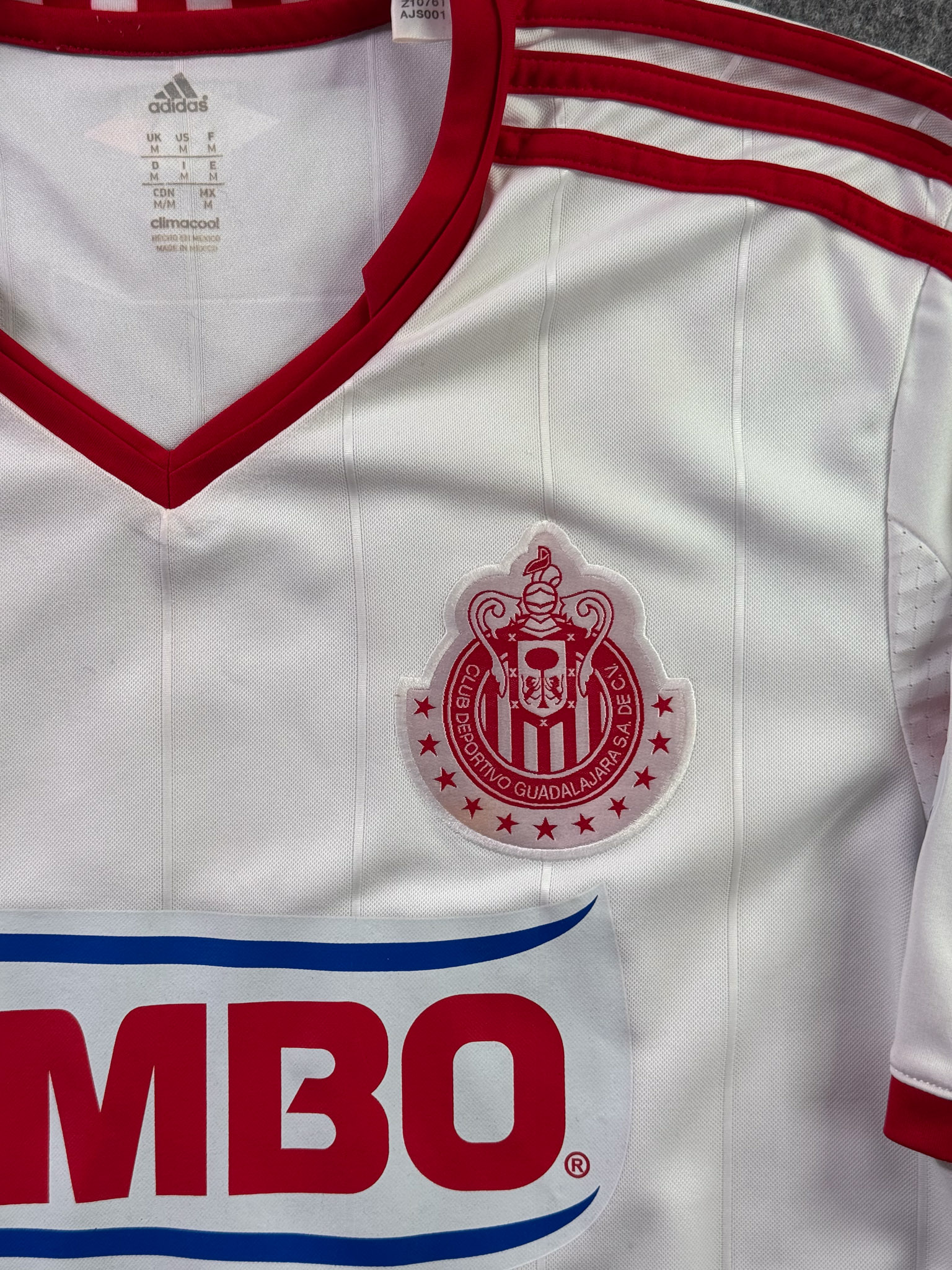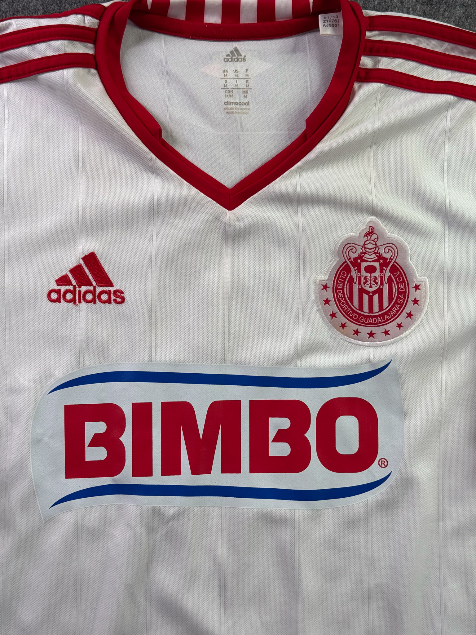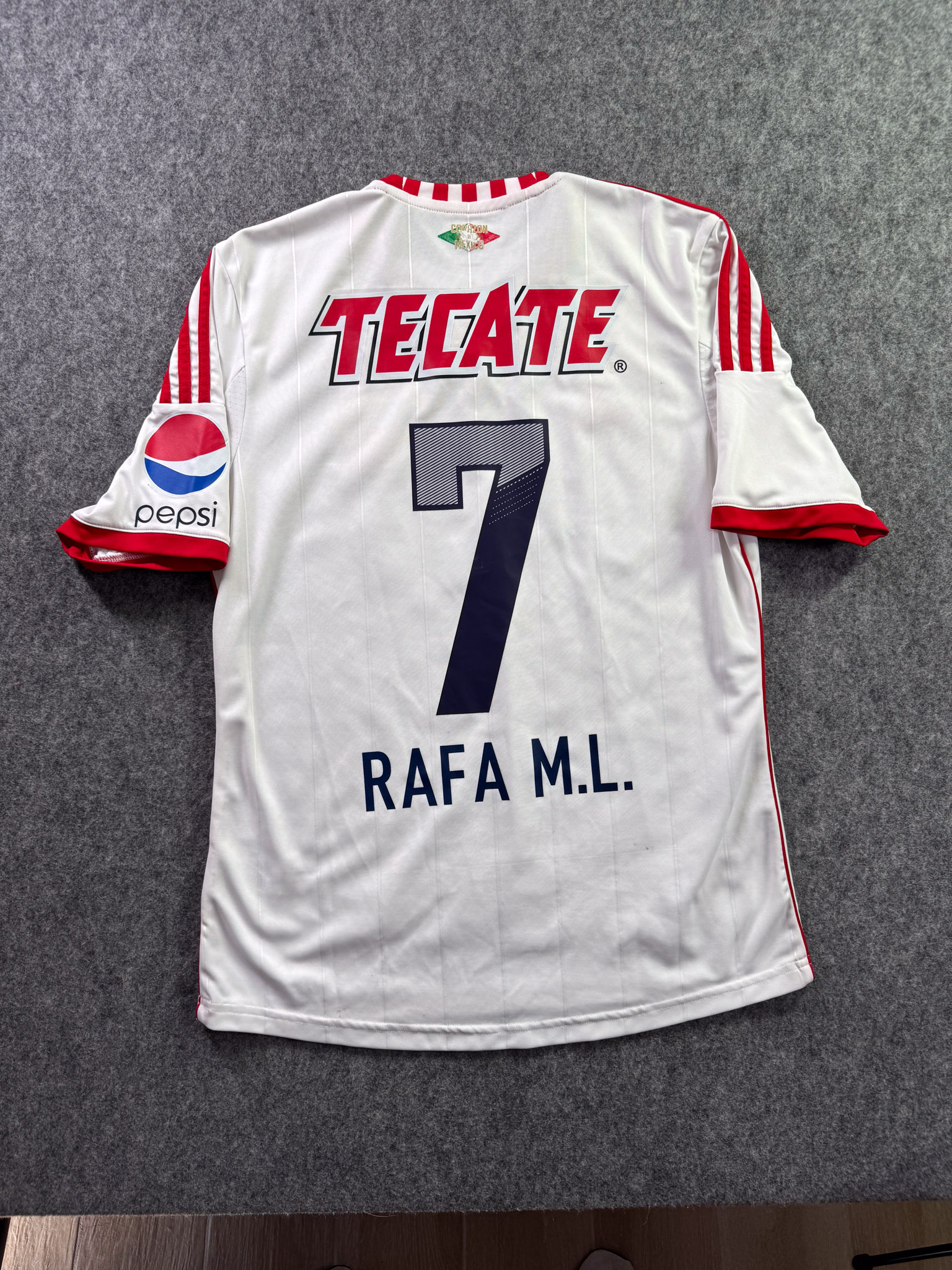 Jersey del Chivas fabricado por Adidas, originario de México. Se trata de la equipación Visita correspondiente a la temporada 12-13. Talla M, con dorsal ‘R.M. Lugo 7’ y en condición Muy Buena. Detalles: Patrocinios de Tecate y Pepsi restaurados.