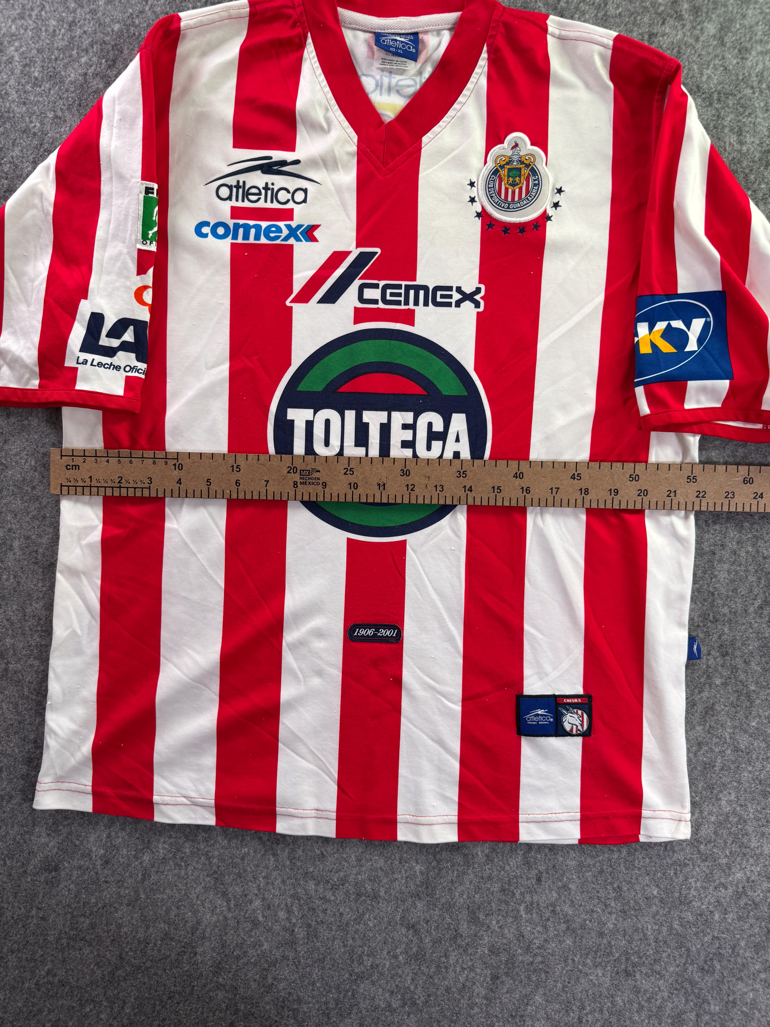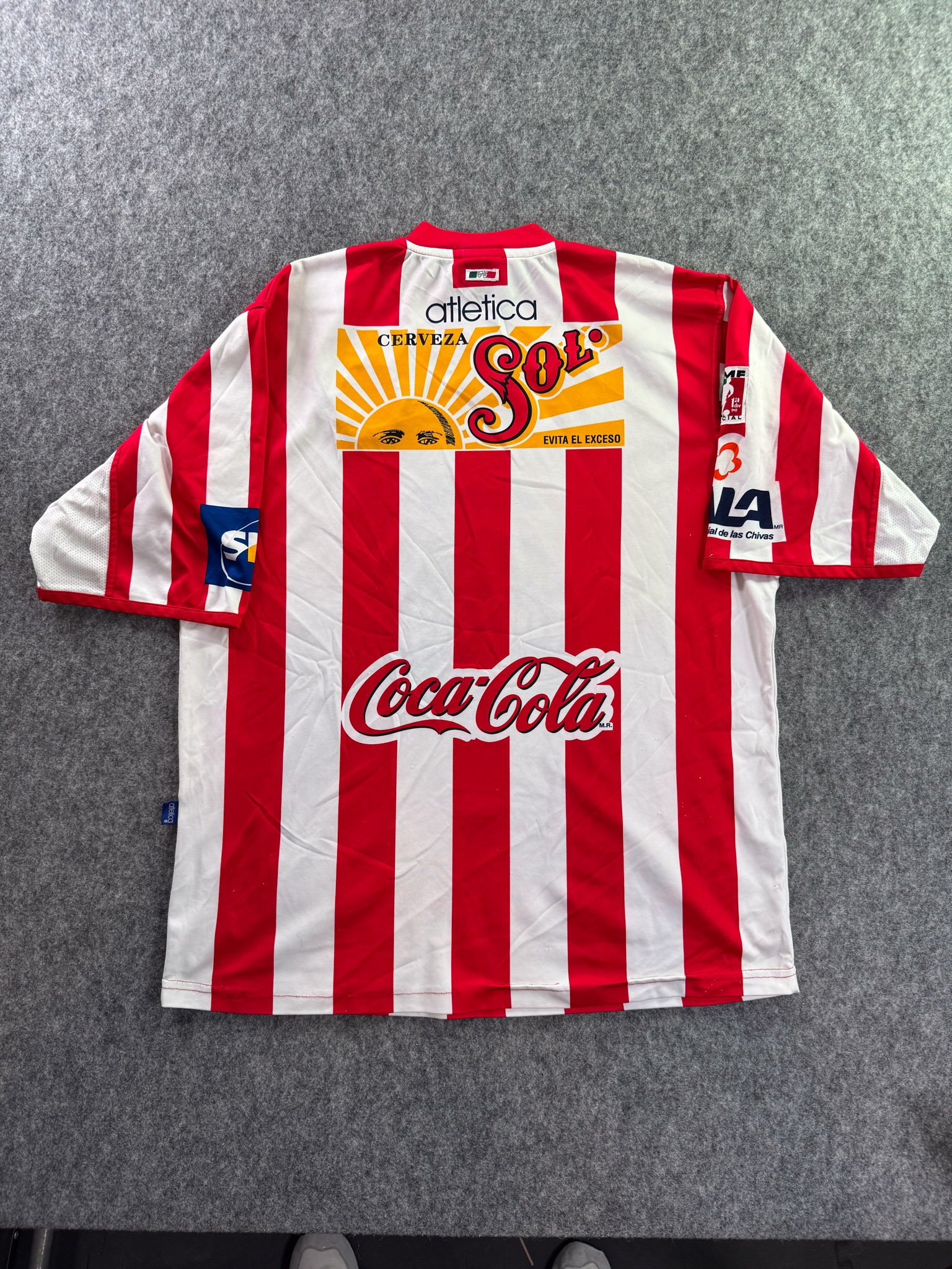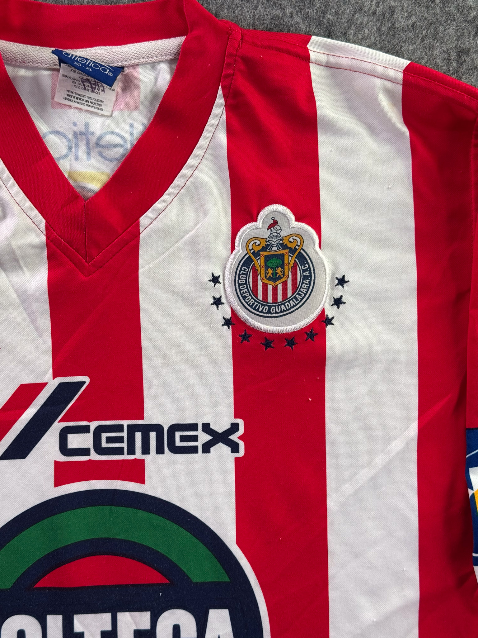 Jersey del Chivas fabricado por Atletica, originario de México. Se trata de la equipación Local correspondiente a la temporada 01-02. Talla XL, con dorsal ‘No’ y en condición Excelente. Detalles: Algunas costuras internas con daño muy leve.