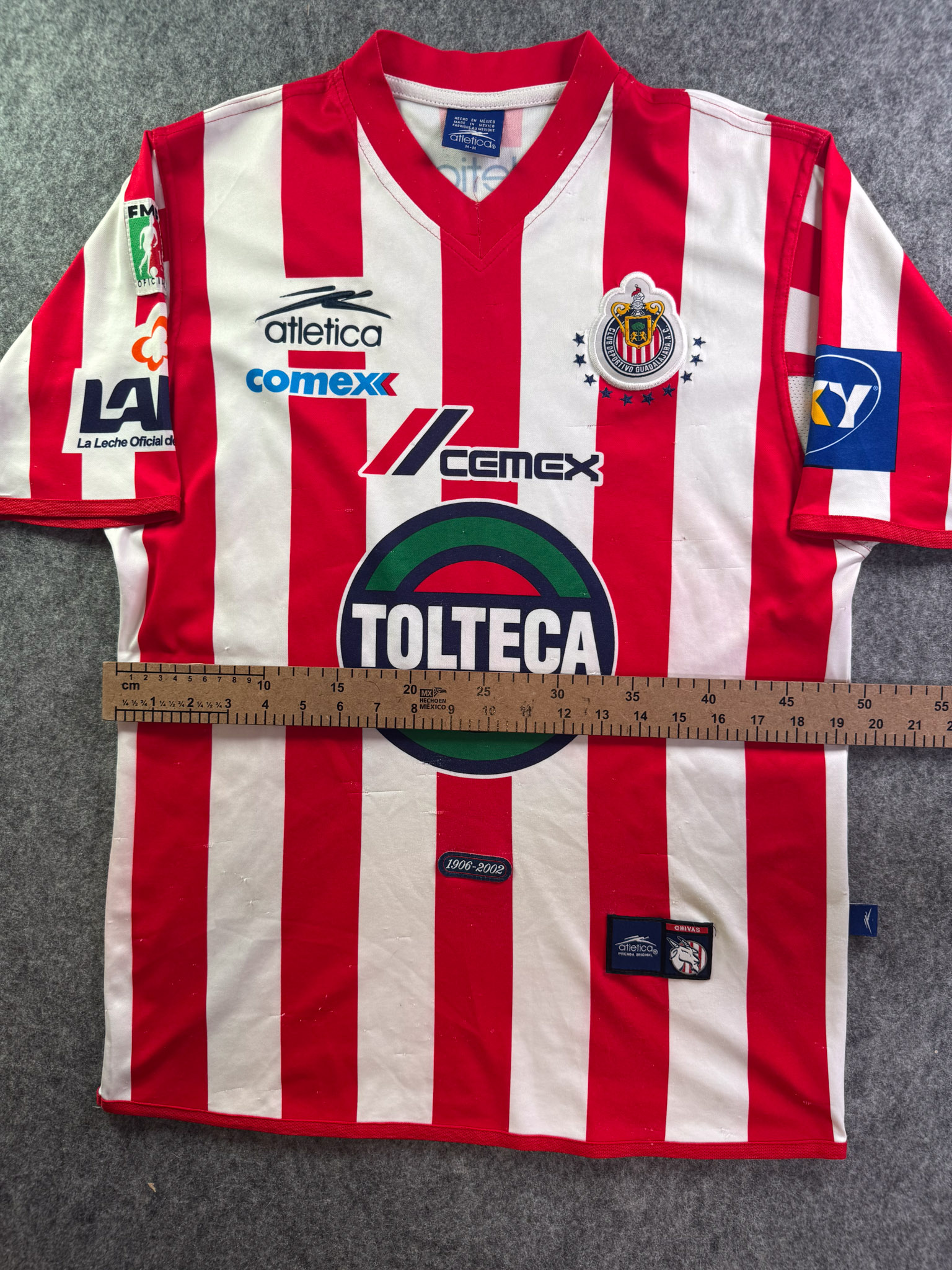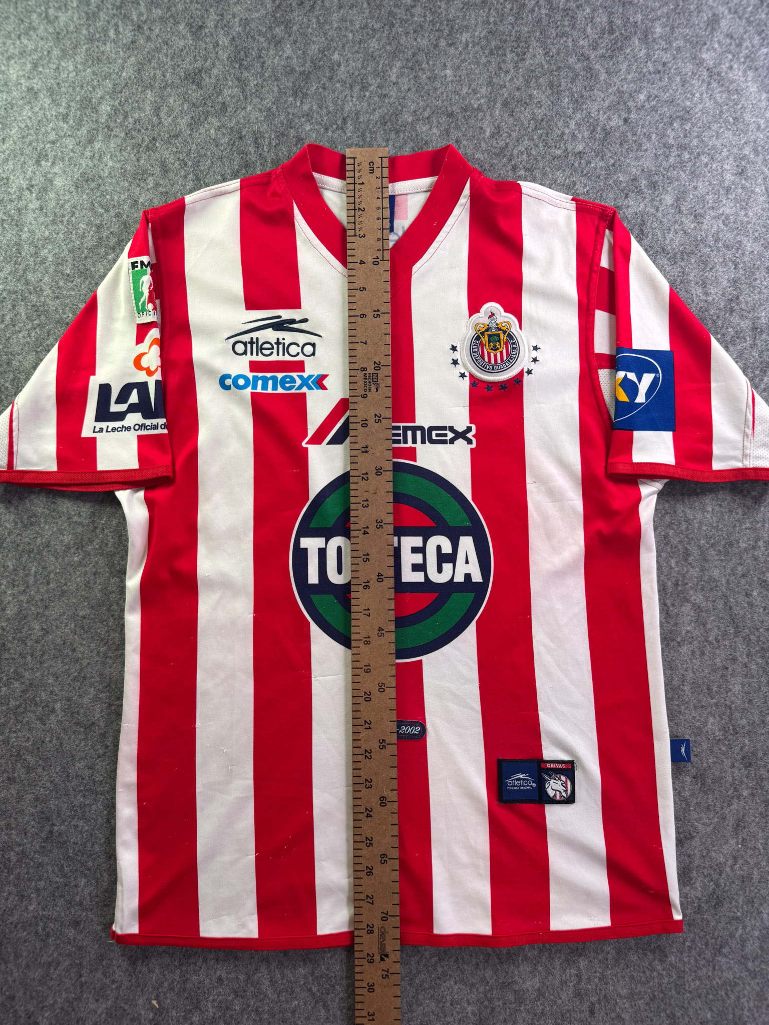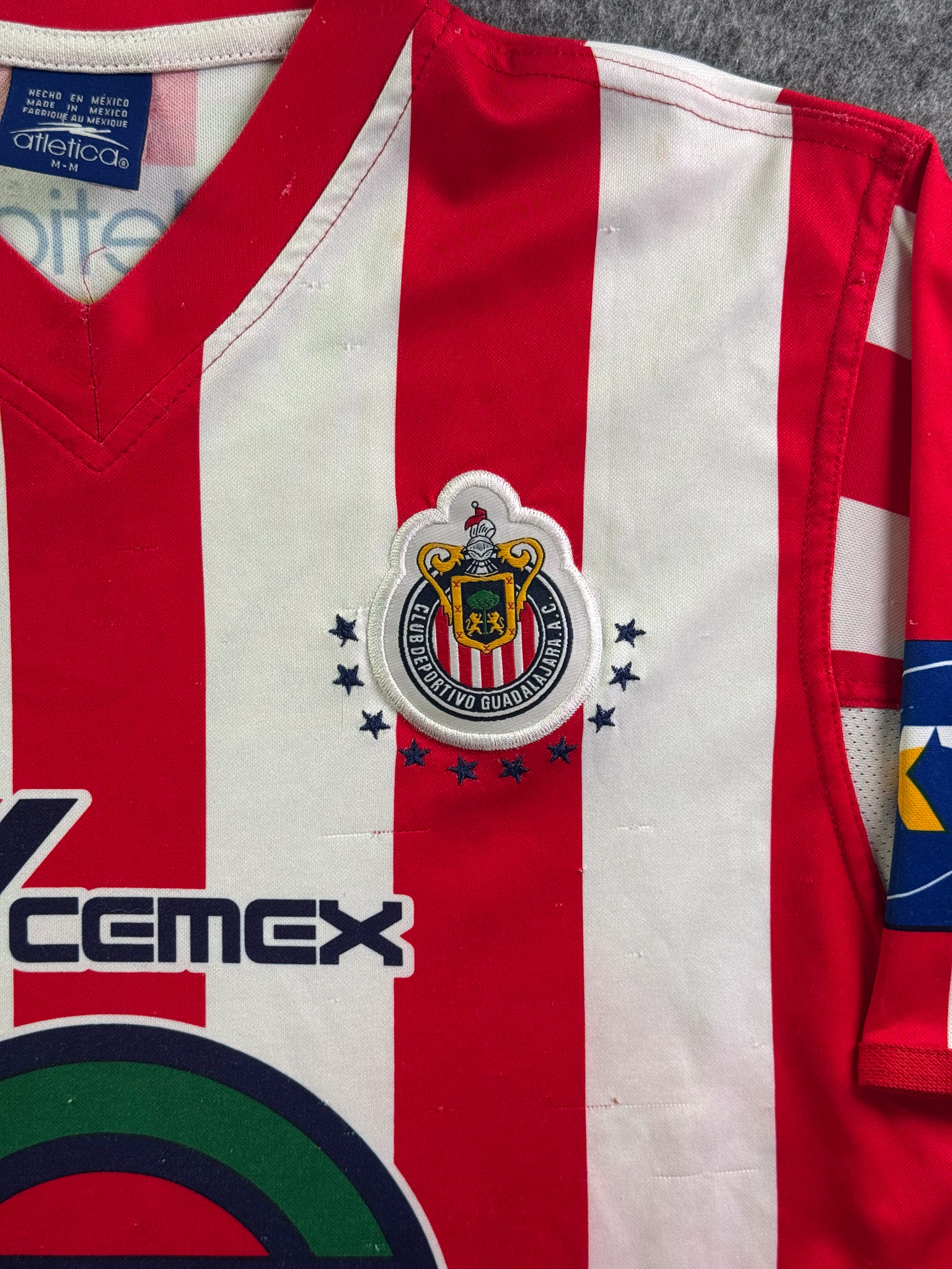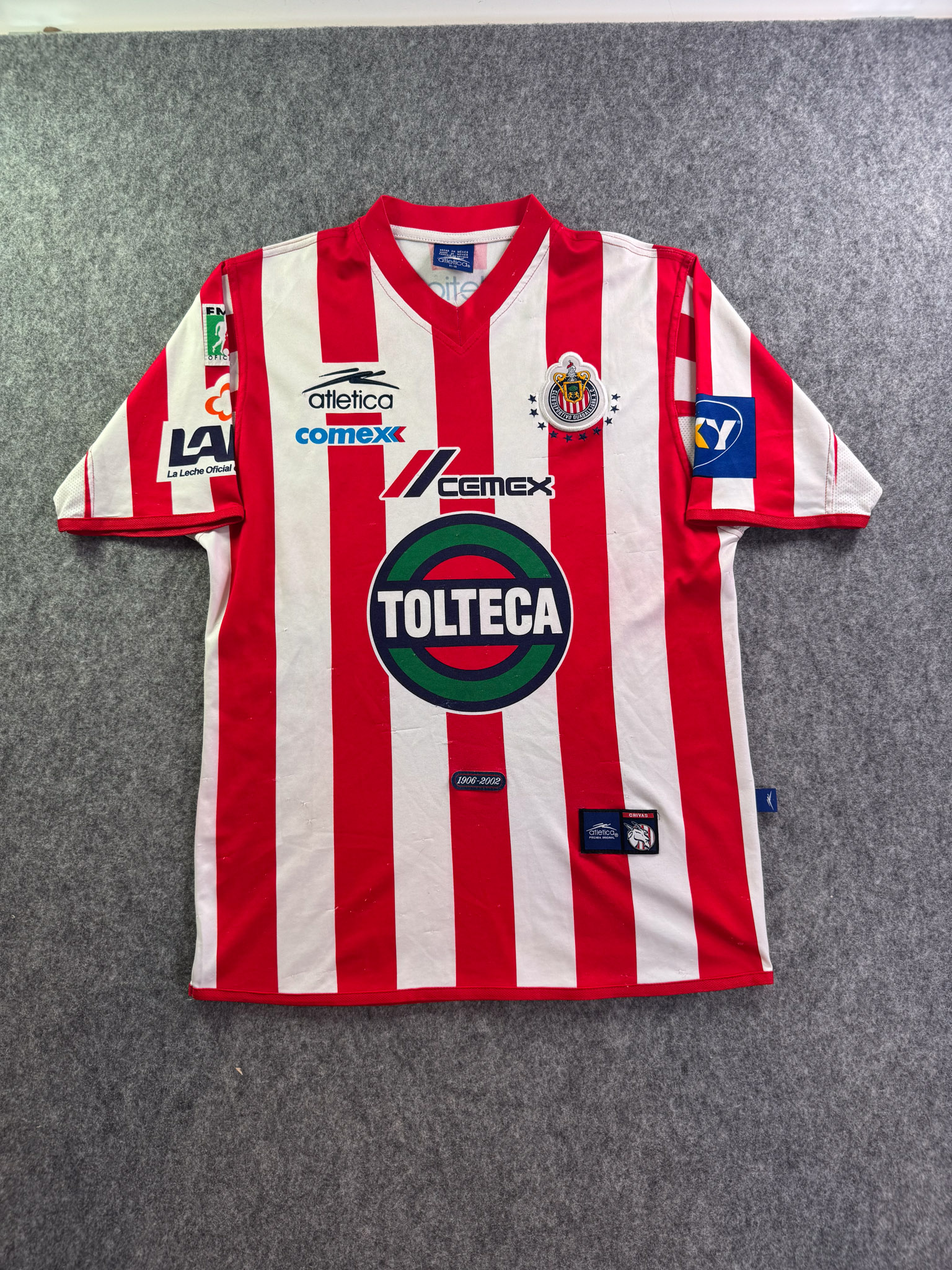 Jersey del Chivas fabricado por Atletica, originario de México. Se trata de la equipación Local correspondiente a la temporada 01-02. Talla M, con dorsal ‘No’ y en condición Buena. Detalles: Varios hilos jalados.