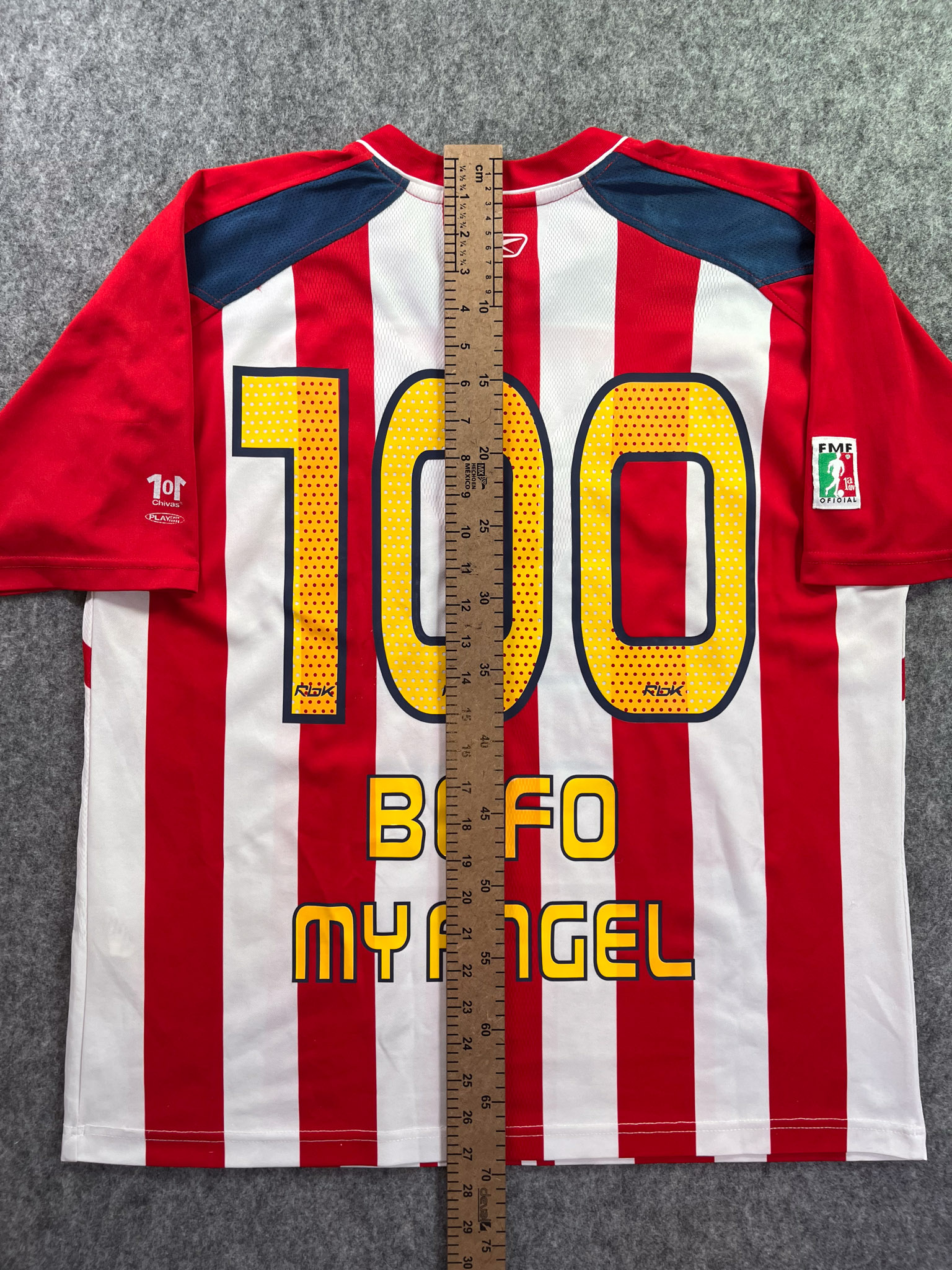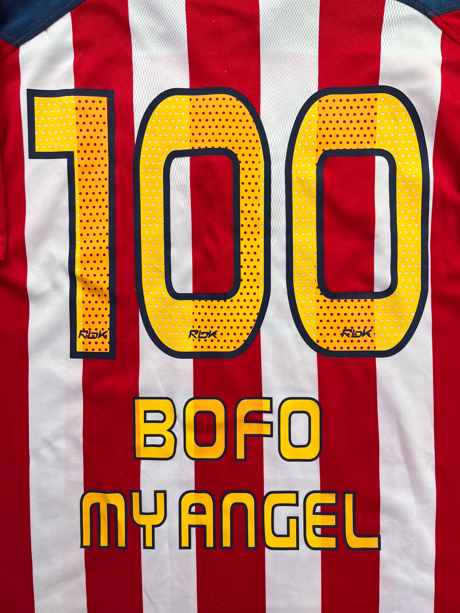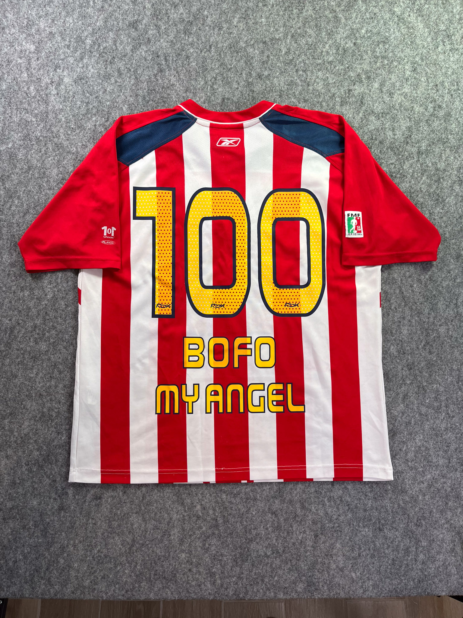 Jersey del Chivas fabricado por Reebok, originario de México. Se trata de la equipación Local correspondiente a la temporada 06-07. Talla L, con dorsal ‘Bofo My Angel 100’ y en condición Excelente. Detalles: Dorsal amarillo.