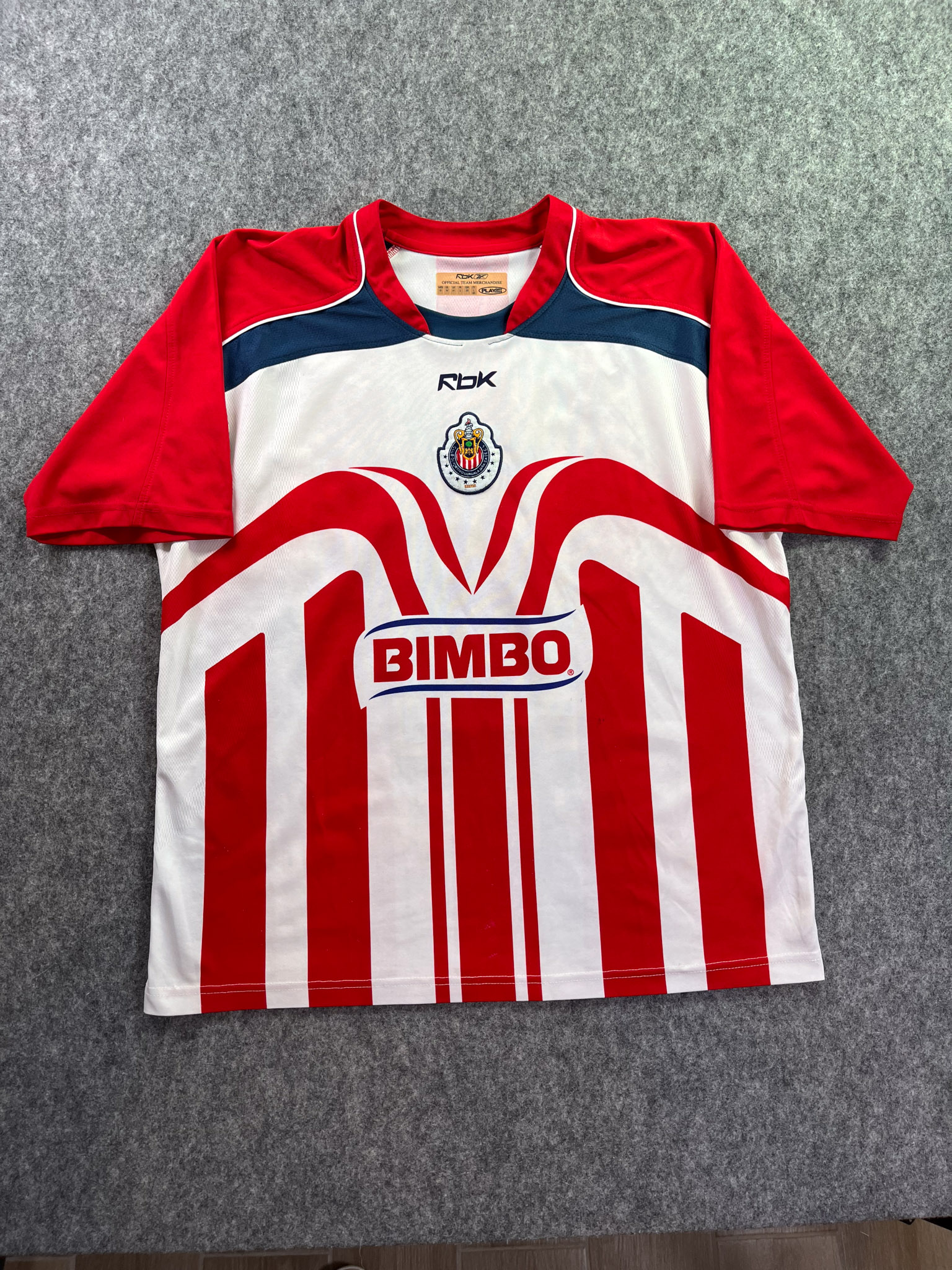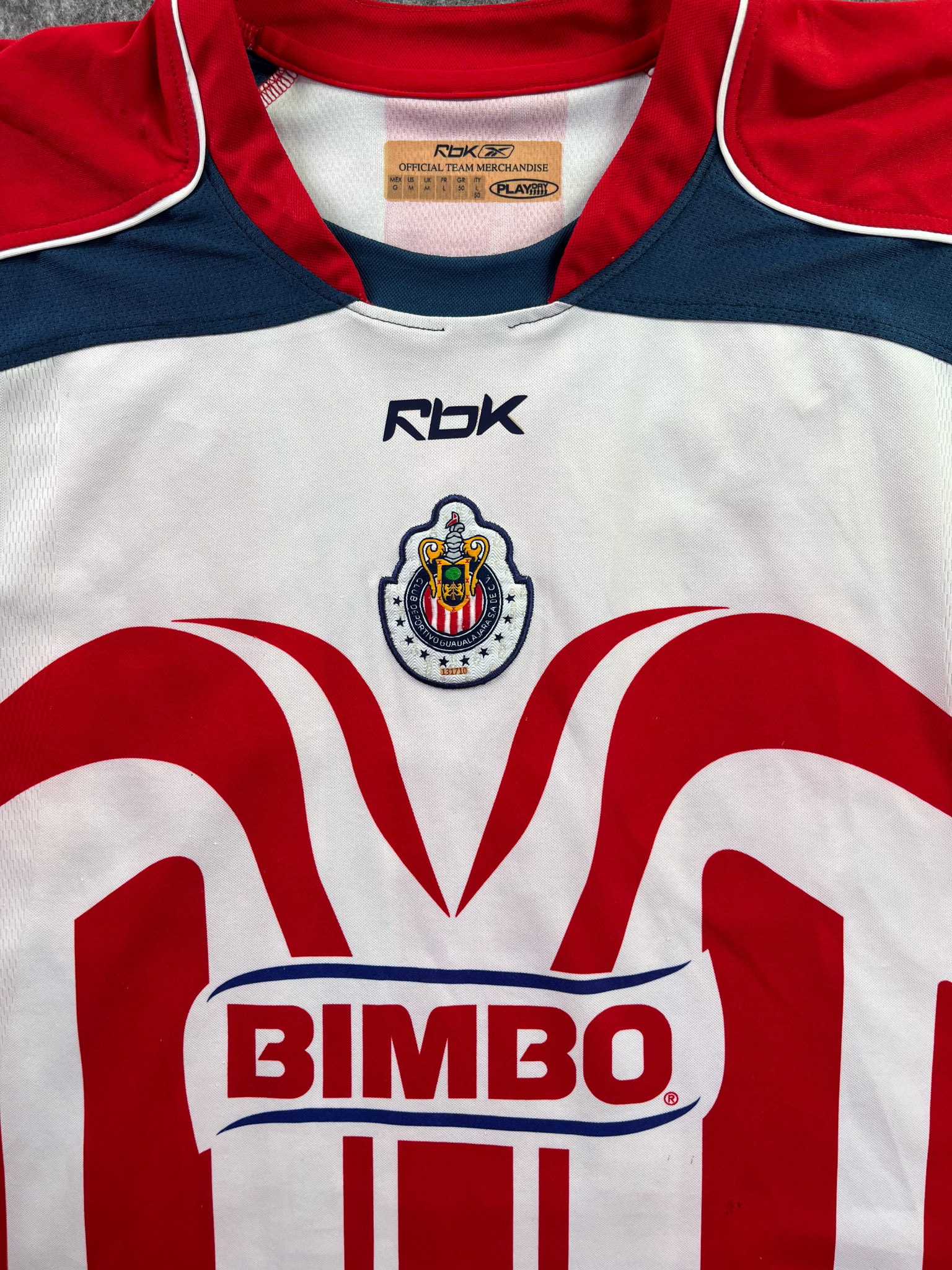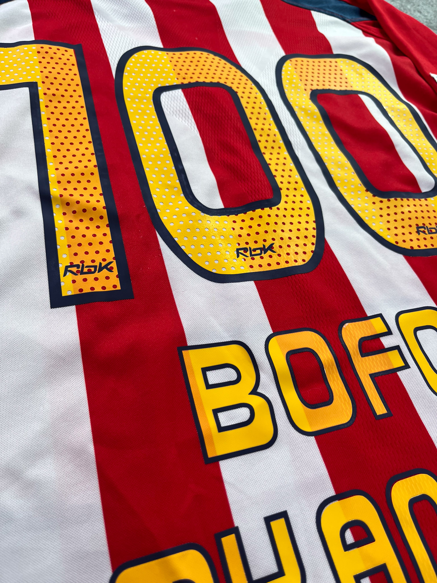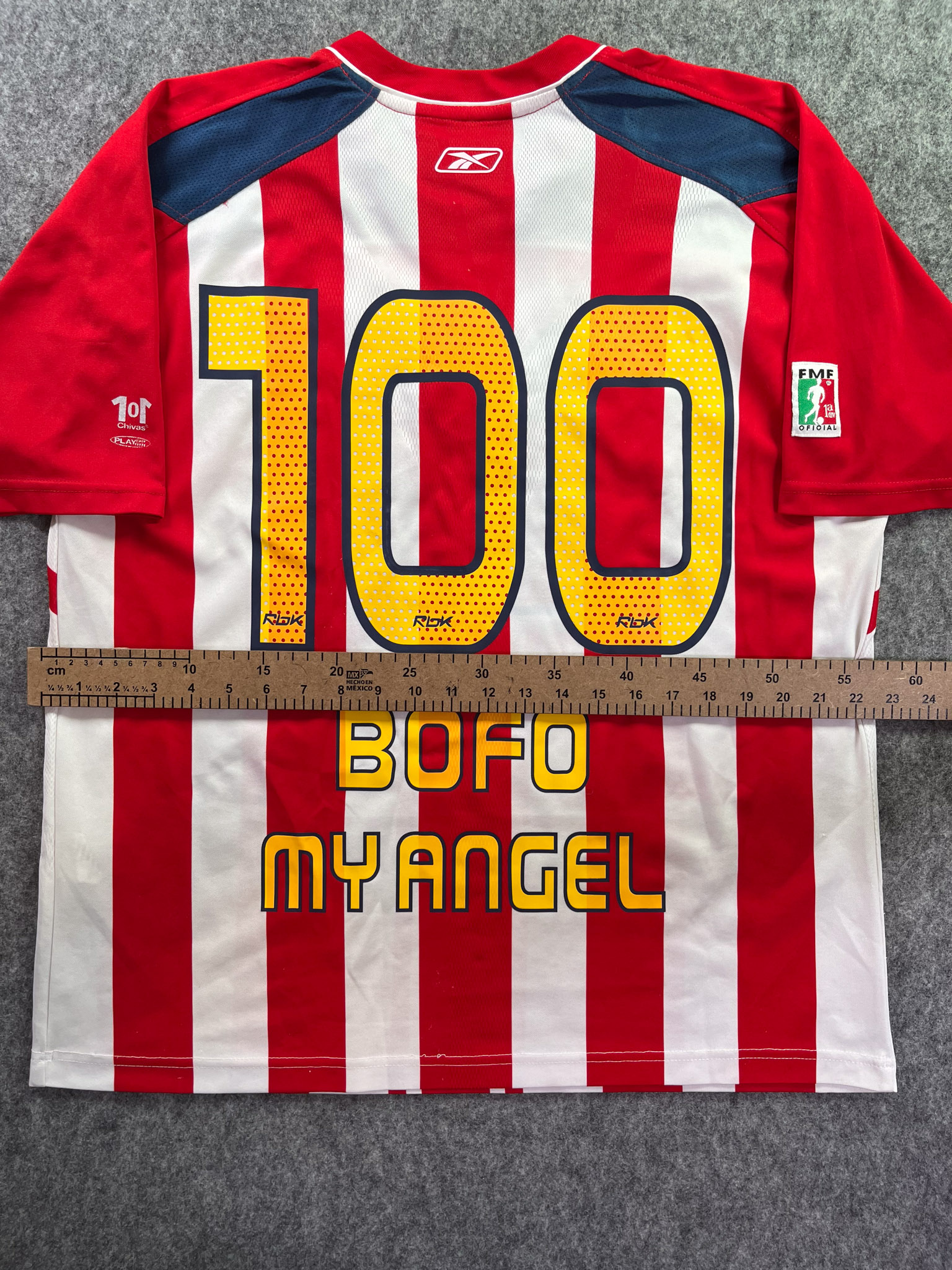 Jersey del Chivas fabricado por Reebok, originario de México. Se trata de la equipación Local correspondiente a la temporada 06-07. Talla L, con dorsal ‘Bofo My Angel 100’ y en condición Excelente. Detalles: Dorsal amarillo.