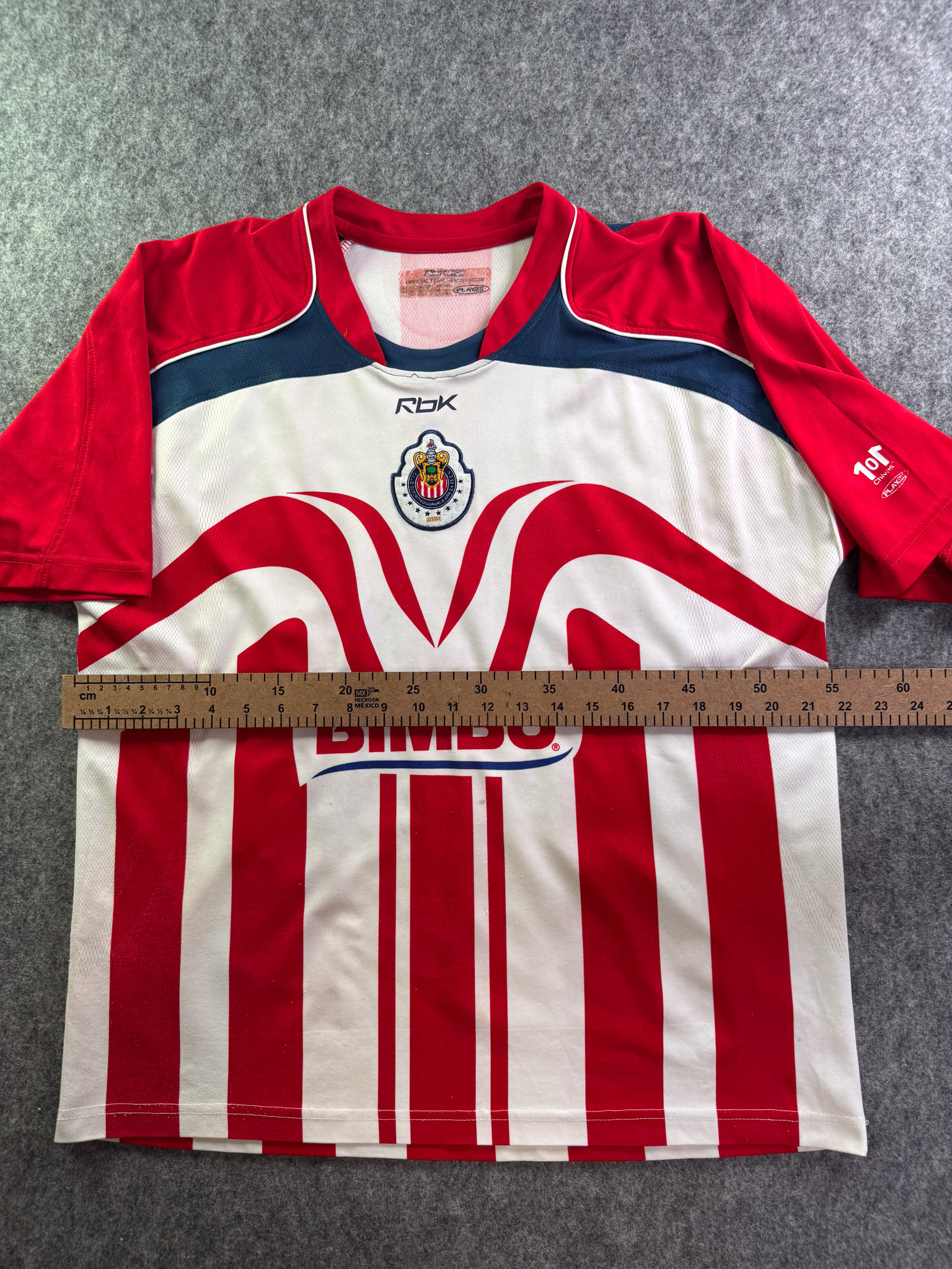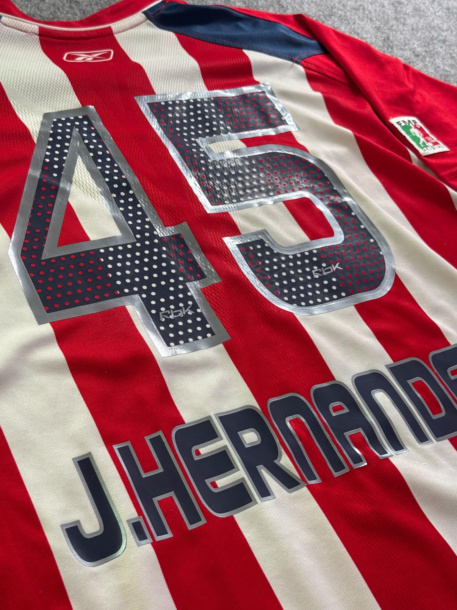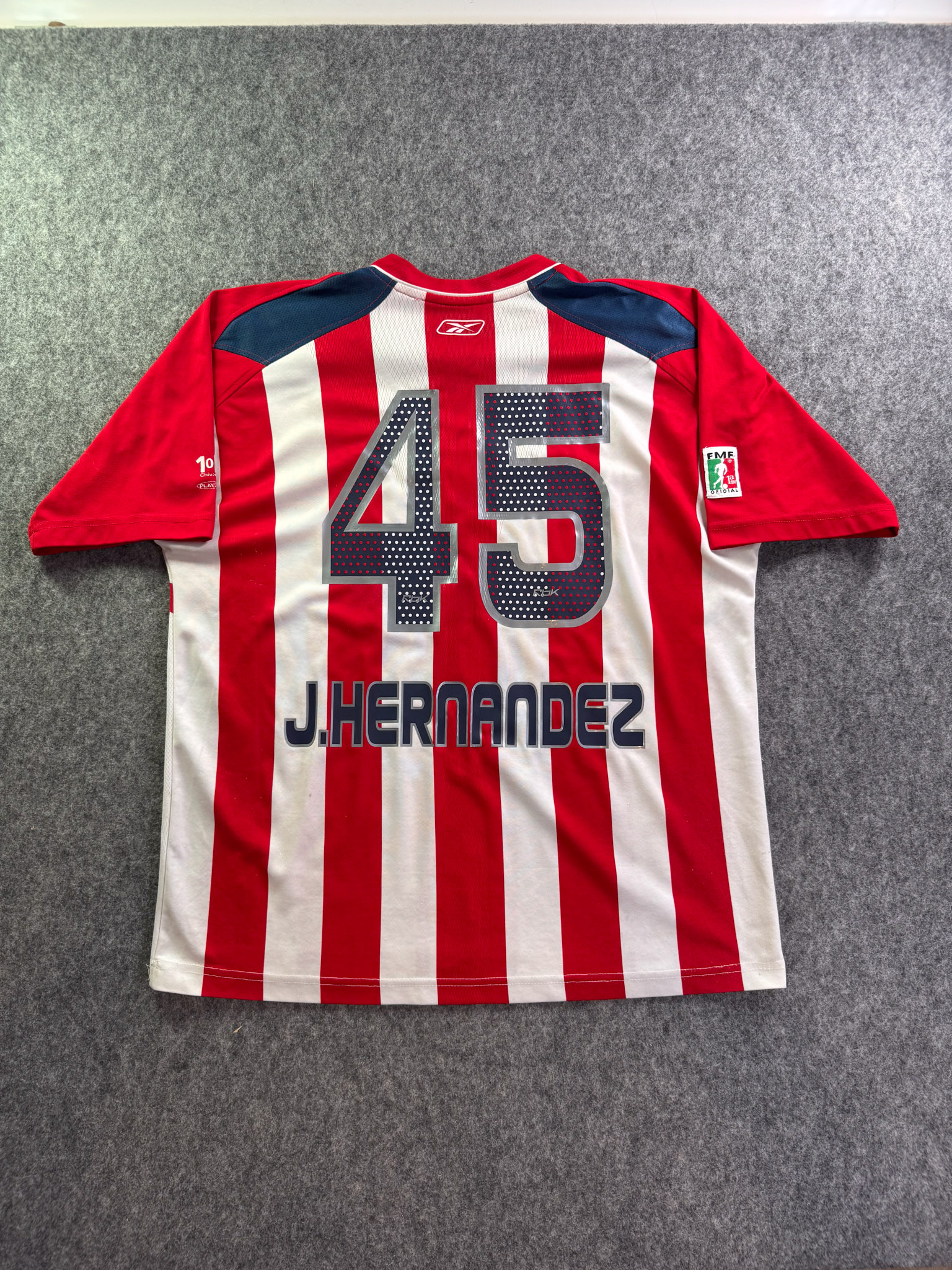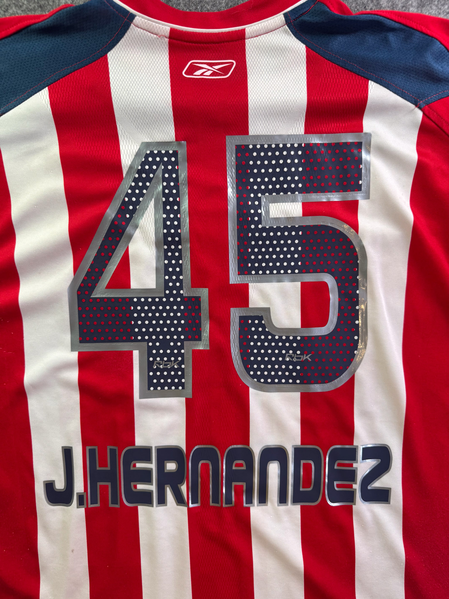 Jersey del Chivas fabricado por Reebok, originario de México. Se trata de la equipación Local correspondiente a la temporada 06-07. Talla L, con dorsal ‘J. Hernández 45’ y en condición Muy Buena. Detalles: Costuras ligeramente dañadas en el área del cuello frontal.