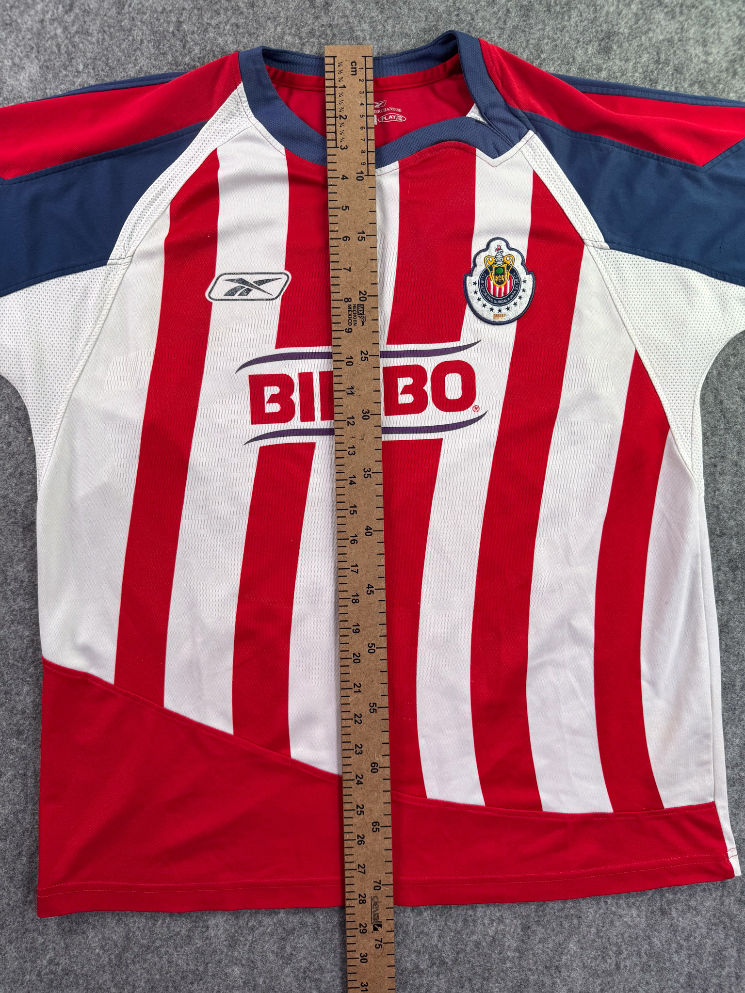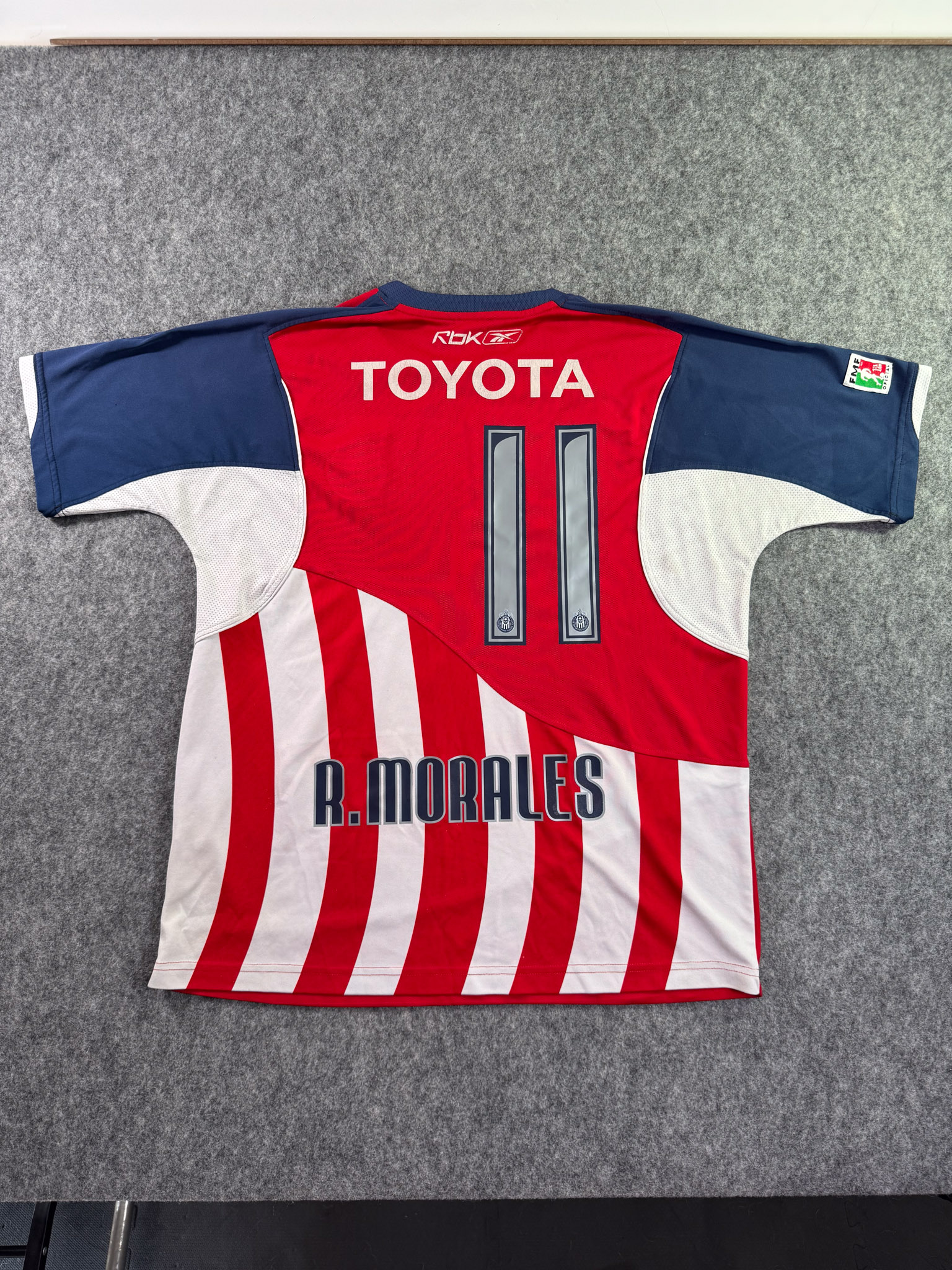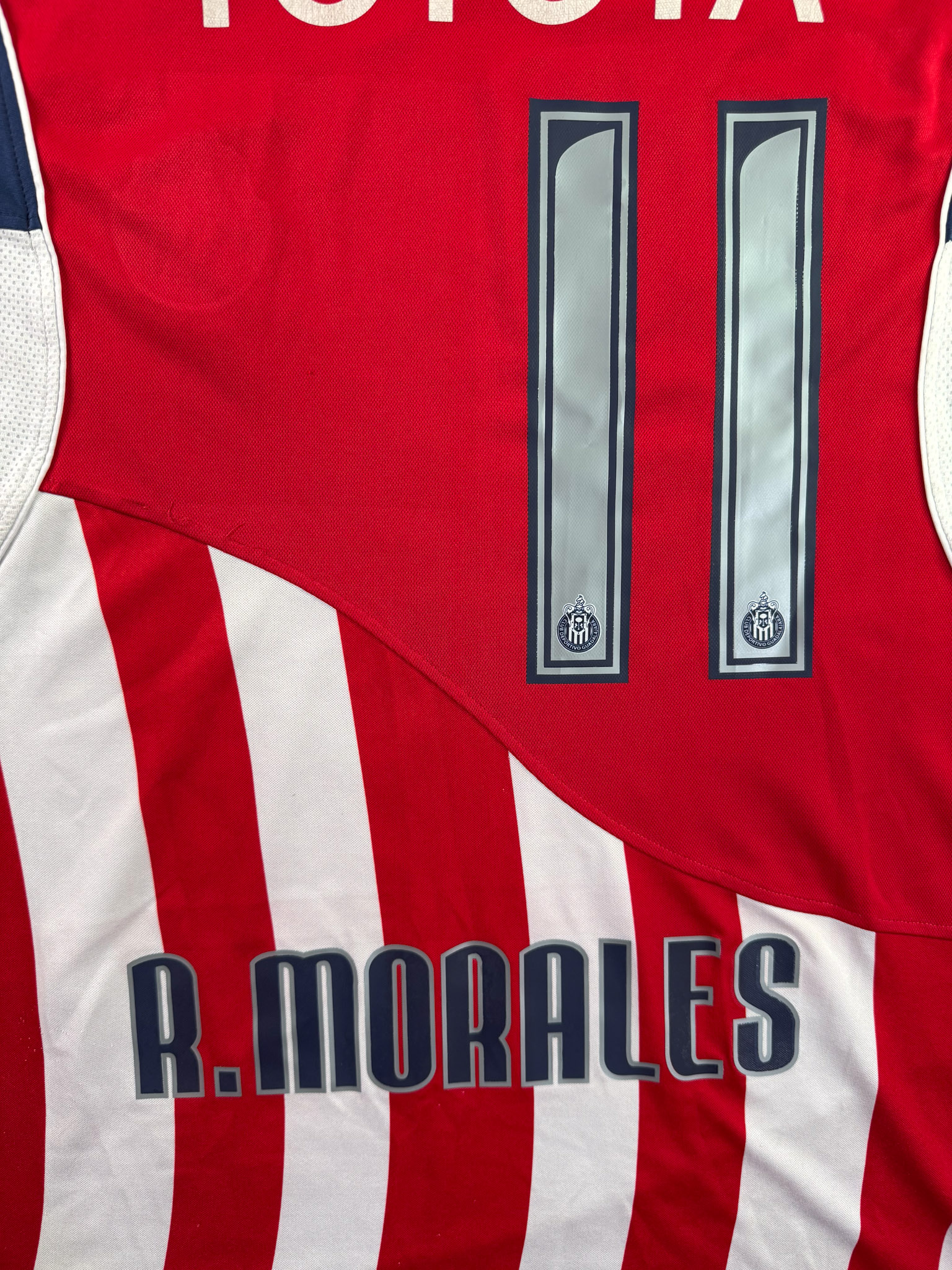 Jersey del Chivas fabricado por Reebok, originario de México. Se trata de la equipación Local correspondiente a la temporada 07-08. Talla L, con dorsal ‘R. Morales 11’ y en condición Buena. Detalles: Ligero desgaste en logotipo de Reebok.