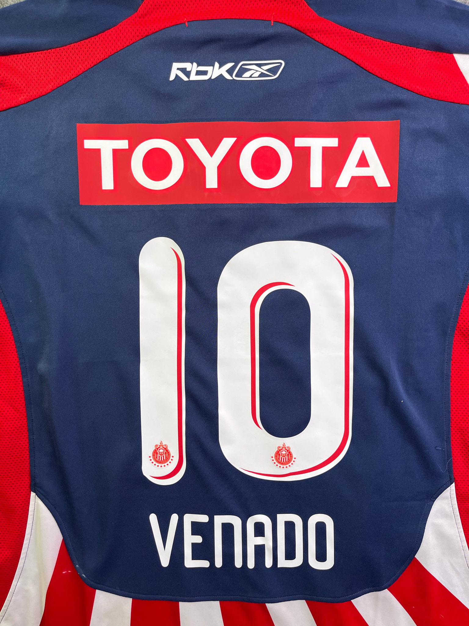 Jersey del Chivas fabricado por Reebok, originario de México. Se trata de la equipación Local correspondiente a la temporada 08-09. Talla L, con dorsal ‘Venado 10’ y en condición Muy Buena. Detalles: Ligeras manchas en la tela, sponsor Toyota Restaurado.