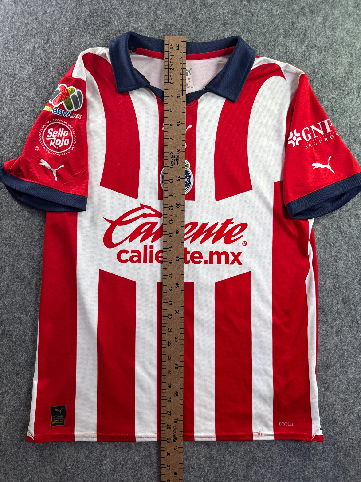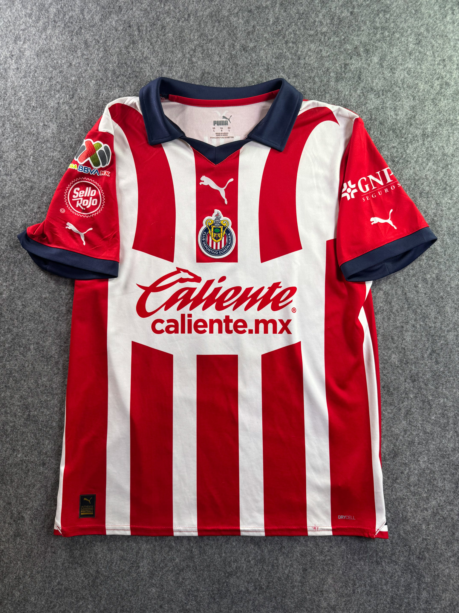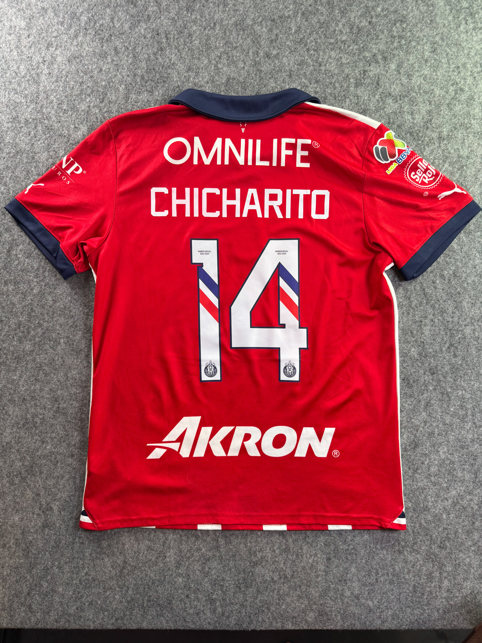 Jersey del Chivas fabricado por Puma, originario de México. Se trata de la equipación Local correspondiente a la temporada 23-24. Talla L, con dorsal ‘Chicharito 14’ y en condición Excelente. Detalles: Parche Liga MX.