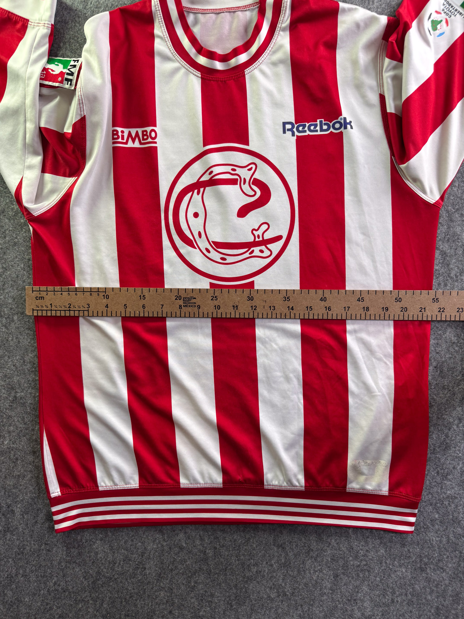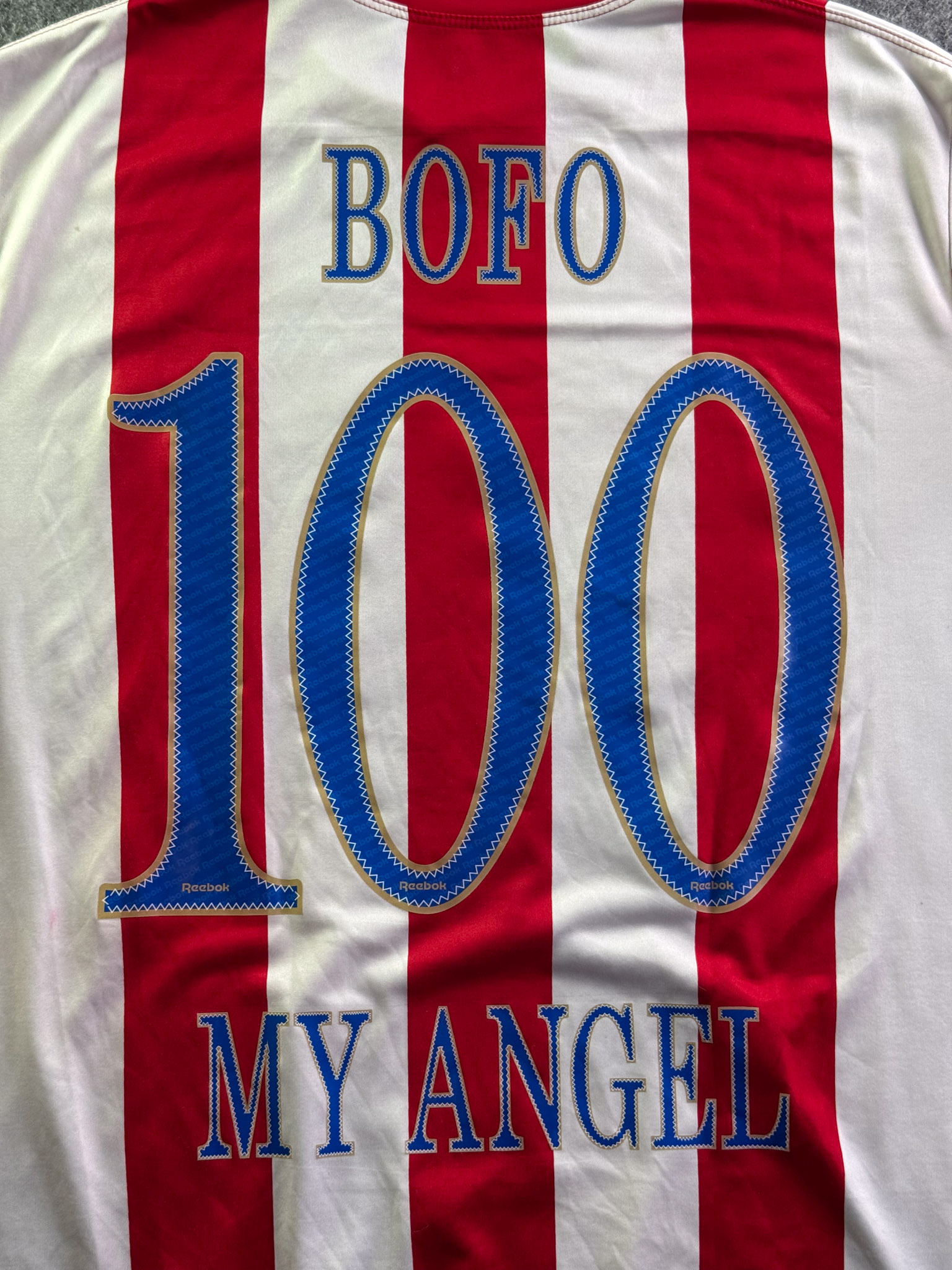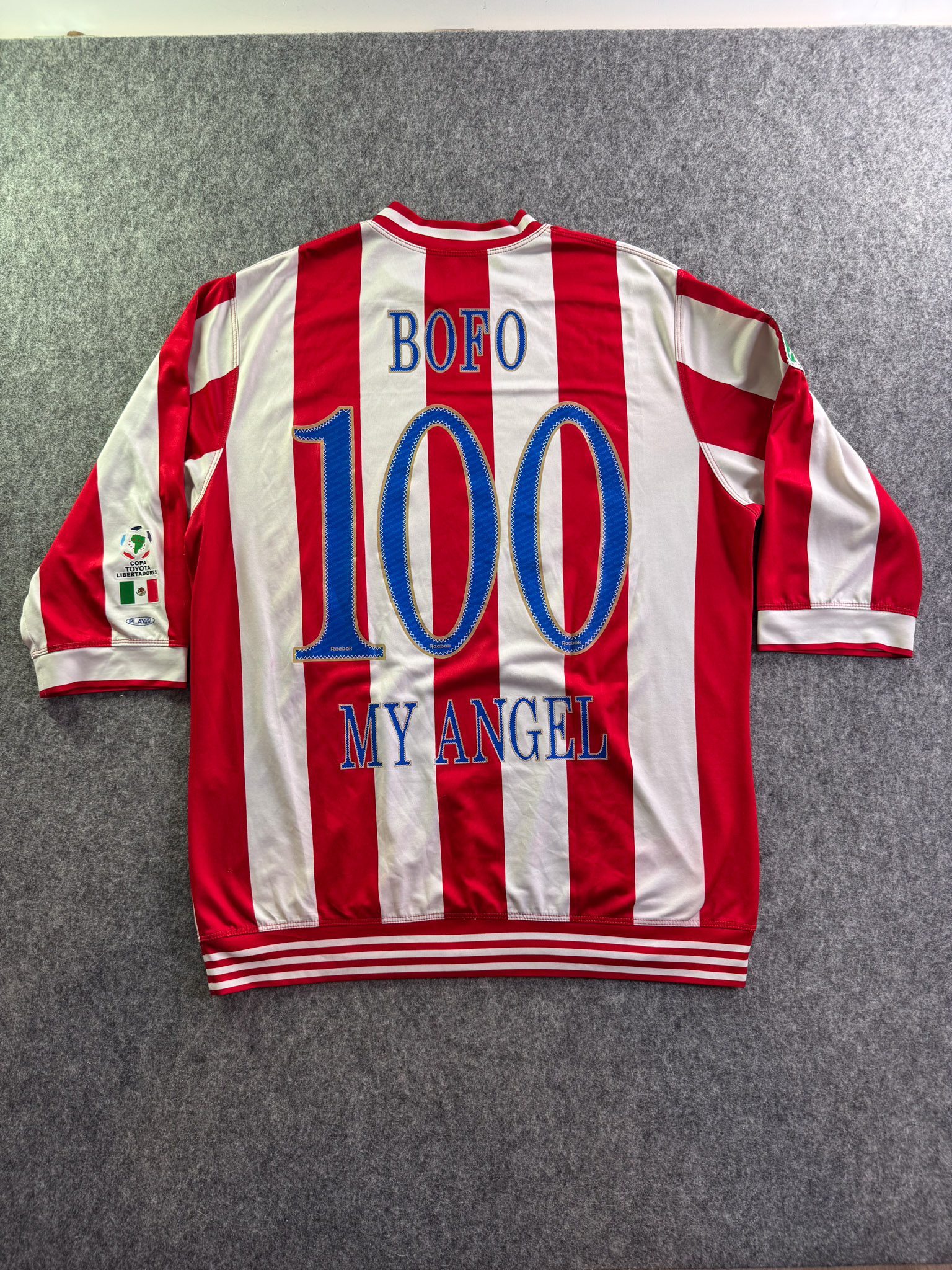 Jersey del Chivas fabricado por Reebok, originario de México. Se trata de la equipación Local correspondiente a la temporada 05-06. Talla L, con dorsal ‘Bofo 100 My Angel’ y en condición Muy Buena. Detalles: Ligero daño en la parte frontal izquierda, algunos hilos jalados, vini inferior izquierdo dañado, parche libertadores.