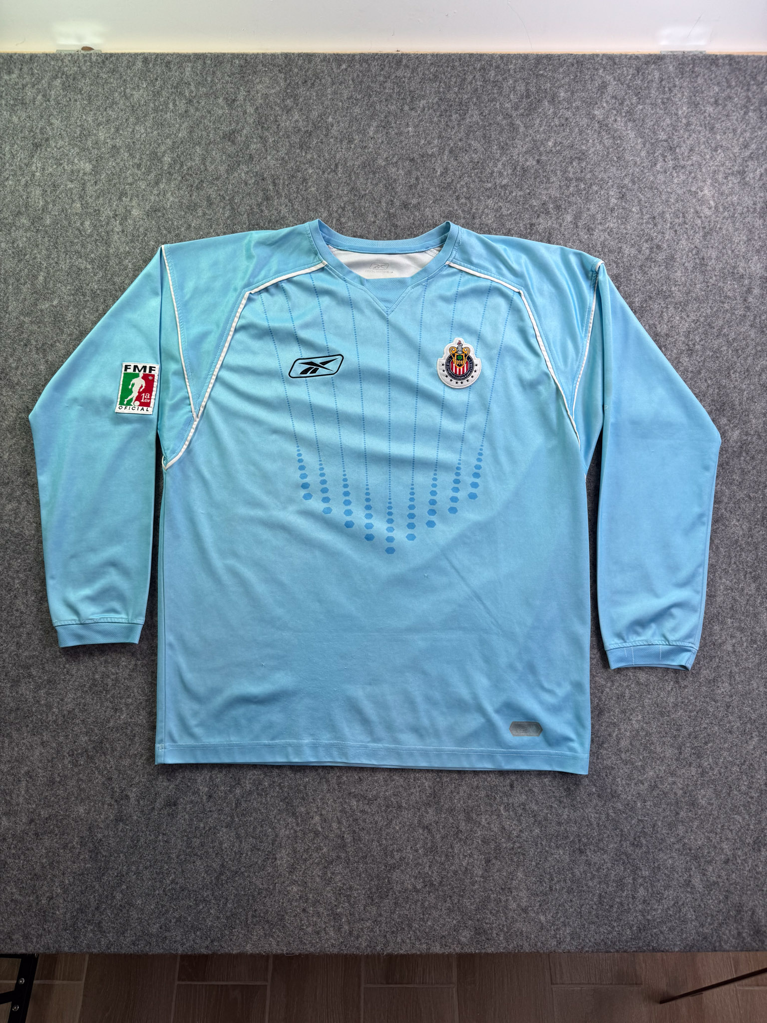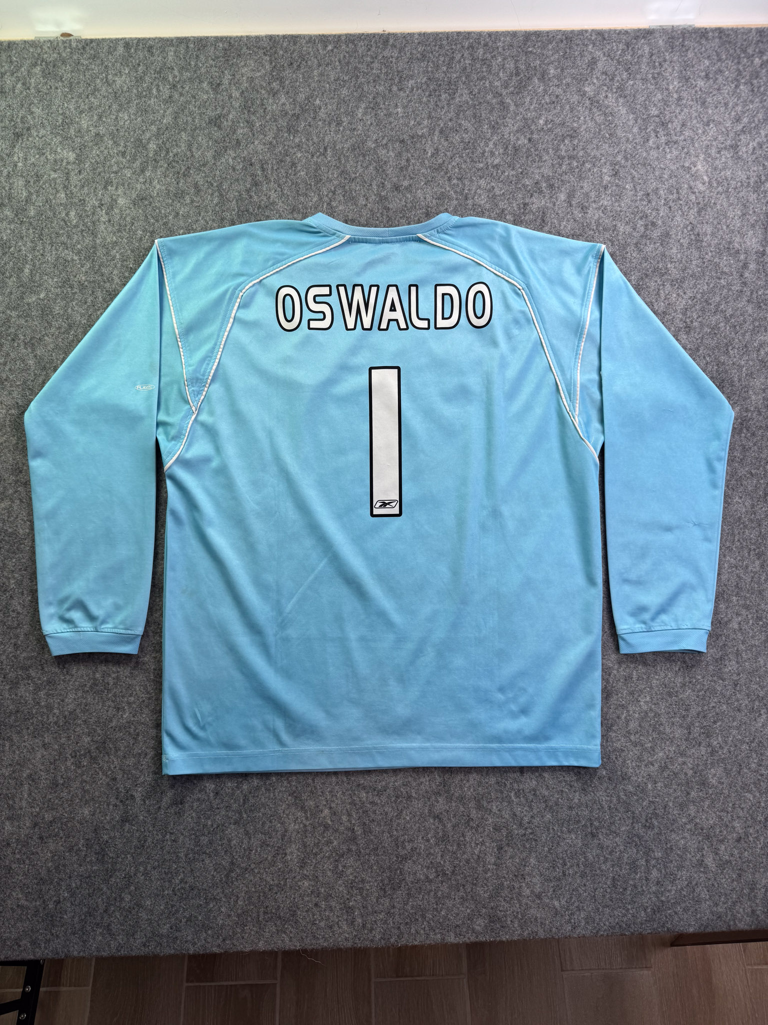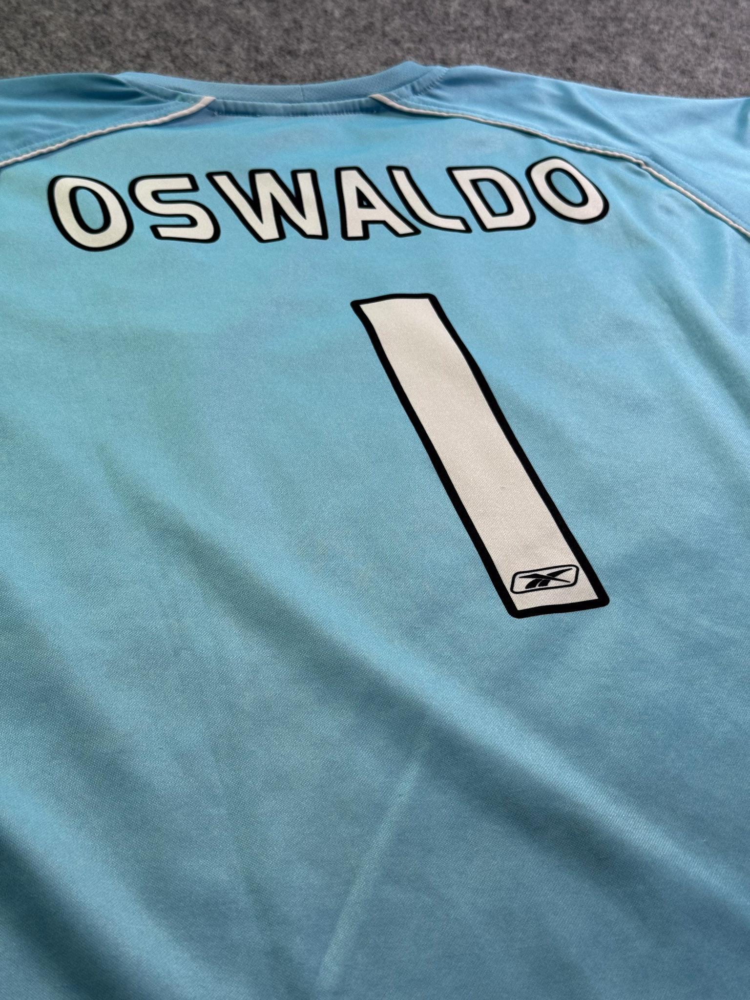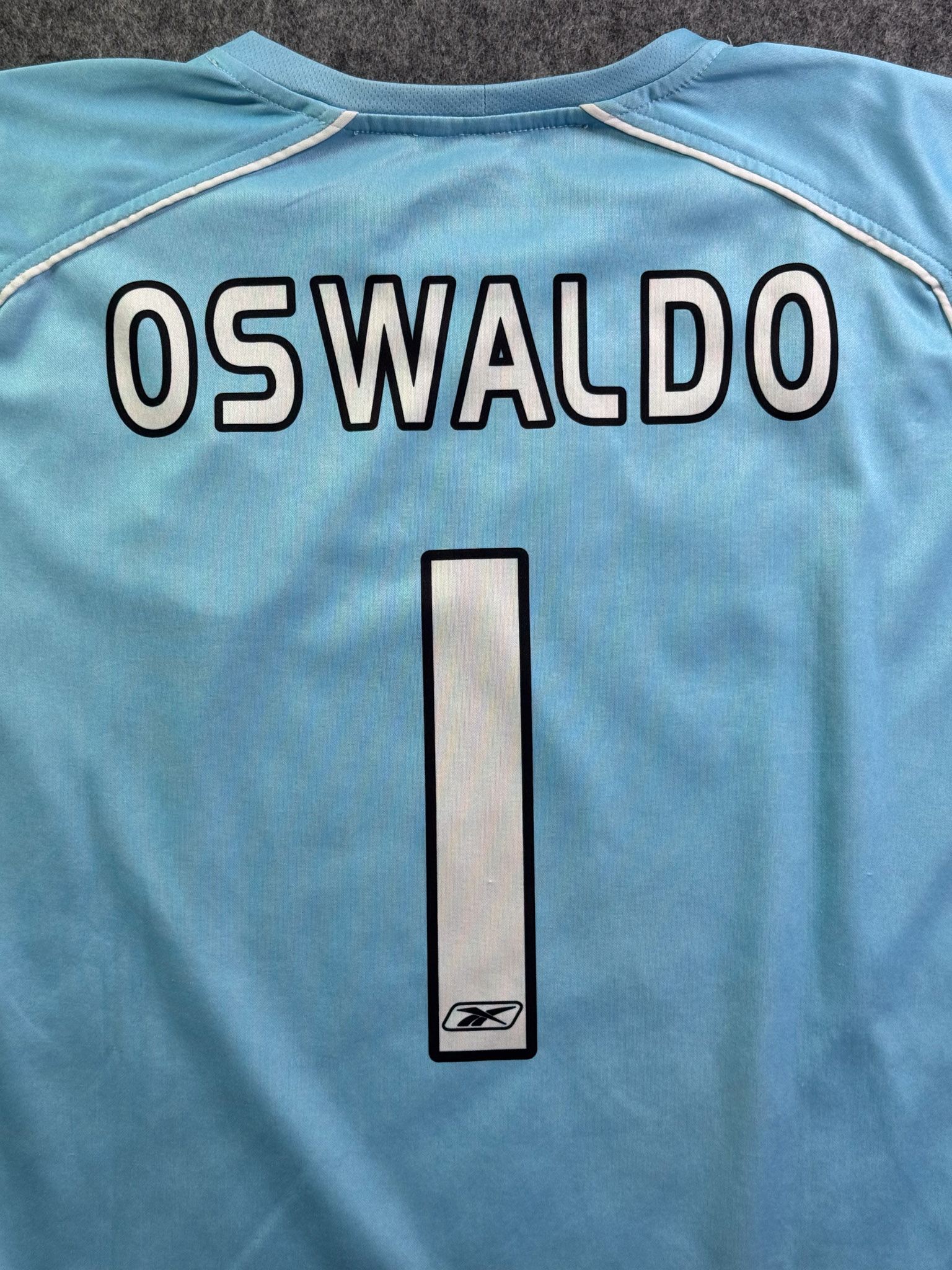 Jersey del Chivas fabricado por Reebok, originario de México. Se trata de la equipación Portero correspondiente a la temporada 04-05. Talla L, con dorsal ‘Oswaldo 1’ y en condición Buena. Detalles: Ligeras manchas en las mangas.