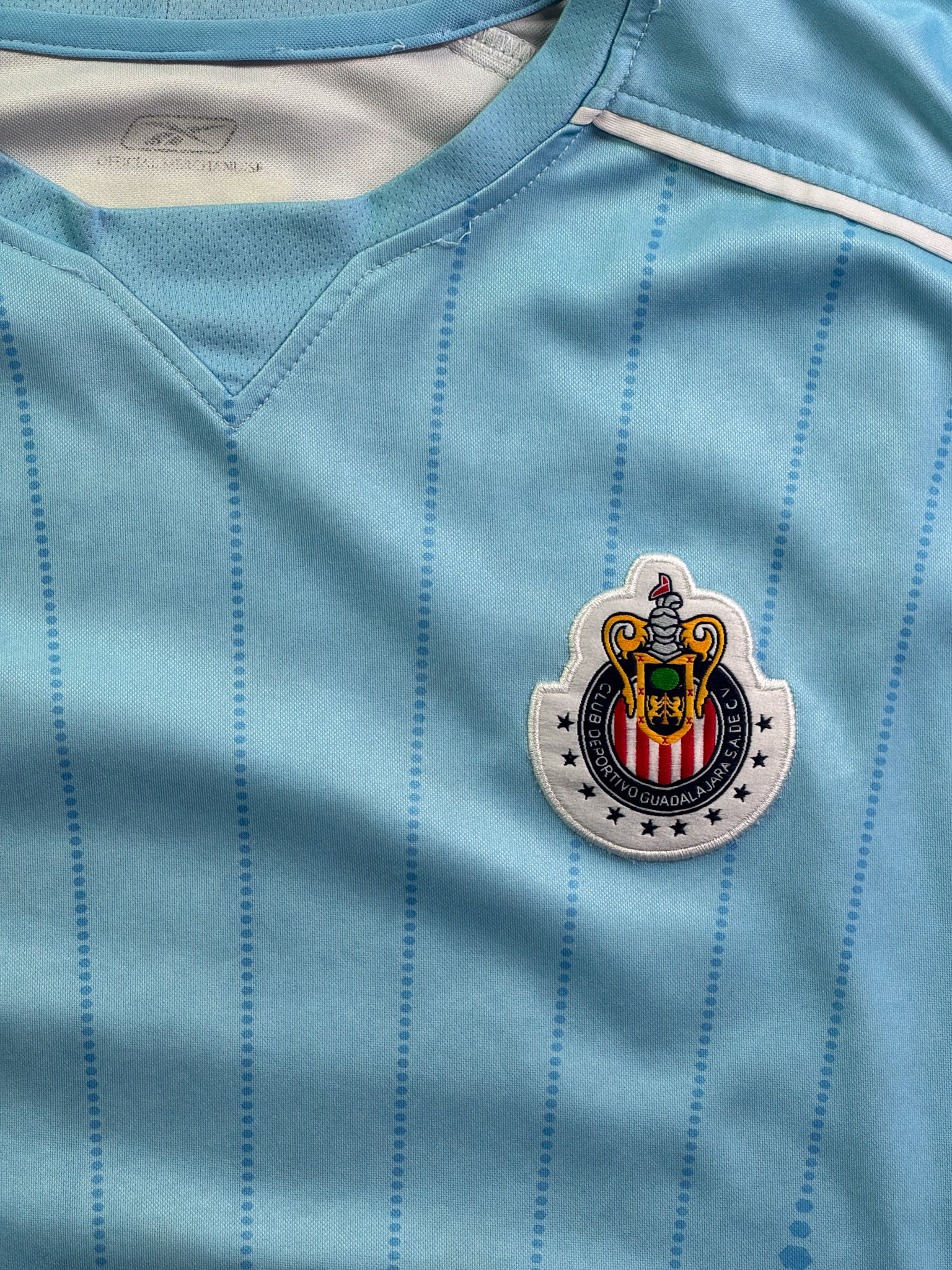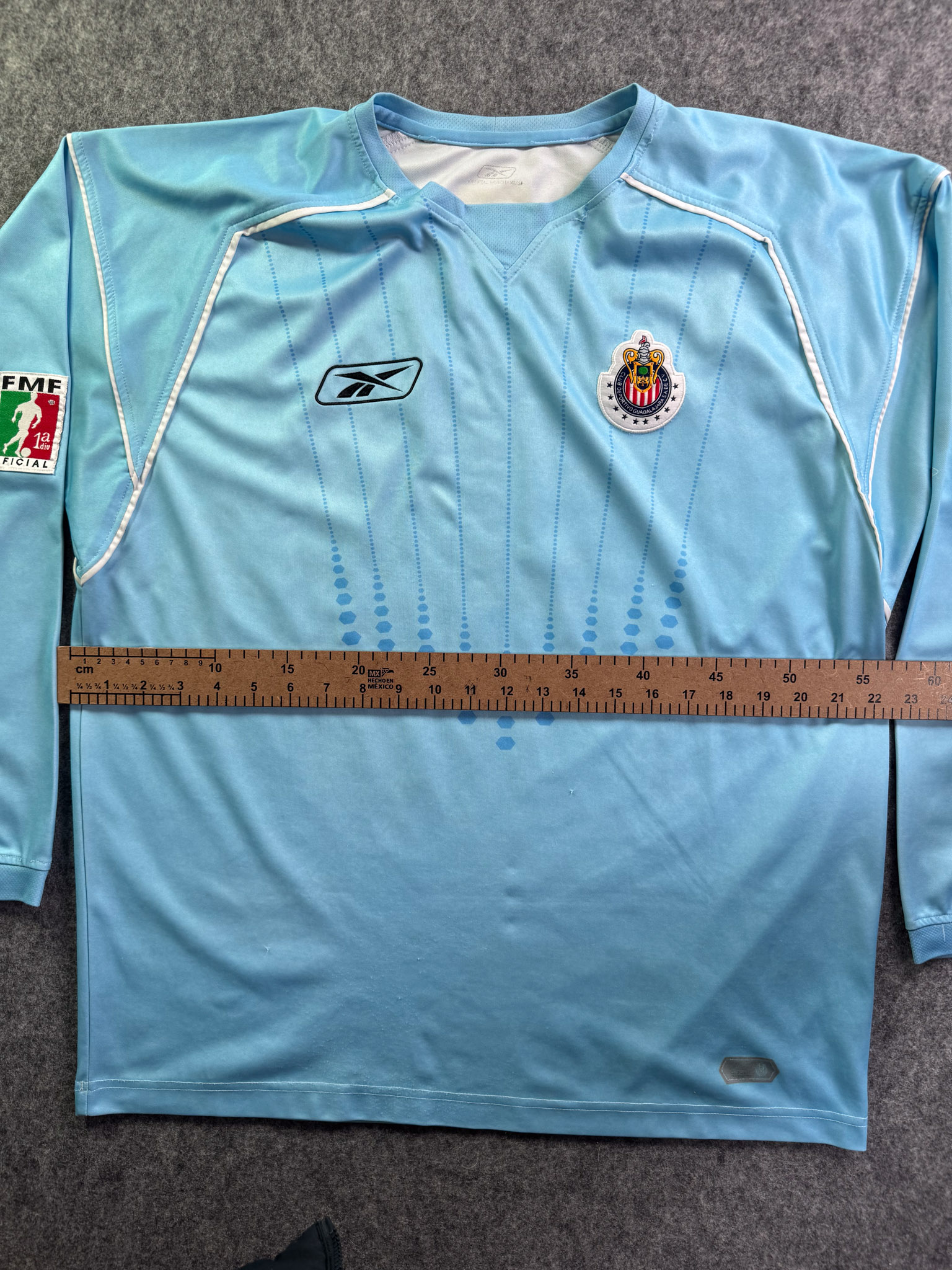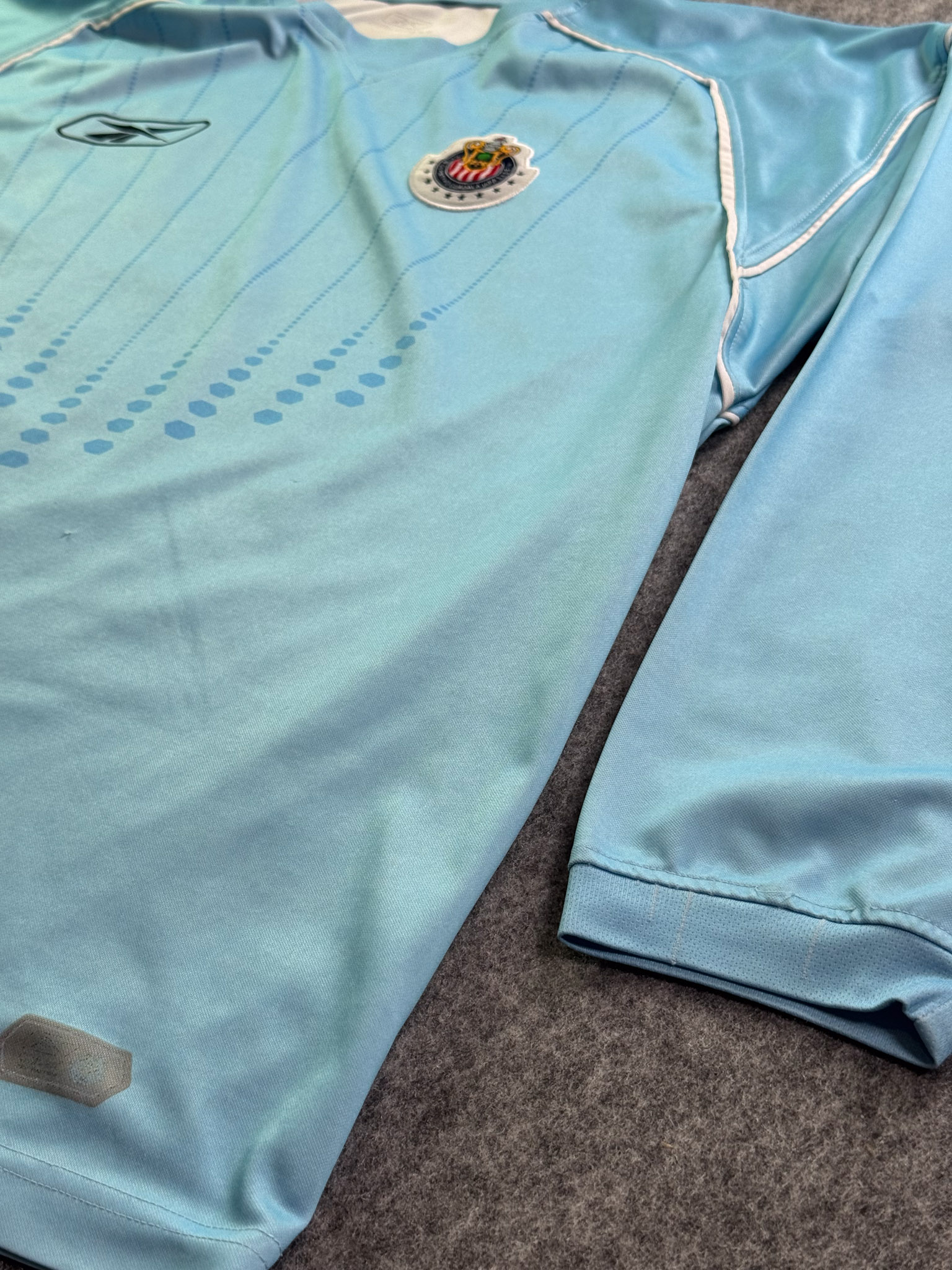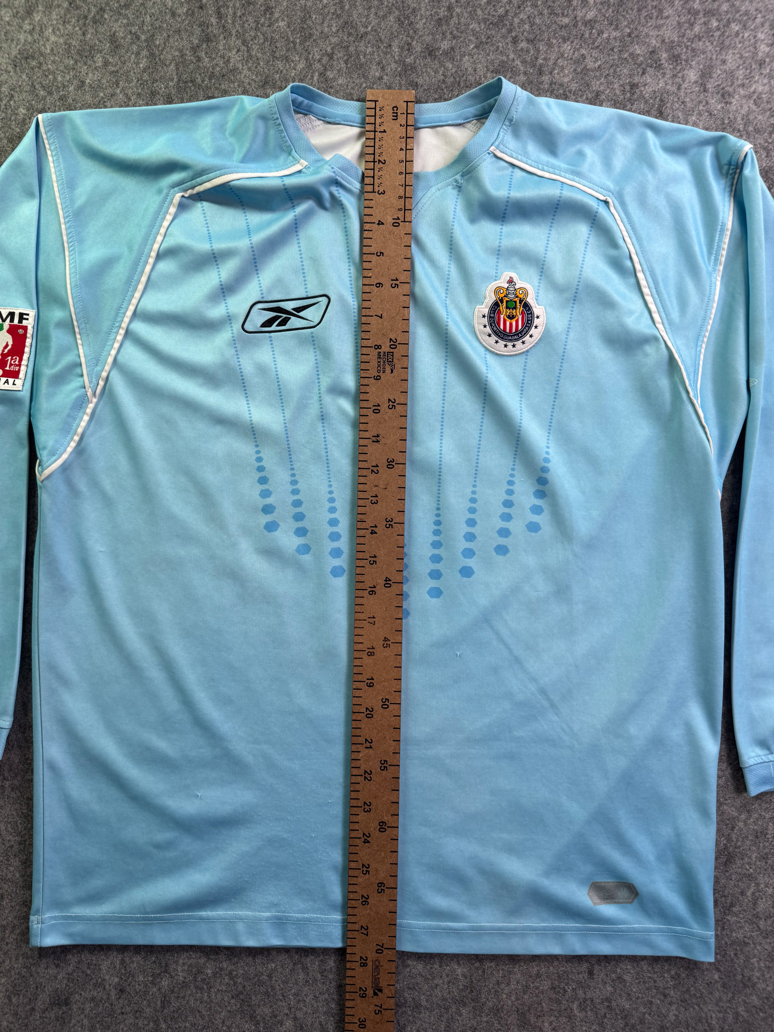 Jersey del Chivas fabricado por Reebok, originario de México. Se trata de la equipación Portero correspondiente a la temporada 04-05. Talla L, con dorsal ‘Oswaldo 1’ y en condición Buena. Detalles: Ligeras manchas en las mangas.