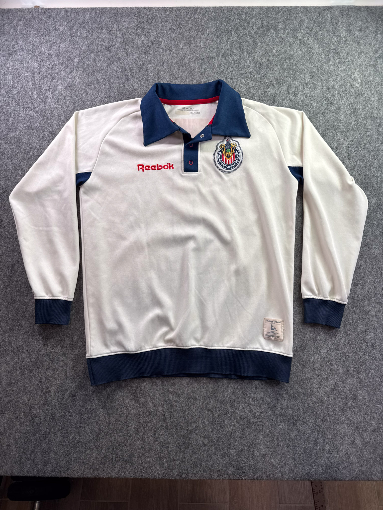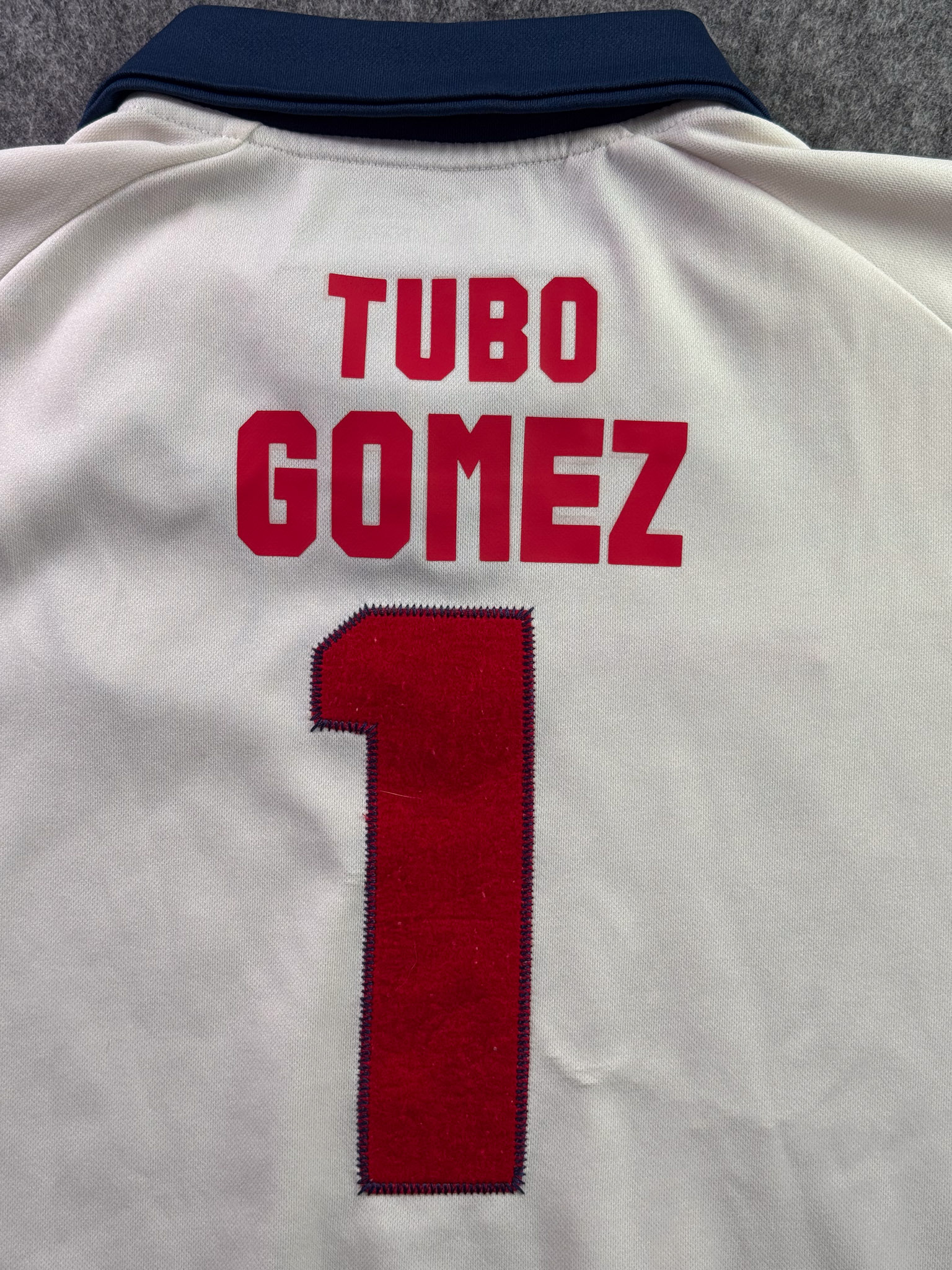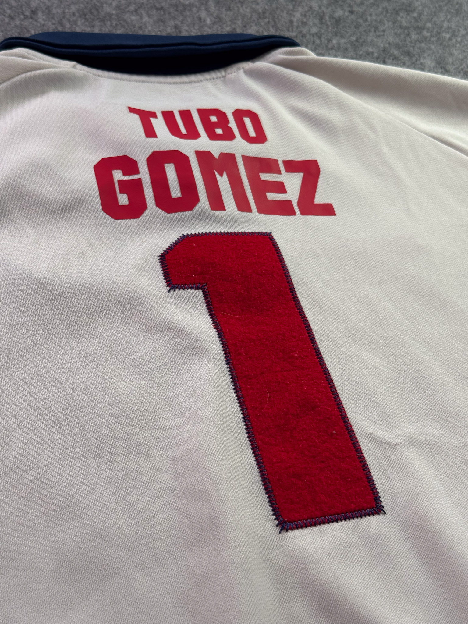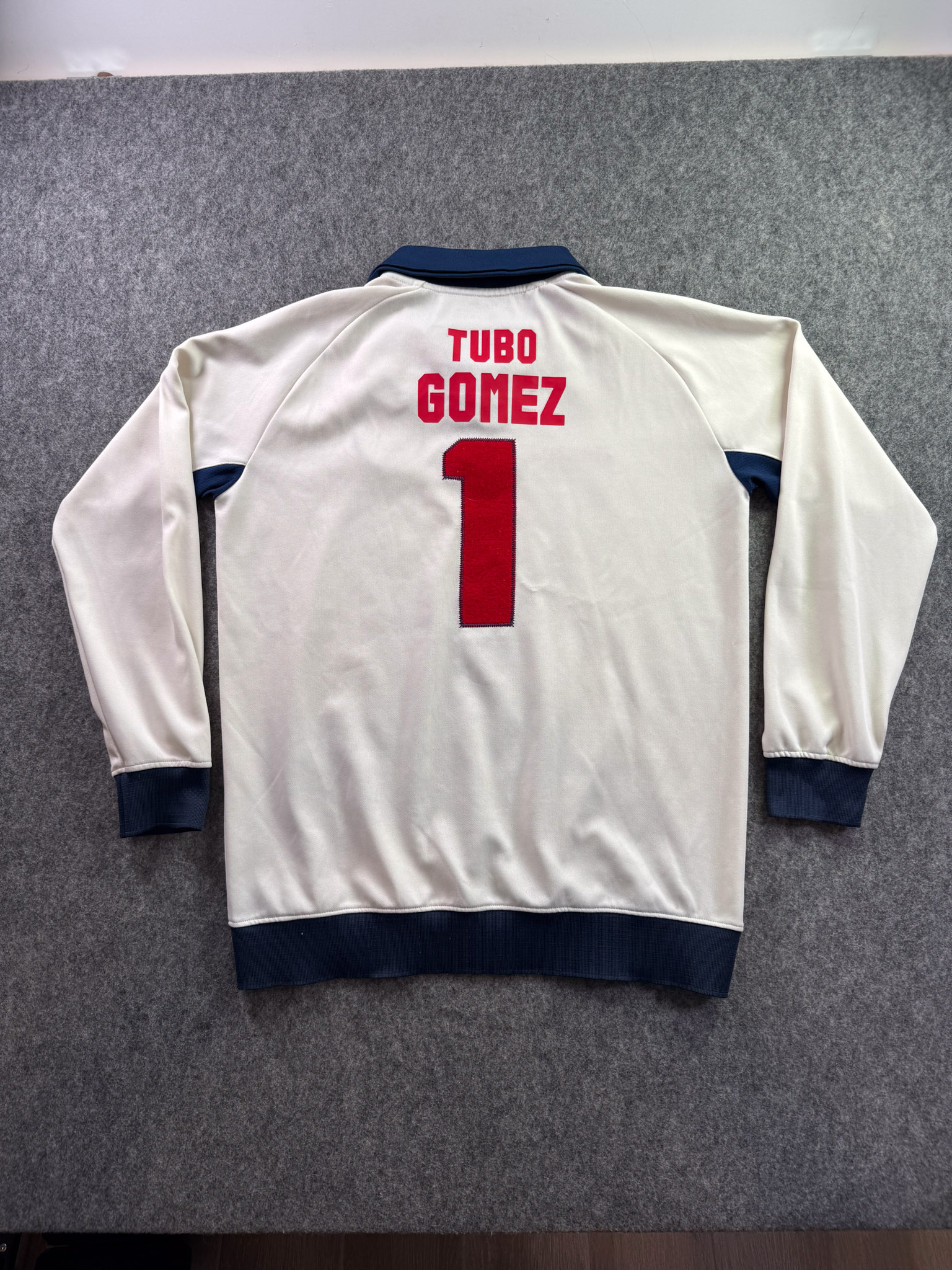 Jersey del Chivas fabricado por Reebok, originario de México. Se trata de la equipación Portero correspondiente a la temporada 30-06. Talla L, con dorsal ‘Tubo Gómez 1’ y en condición Excelente. Detalles: Desgaste en vinil interior del cuello.
