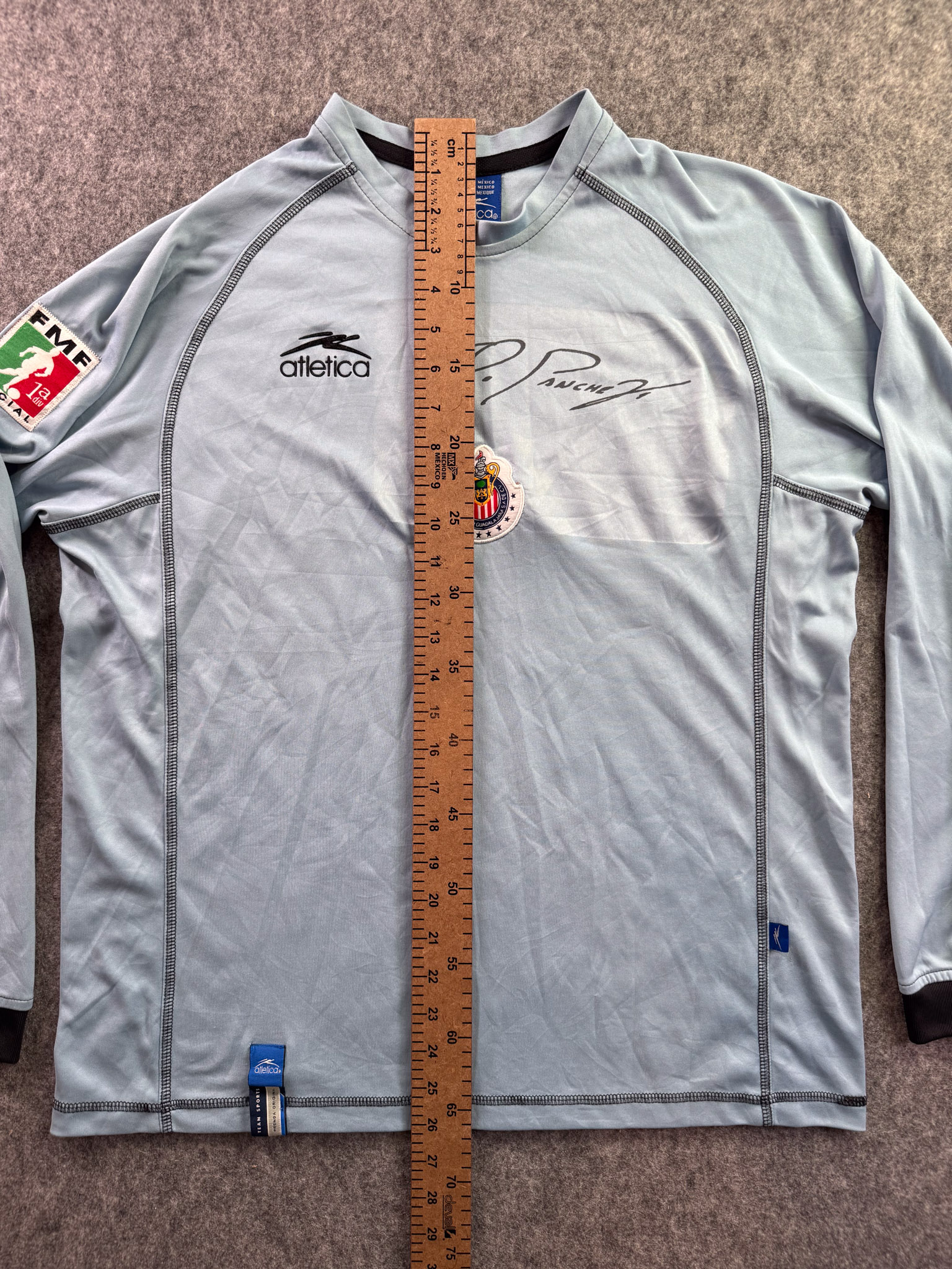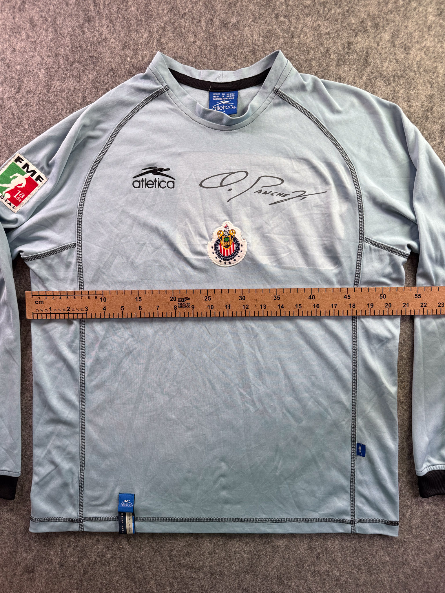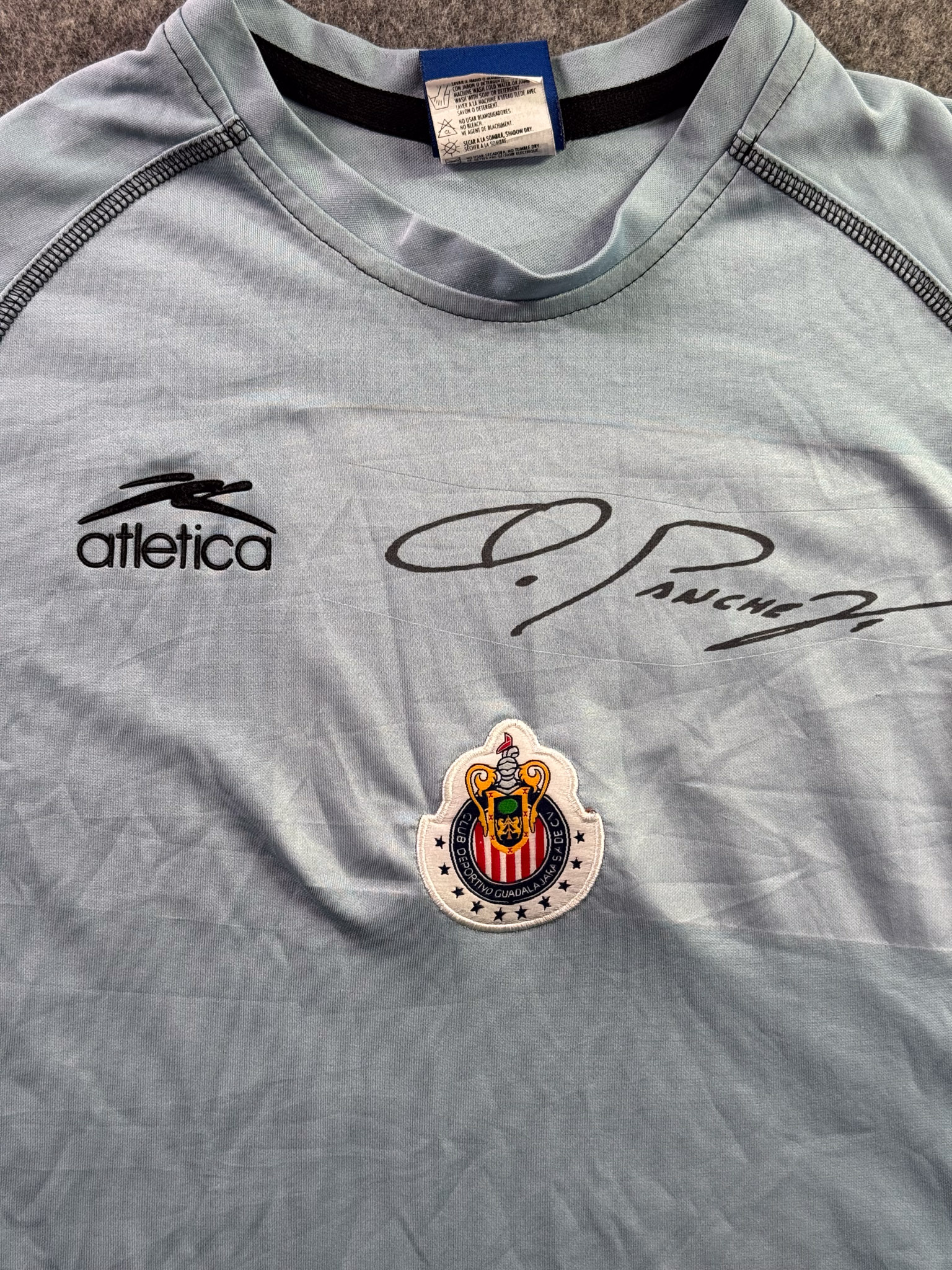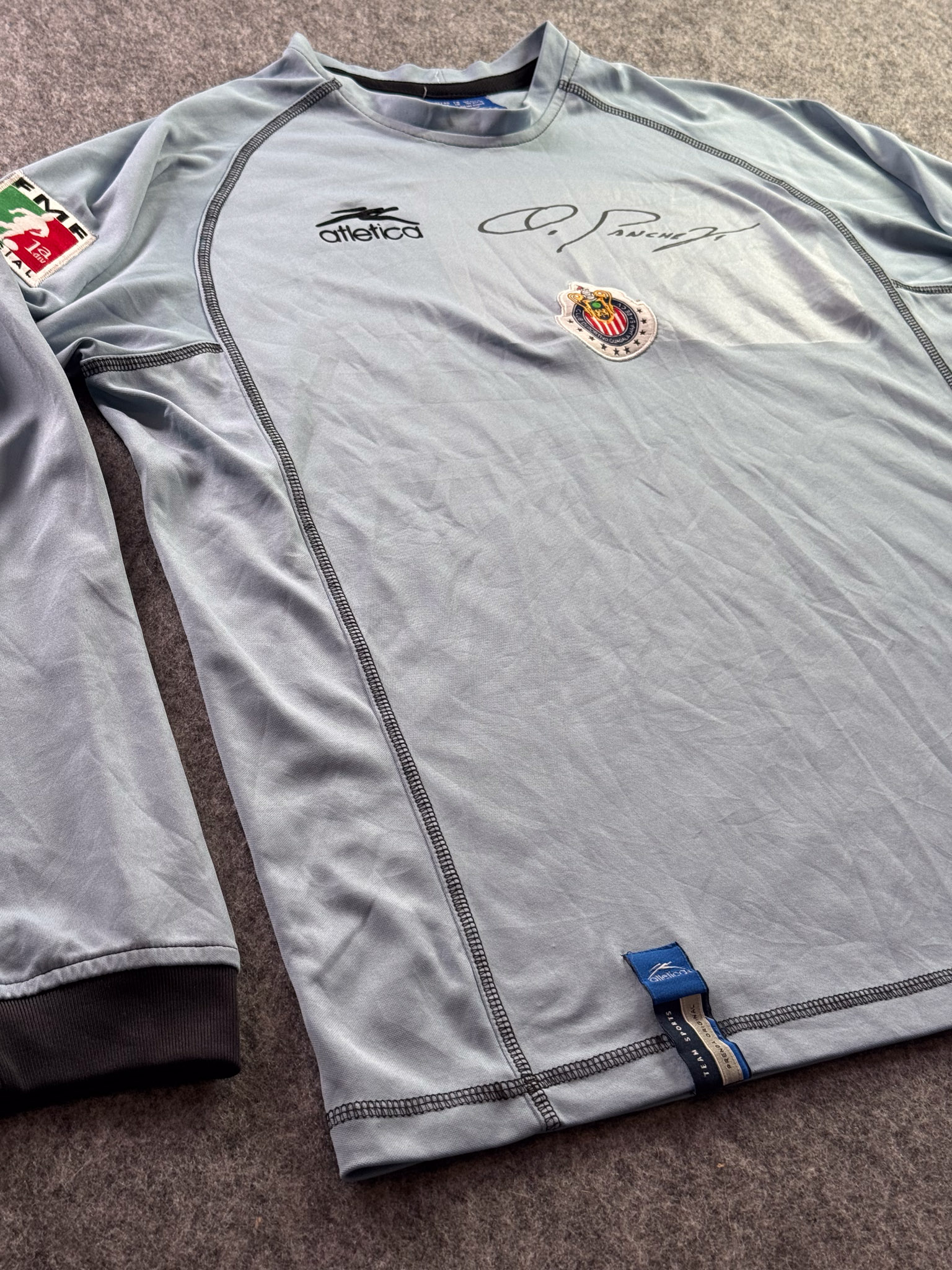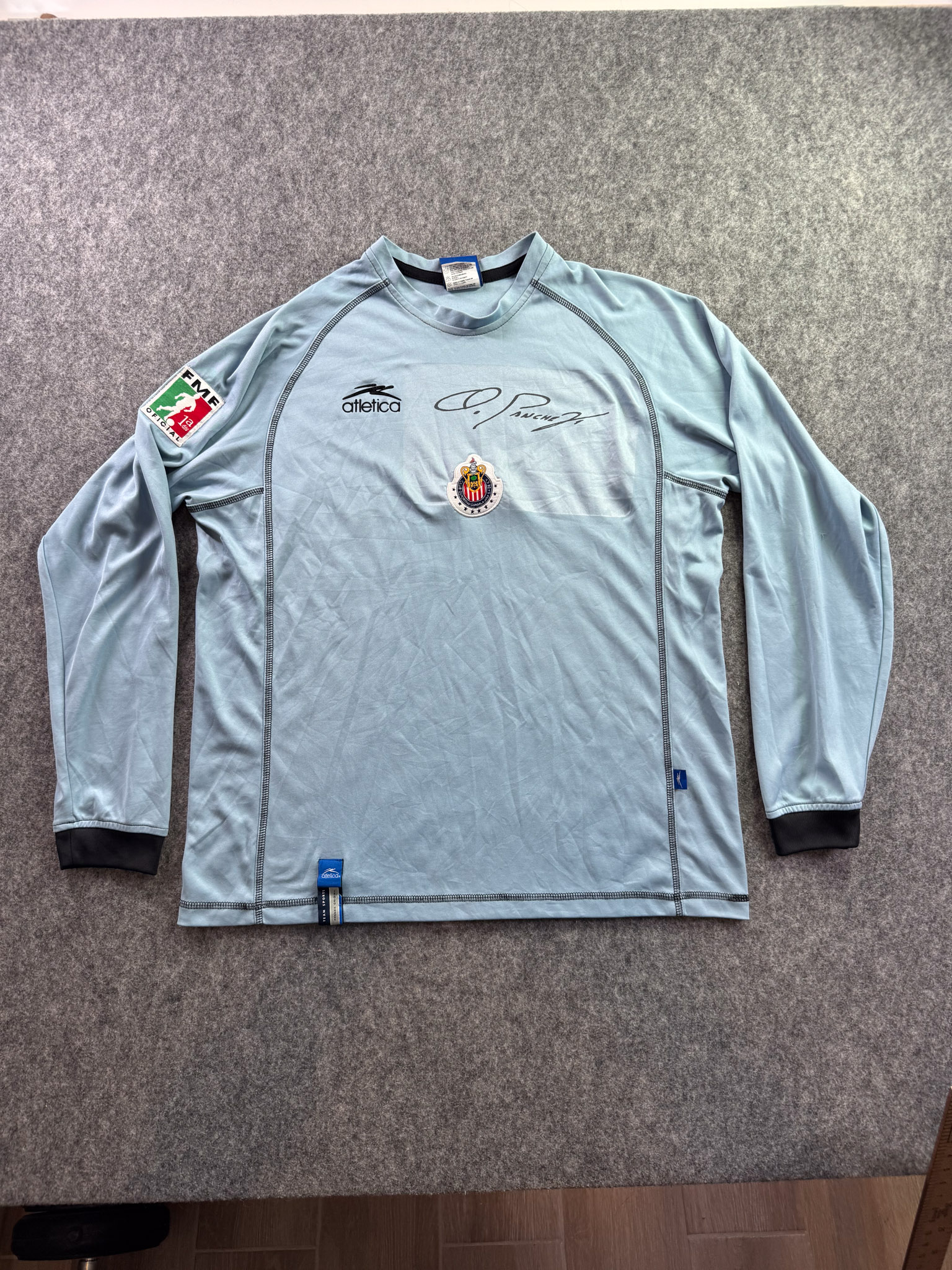 Jersey del Chivas fabricado por Atletica, originario de México. Se trata de la equipación Portero correspondiente a la temporada 03-04. Talla L, con dorsal ‘No’ y en condición Buena. Detalles: Testigo de plancha en estampado de la firma de Oswaldo Sánchez.