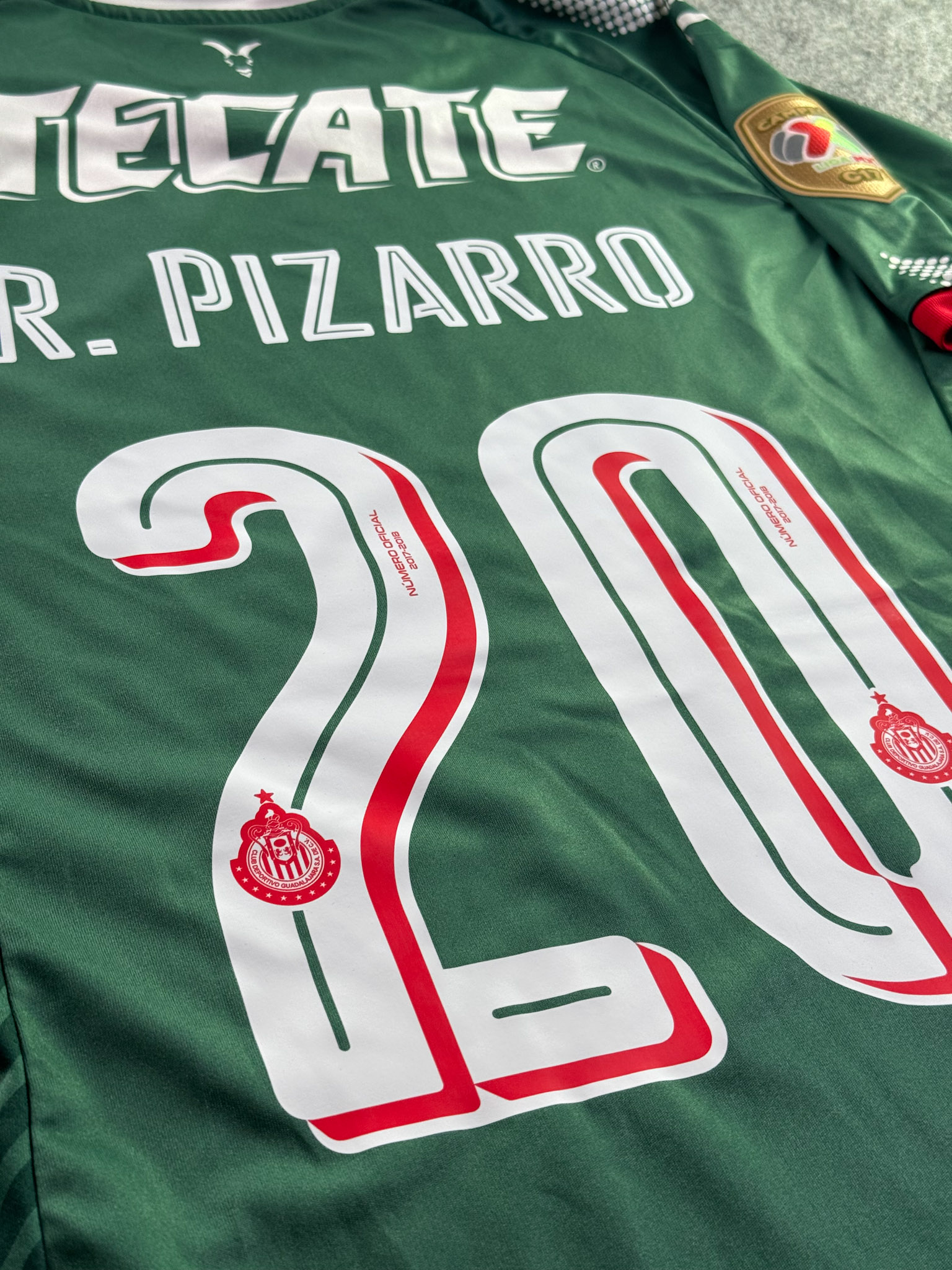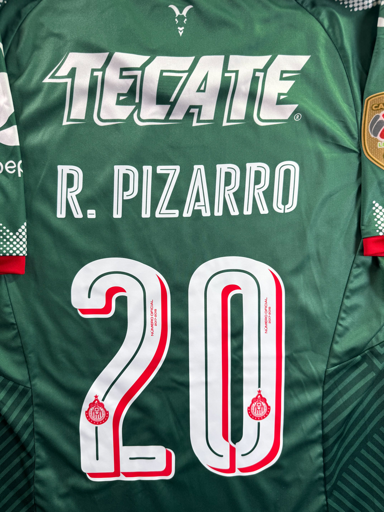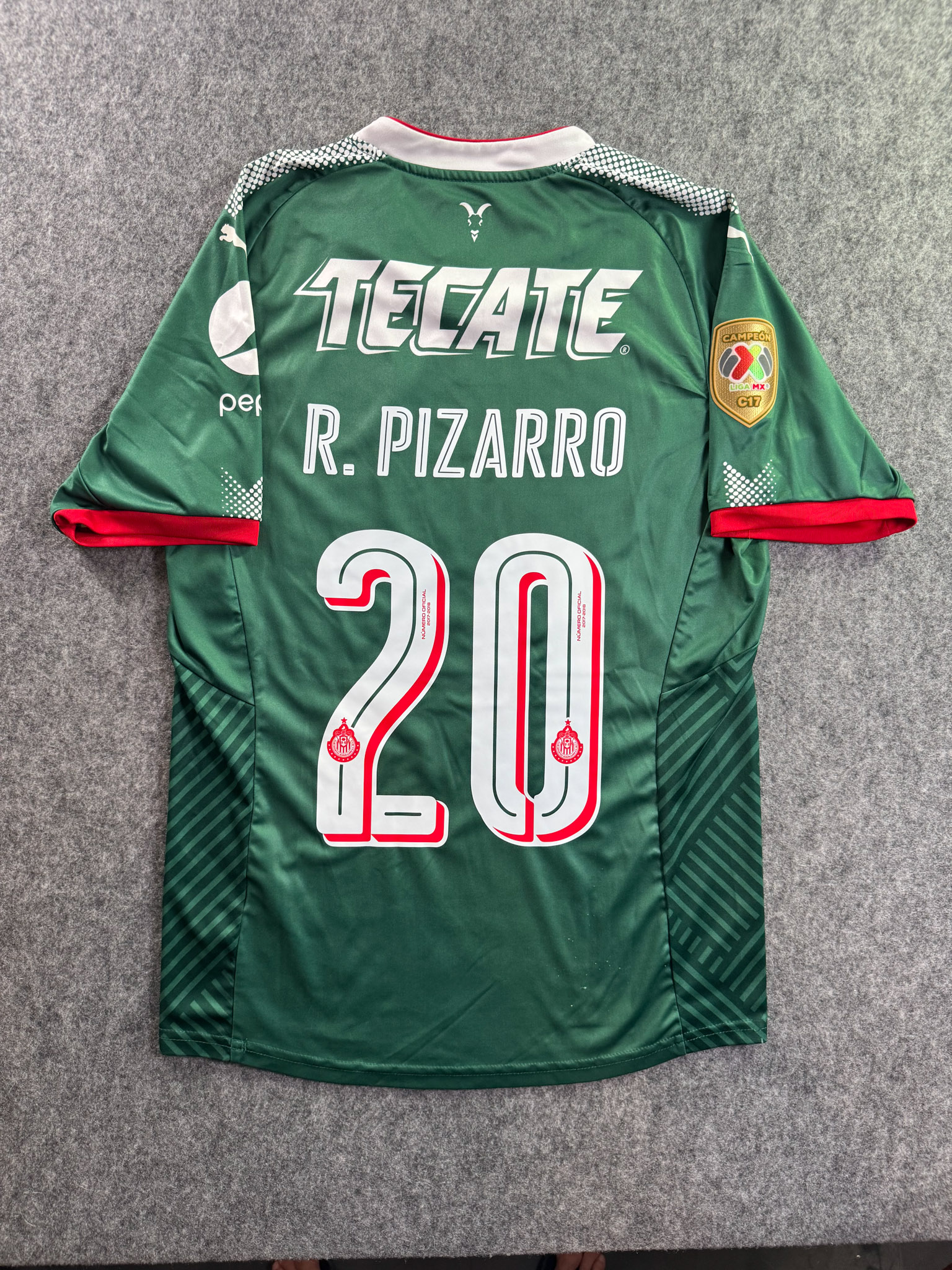Jersey del Chivas fabricado por Puma, originario de México. Se trata de la equipación Tercera correspondiente a la temporada 17-18. Talla M, con dorsal ‘R. Pizarro 20’ y en condición Excelente. Detalles: Parche de campeón.