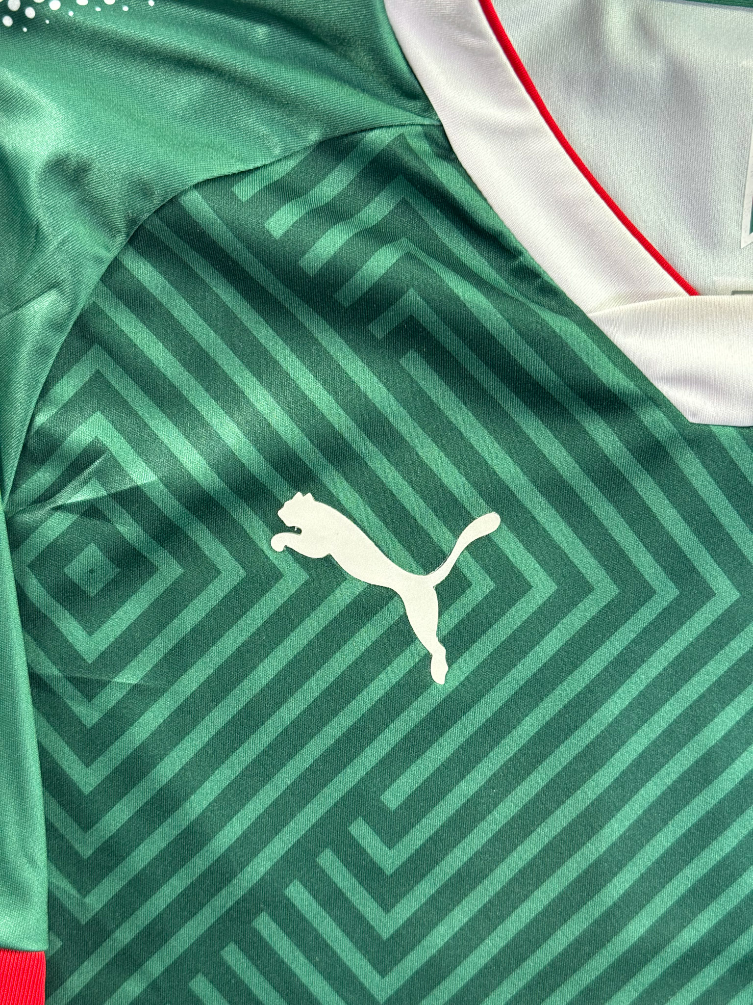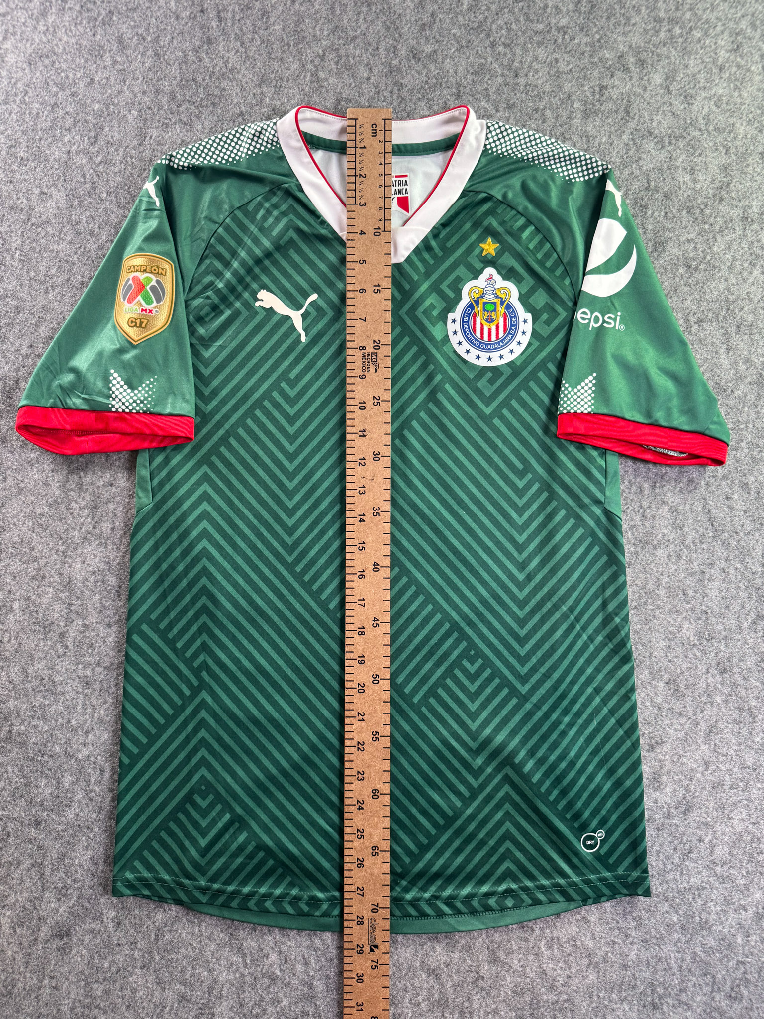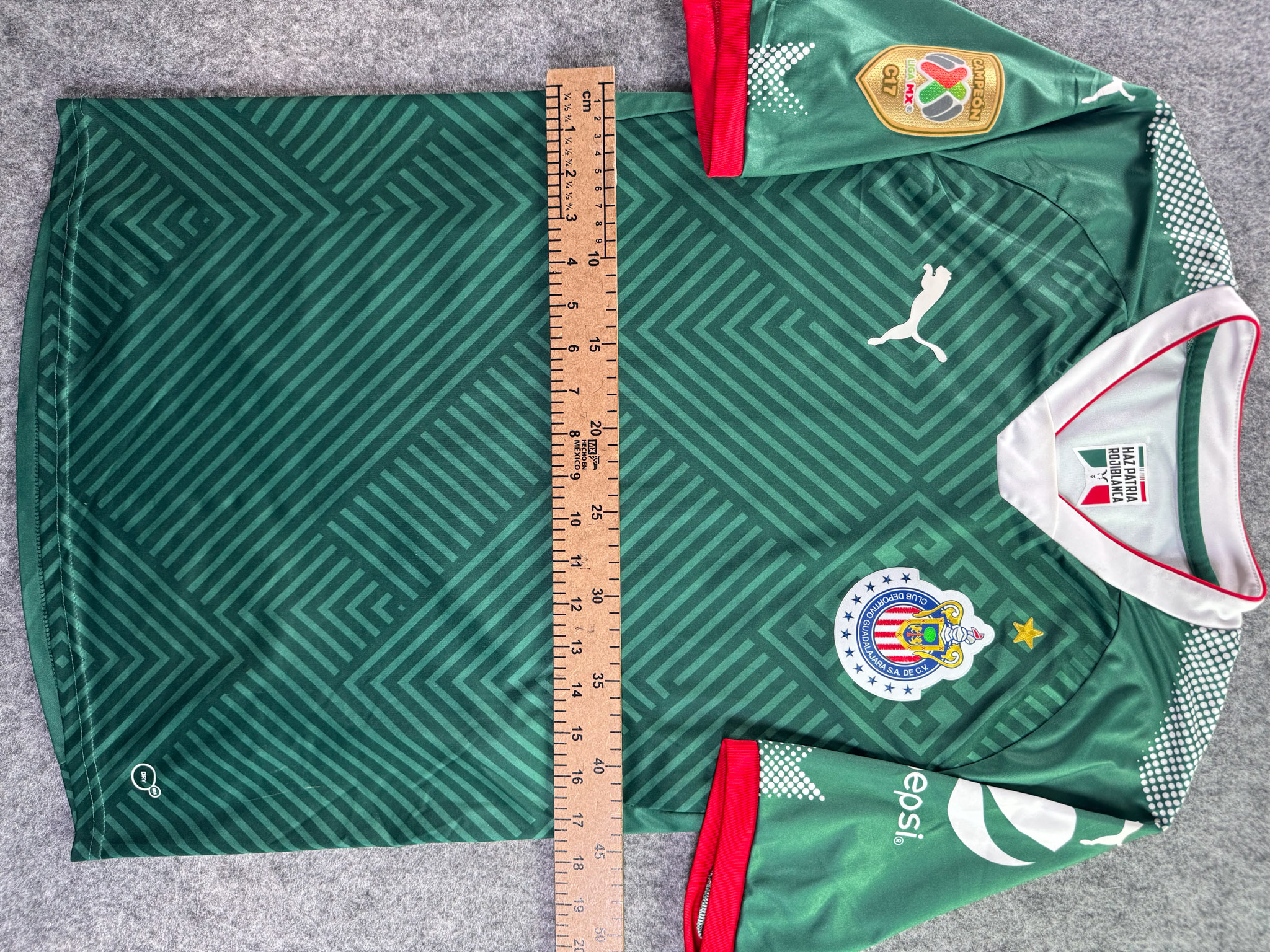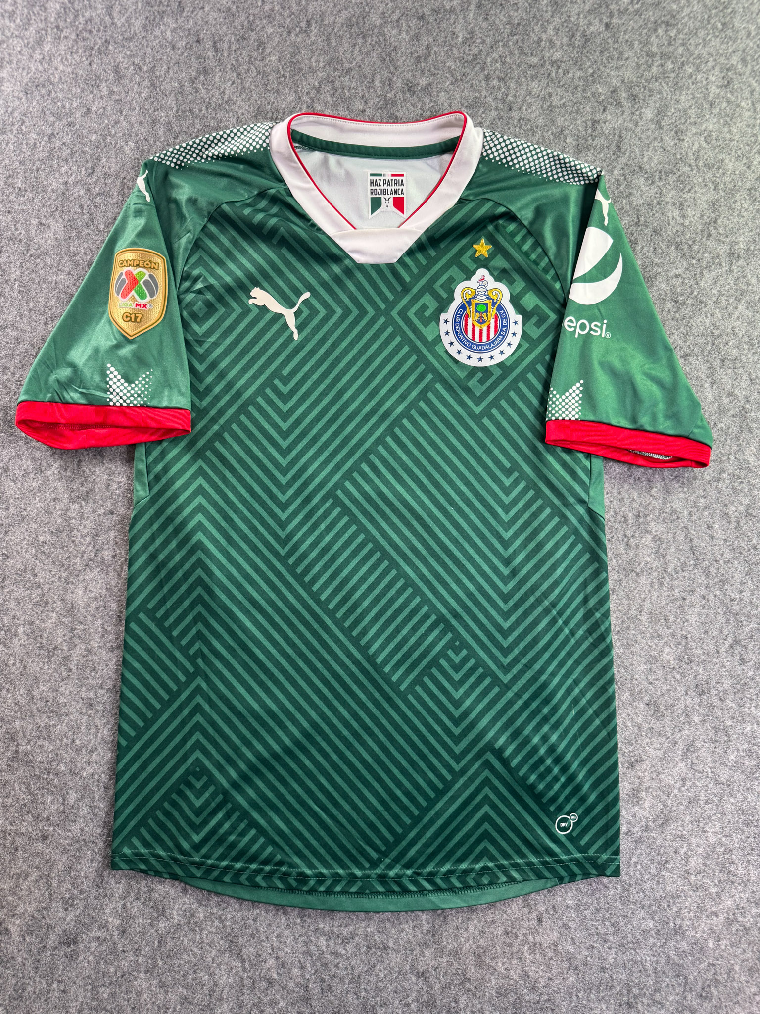 Jersey del Chivas fabricado por Puma, originario de México. Se trata de la equipación Tercera correspondiente a la temporada 17-18. Talla M, con dorsal ‘R. Pizarro 20’ y en condición Excelente. Detalles: Parche de campeón.
