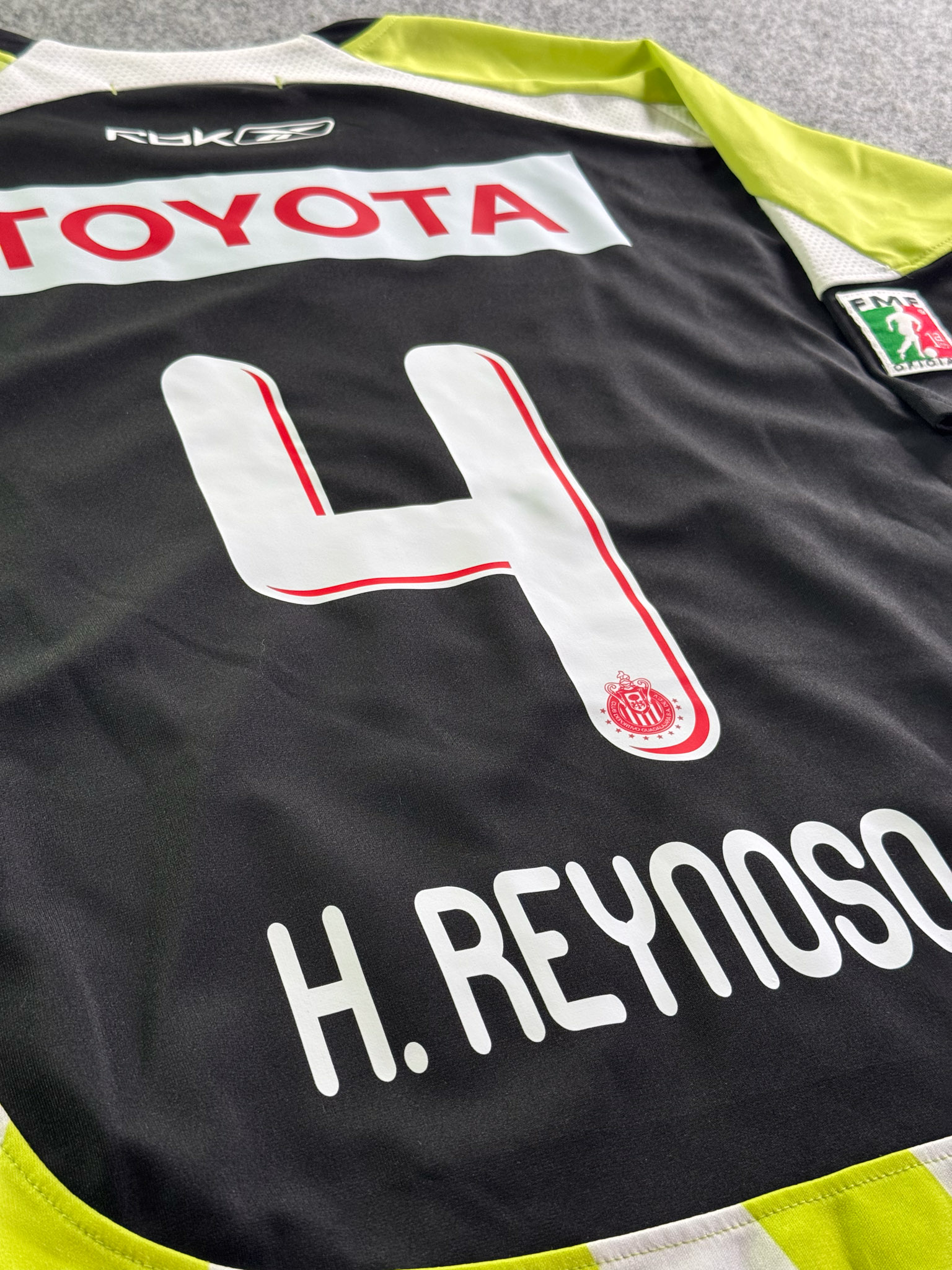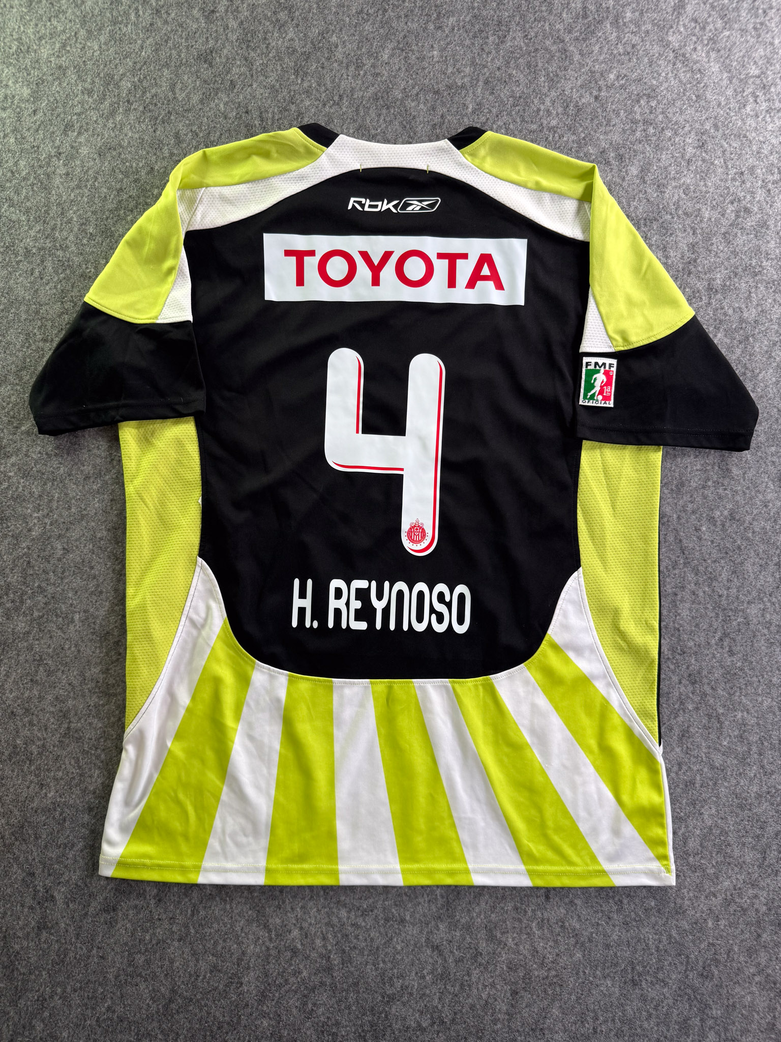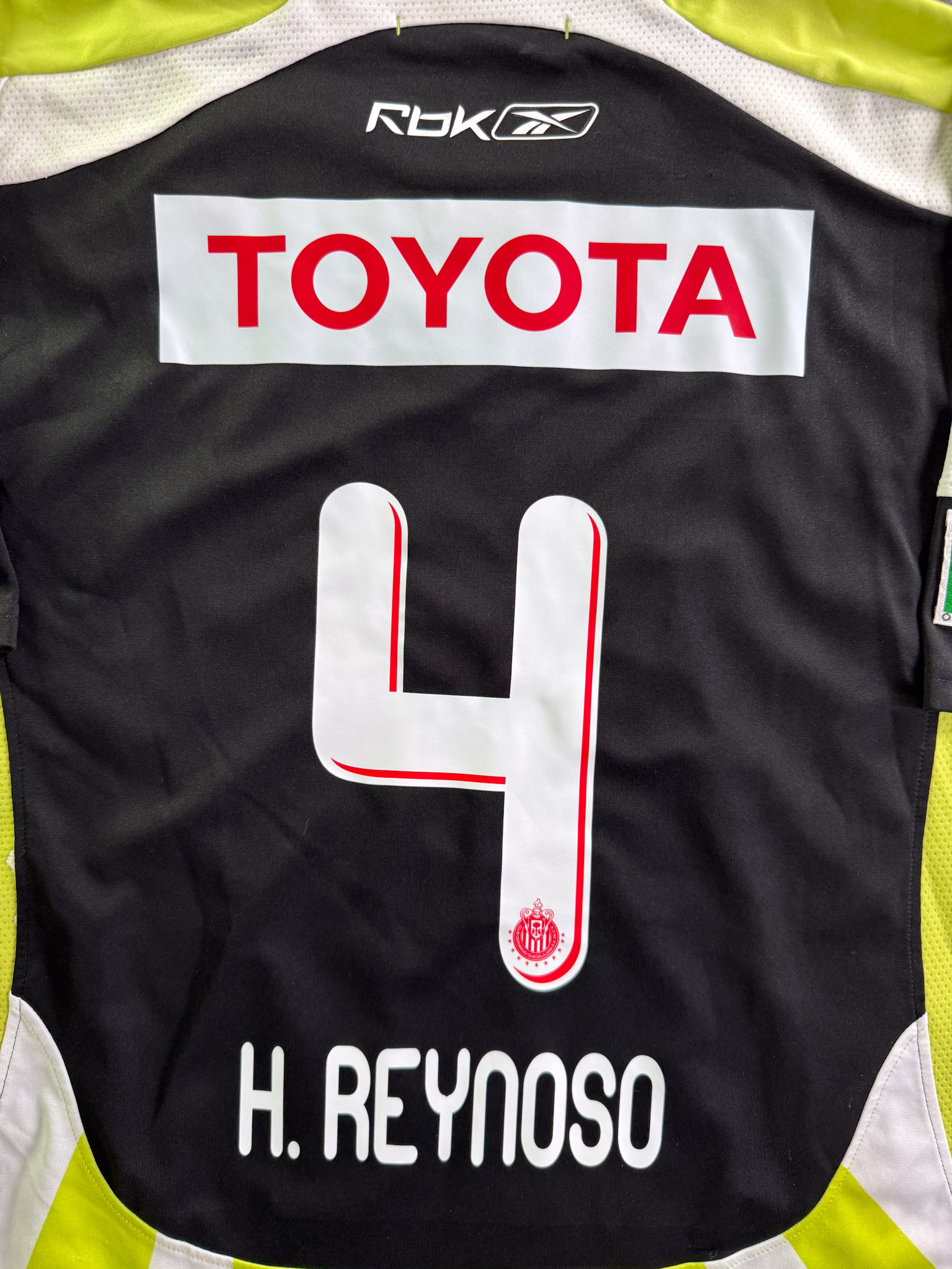 Jersey del Chivas fabricado por Reebok, originario de México. Se trata de la equipación Visita correspondiente a la temporada 08-09. Talla XL, con dorsal ‘H. Reynoso 4’ y en condición Muy Buena. Detalles: Ligero desgaste en viniles de Reebok al frente.