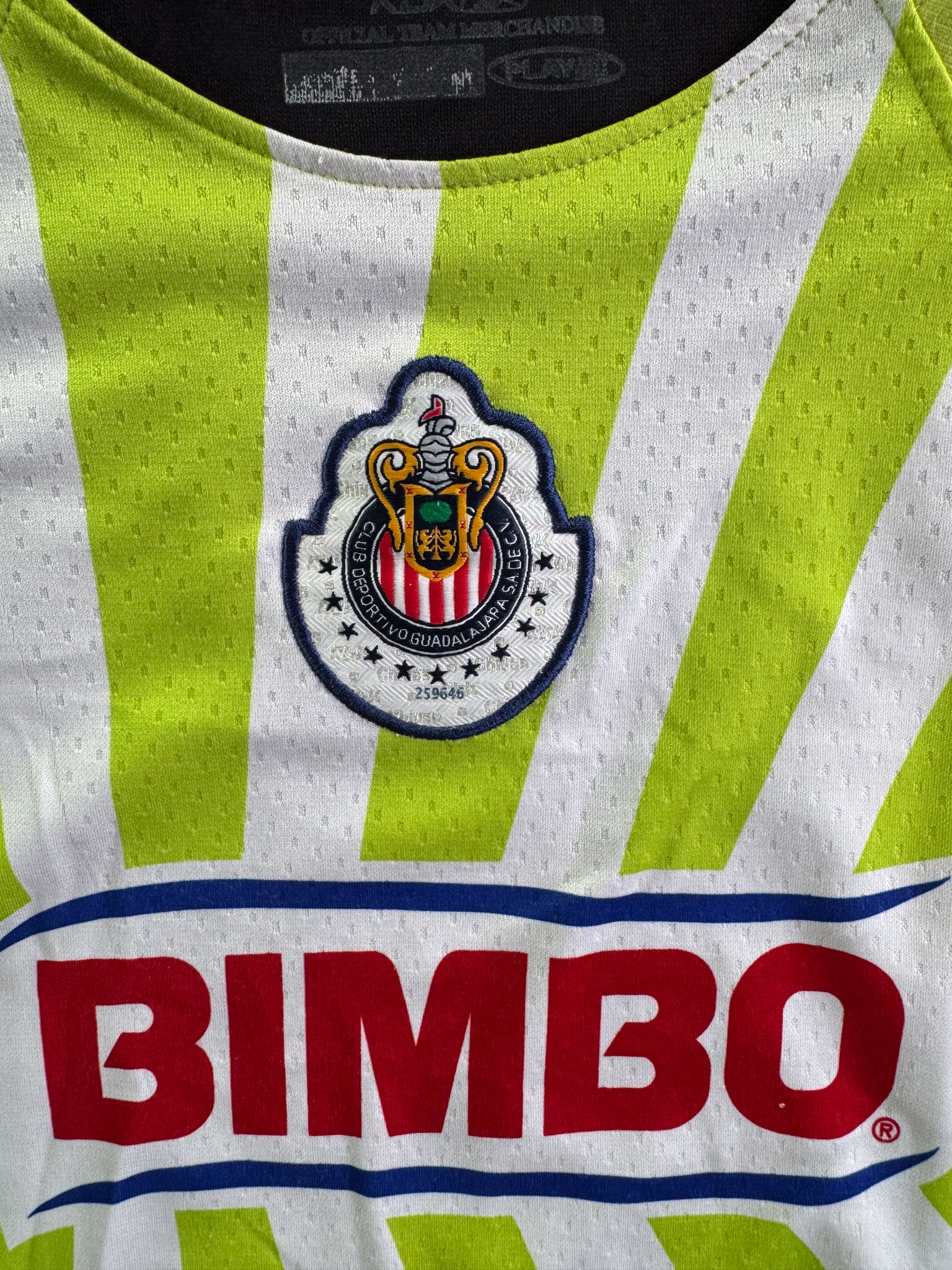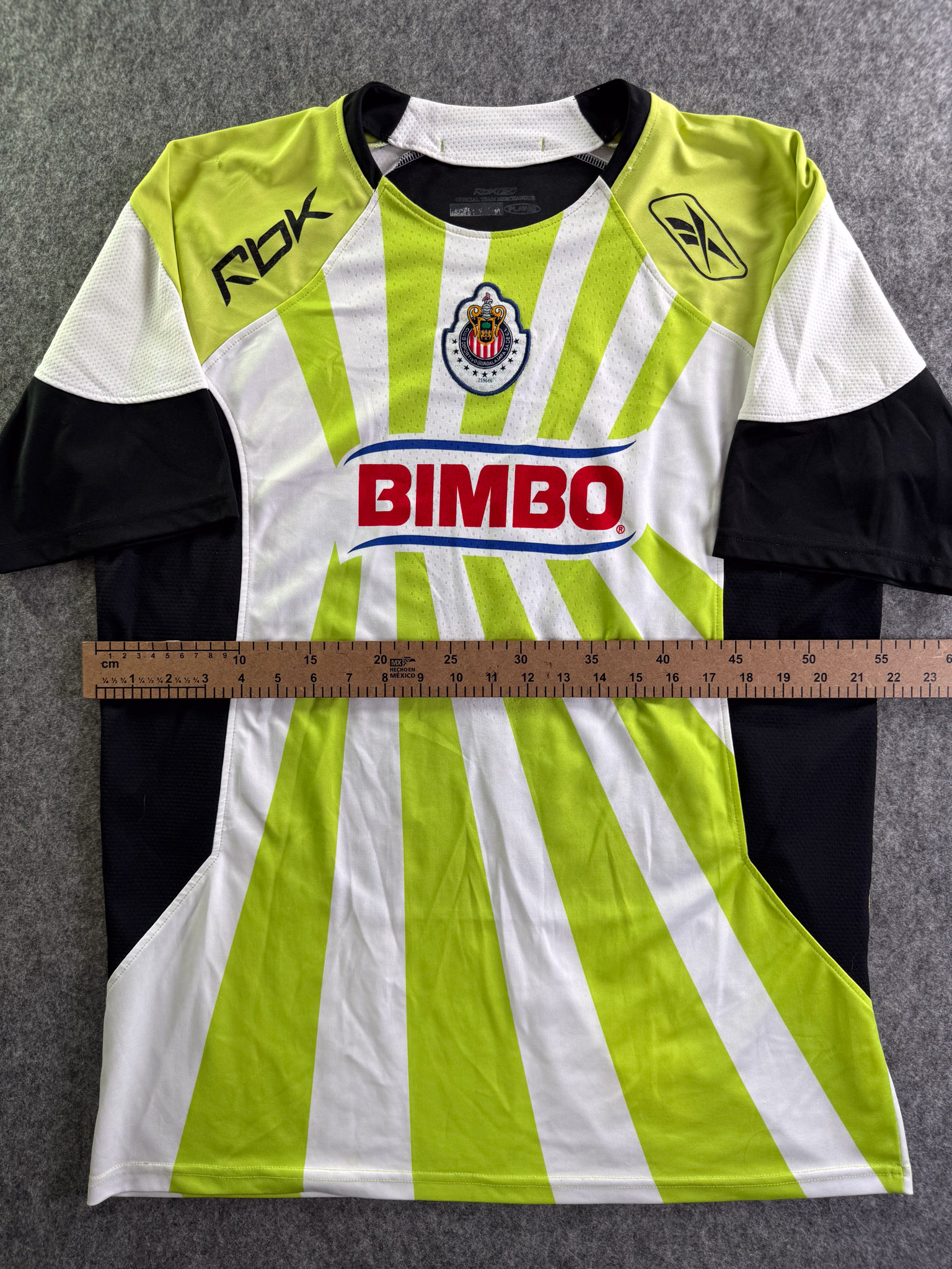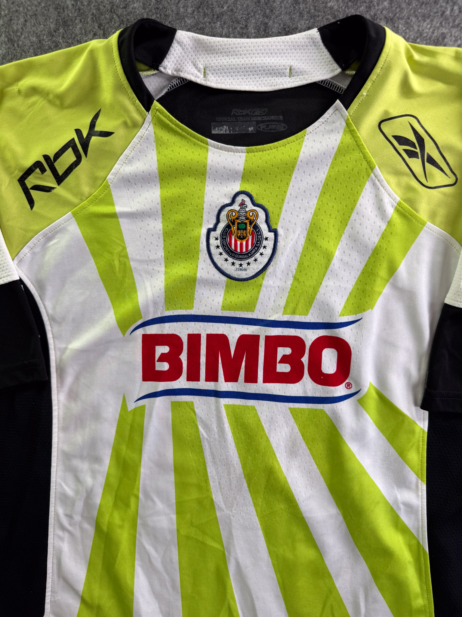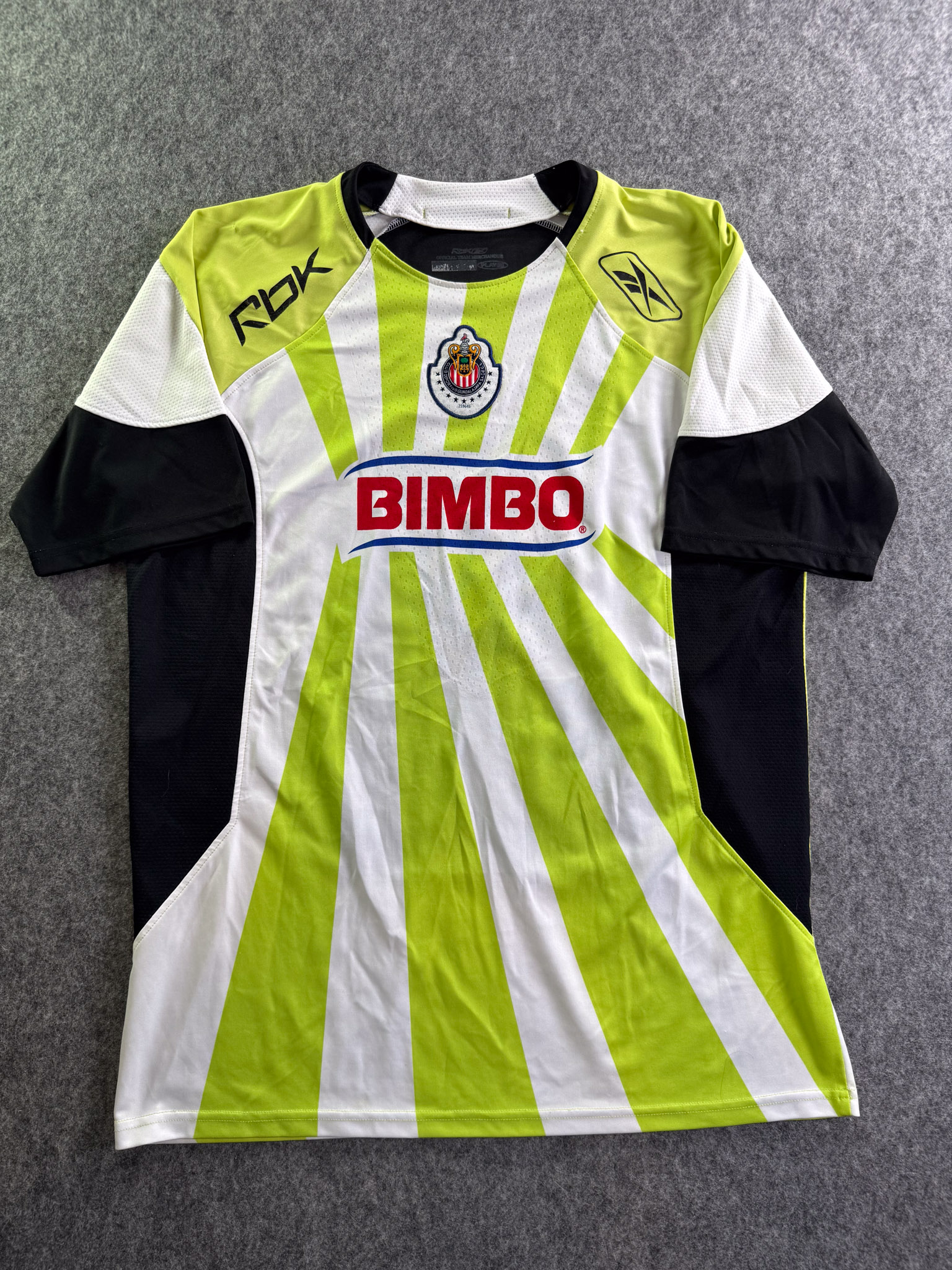 Jersey del Chivas fabricado por Reebok, originario de México. Se trata de la equipación Visita correspondiente a la temporada 08-09. Talla XL, con dorsal ‘H. Reynoso 4’ y en condición Muy Buena. Detalles: Ligero desgaste en viniles de Reebok al frente.