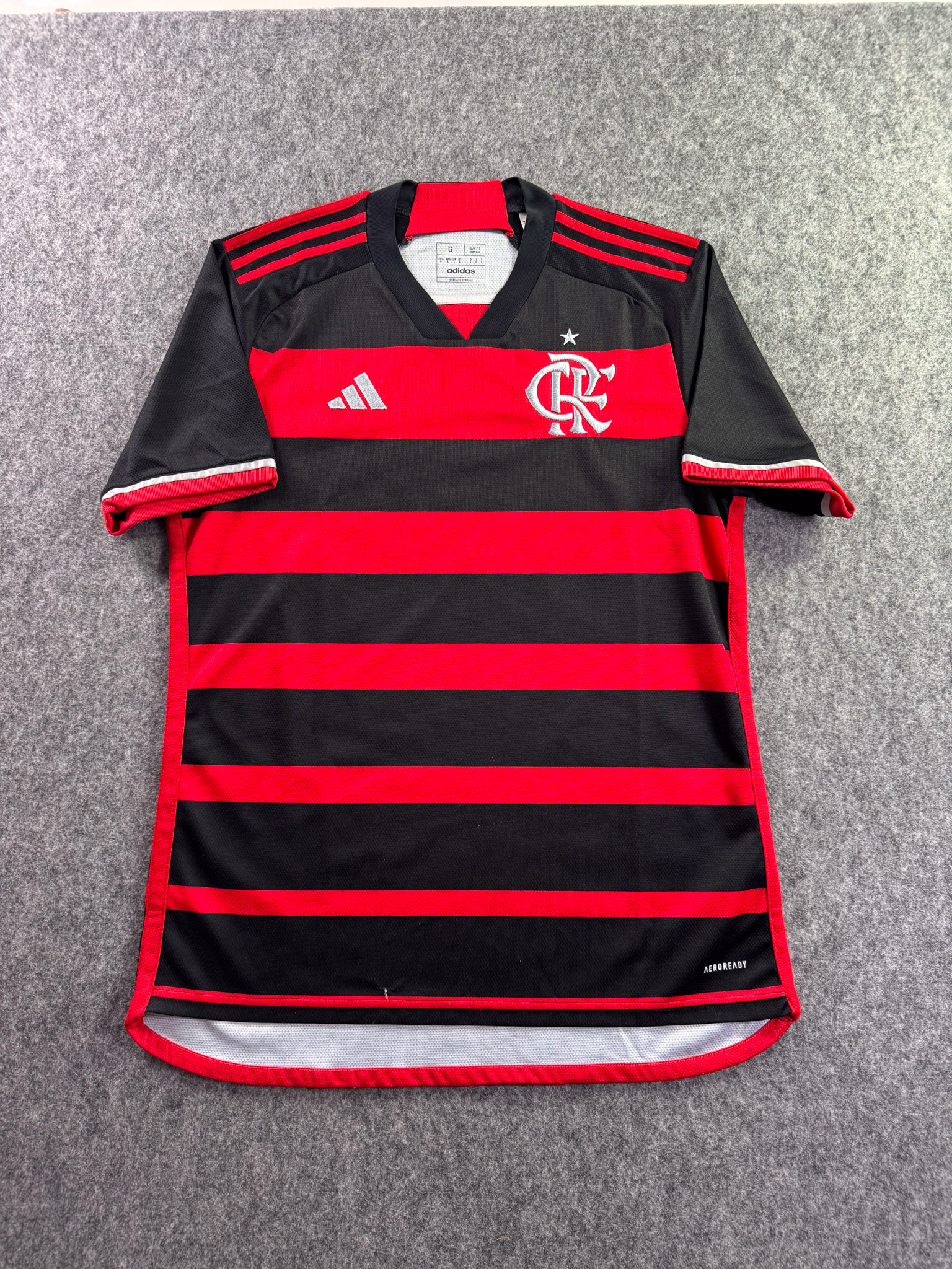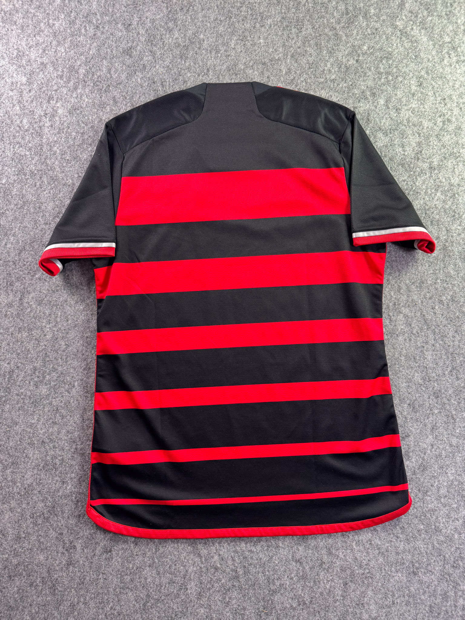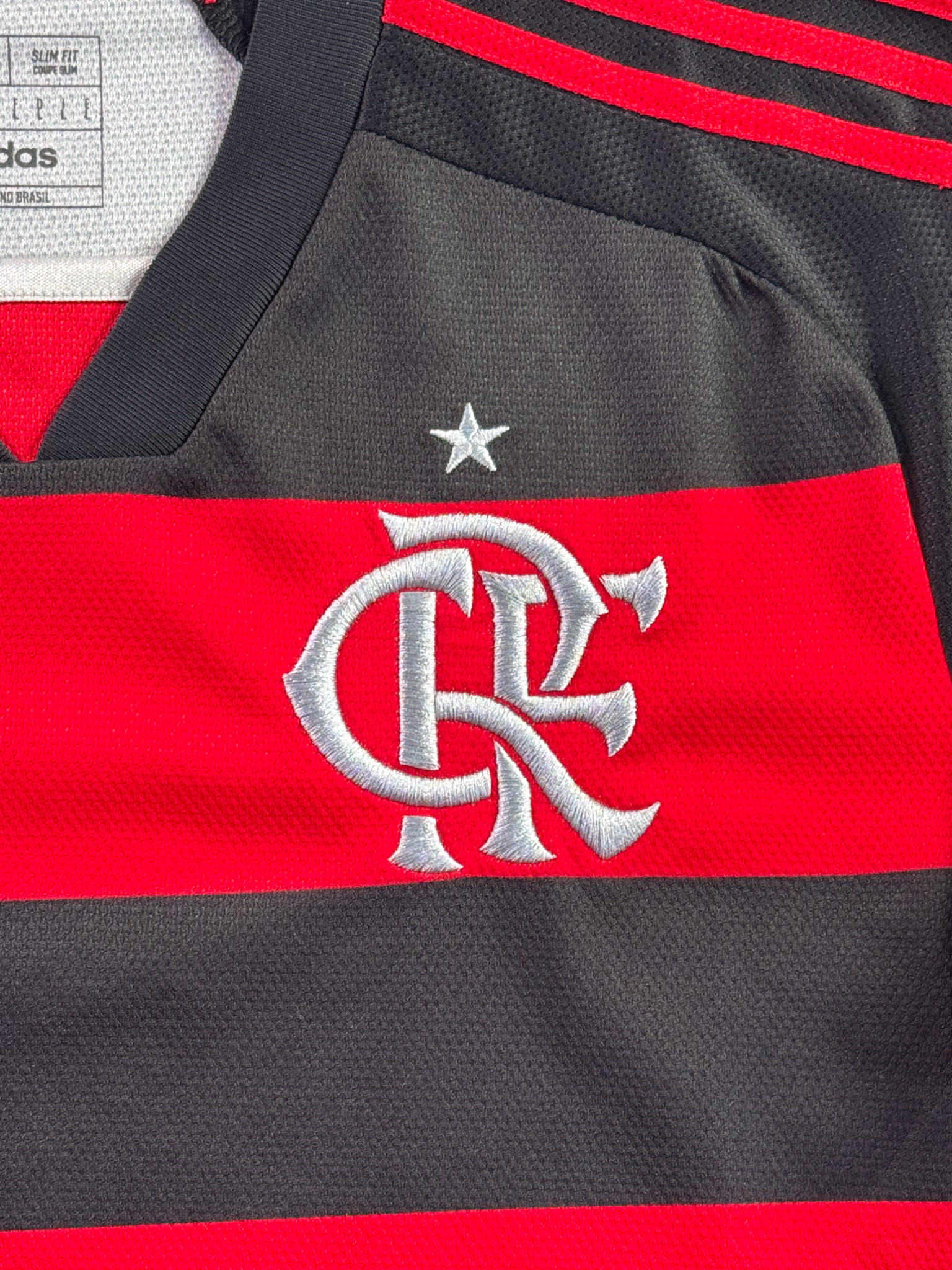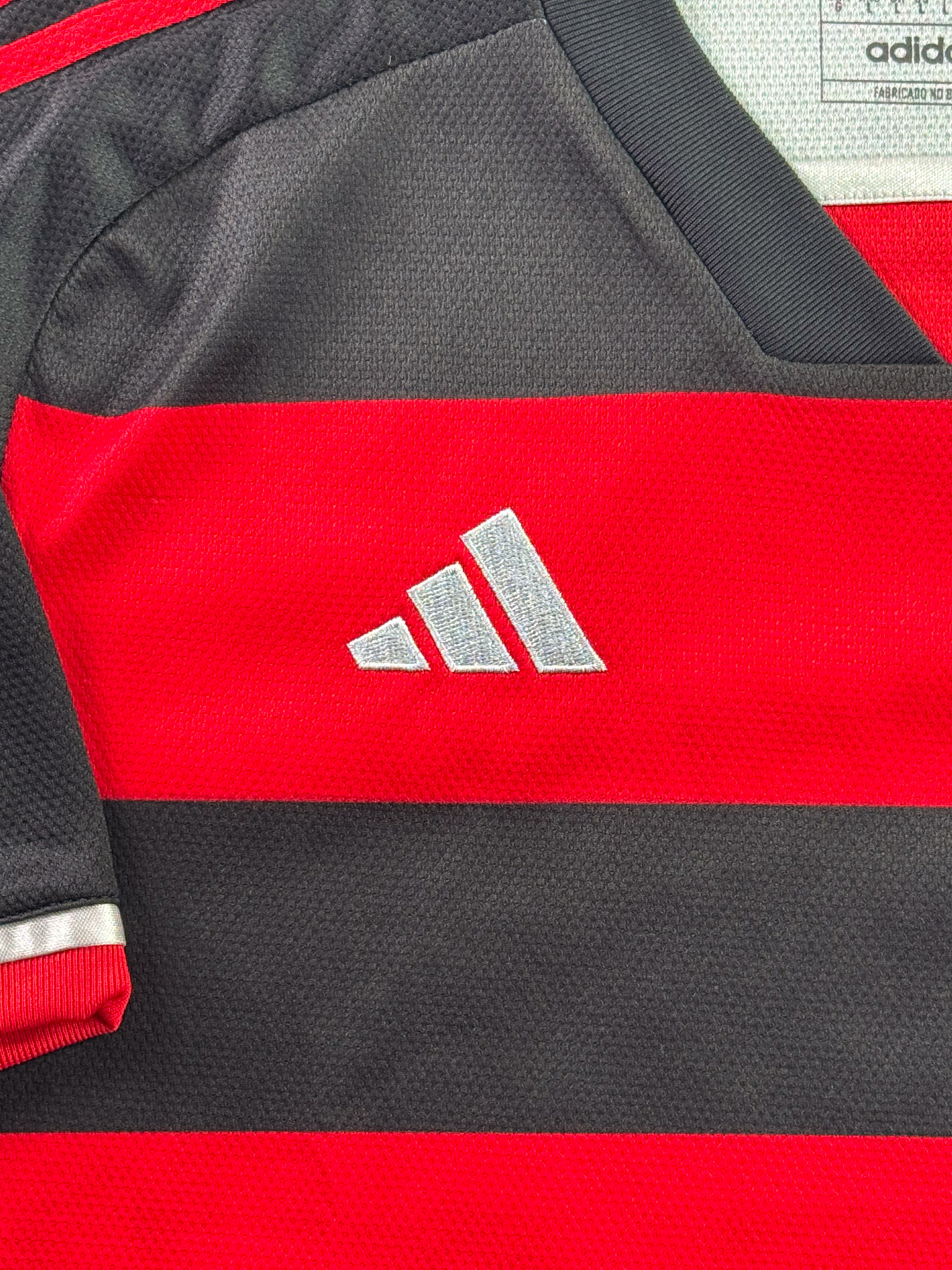 Jersey del Flamengo fabricado por Adidas, originario de Brasill. Se trata de la equipación Local correspondiente a la temporada 23-24. Talla L, con dorsal ‘No’ y en condición Muy Buena. Detalles: Un hilo jalado en la parte frontal inferior.