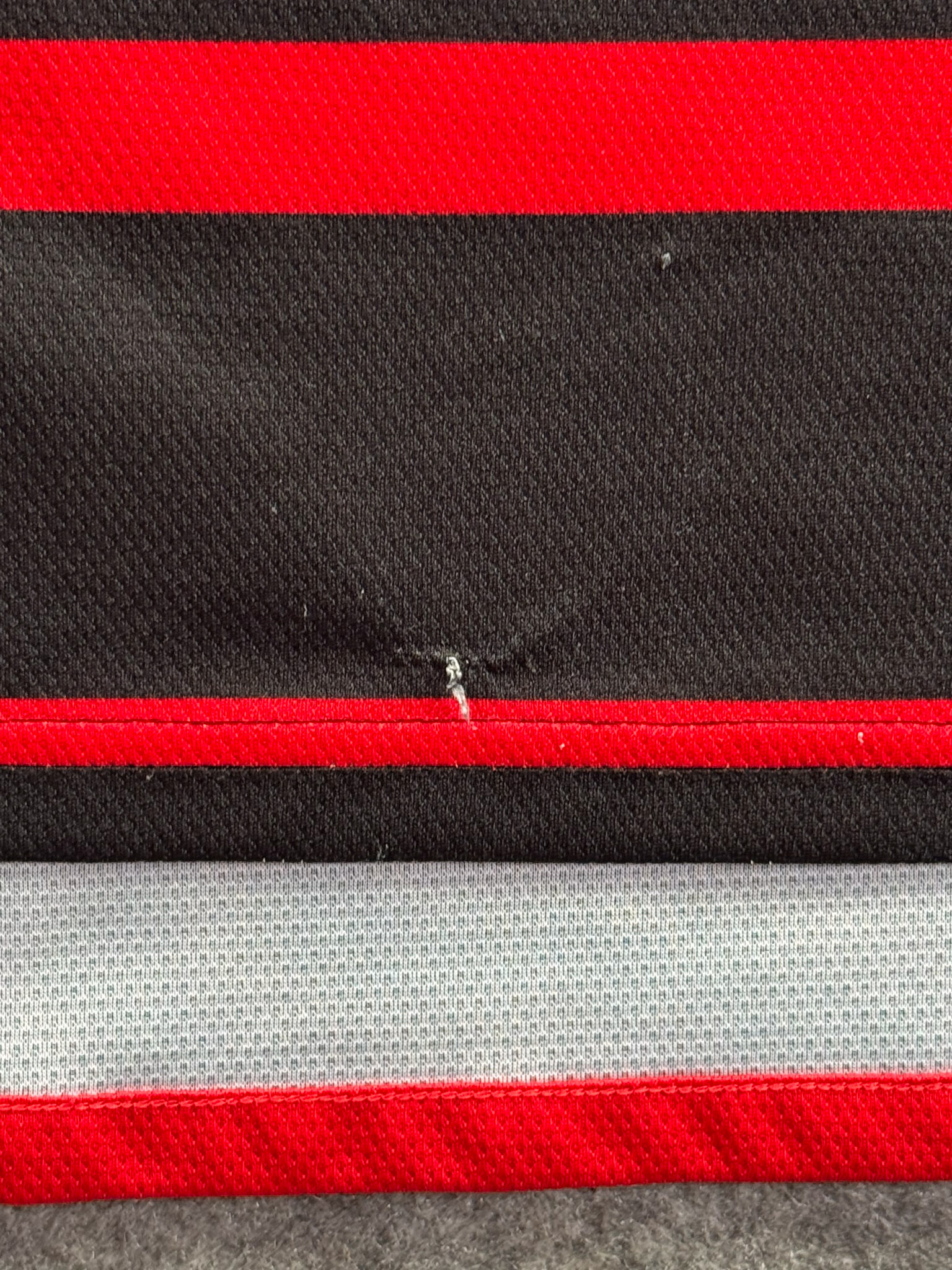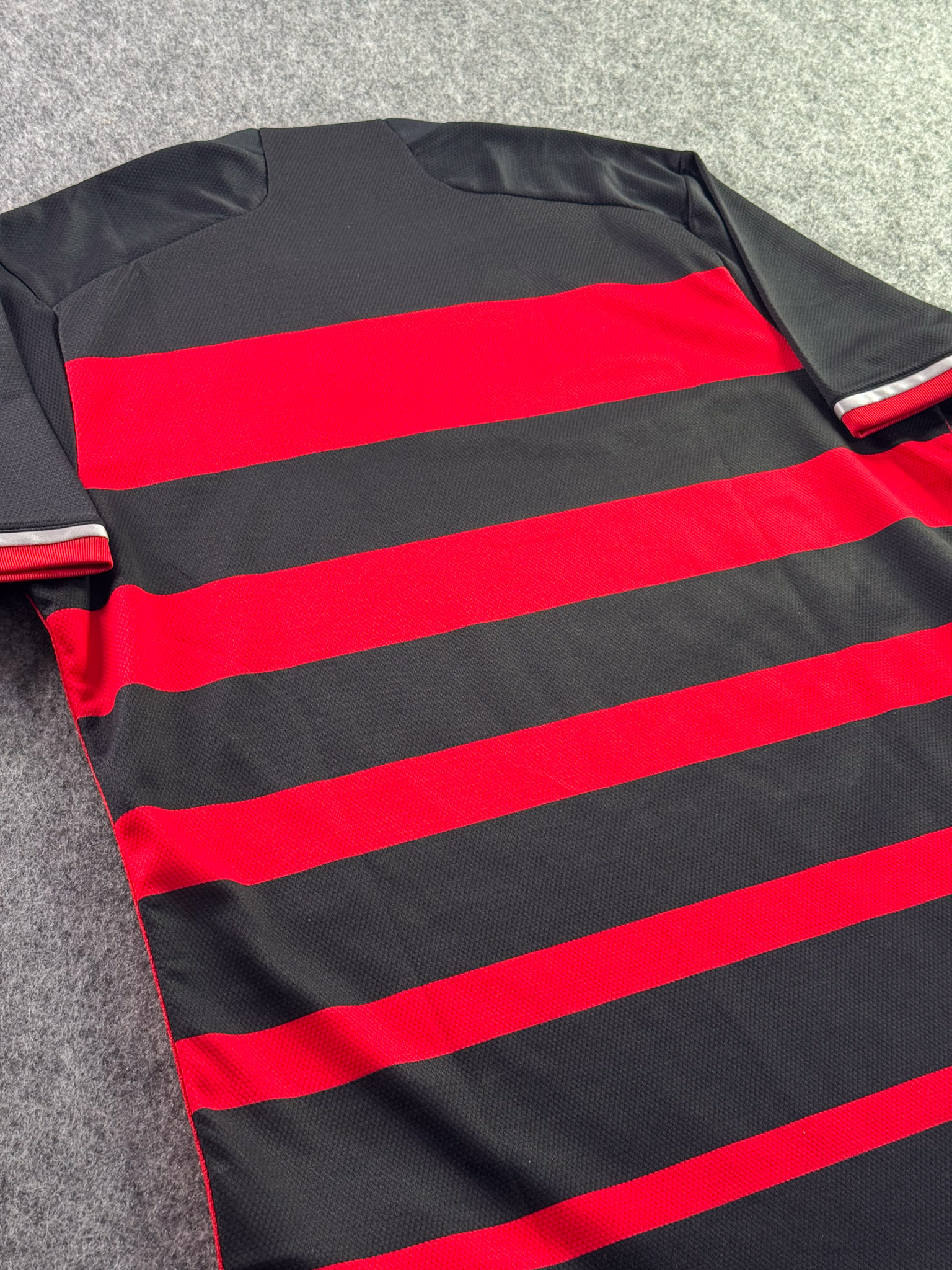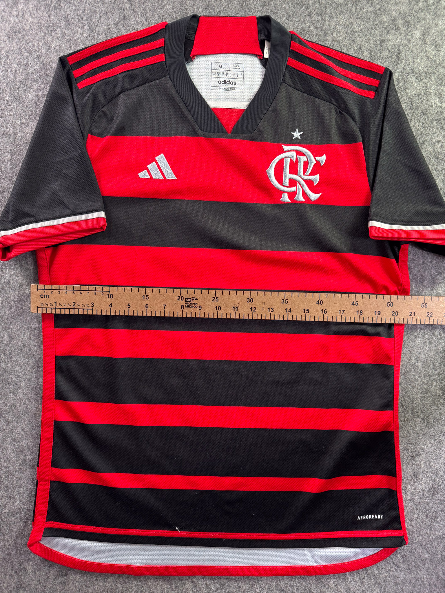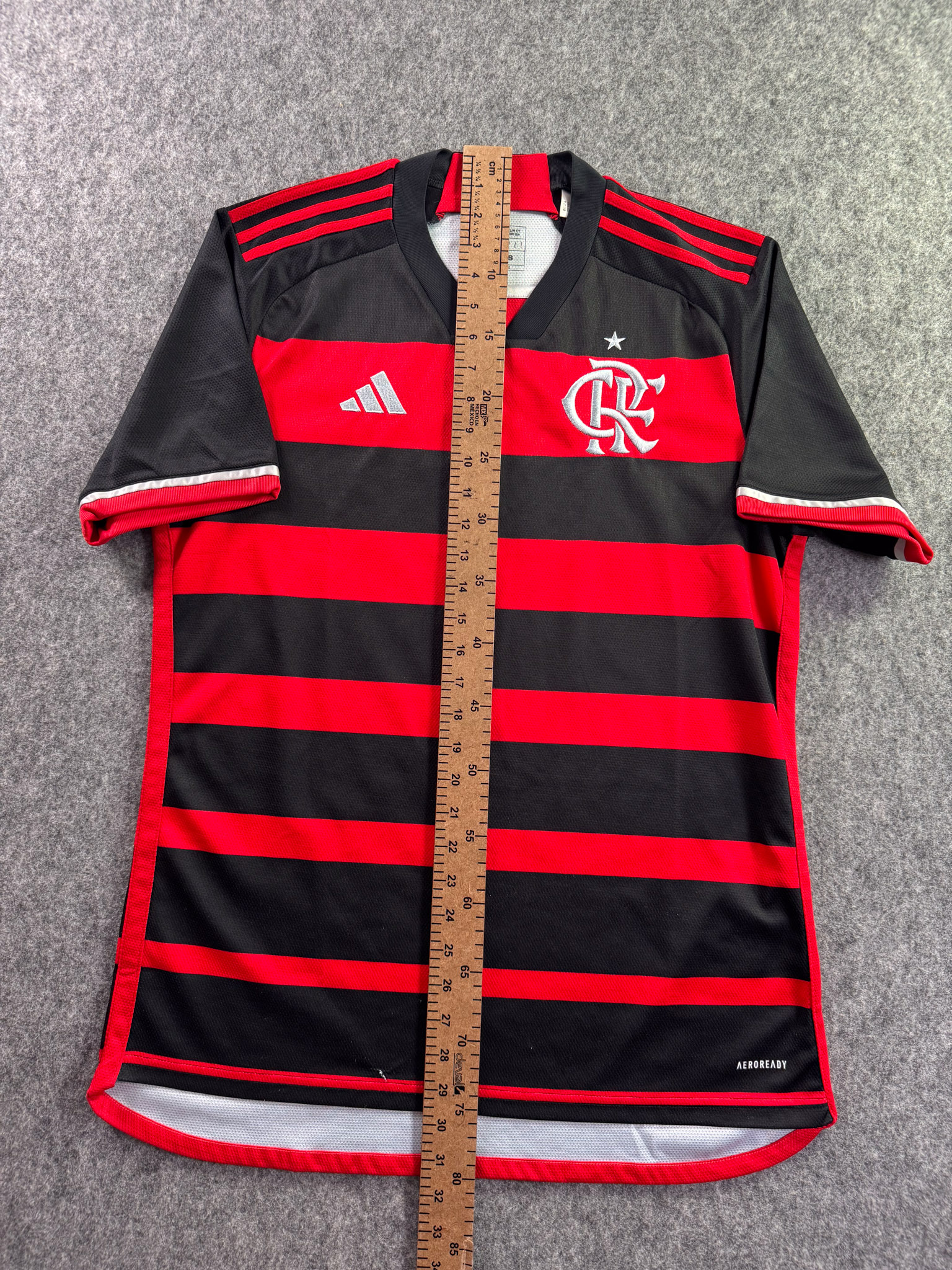 Jersey del Flamengo fabricado por Adidas, originario de Brasill. Se trata de la equipación Local correspondiente a la temporada 23-24. Talla L, con dorsal ‘No’ y en condición Muy Buena. Detalles: Un hilo jalado en la parte frontal inferior.
