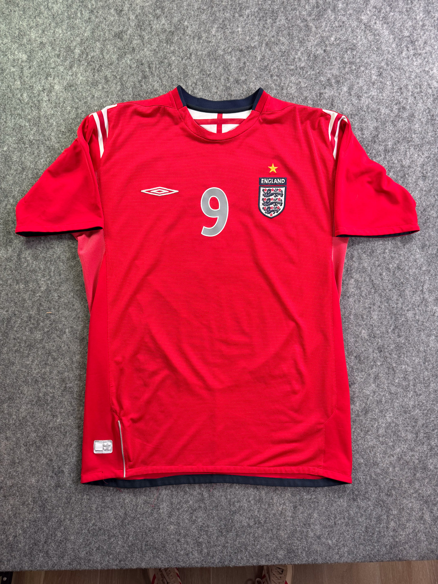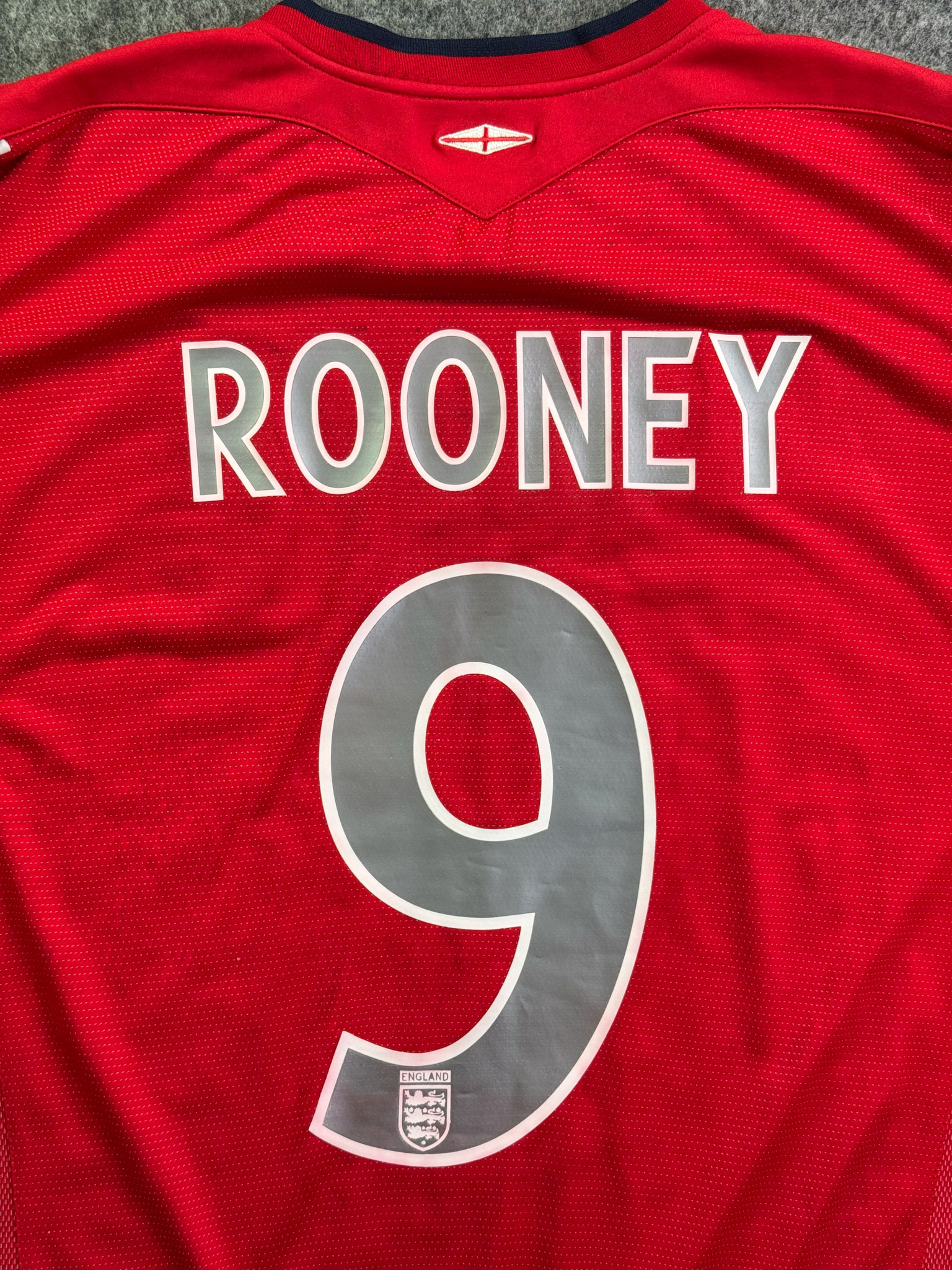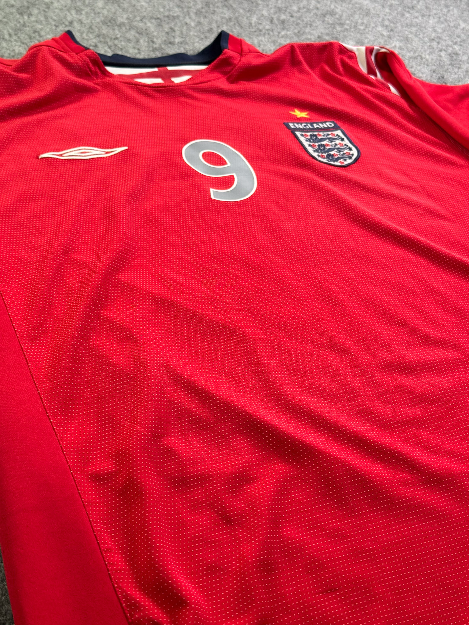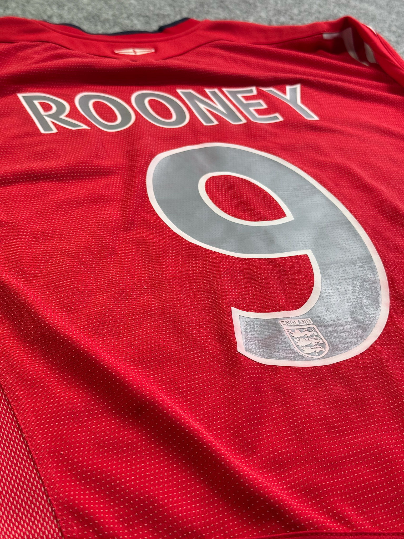 Jersey del Selección Inglaterra fabricado por Umbro, originario de Inglaterra. Se trata de la equipación Visita correspondiente a la temporada 04-06. Talla L, con dorsal ‘Rooney 9’ y en condición Buena. Detalles: Ligero desgaste en viniles por el paso del tiempo.