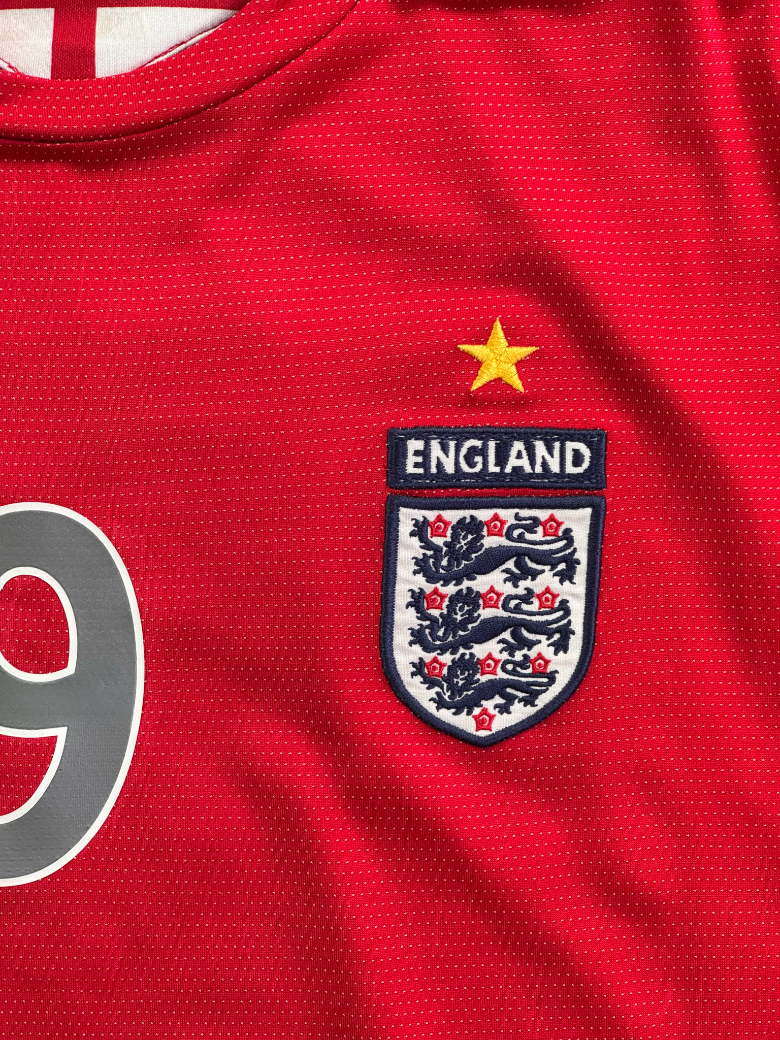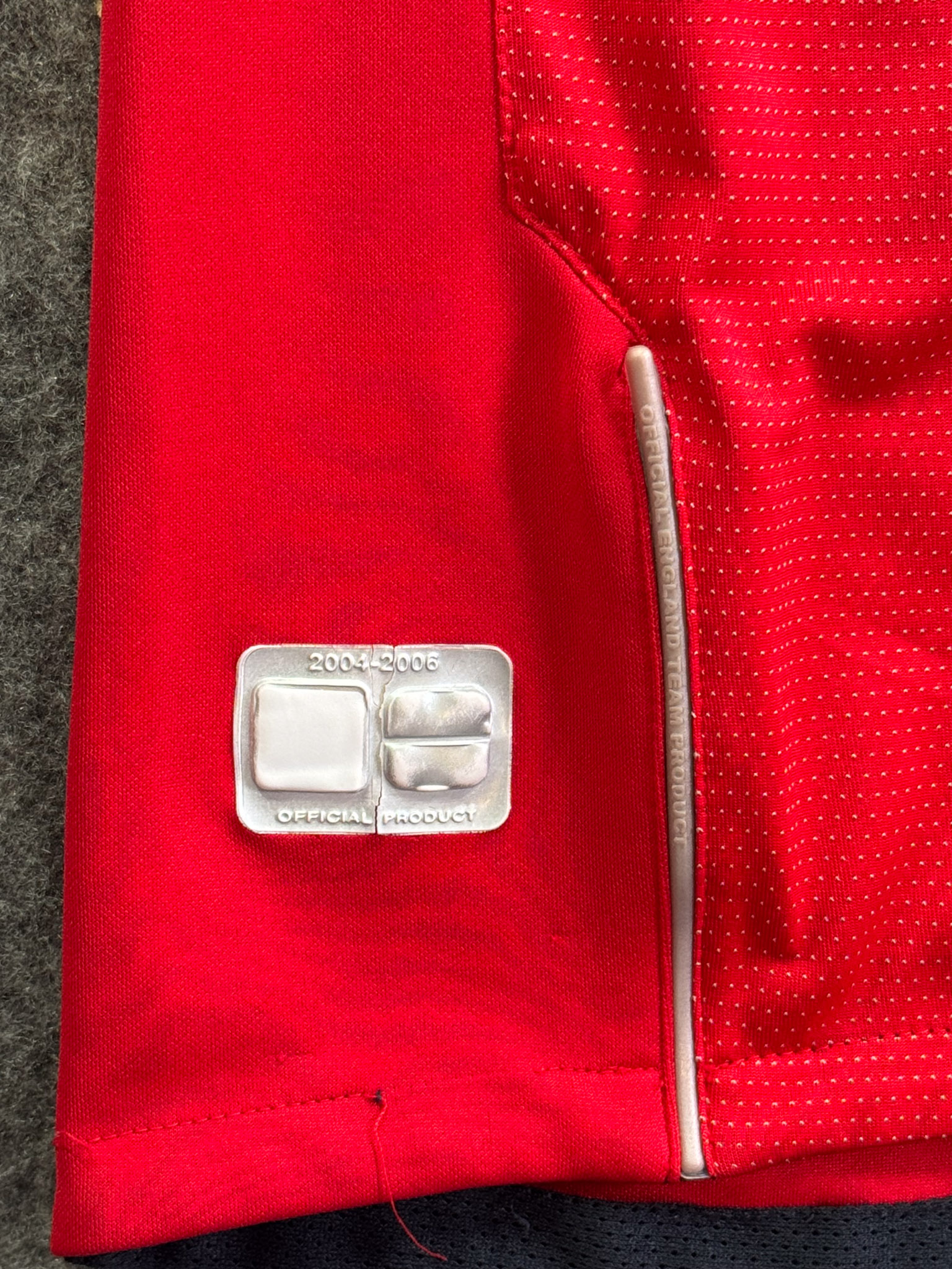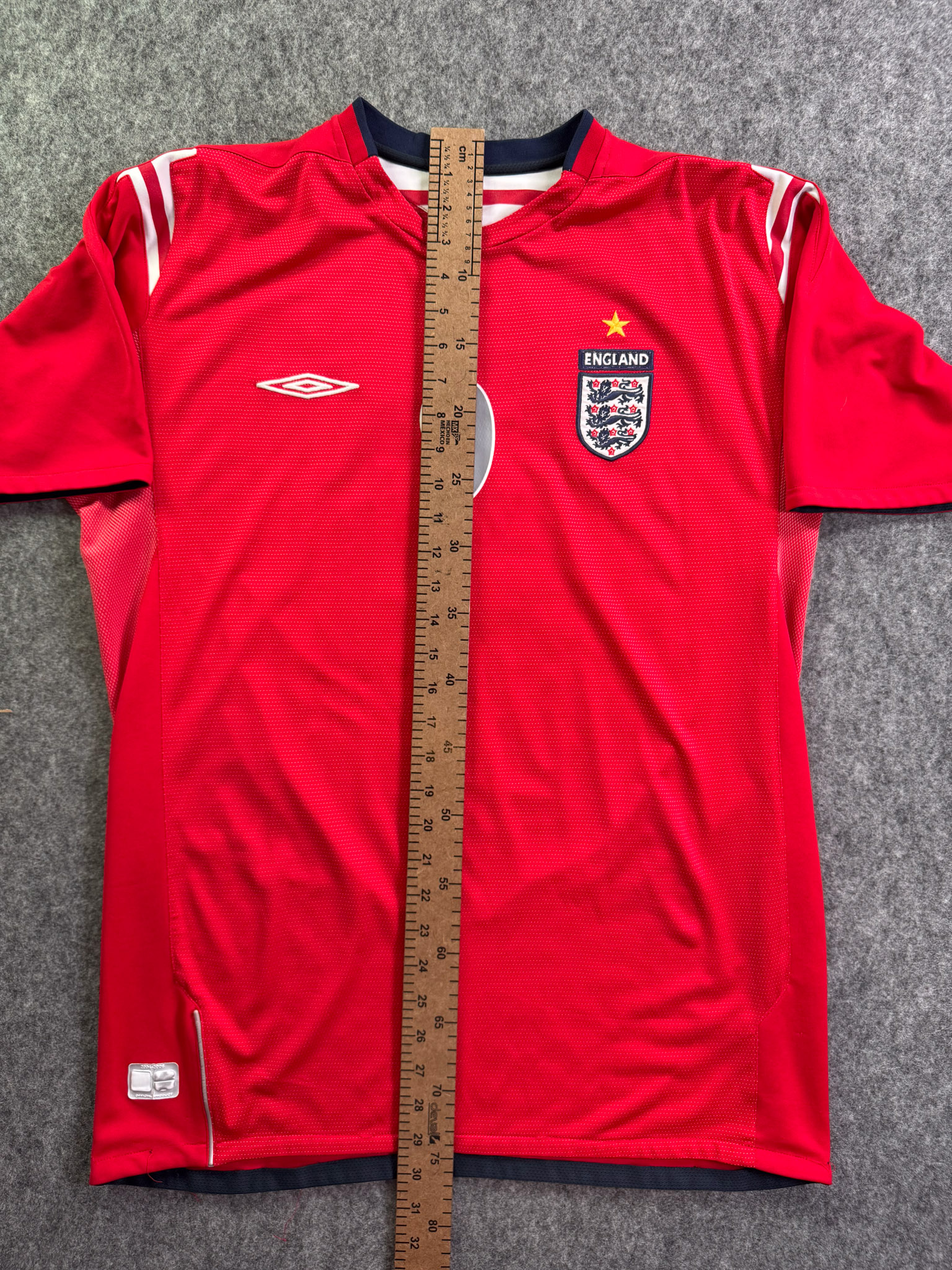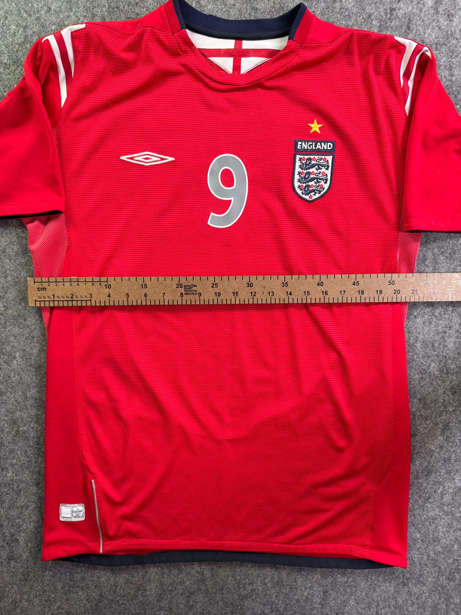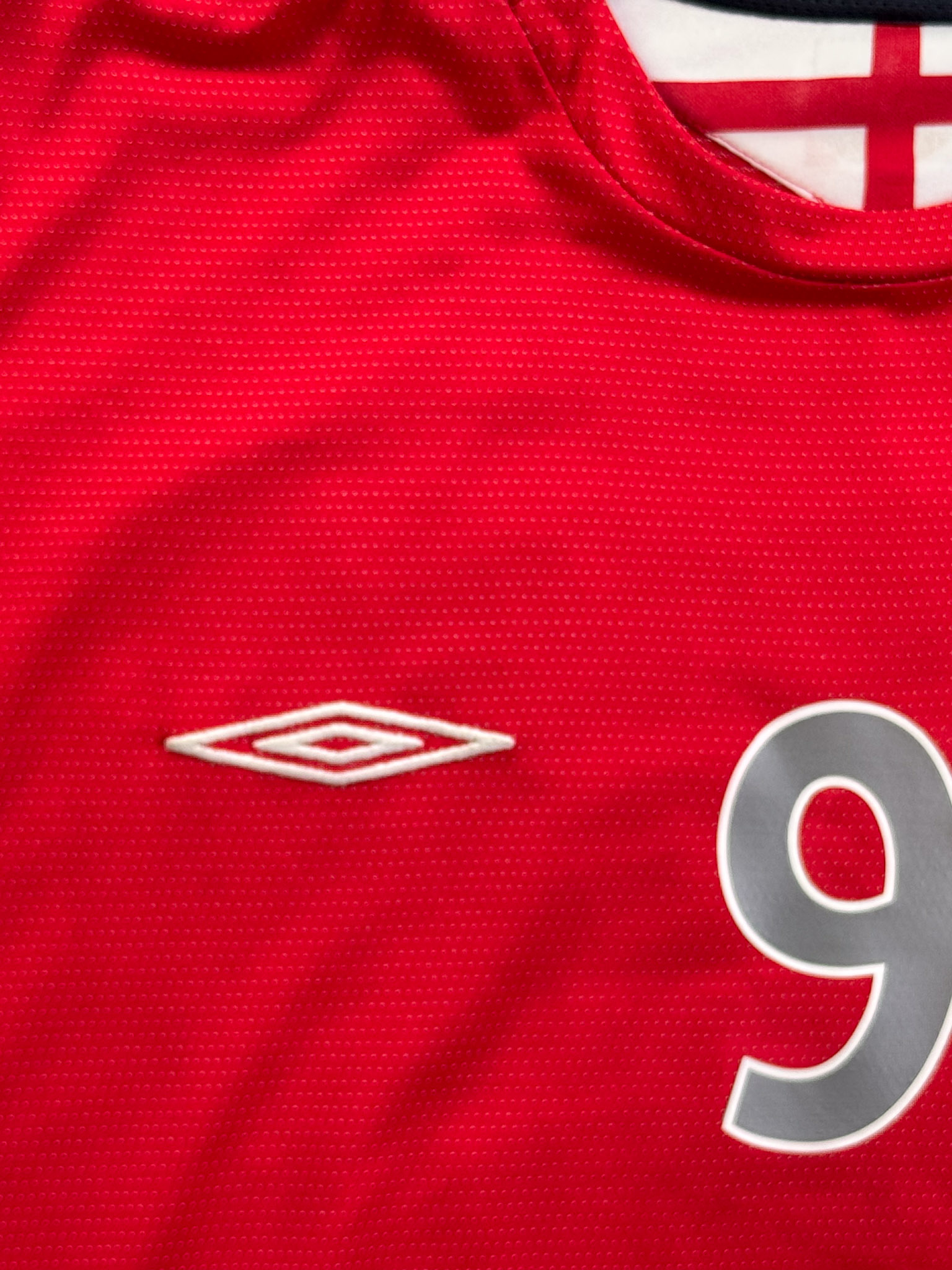 Jersey del Selección Inglaterra fabricado por Umbro, originario de Inglaterra. Se trata de la equipación Visita correspondiente a la temporada 04-06. Talla L, con dorsal ‘Rooney 9’ y en condición Buena. Detalles: Ligero desgaste en viniles por el paso del tiempo.