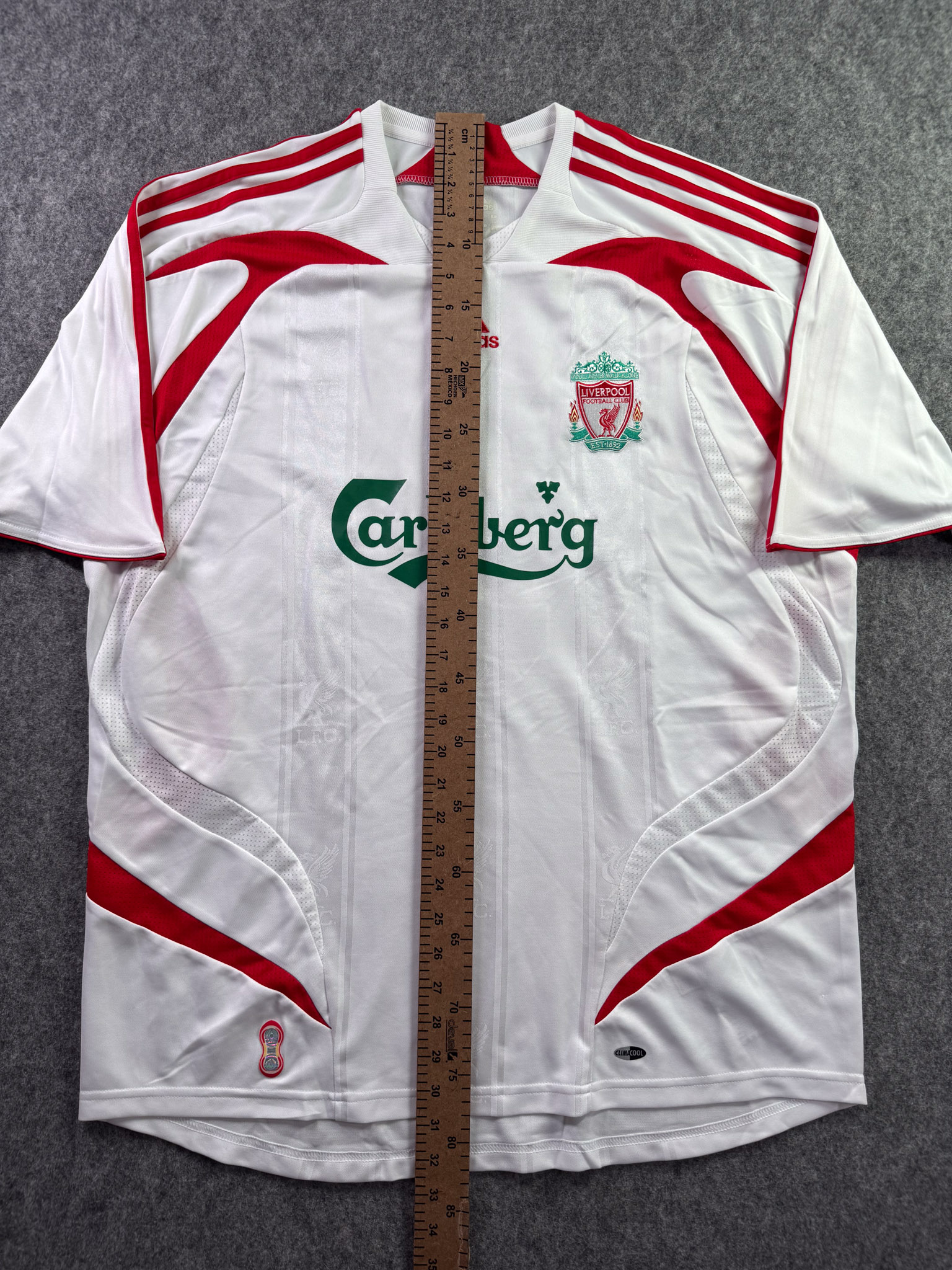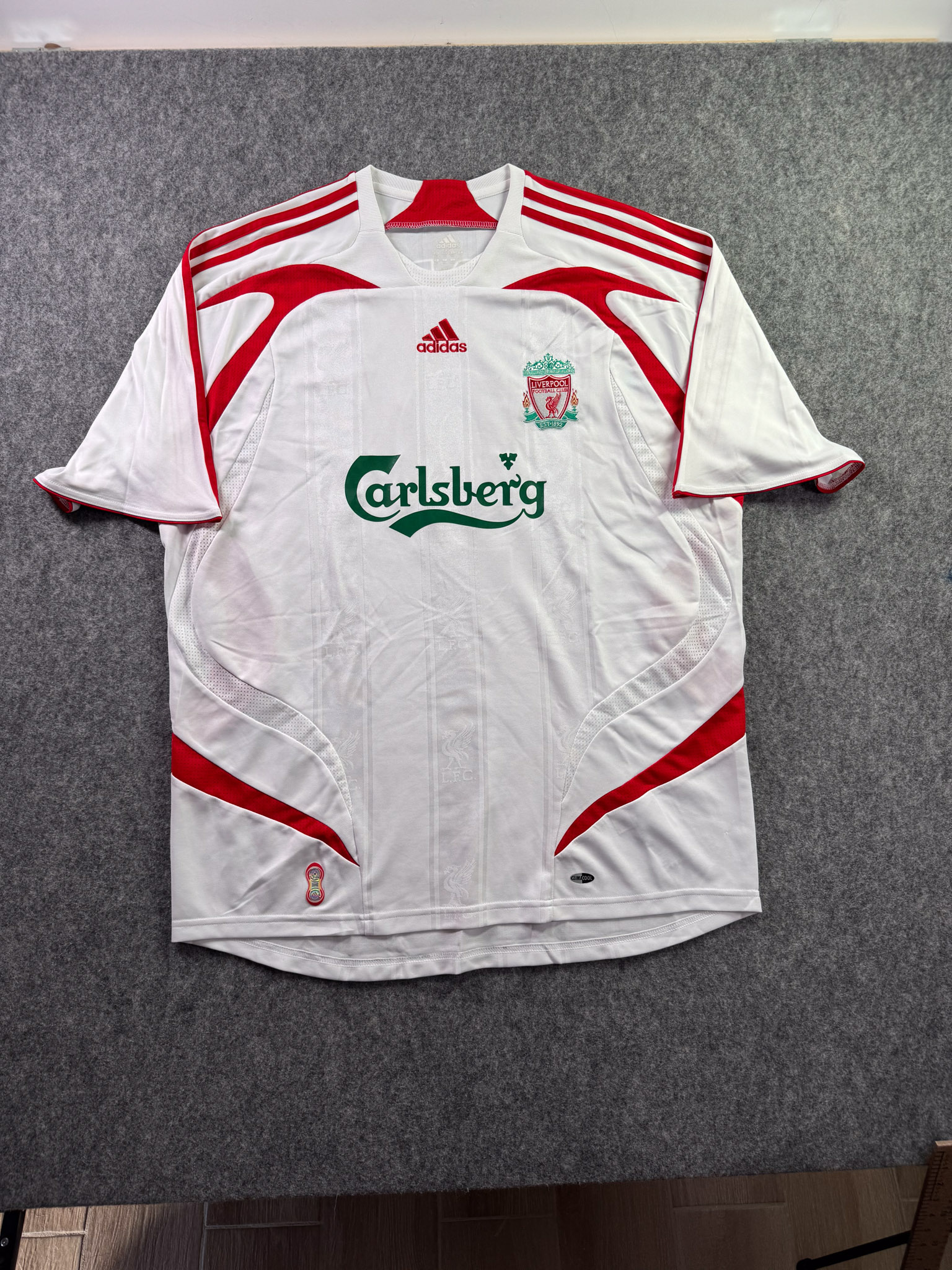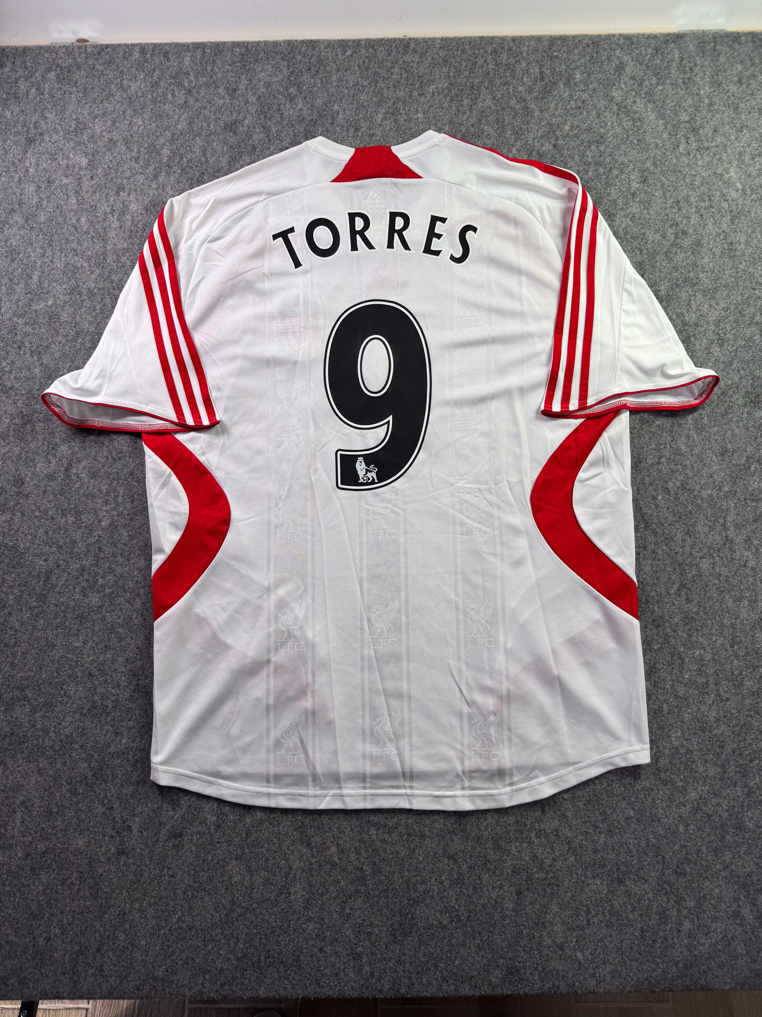 Jersey del Liverpool fabricado por Adidas, originario de Inglaterra. Se trata de la equipación Visita correspondiente a la temporada 06-07. Talla XL, con dorsal ‘Torres 9’ y en condición Excelente. Detalles: Ninguno.