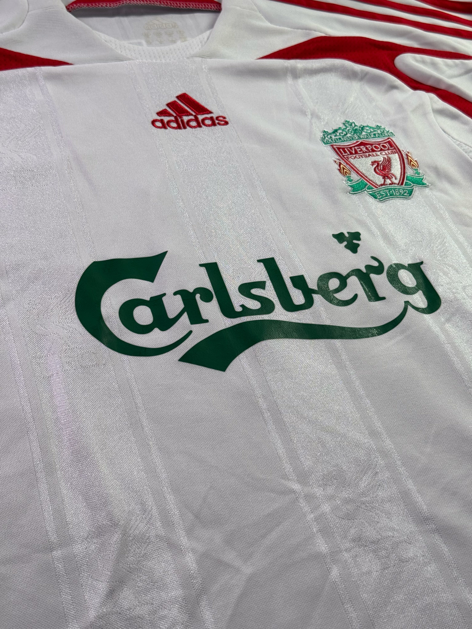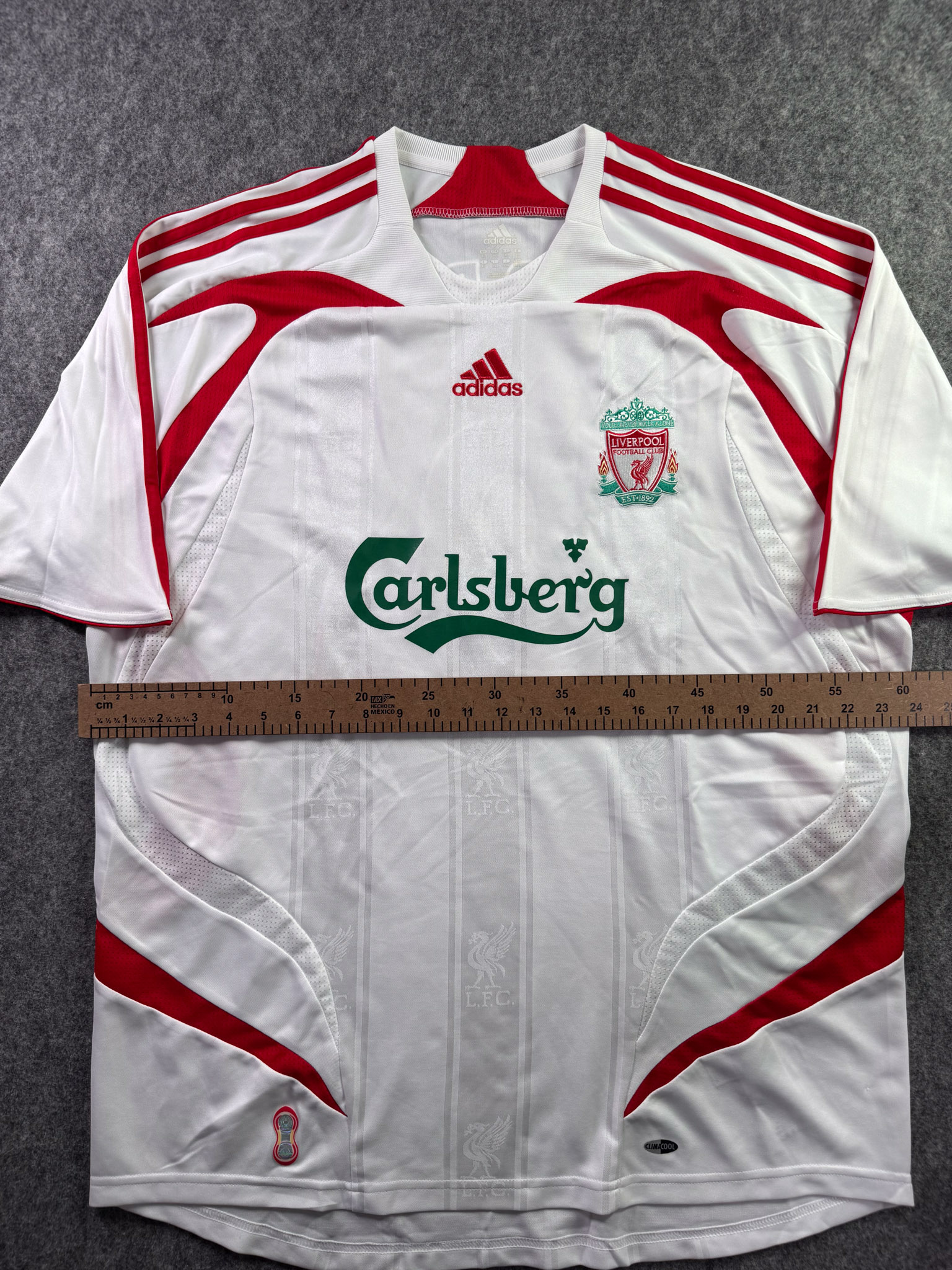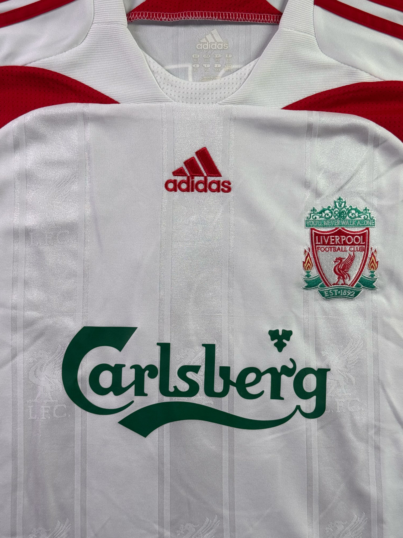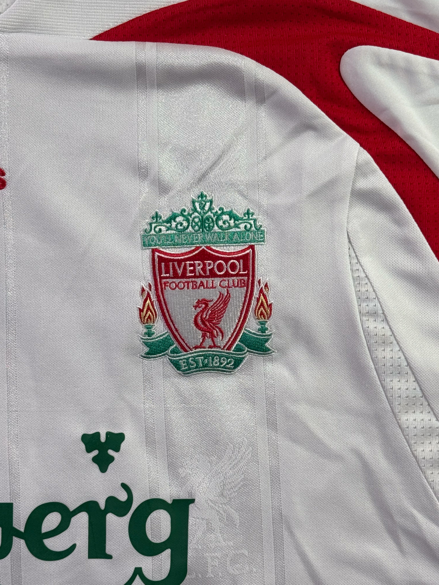 Jersey del Liverpool fabricado por Adidas, originario de Inglaterra. Se trata de la equipación Visita correspondiente a la temporada 06-07. Talla XL, con dorsal ‘Torres 9’ y en condición Excelente. Detalles: Ninguno.