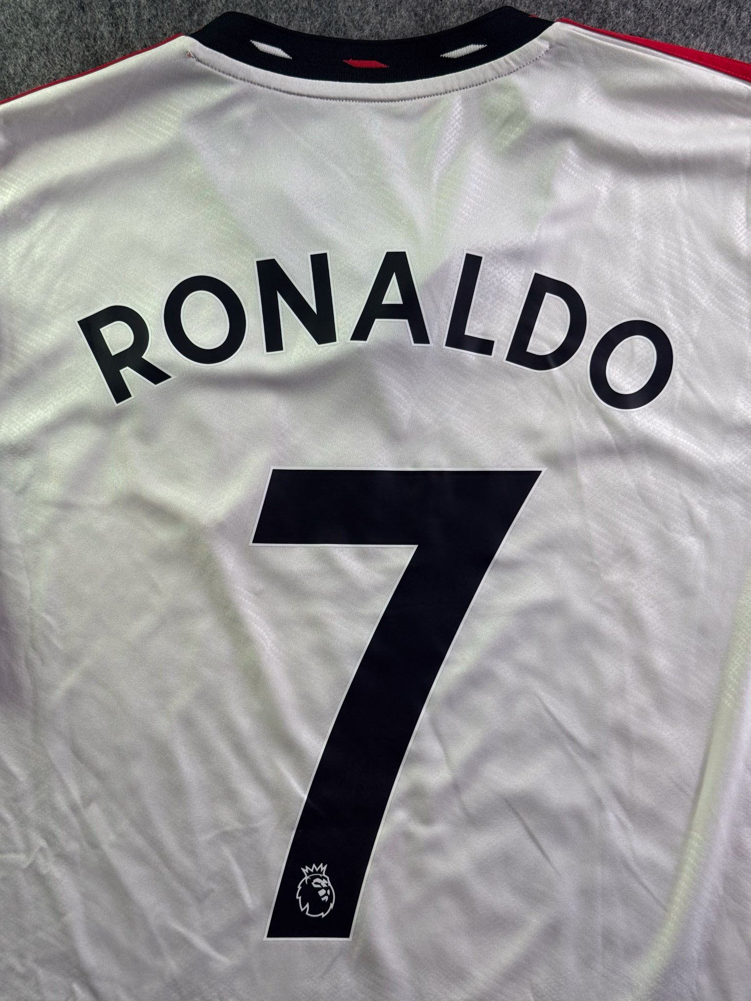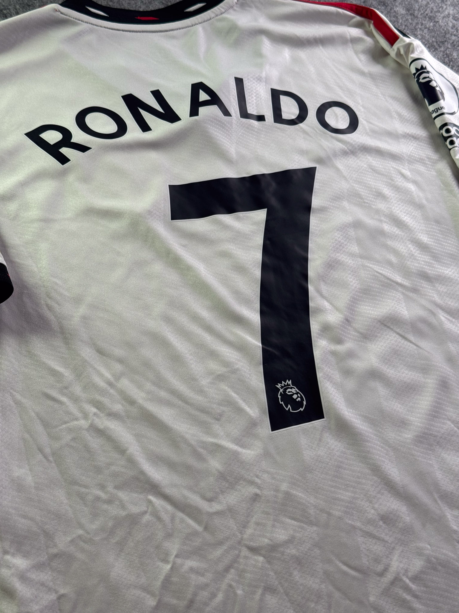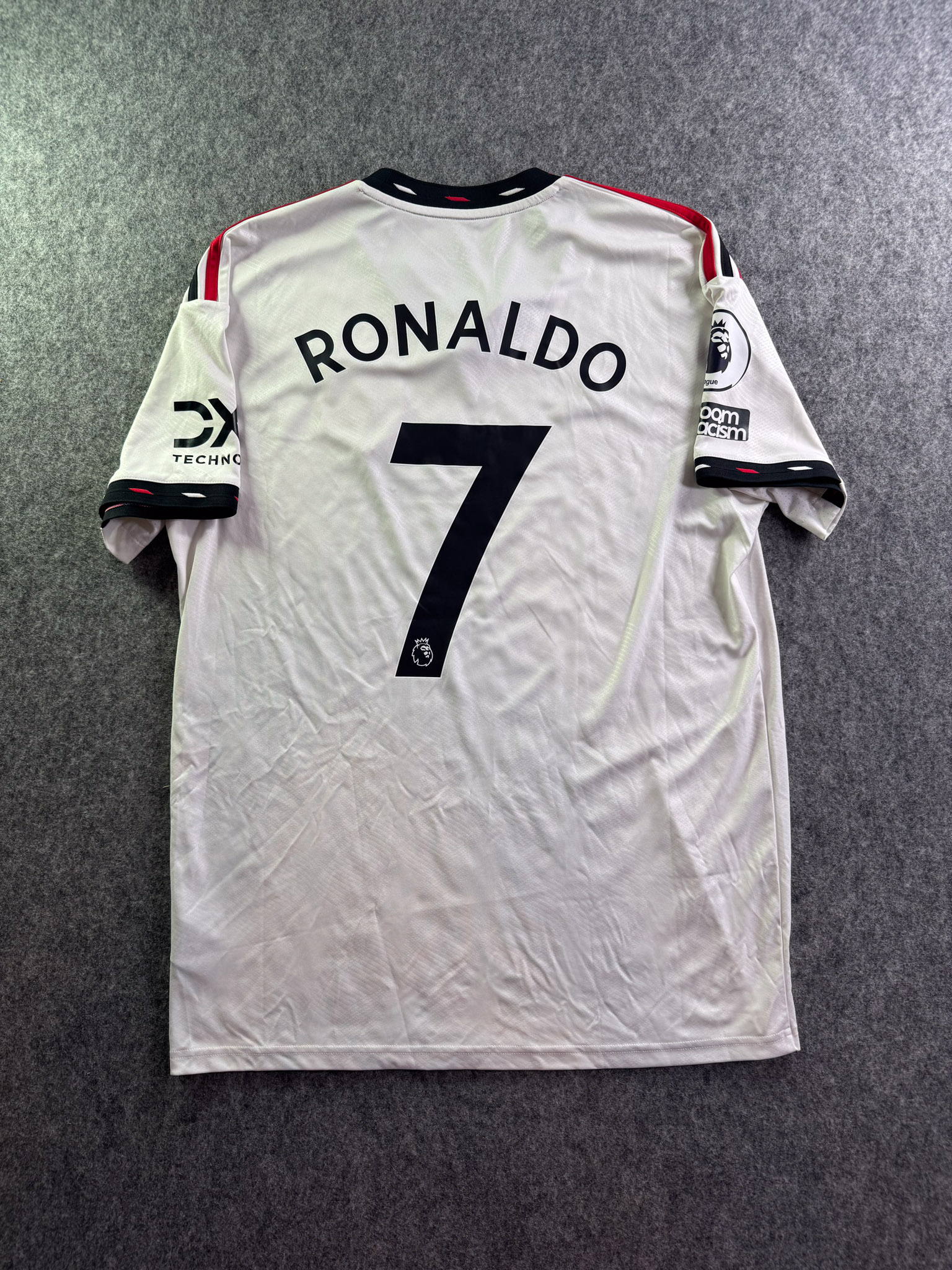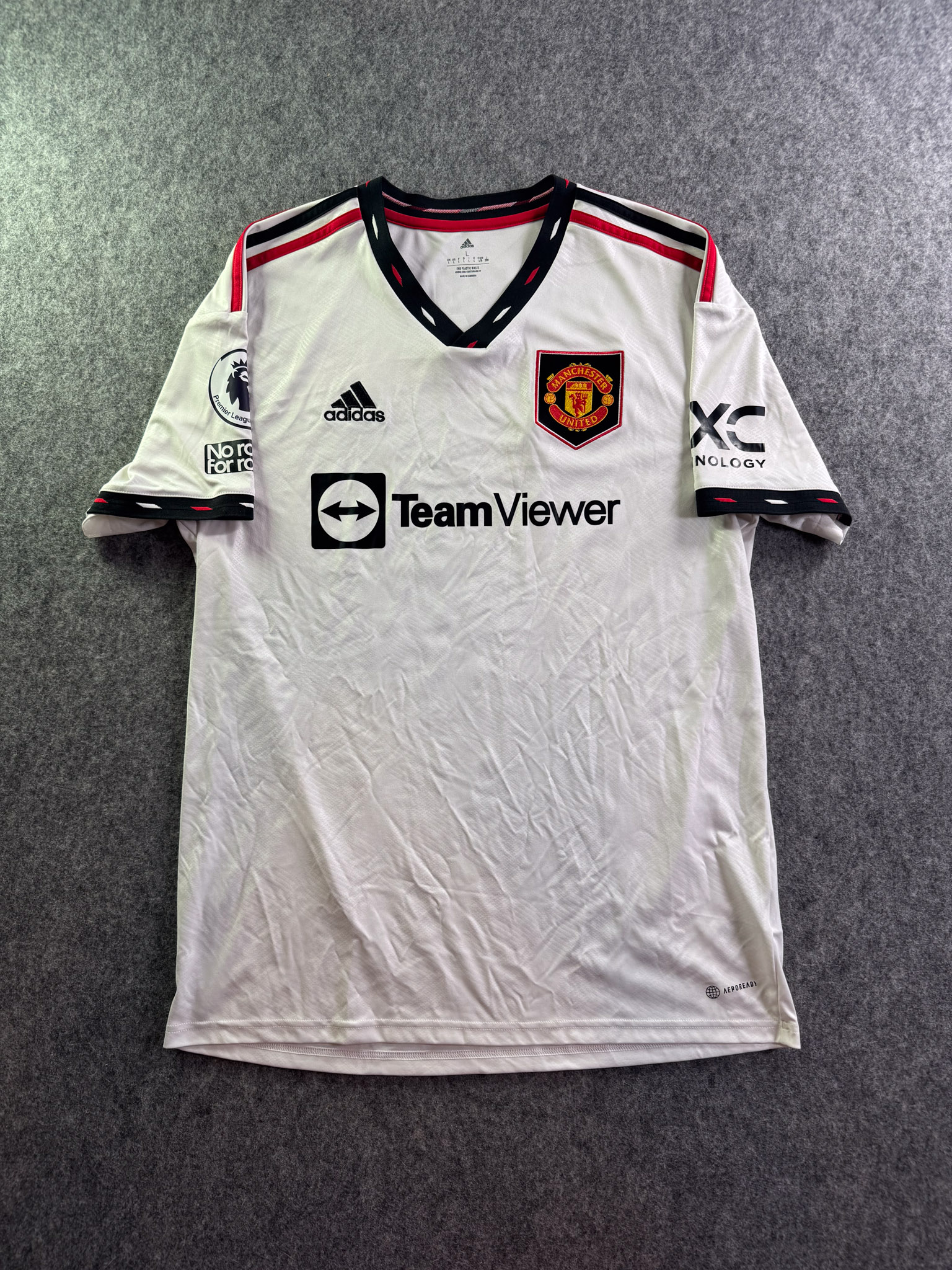 Jersey del Manchester United fabricado por Adidas, originario de Inglaterra. Se trata de la equipación Visita correspondiente a la temporada 22-23. Talla L, con dorsal ‘Ronaldo 7’ y en condición Excelente. Detalles: Parches Premier League.