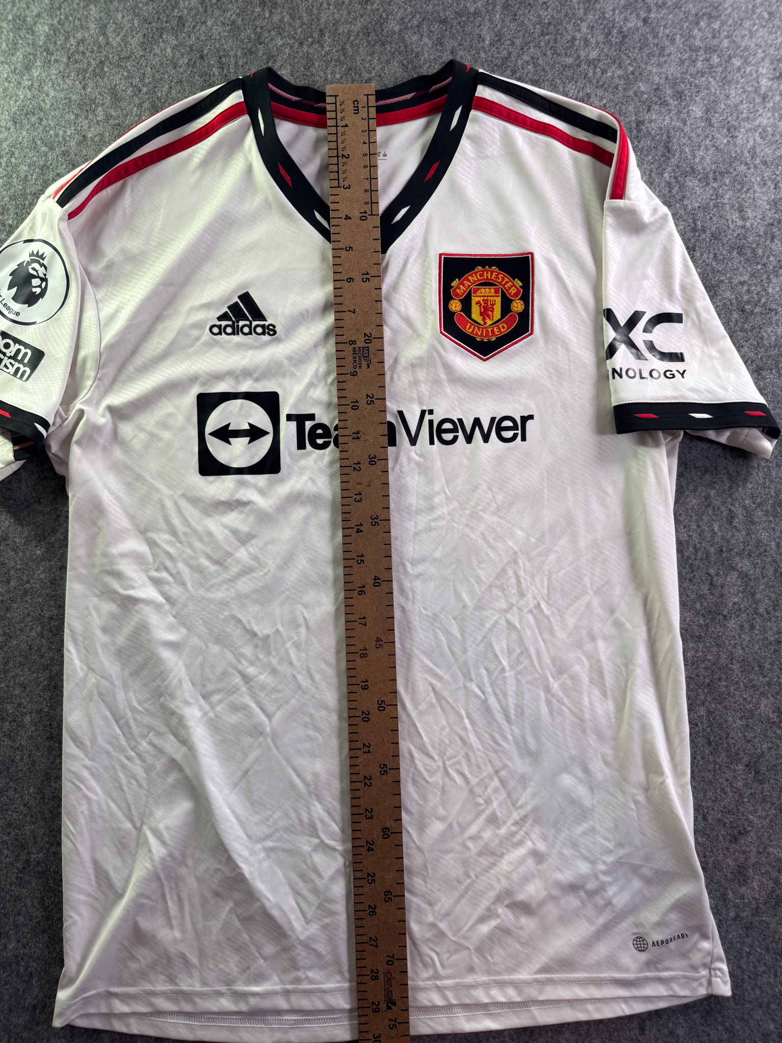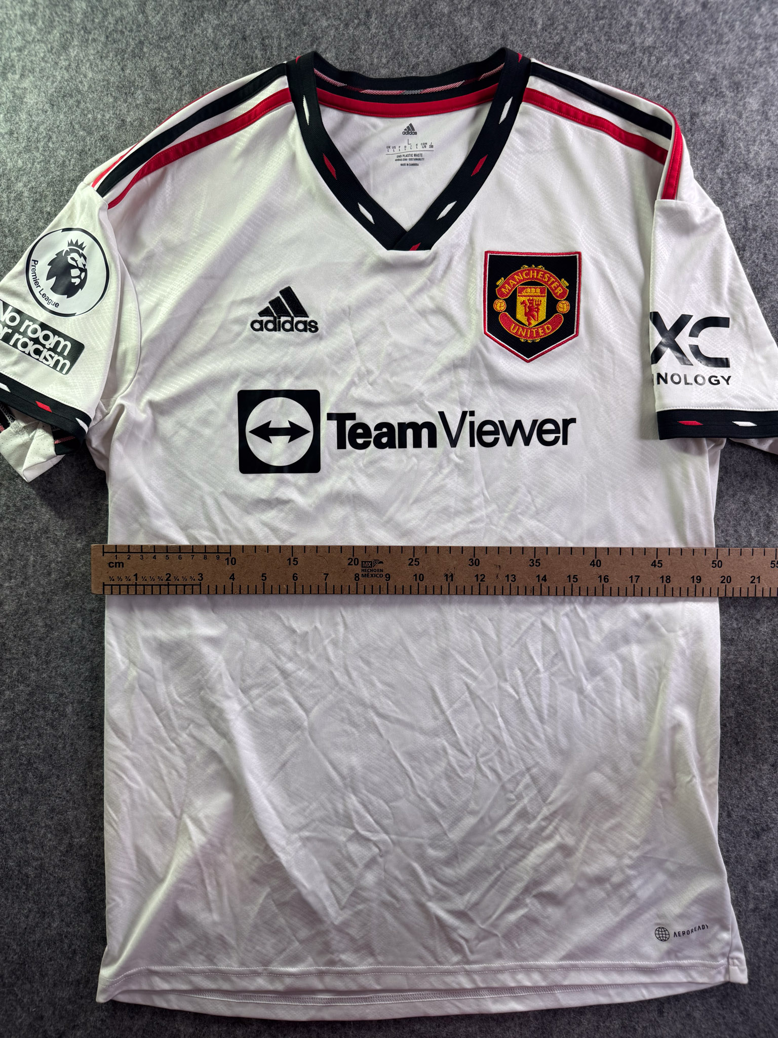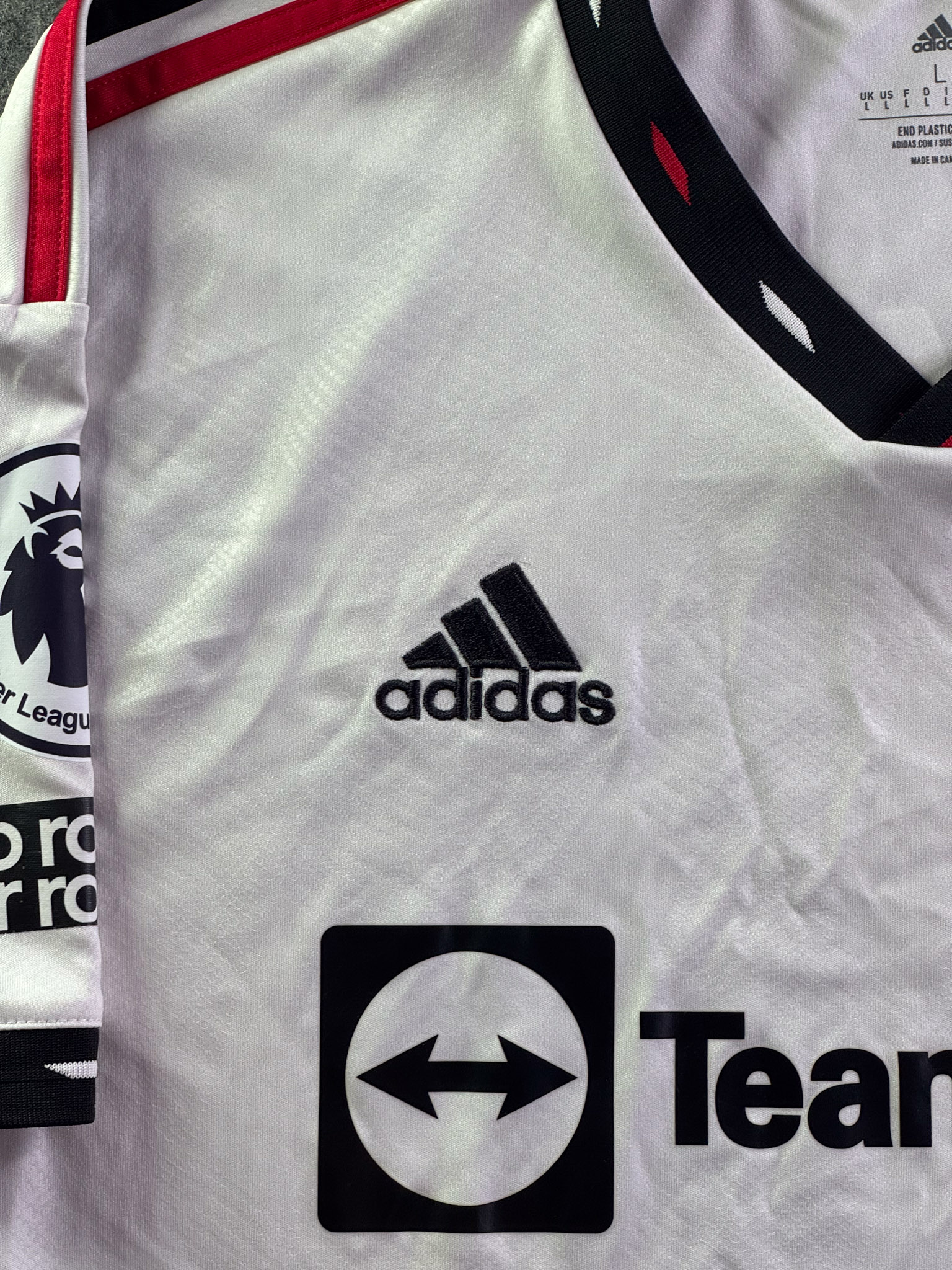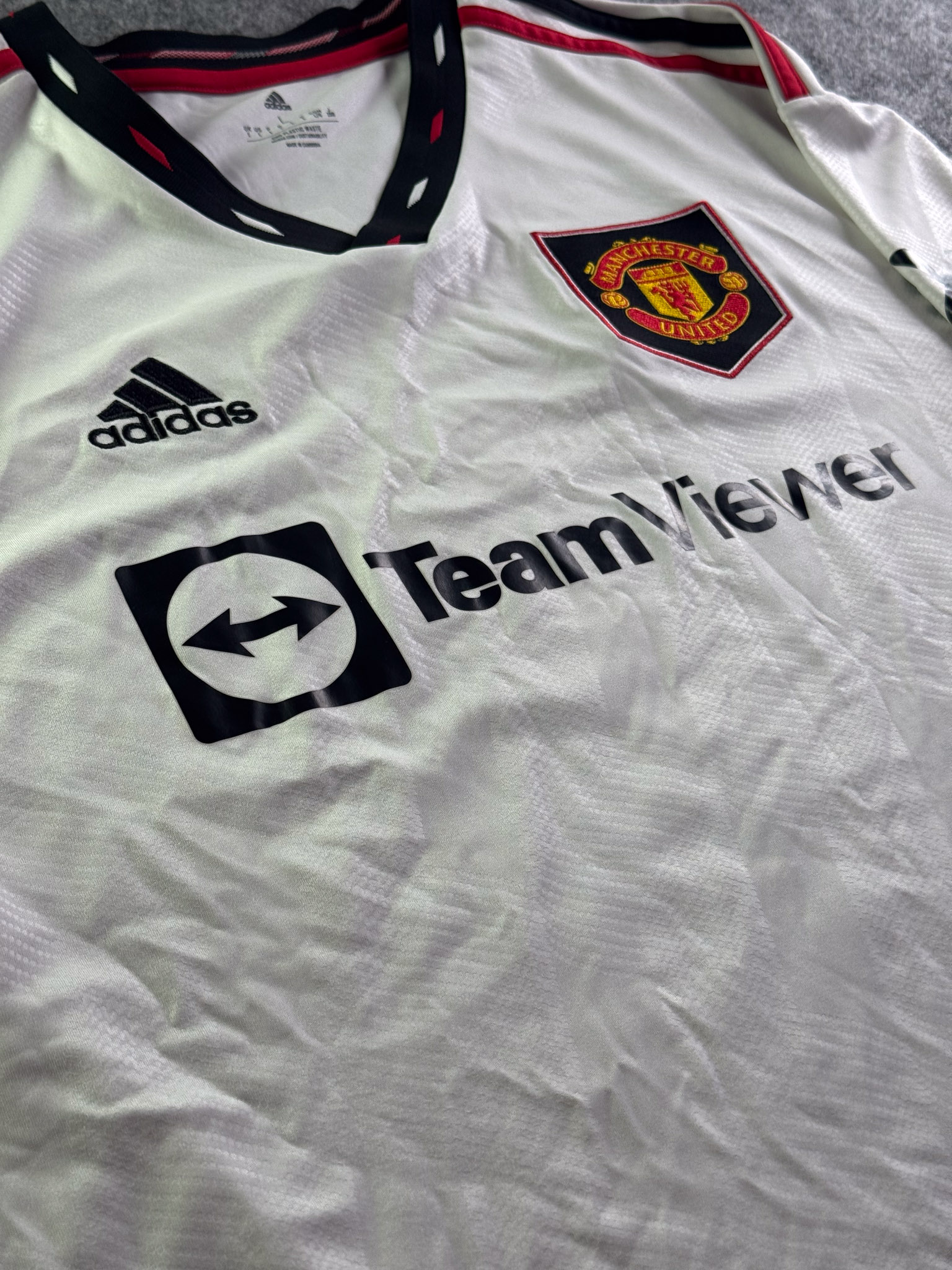 Jersey del Manchester United fabricado por Adidas, originario de Inglaterra. Se trata de la equipación Visita correspondiente a la temporada 22-23. Talla L, con dorsal ‘Ronaldo 7’ y en condición Excelente. Detalles: Parches Premier League.