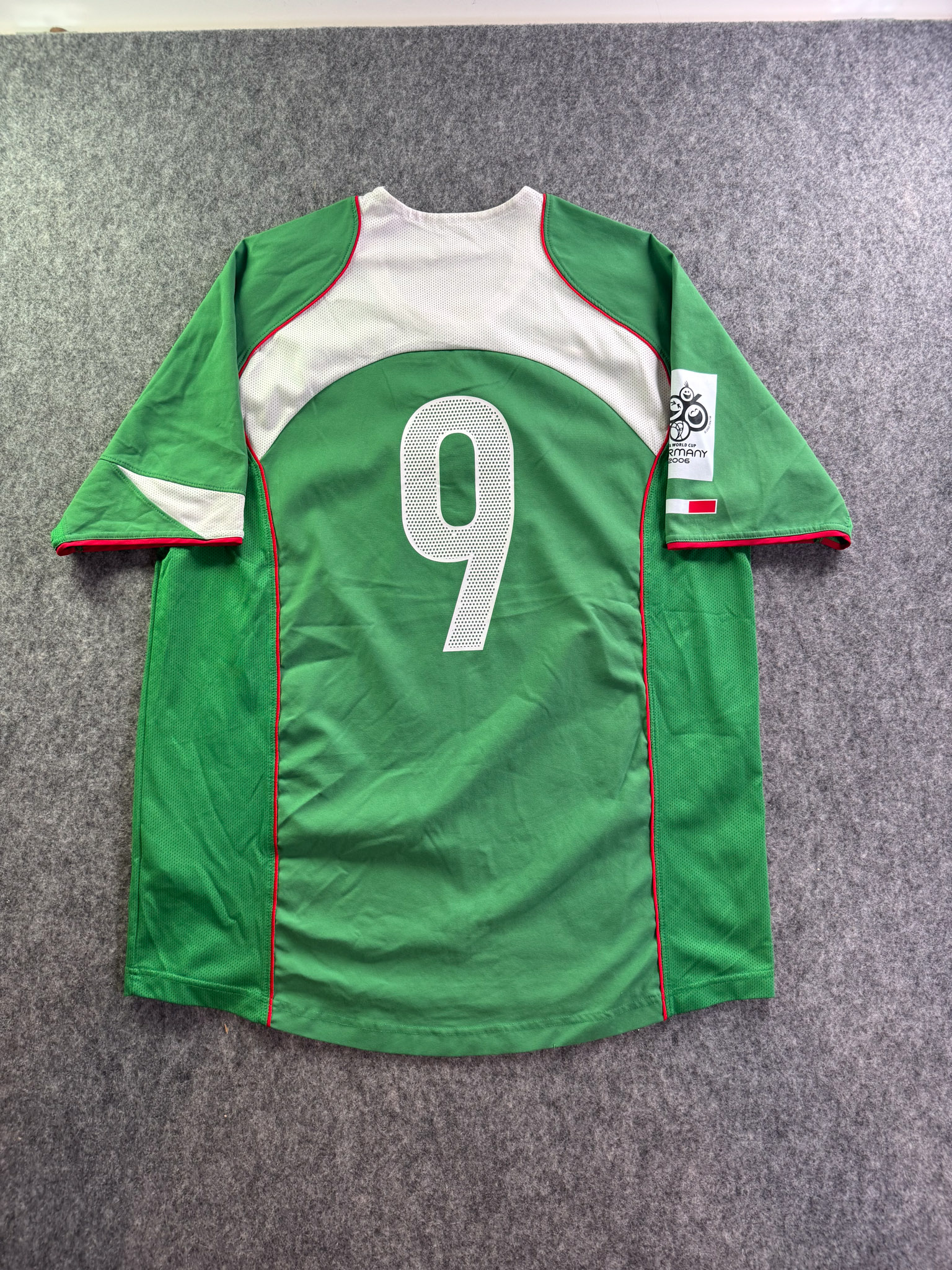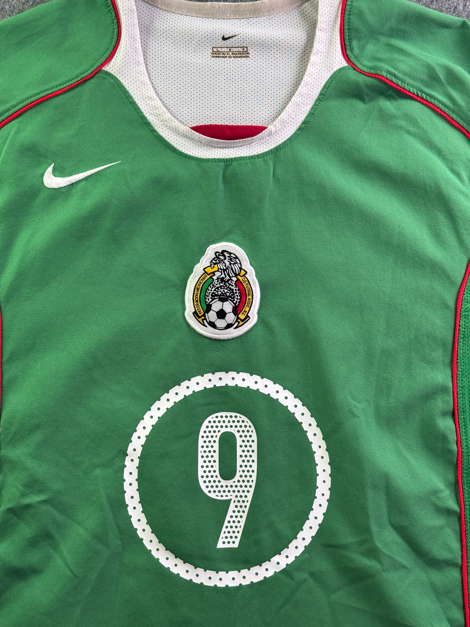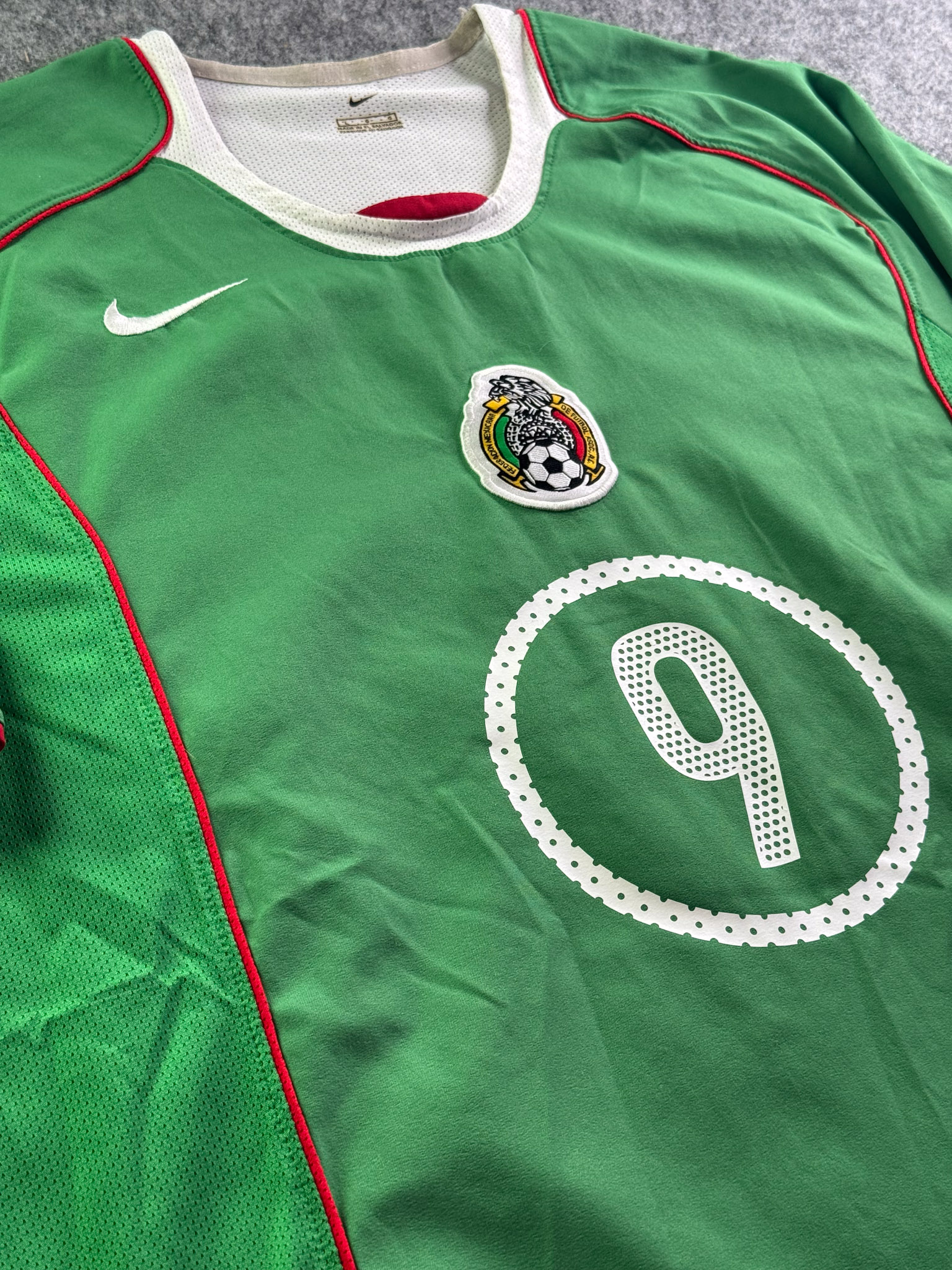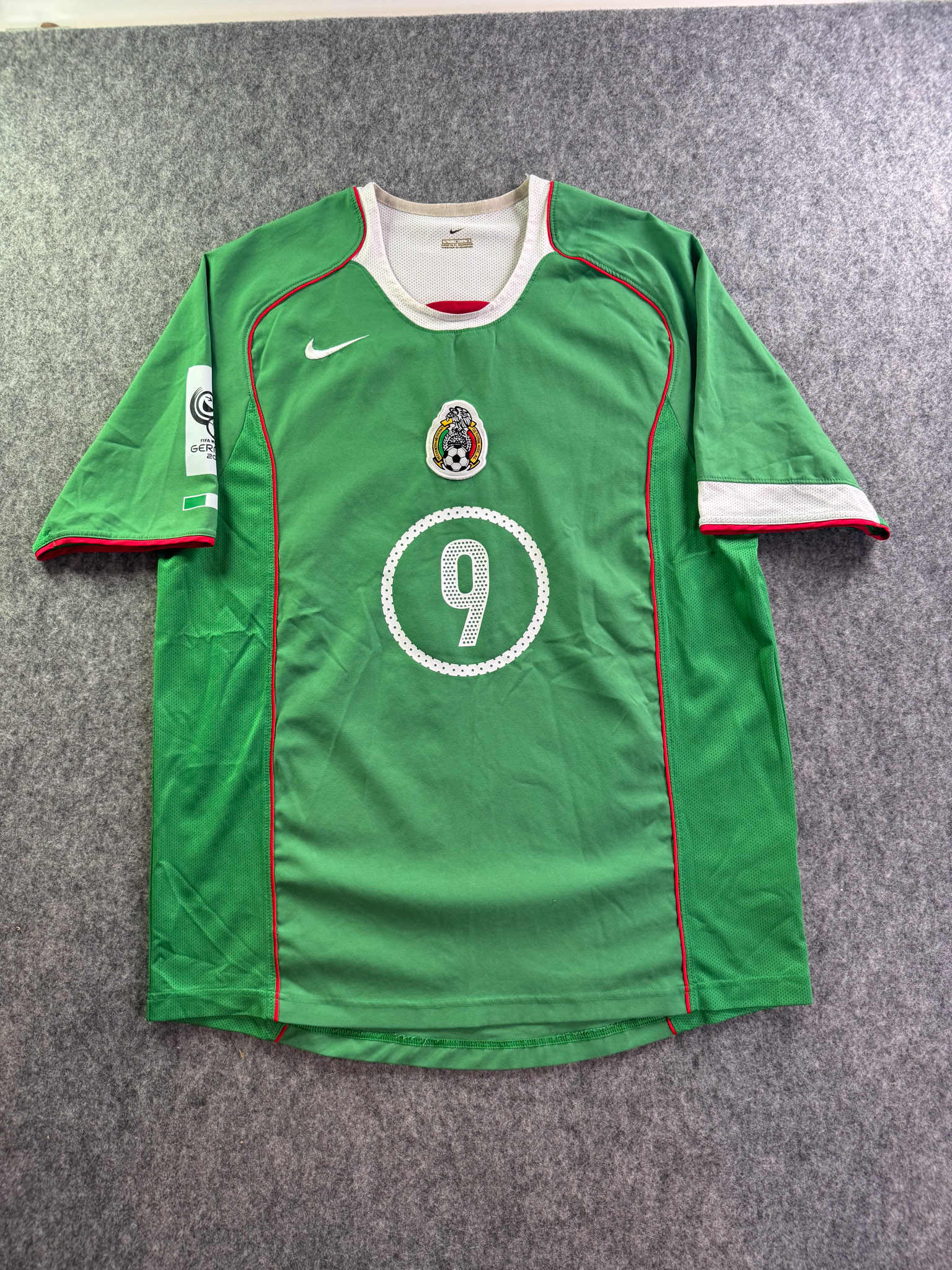 Jersey del Selección Mexico fabricado por Nike, originario de México. Se trata de la equipación Local correspondiente a la temporada 2005. Talla L, con dorsal ‘9’ y en condición Excelente. Detalles: Parche eliminatorio al Mundial .