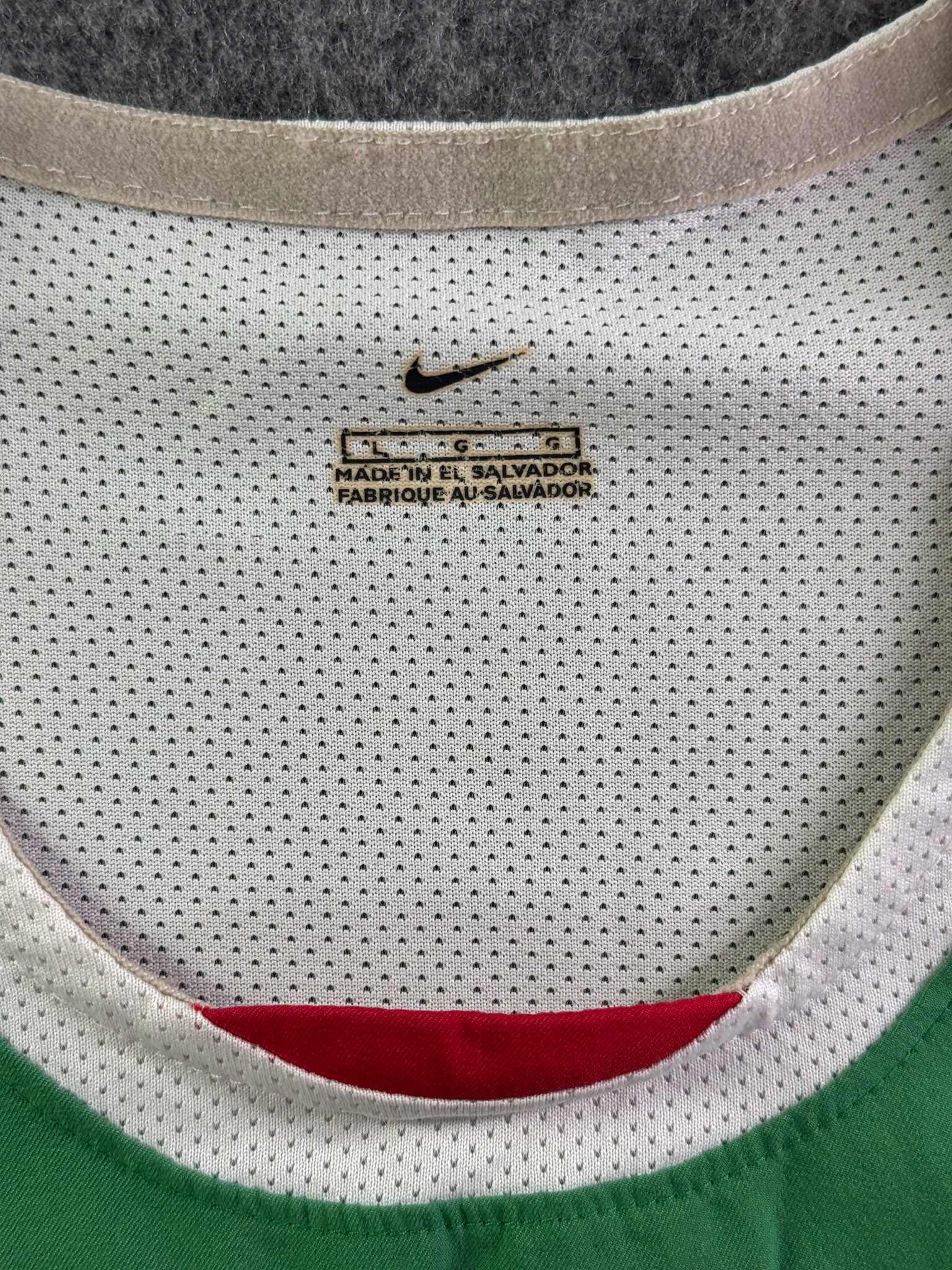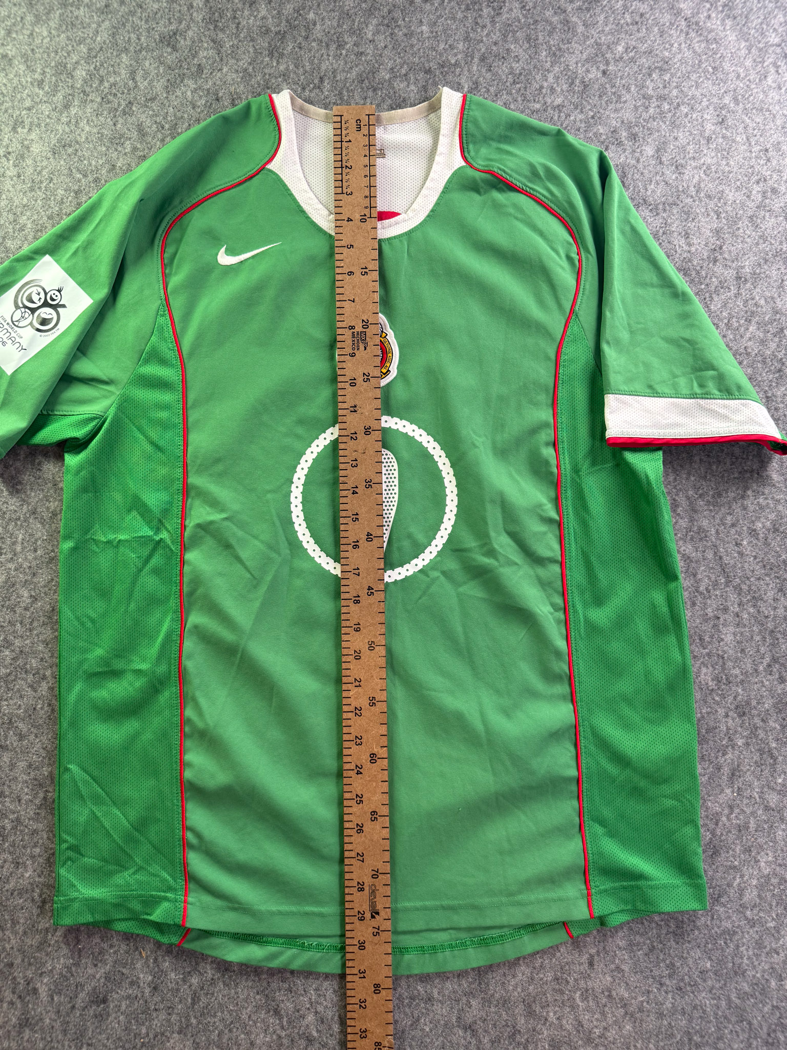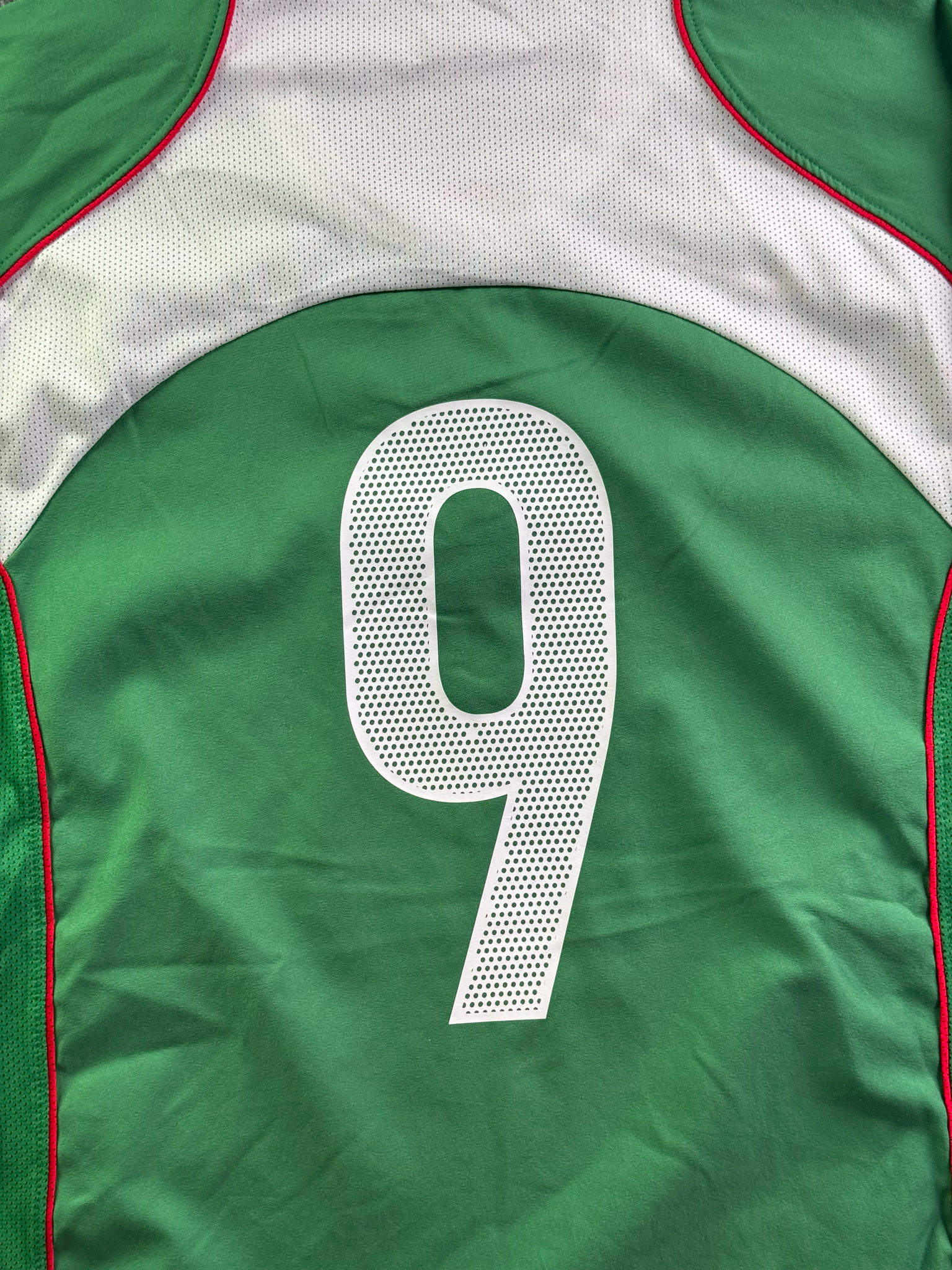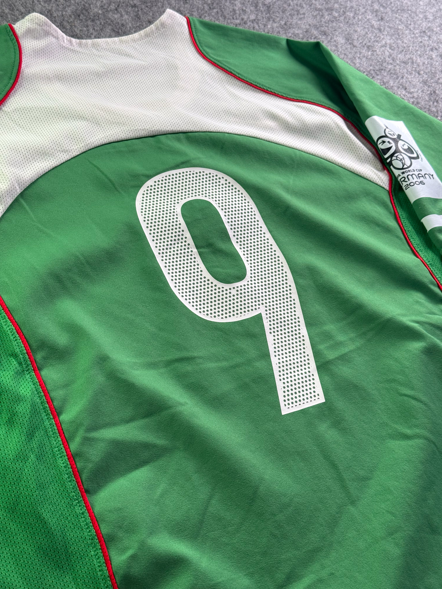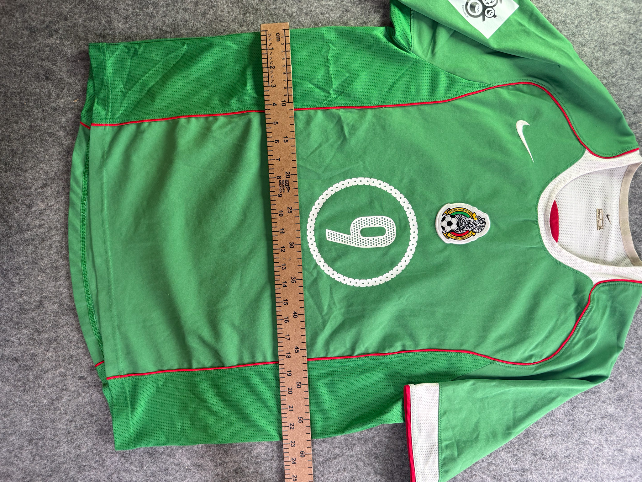 Jersey del Selección Mexico fabricado por Nike, originario de México. Se trata de la equipación Local correspondiente a la temporada 2005. Talla L, con dorsal ‘9’ y en condición Excelente. Detalles: Parche eliminatorio al Mundial .