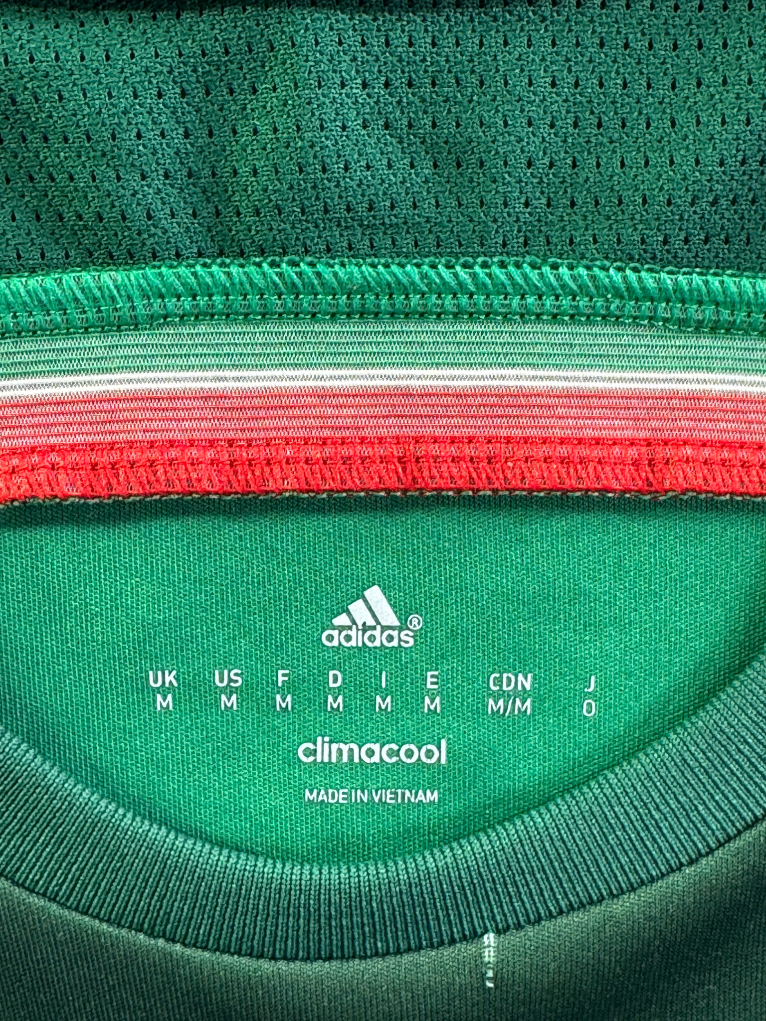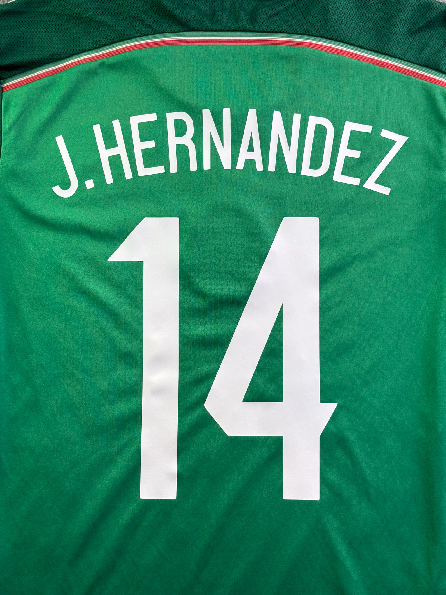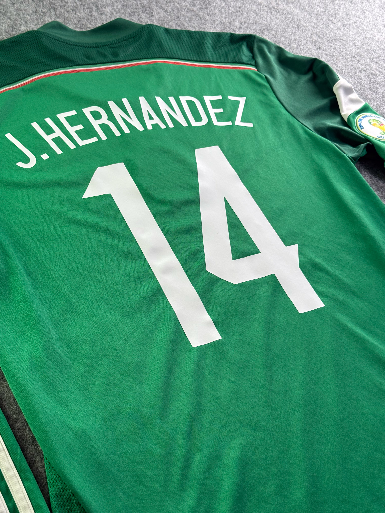 Jersey del Selección México fabricado por Adidas, originario de México. Se trata de la equipación Local correspondiente a la temporada 2014. Talla M, con dorsal ‘J. Hernández 14’ y en condición Muy Buena. Detalles: Algunos hilos jalados, Parches Eliminatoria rumbo al Mundial.