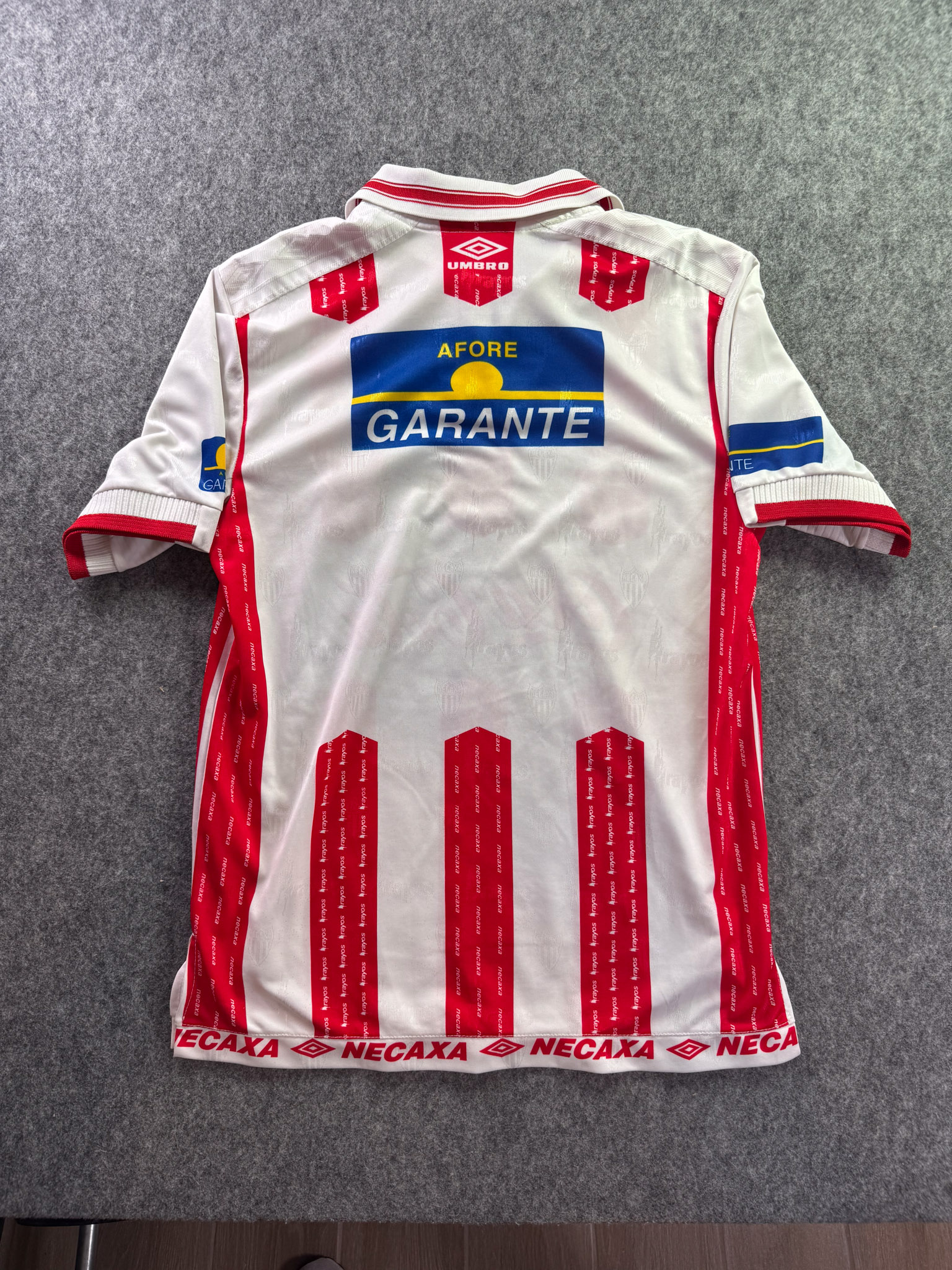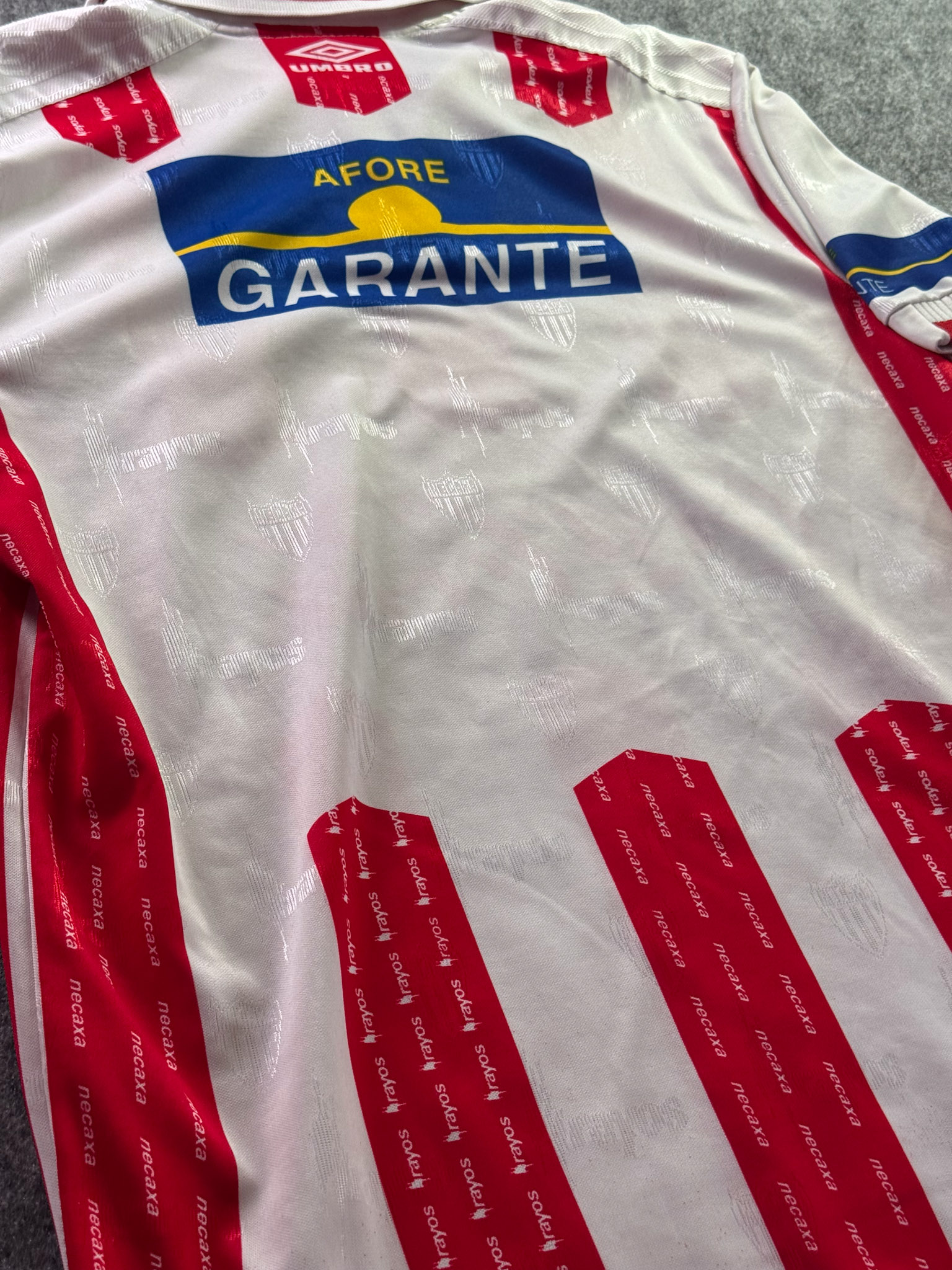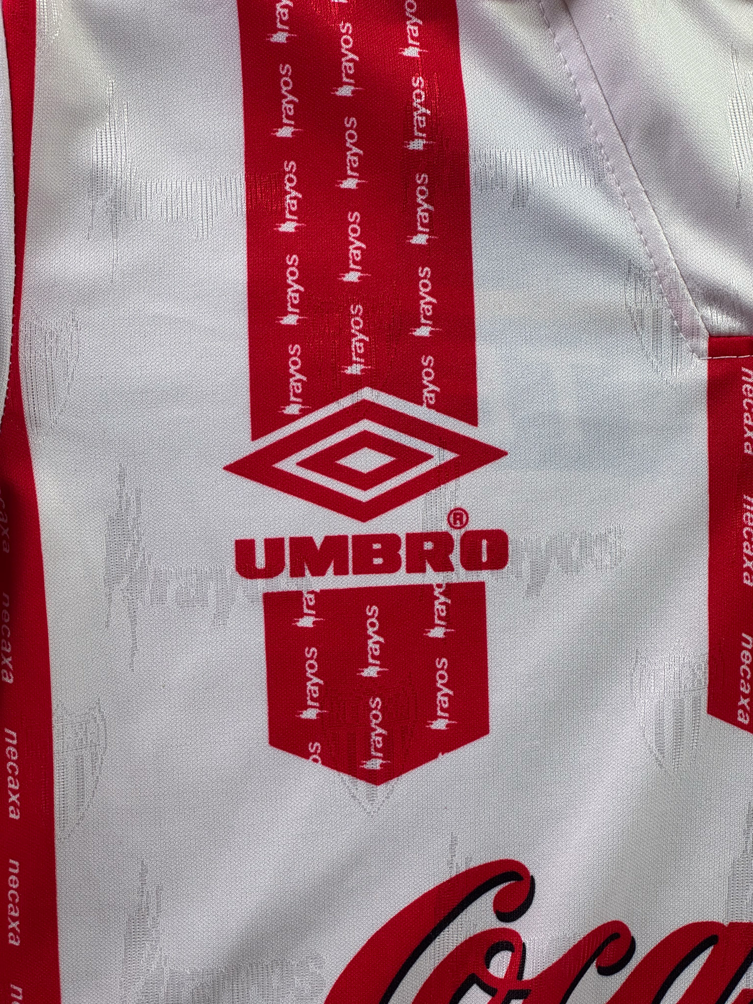 Jersey del Necaxa fabricado por Umbro, originario de México. Se trata de la equipación Local correspondiente a la temporada 99-00. Talla L, con dorsal ‘No’ y en condición Excelente. Detalles: Ninguna.