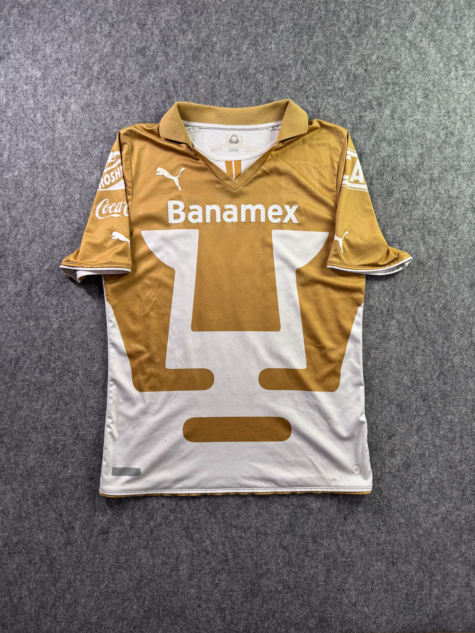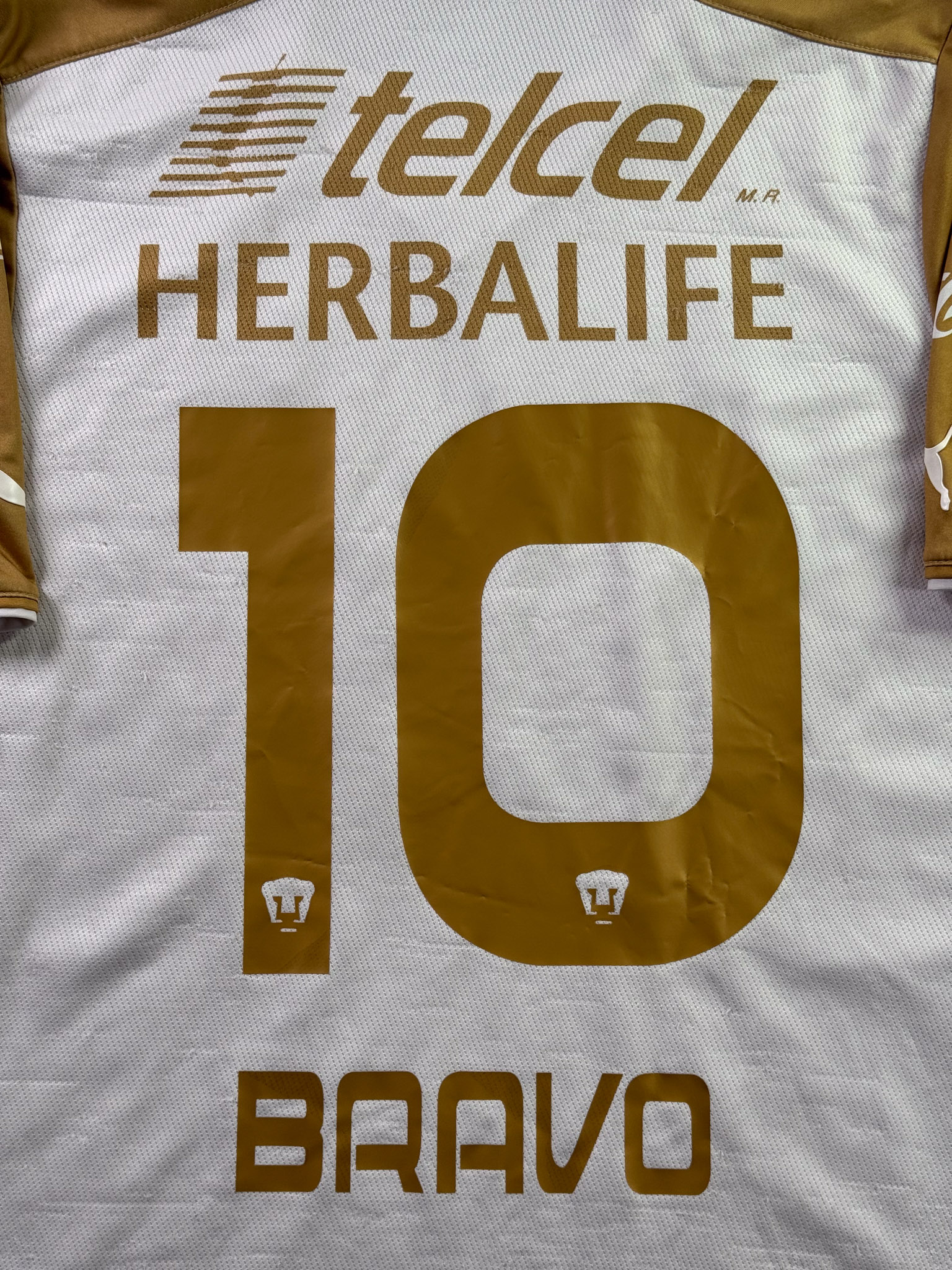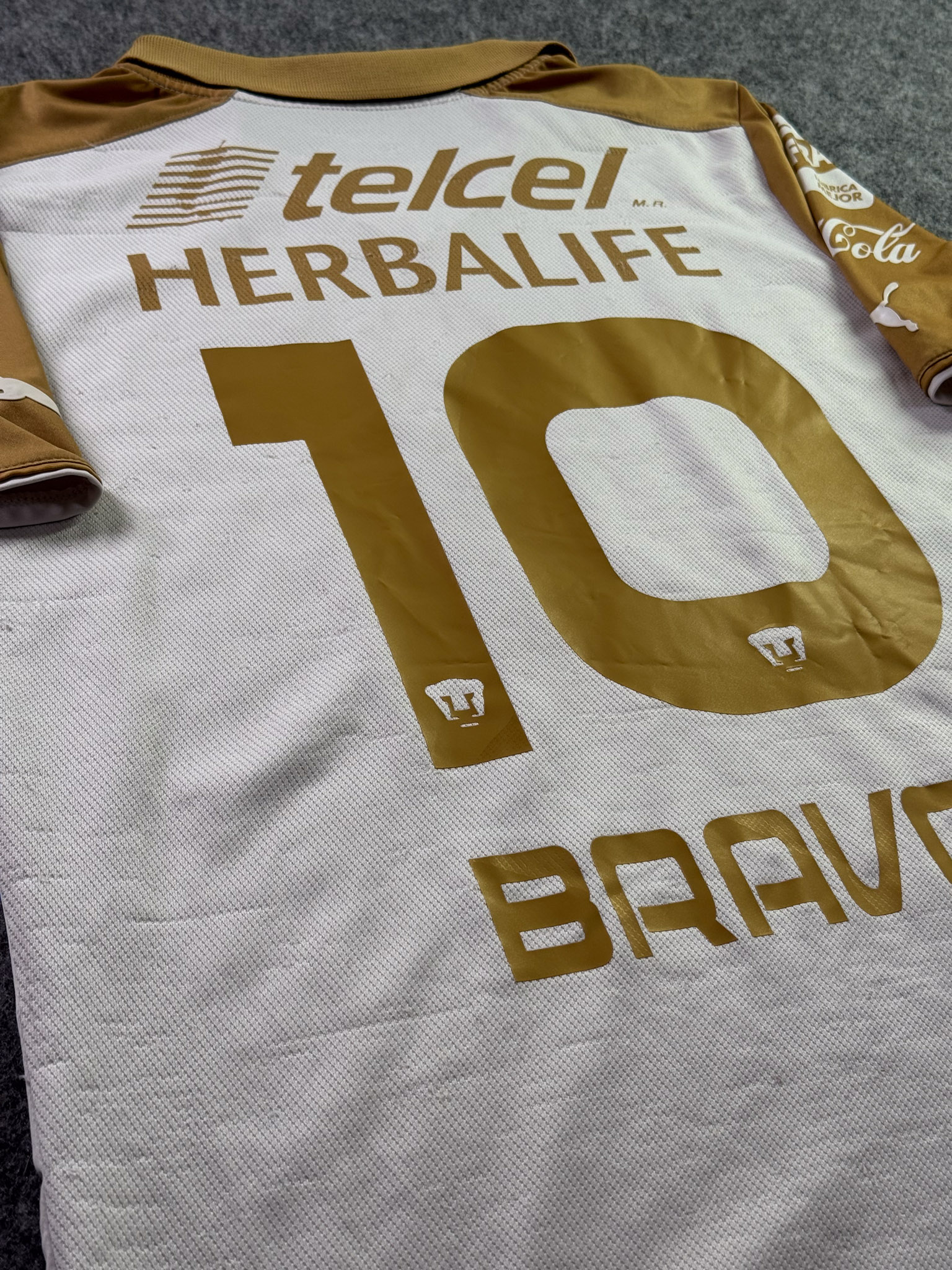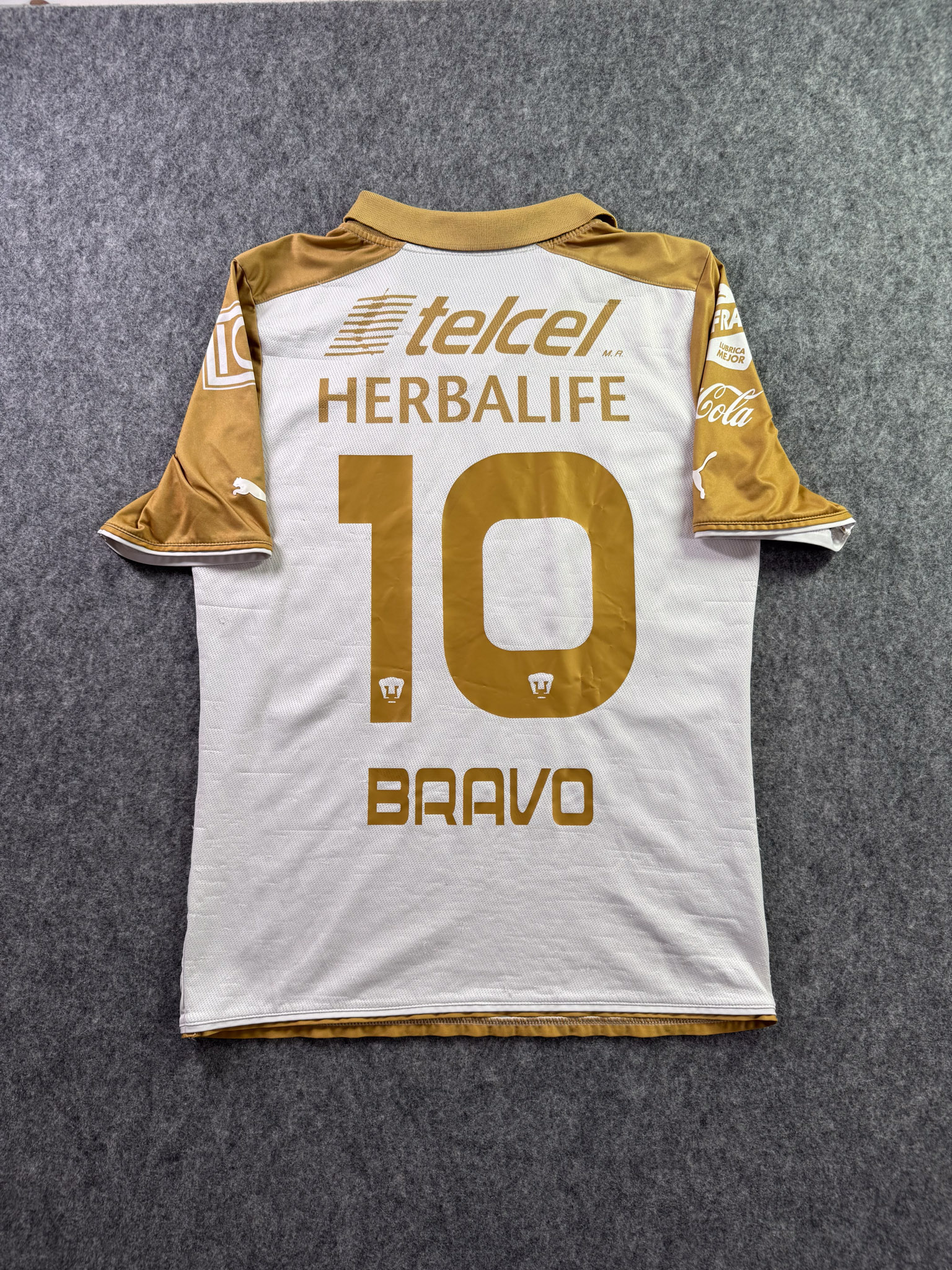 Jersey del Pumas fabricado por Puma, originario de México. Se trata de la equipación Local correspondiente a la temporada 13-14. Talla M, con dorsal ‘Bravo 10’ y en condición Buena. Detalles: Hilos jalados en la parte trasera, ligeras manchas en al tela.