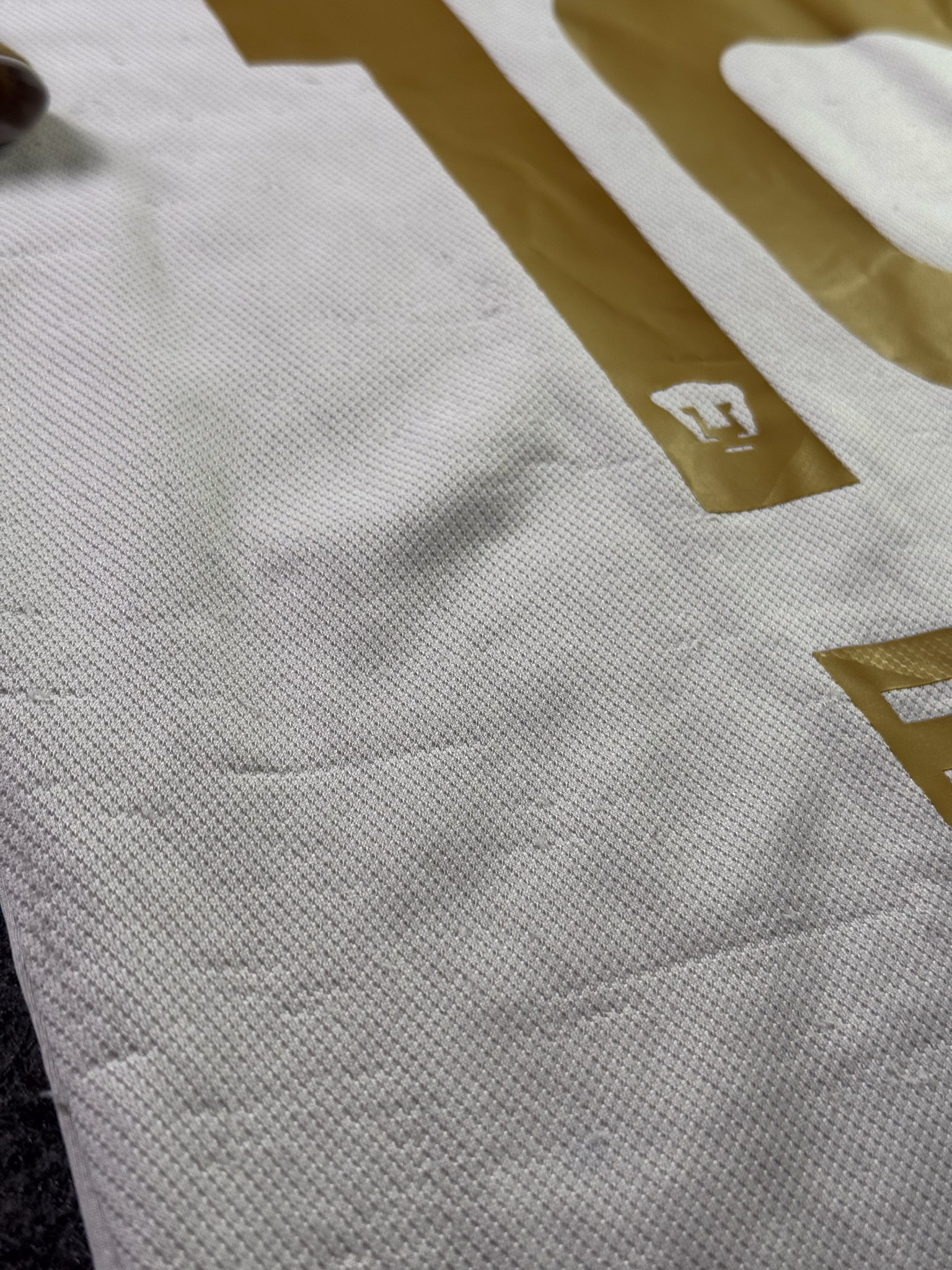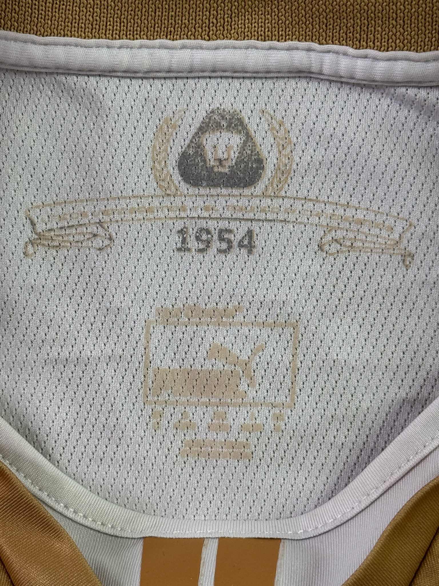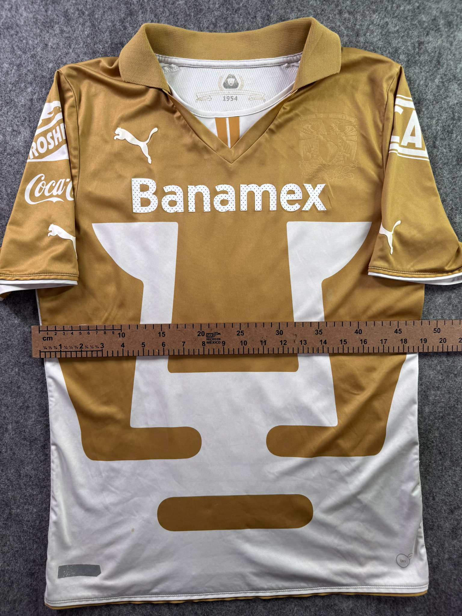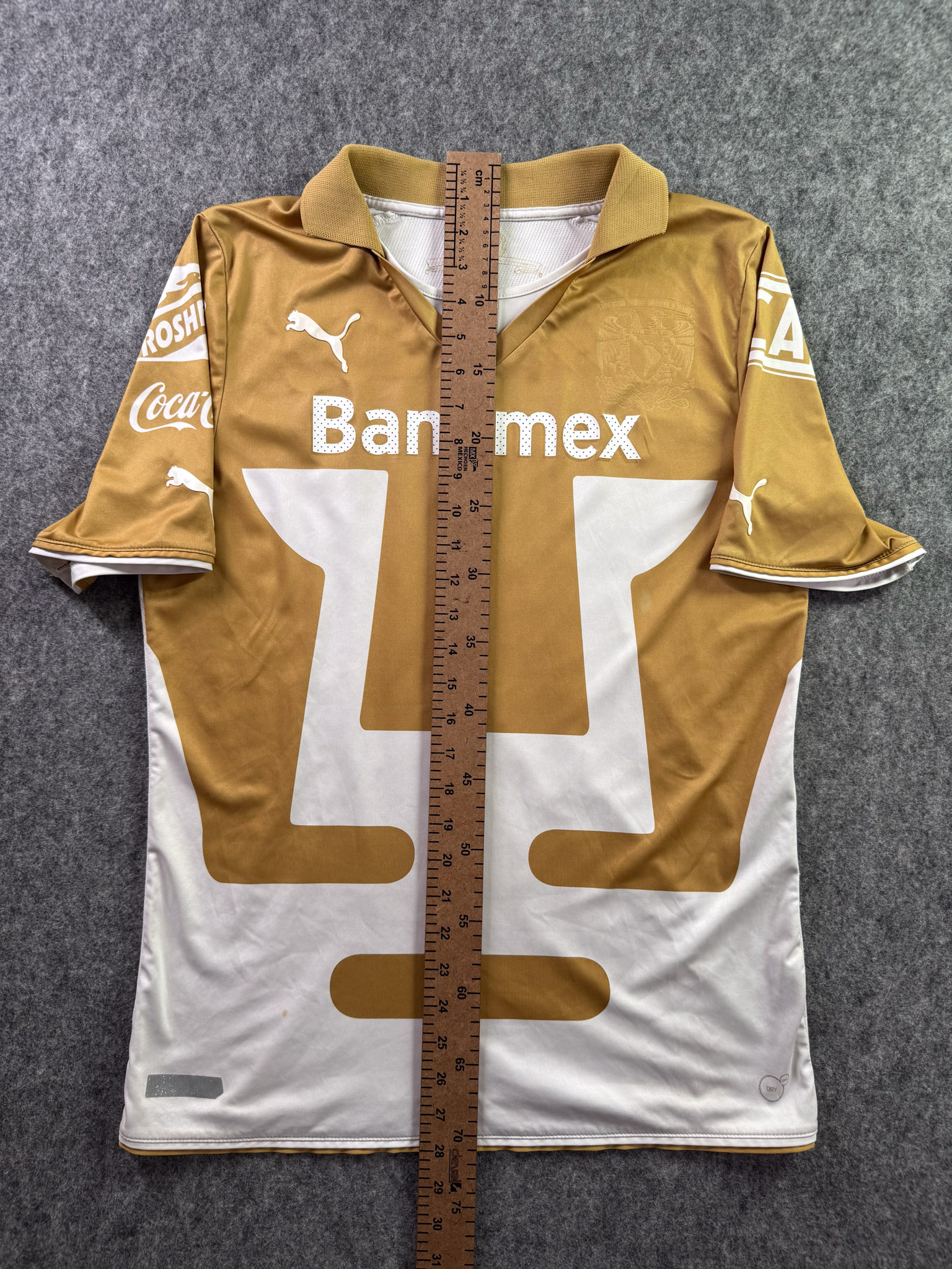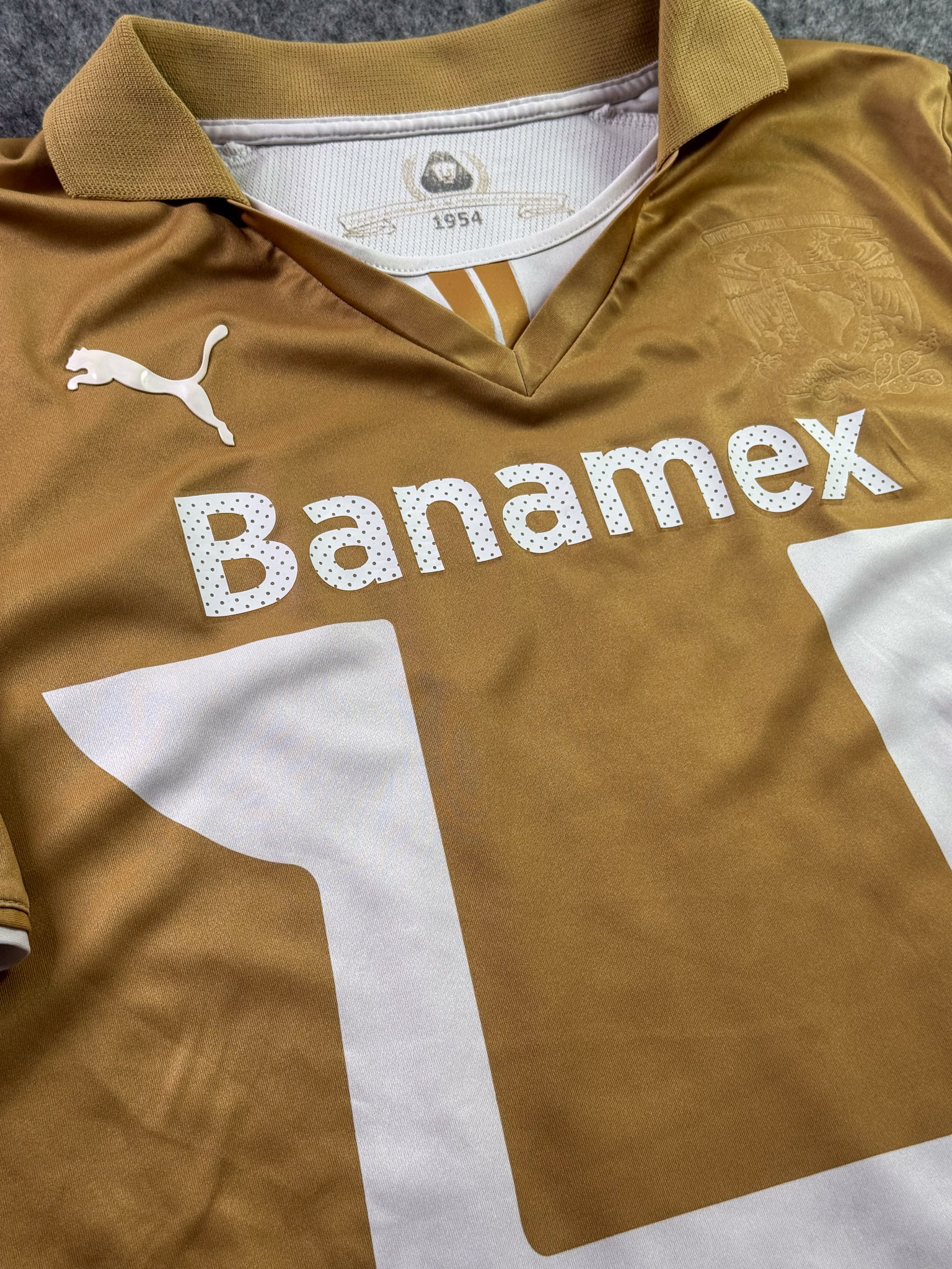Jersey del Pumas fabricado por Puma, originario de México. Se trata de la equipación Local correspondiente a la temporada 13-14. Talla M, con dorsal ‘Bravo 10’ y en condición Buena. Detalles: Hilos jalados en la parte trasera, ligeras manchas en al tela.