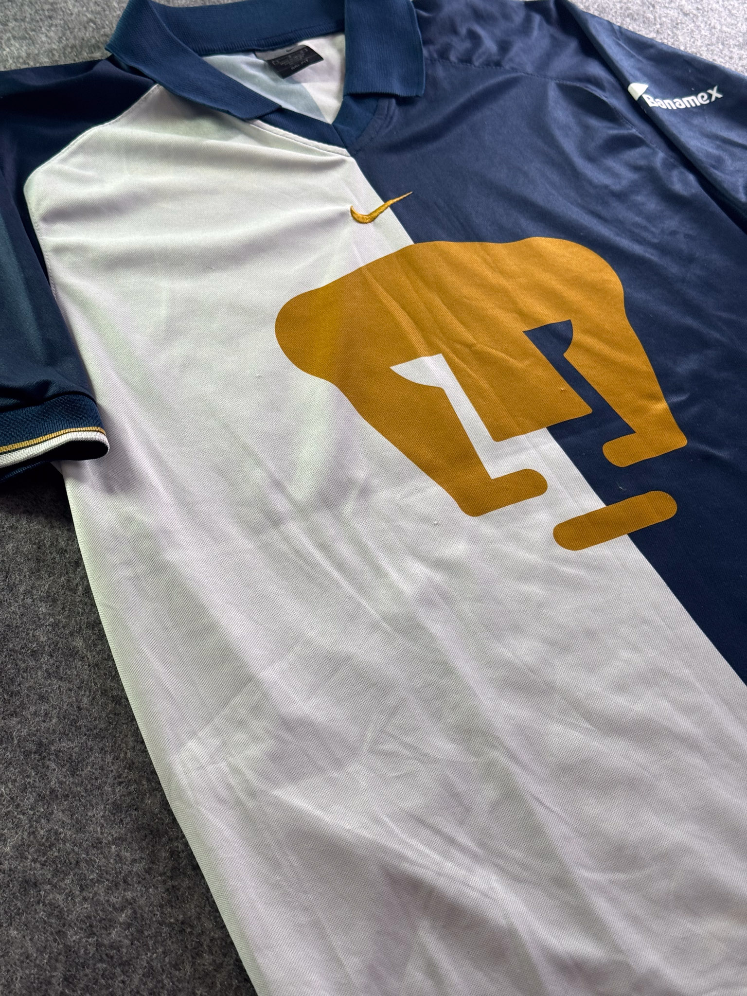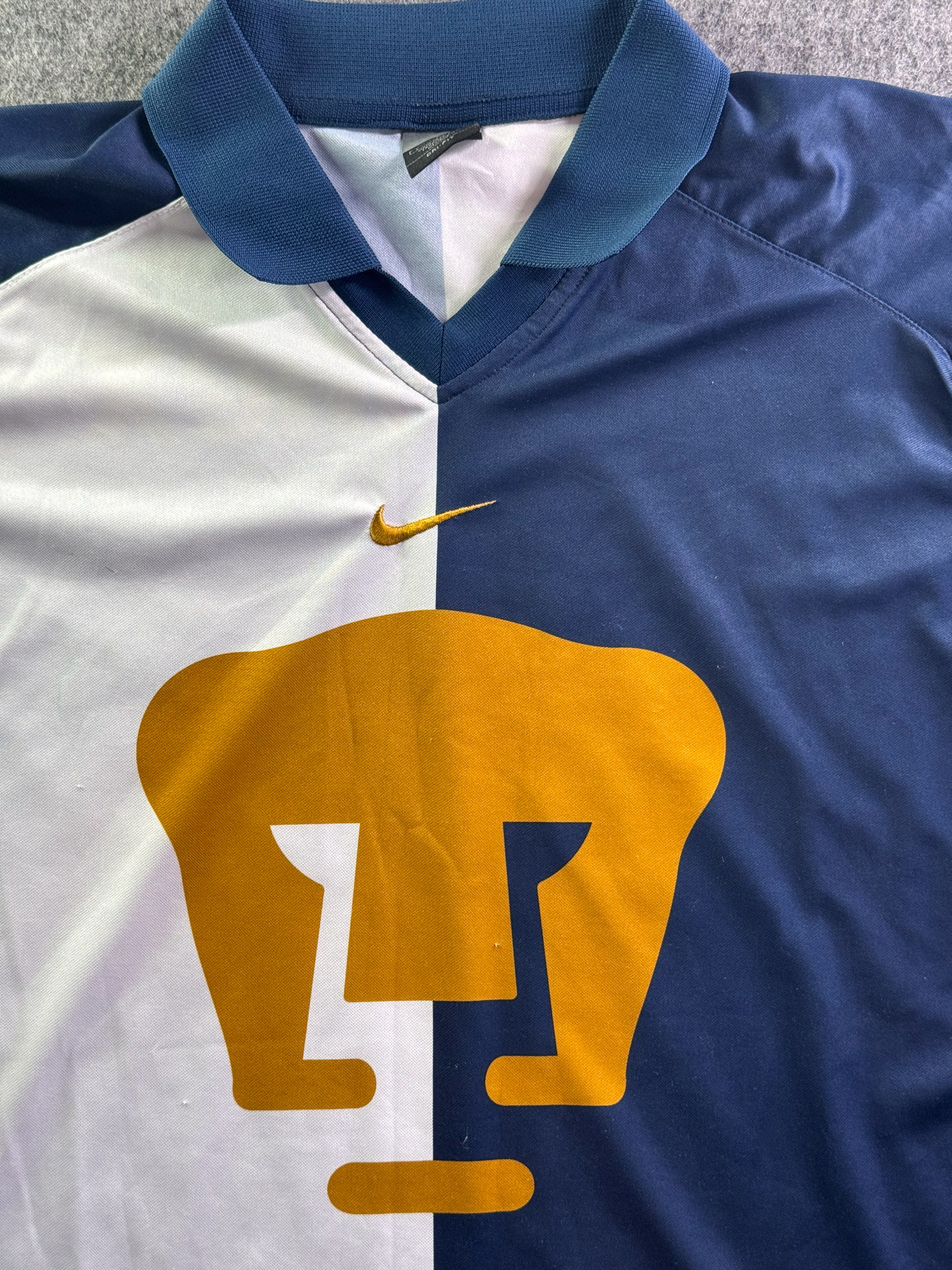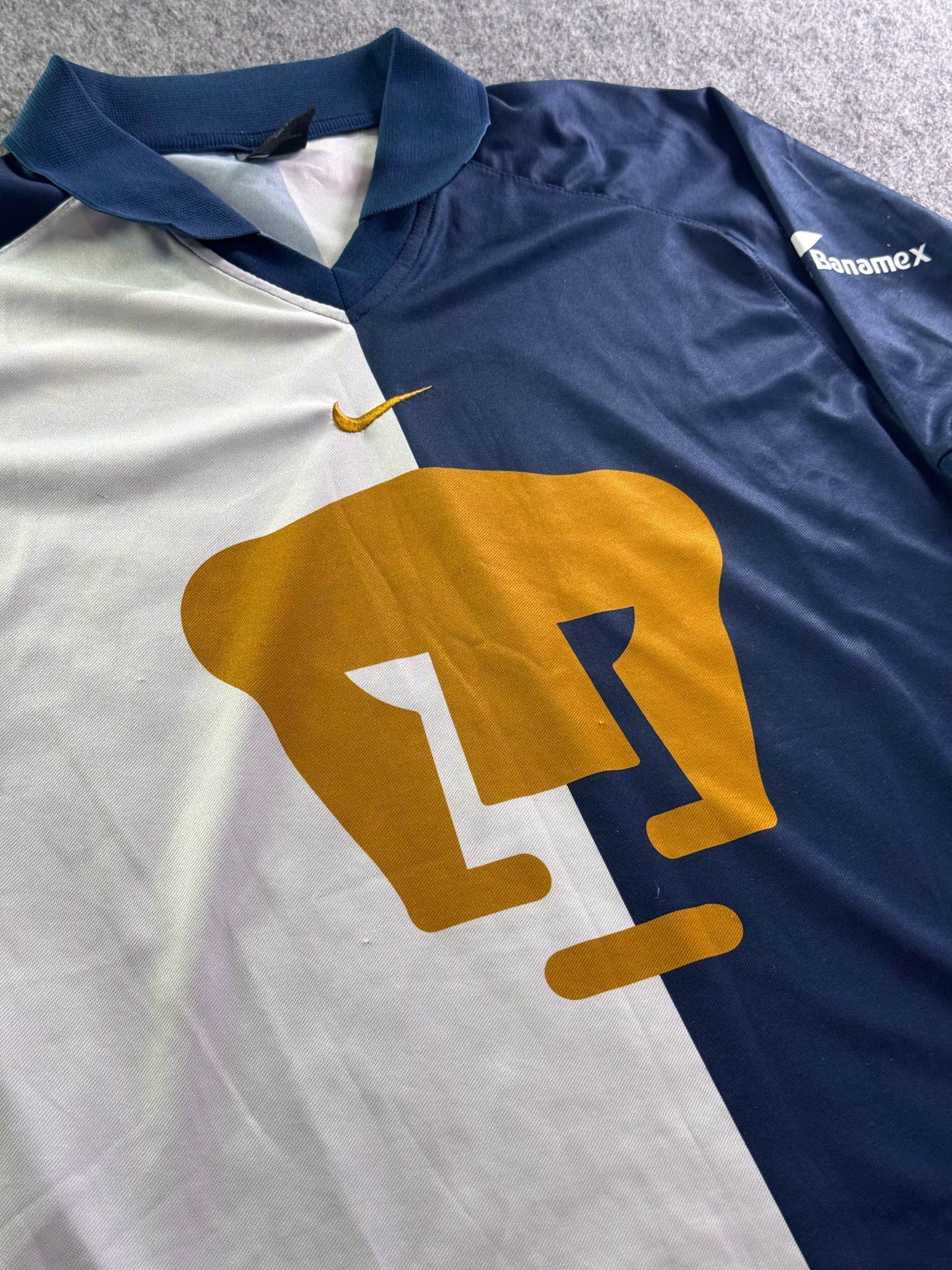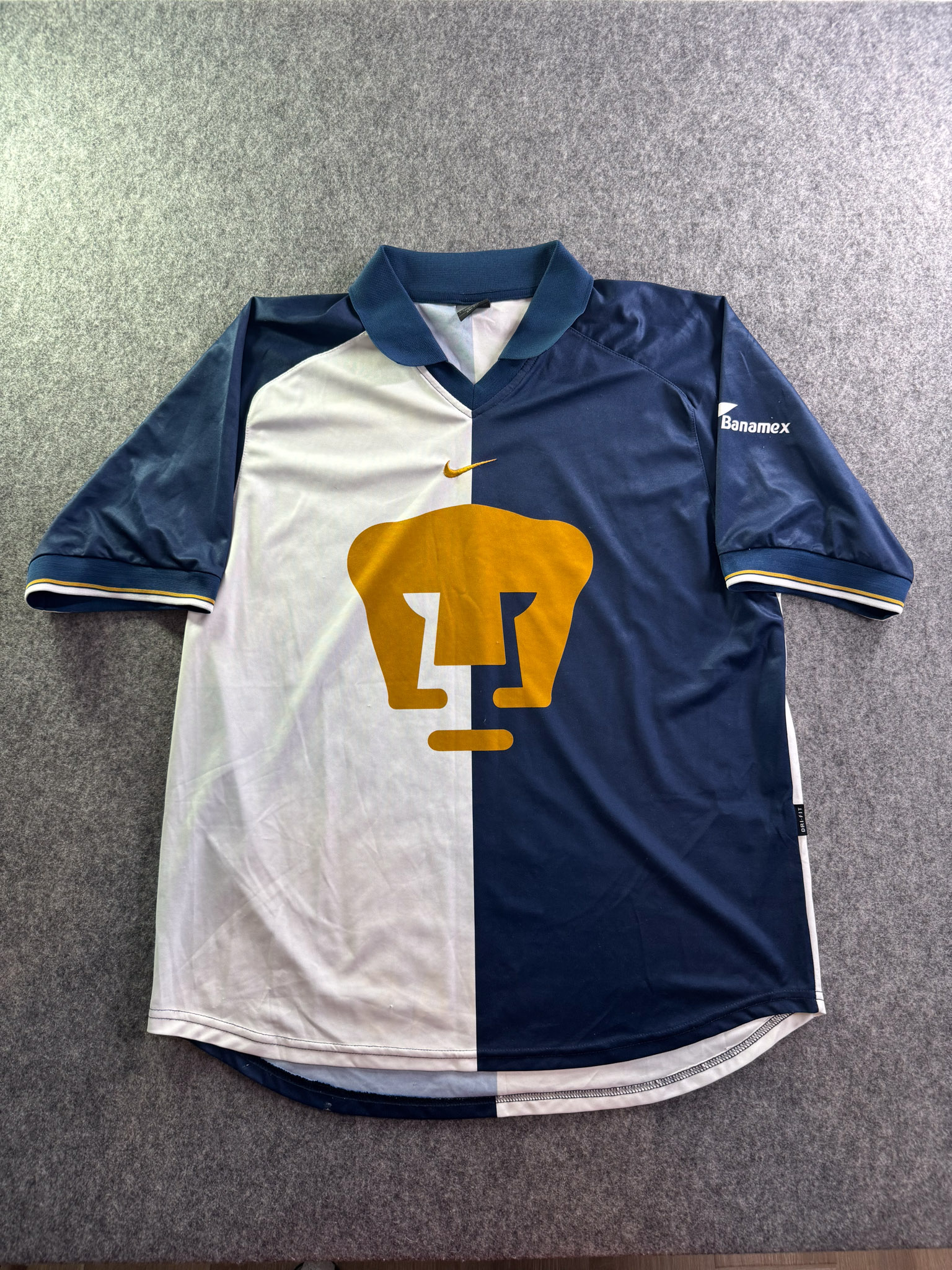 Jersey del Pumas fabricado por Nike, originario de México. Se trata de la equipación Visita correspondiente a la temporada 01-02. Talla L, con dorsal ‘No’ y en condición Excelente. Detalles: Ninguno.