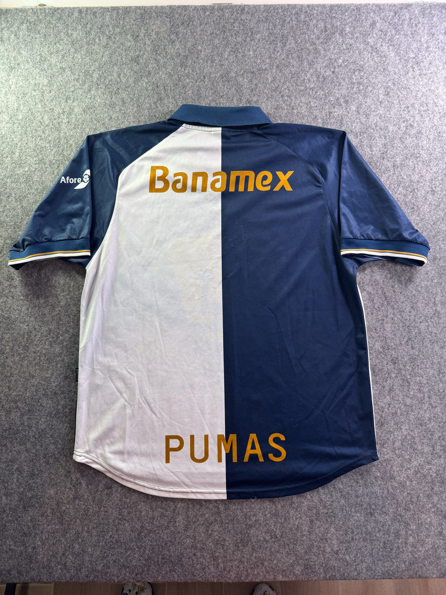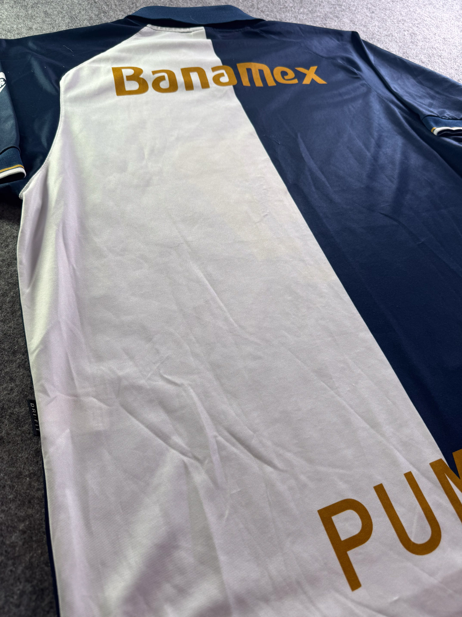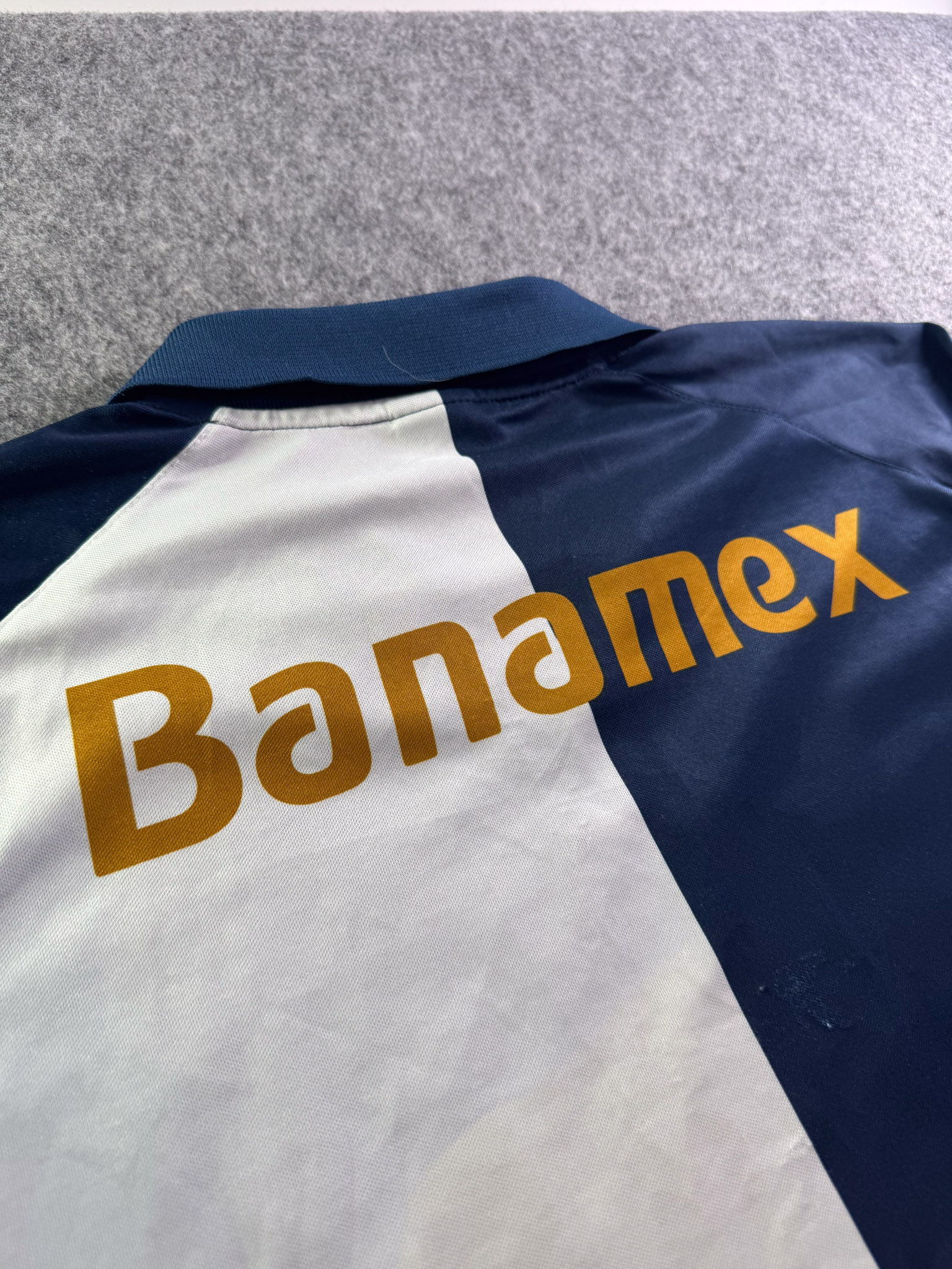 Jersey del Pumas fabricado por Nike, originario de México. Se trata de la equipación Visita correspondiente a la temporada 01-02. Talla L, con dorsal ‘No’ y en condición Excelente. Detalles: Ninguno.