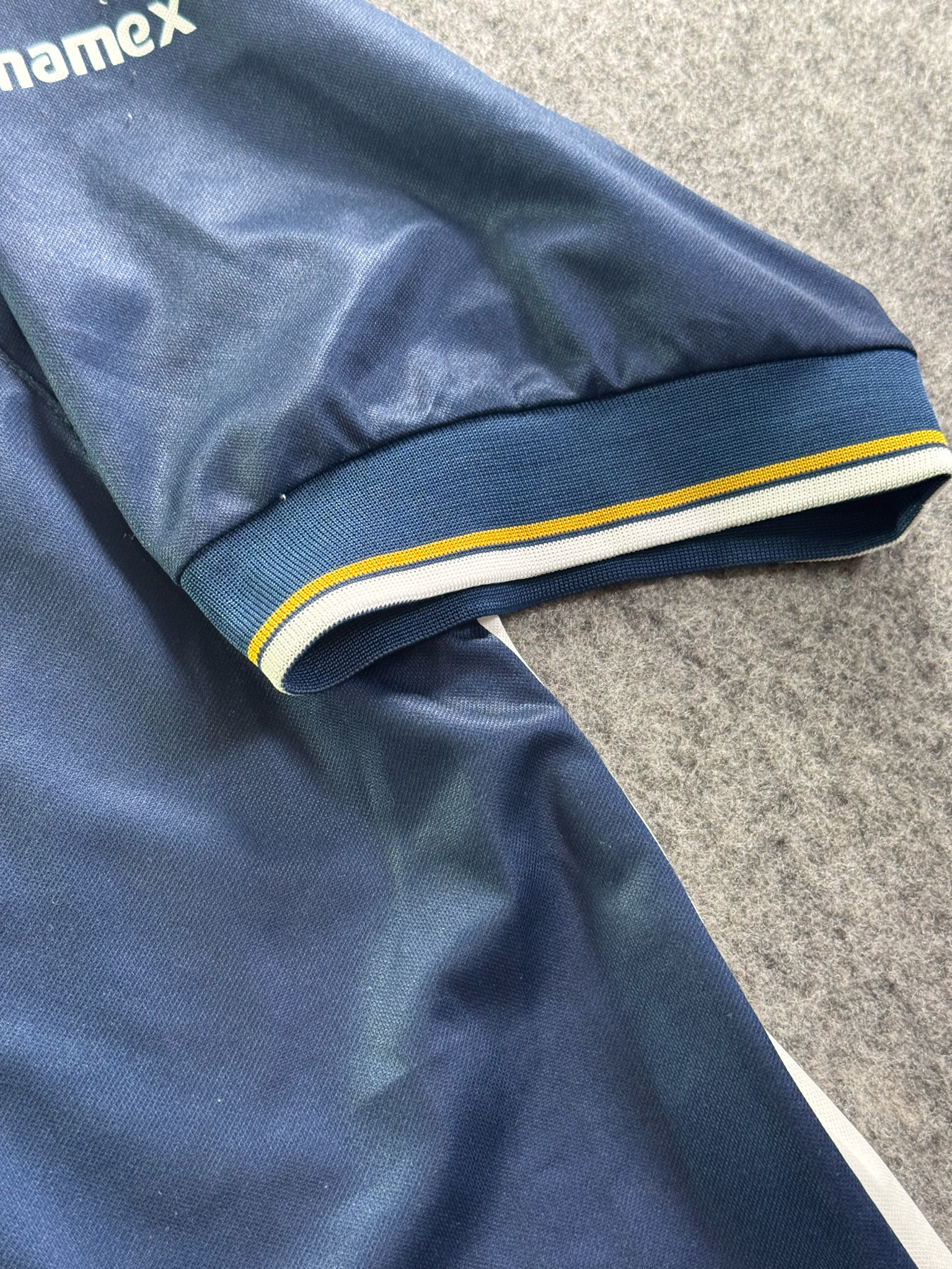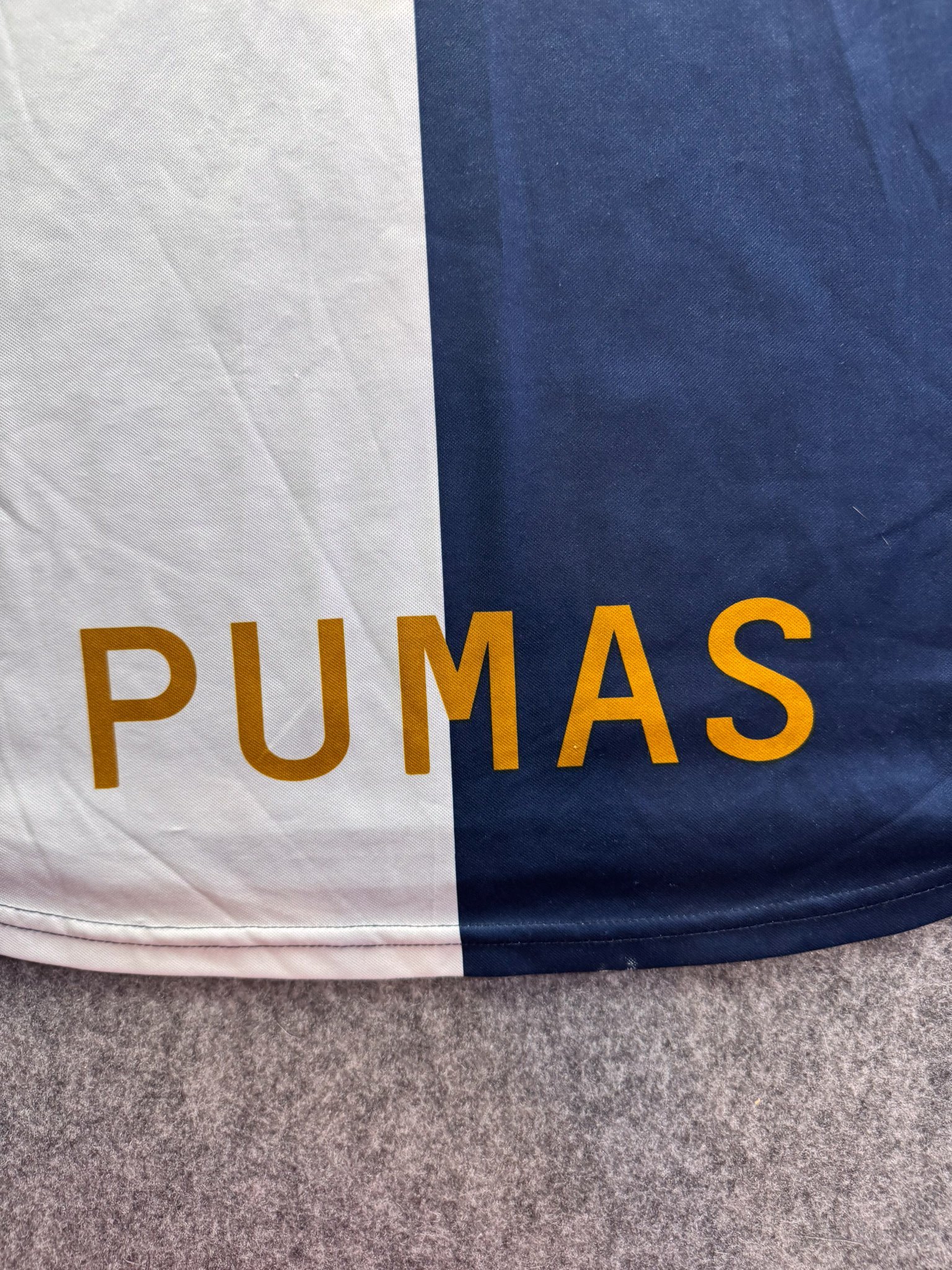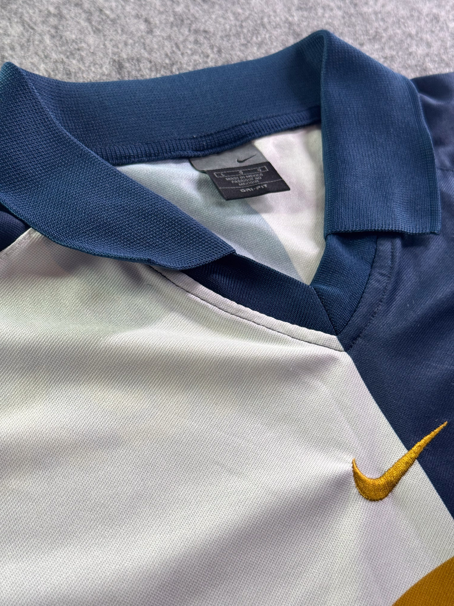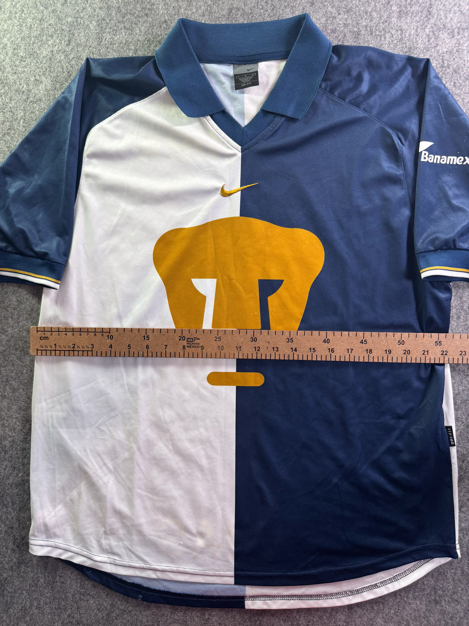Jersey del Pumas fabricado por Nike, originario de México. Se trata de la equipación Visita correspondiente a la temporada 01-02. Talla L, con dorsal ‘No’ y en condición Excelente. Detalles: Ninguno.