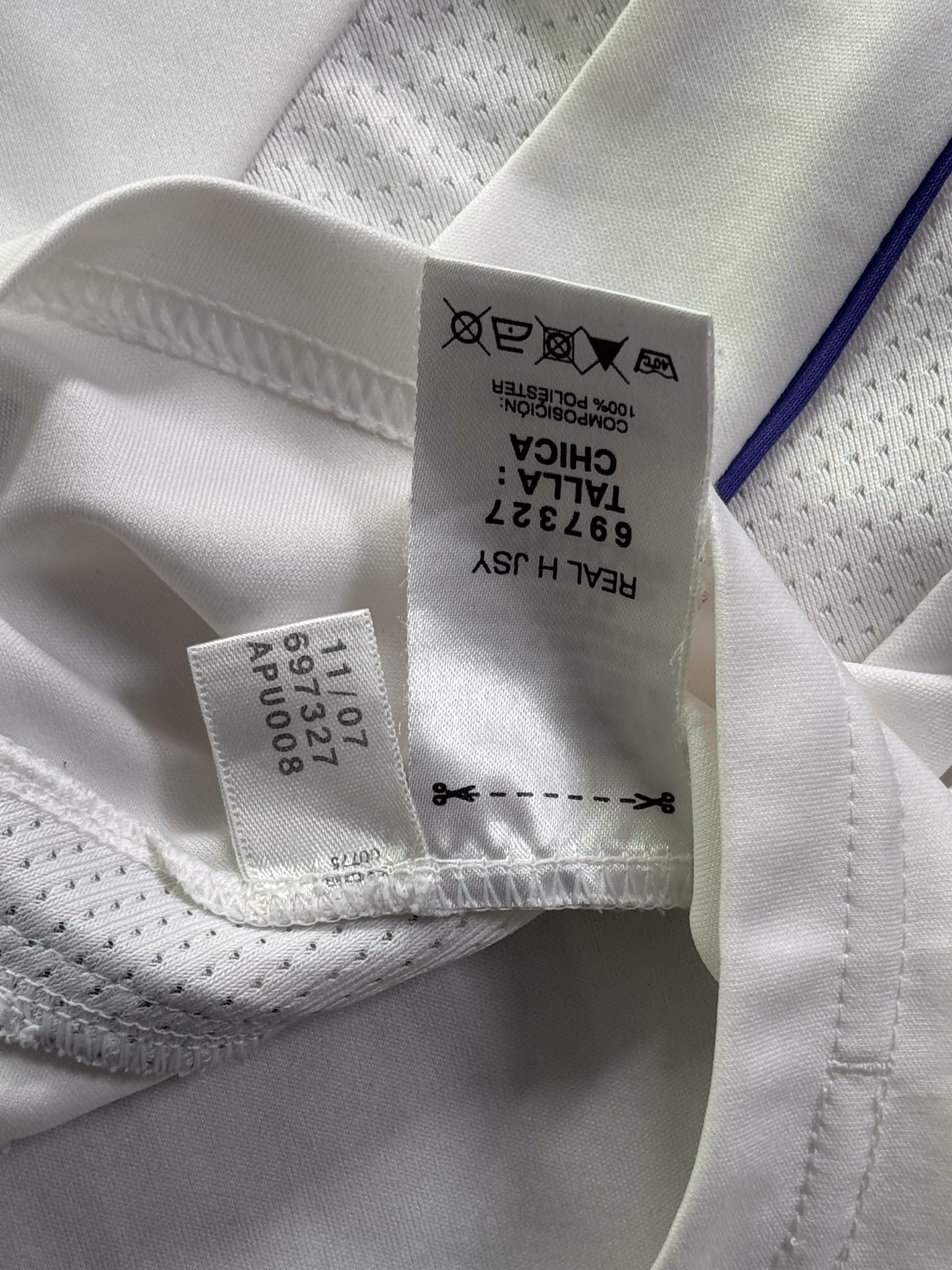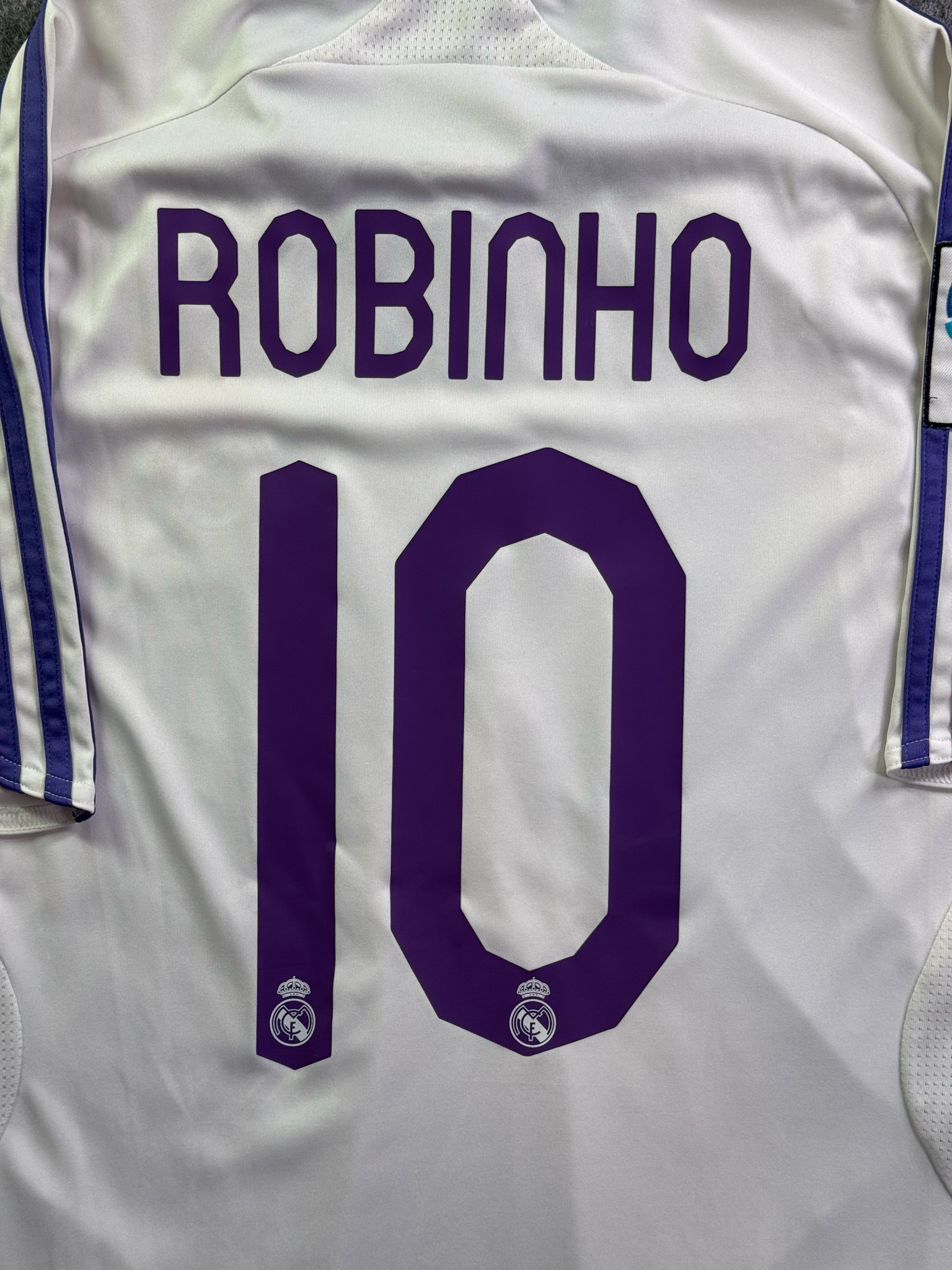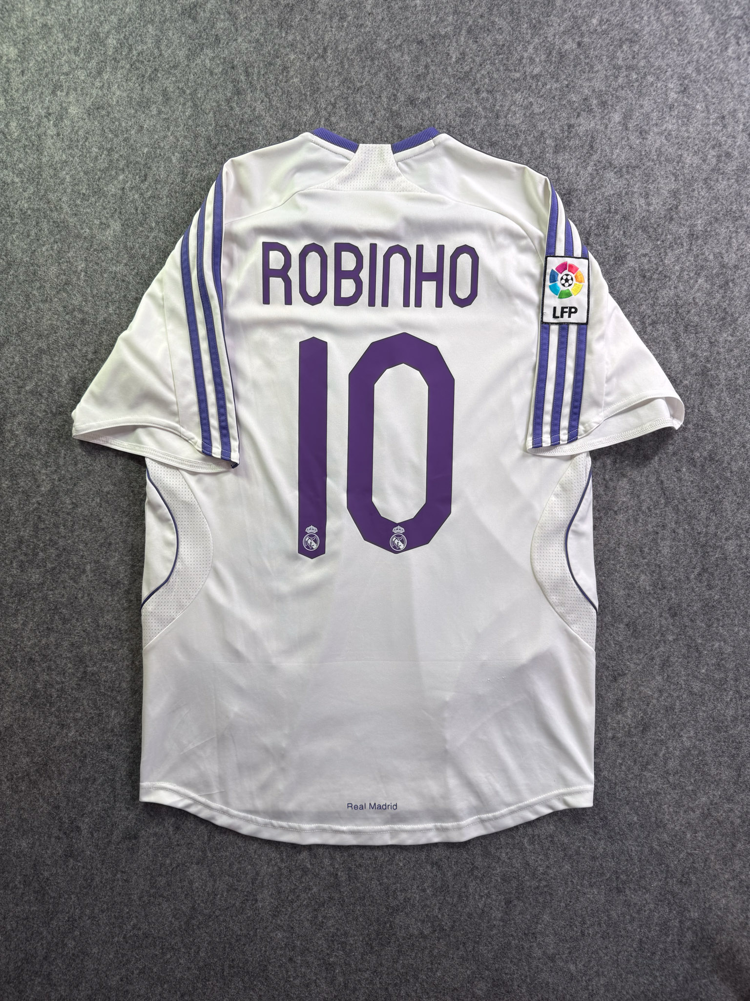 Jersey del Real Madrid fabricado por Adidas, originario de España. Se trata de la equipación Local correspondiente a la temporada 07-08. Talla S, con dorsal ‘Robinho 10’ y en condición Excelente. Detalles: Ninguna.