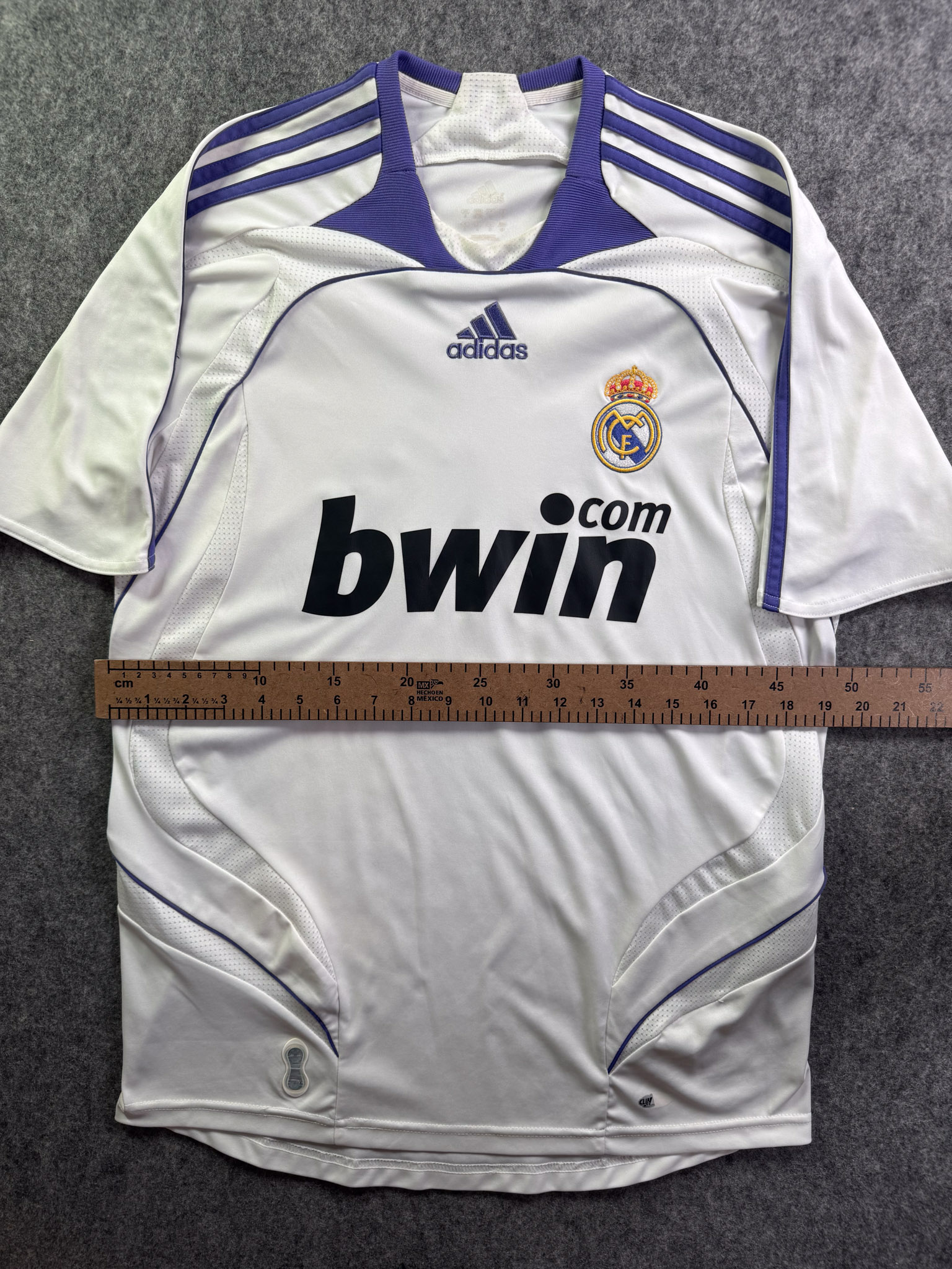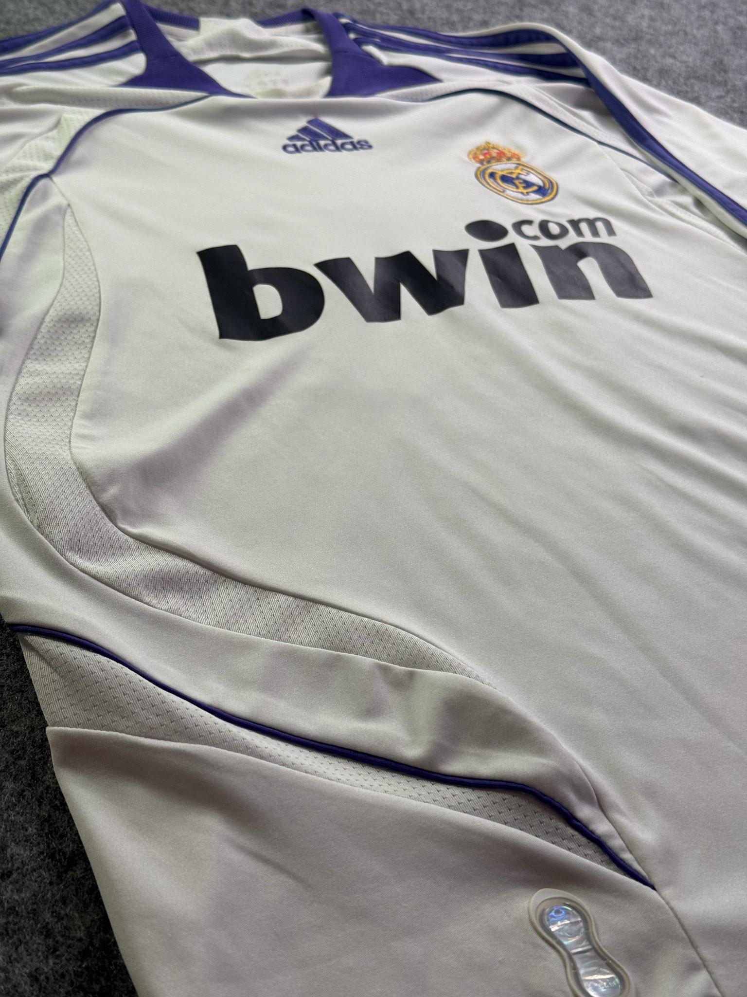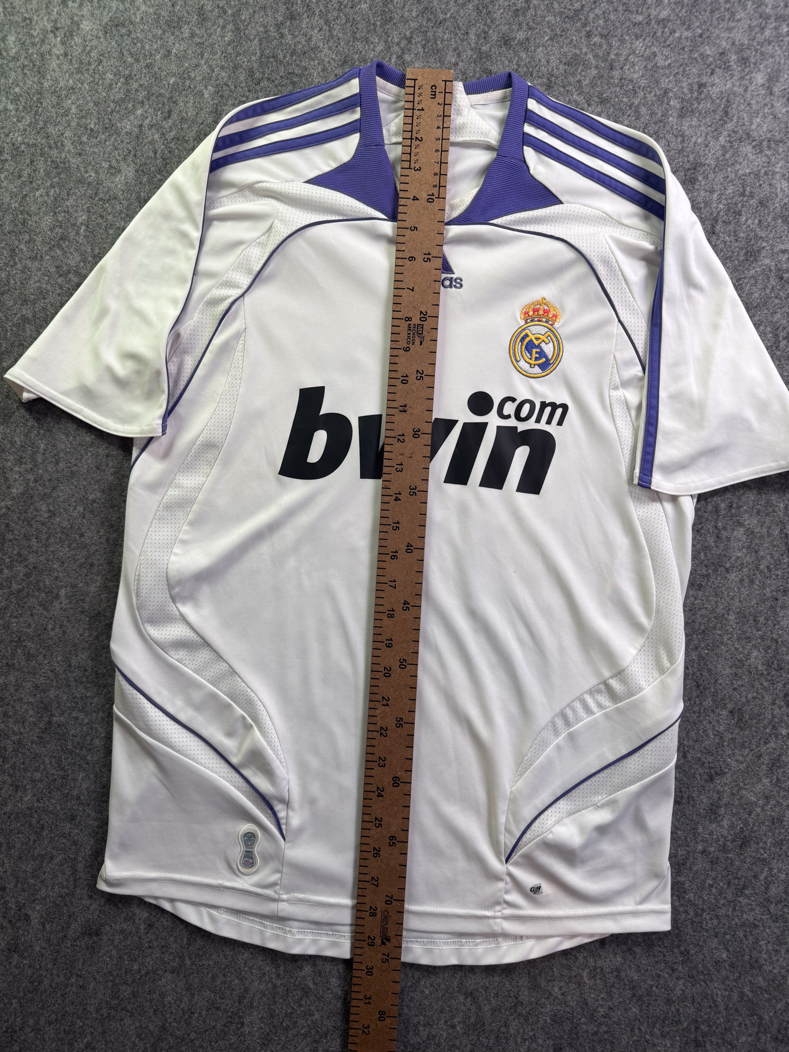 Jersey del Real Madrid fabricado por Adidas, originario de España. Se trata de la equipación Local correspondiente a la temporada 07-08. Talla S, con dorsal ‘Robinho 10’ y en condición Excelente. Detalles: Ninguna.