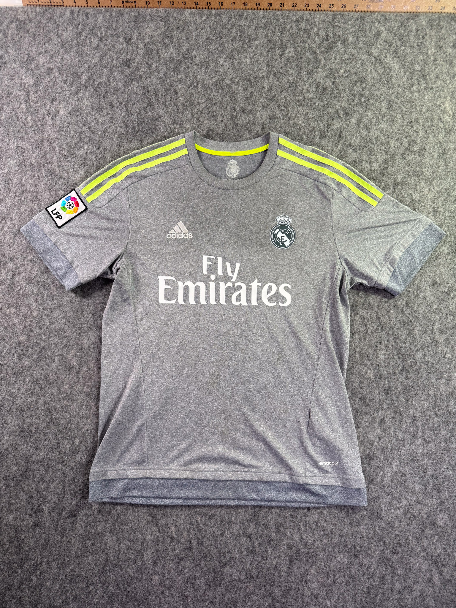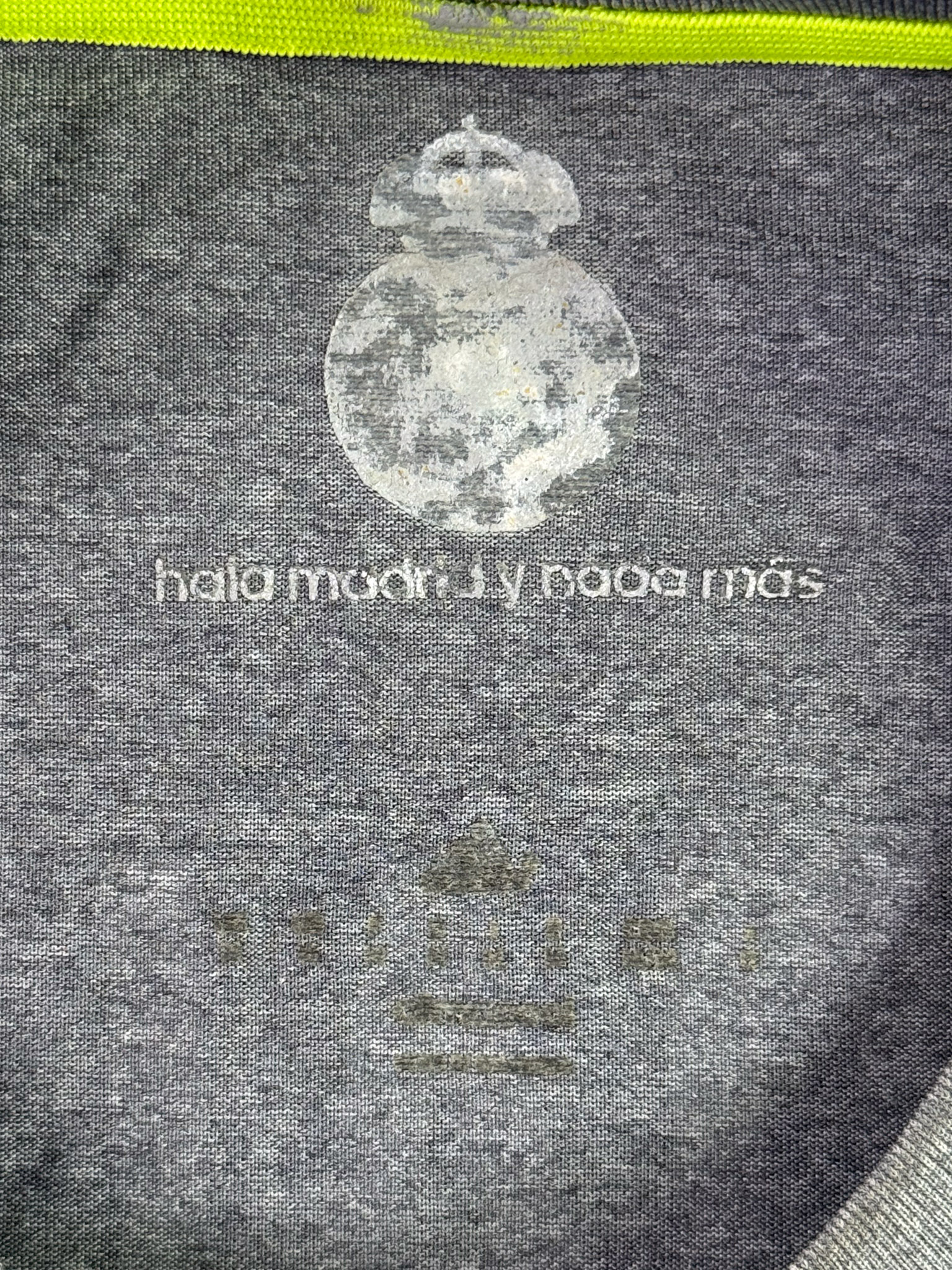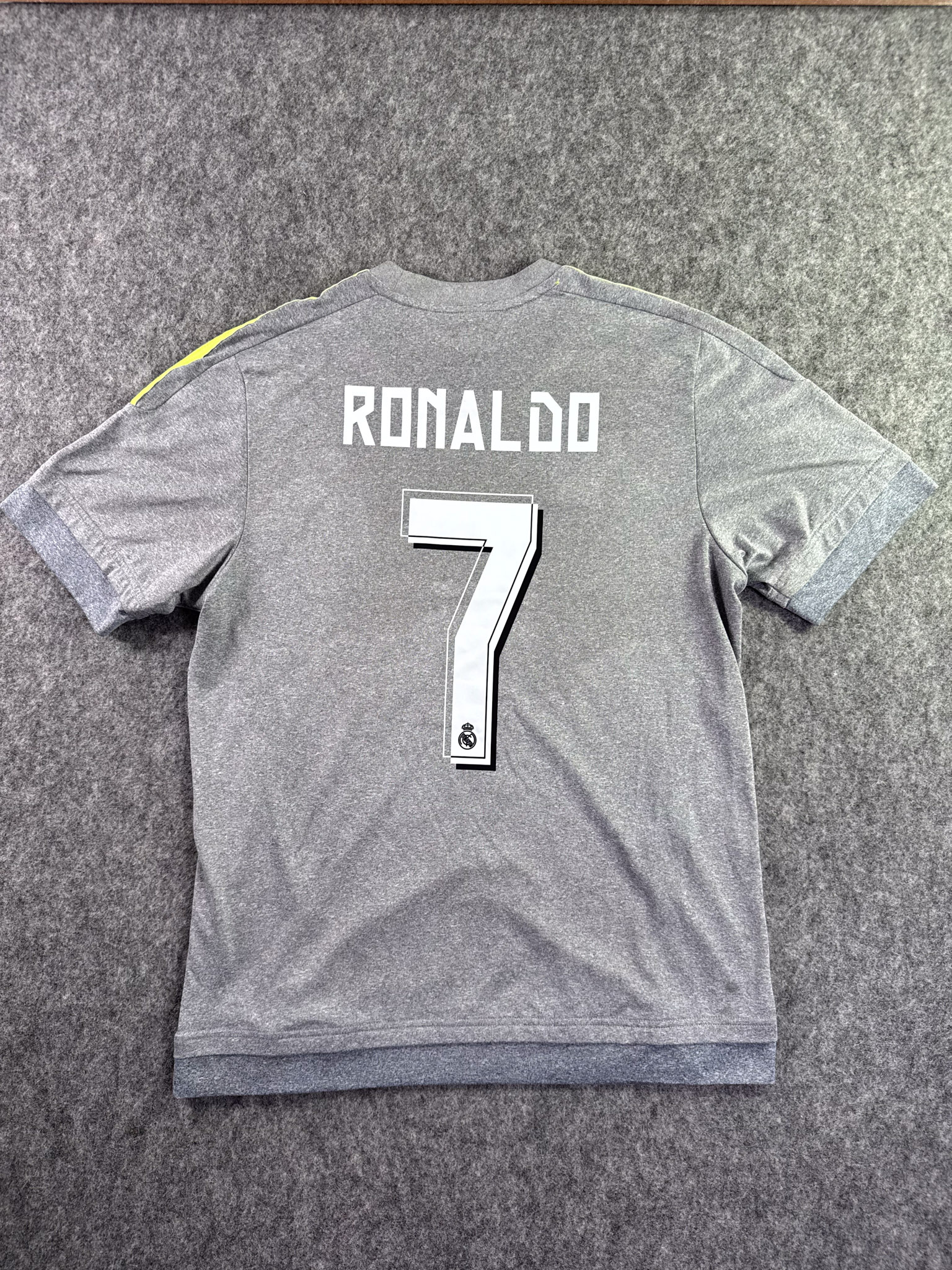 Jersey del Real Madrid fabricado por Adidas, originario de España. Se trata de la equipación Visita correspondiente a la temporada 15-16. Talla M, con dorsal ‘Ronaldo 7’ y en condición Muy buena. Detalles: Escudo Restaurado, ligeras manchas en la tela y un pequeñohoyo en la parte frontal.