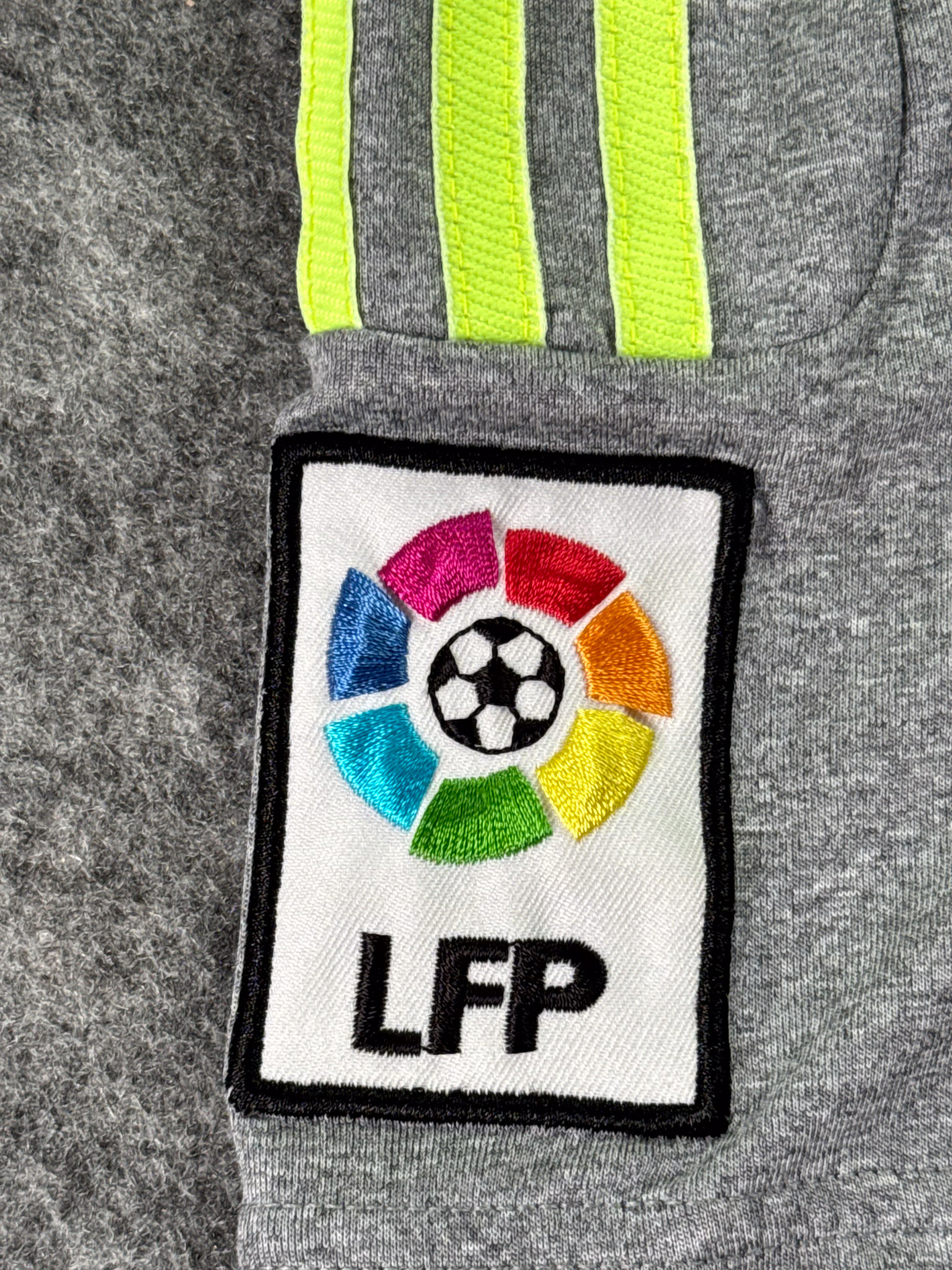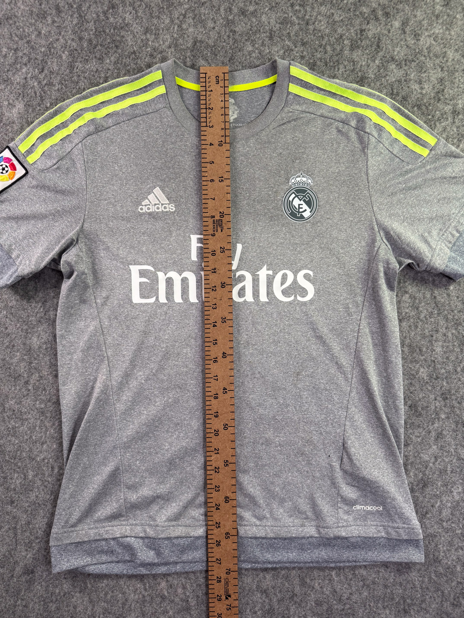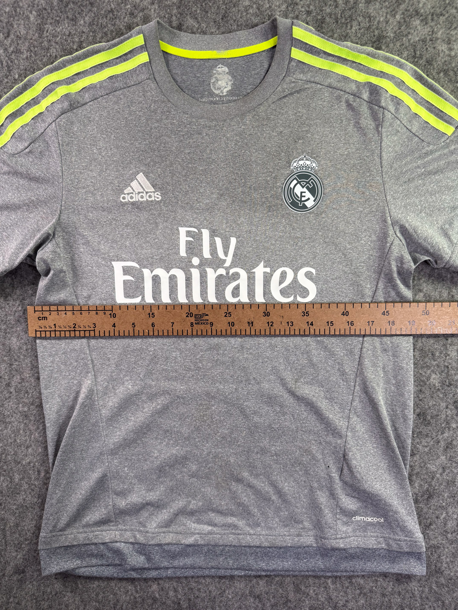 Jersey del Real Madrid fabricado por Adidas, originario de España. Se trata de la equipación Visita correspondiente a la temporada 15-16. Talla M, con dorsal ‘Ronaldo 7’ y en condición Muy buena. Detalles: Escudo Restaurado, ligeras manchas en la tela y un pequeñohoyo en la parte frontal.