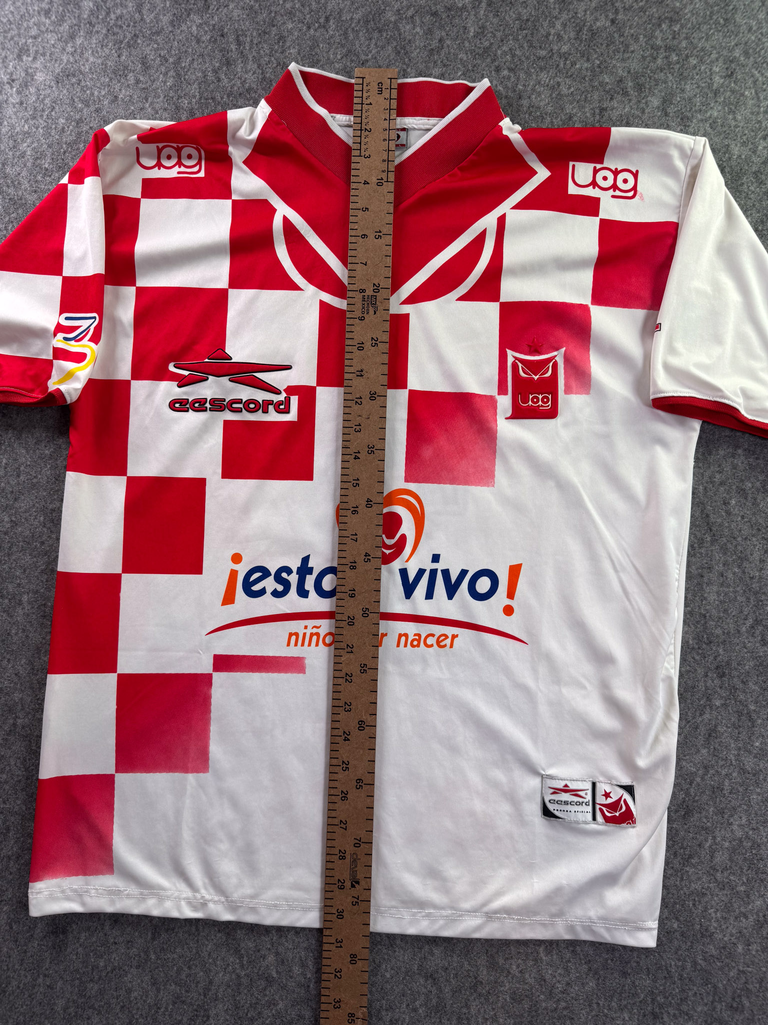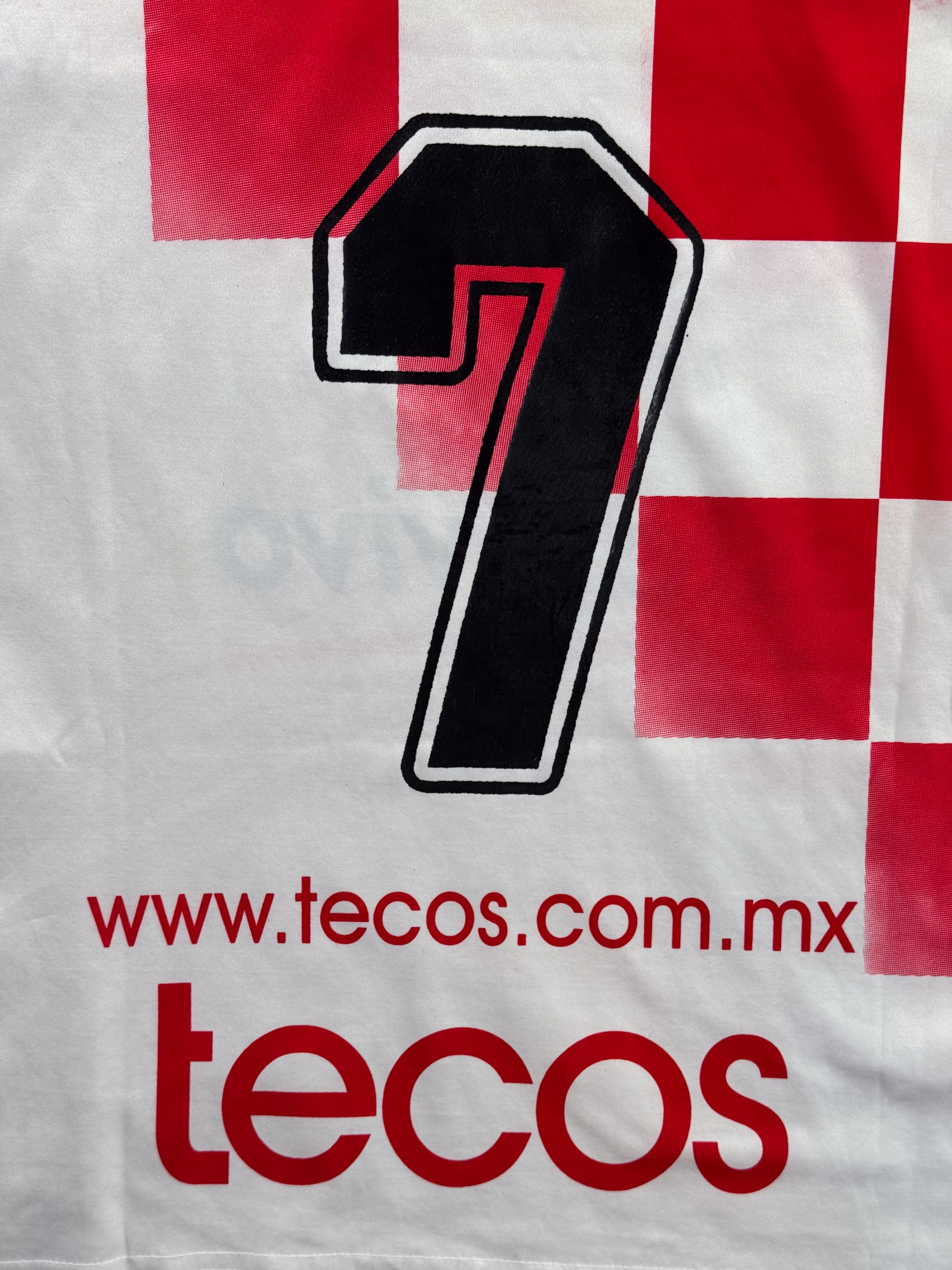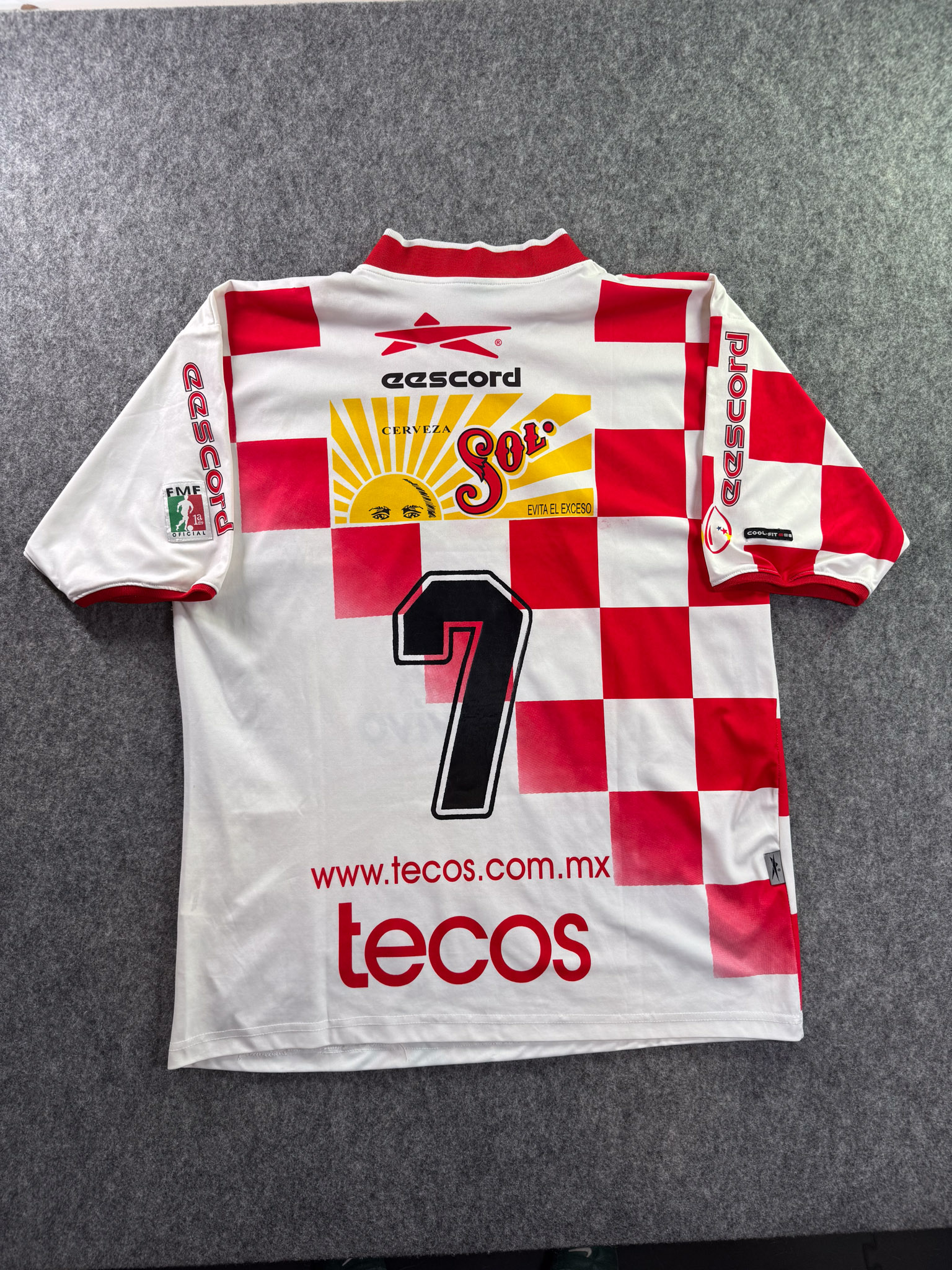 Jersey del Tecos fabricado por Escord, originario de México. Se trata de la equipación Local correspondiente a la temporada 00-01. Talla L, con dorsal ‘7’ y en condición Excelente. Detalles: Número en serigrafía, posible utilería.